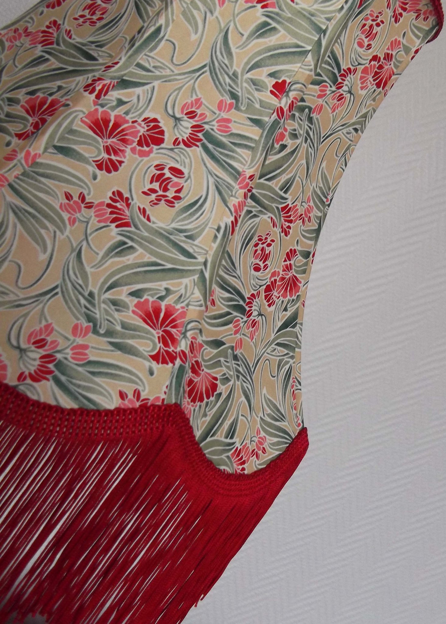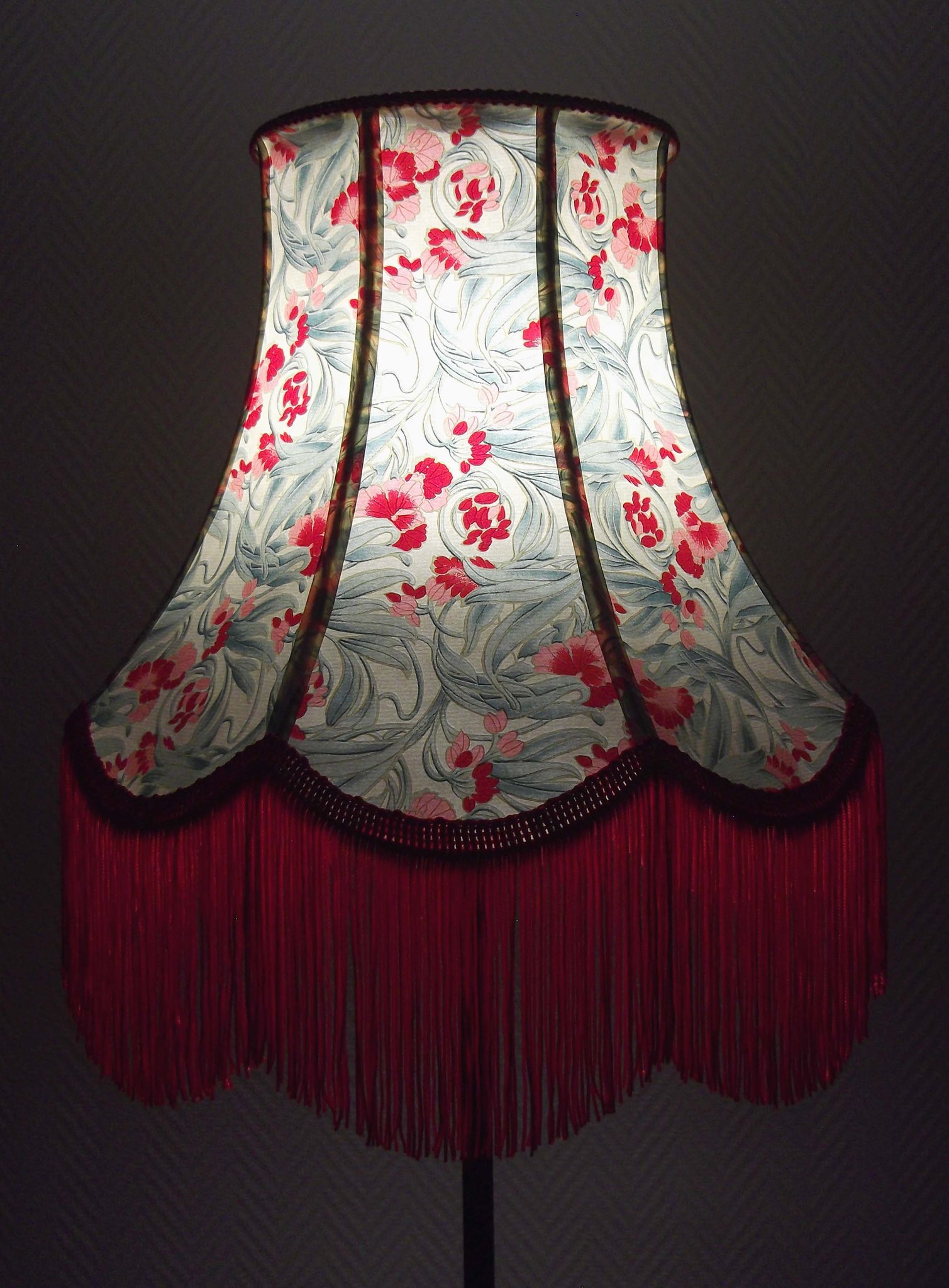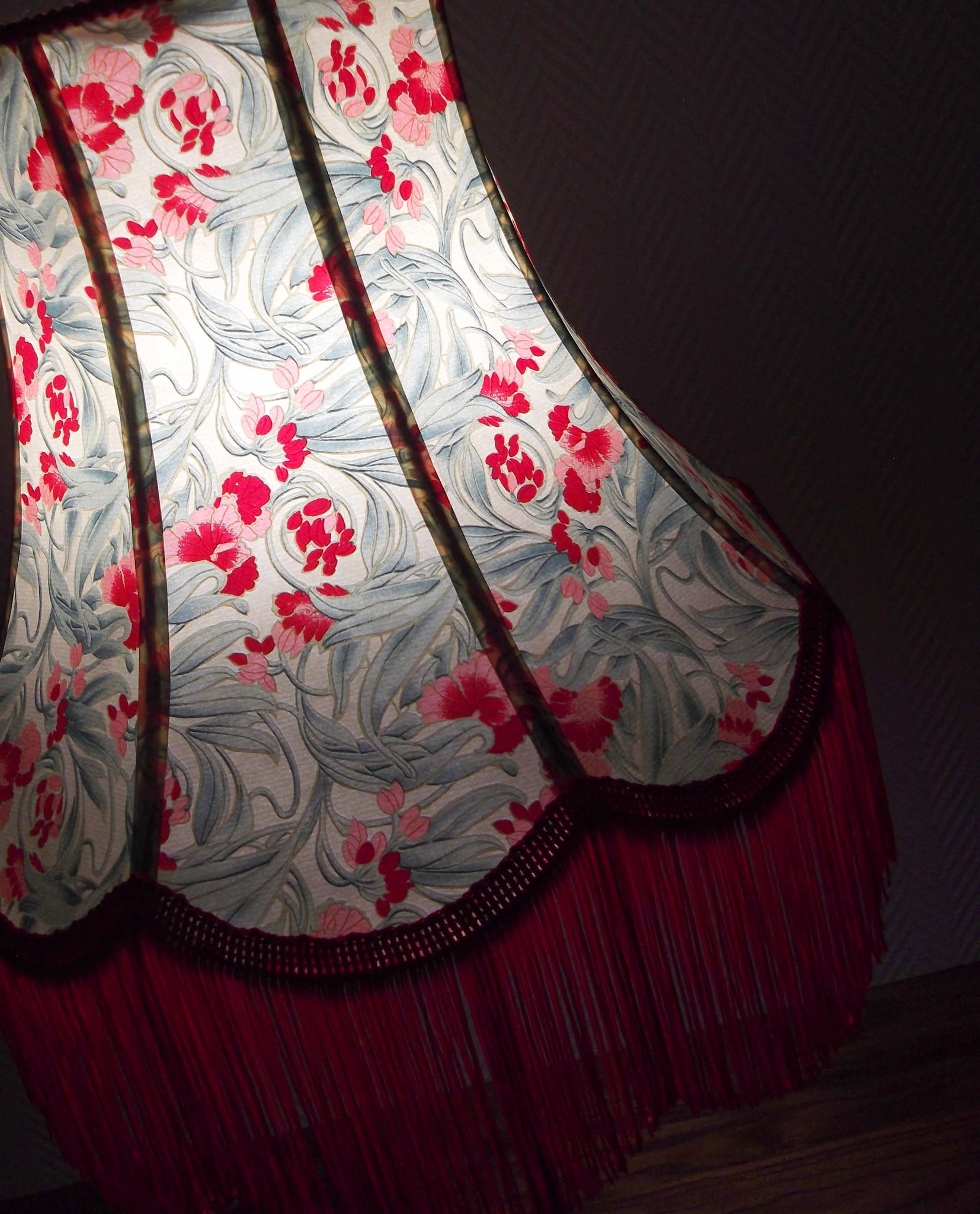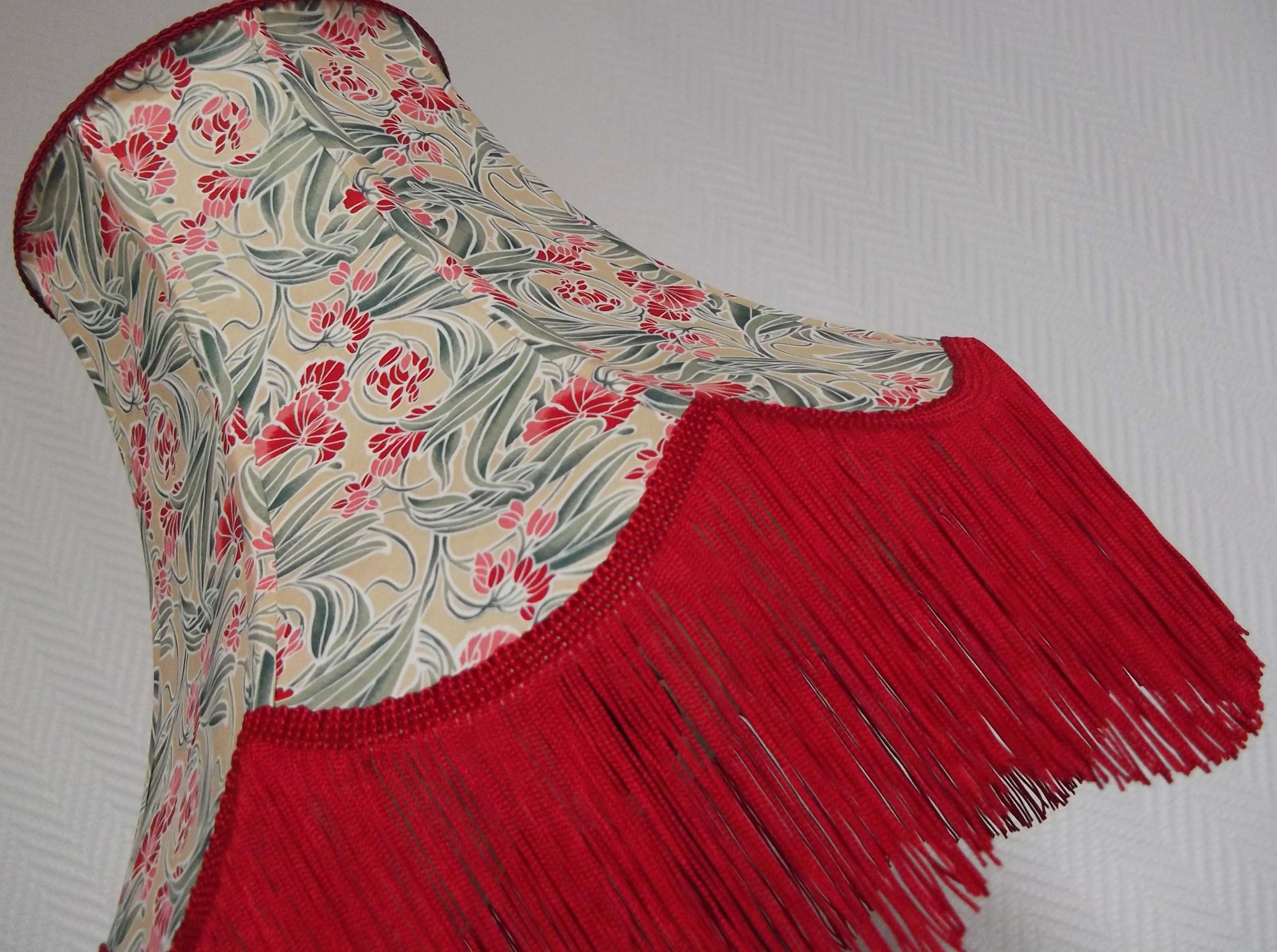 Abat-jour forme pagode en papier japonais fleurs rouges et roses sur fond écru. Frange rouge. Dimensions : Diamètre 30 cm, hauteur 24 cm + 10 cm de frange.