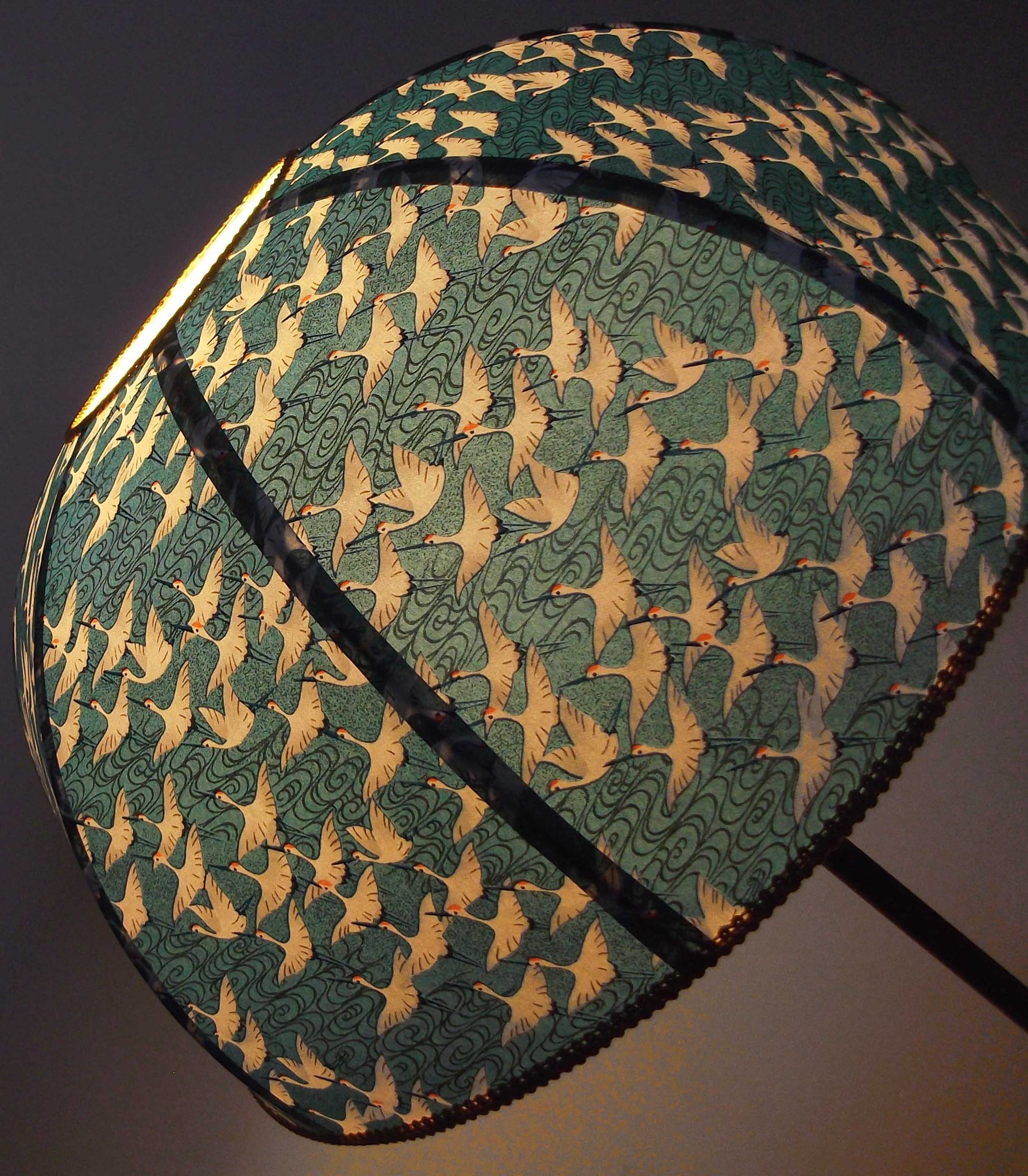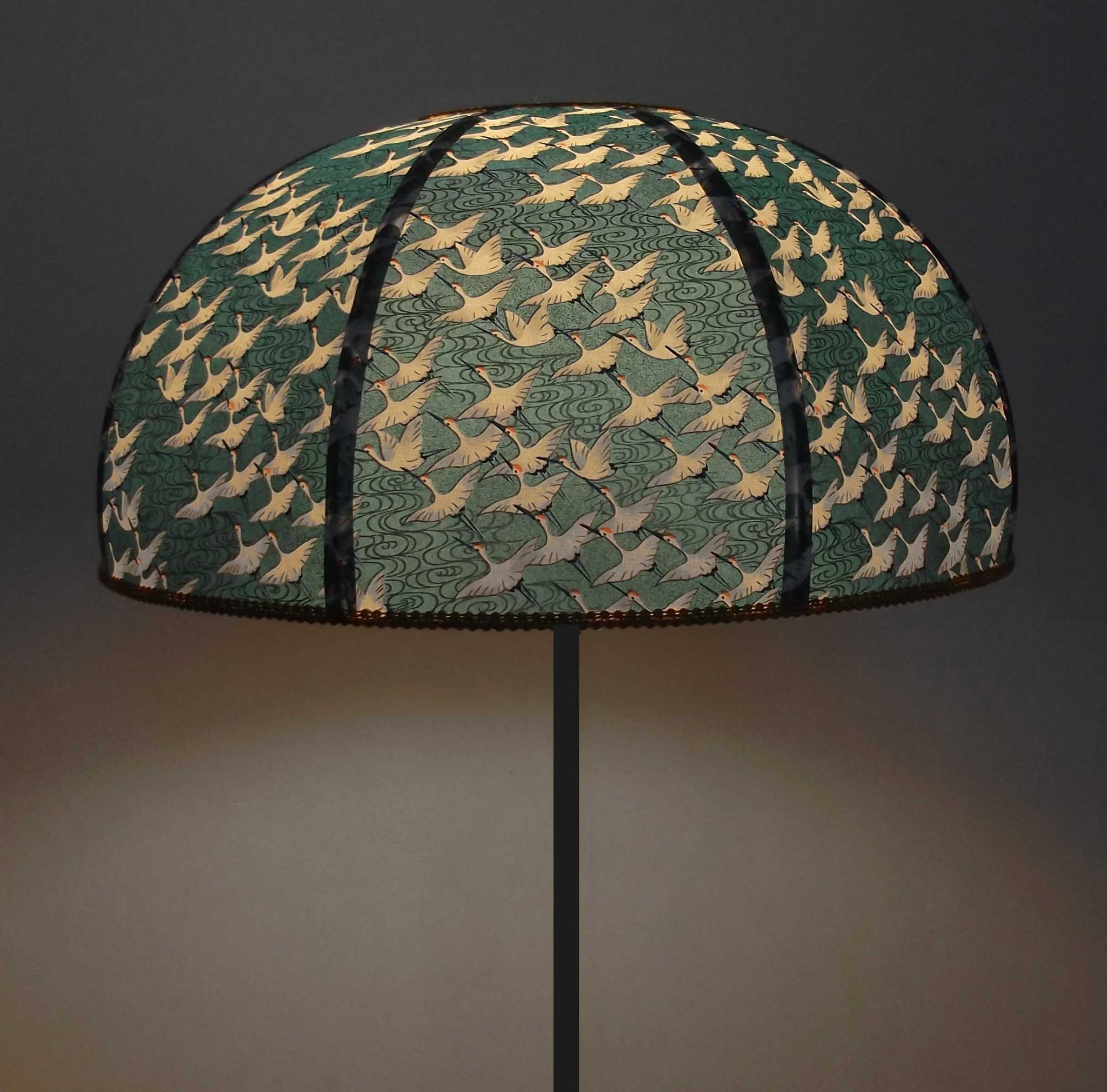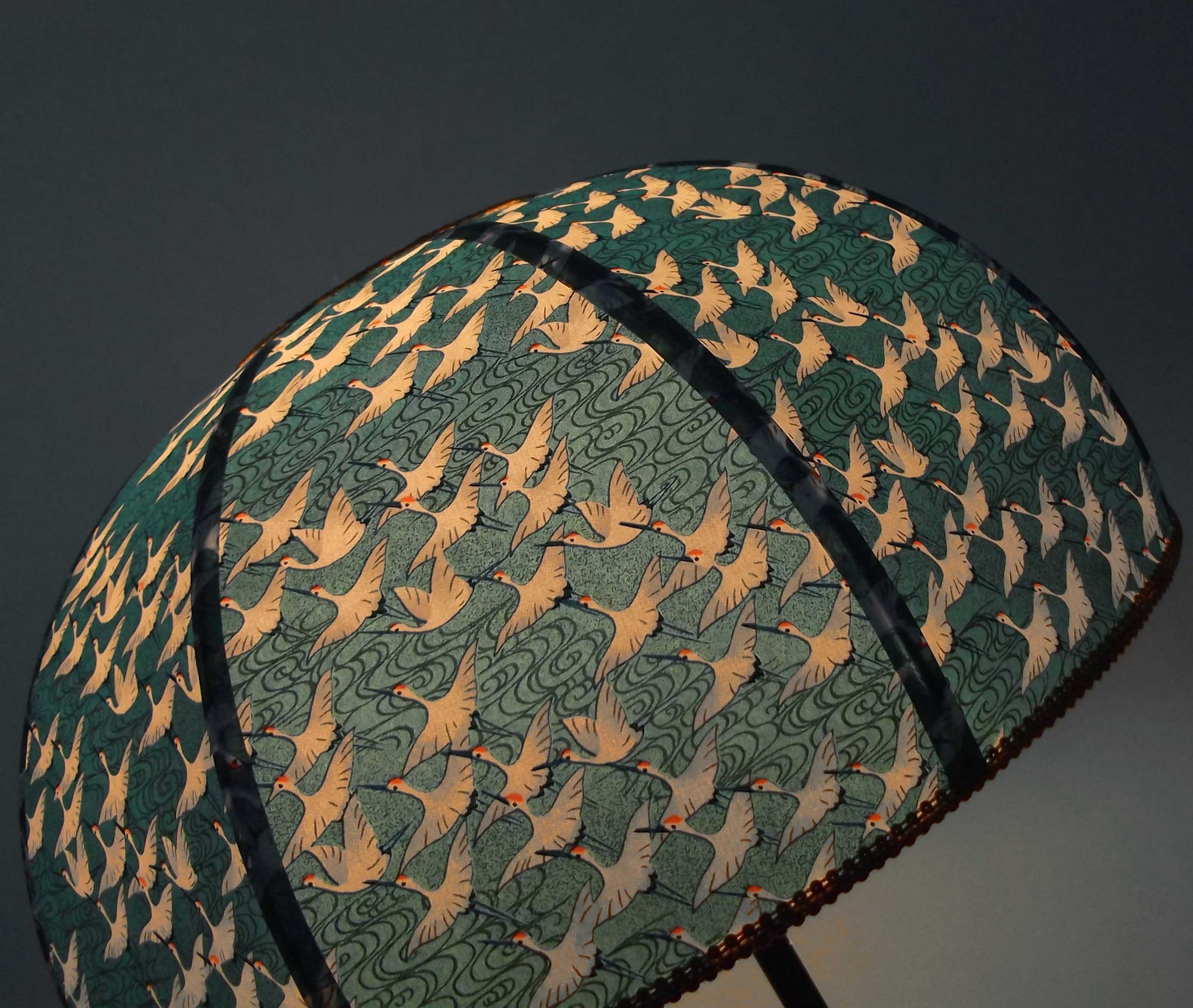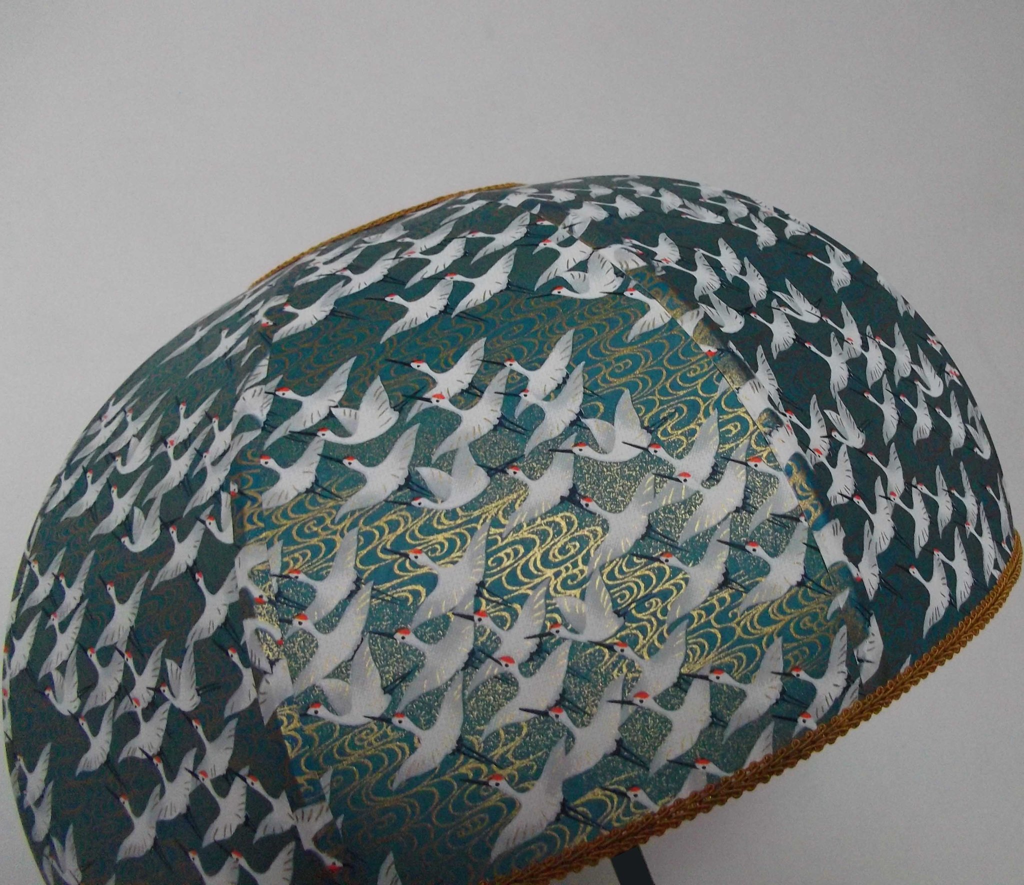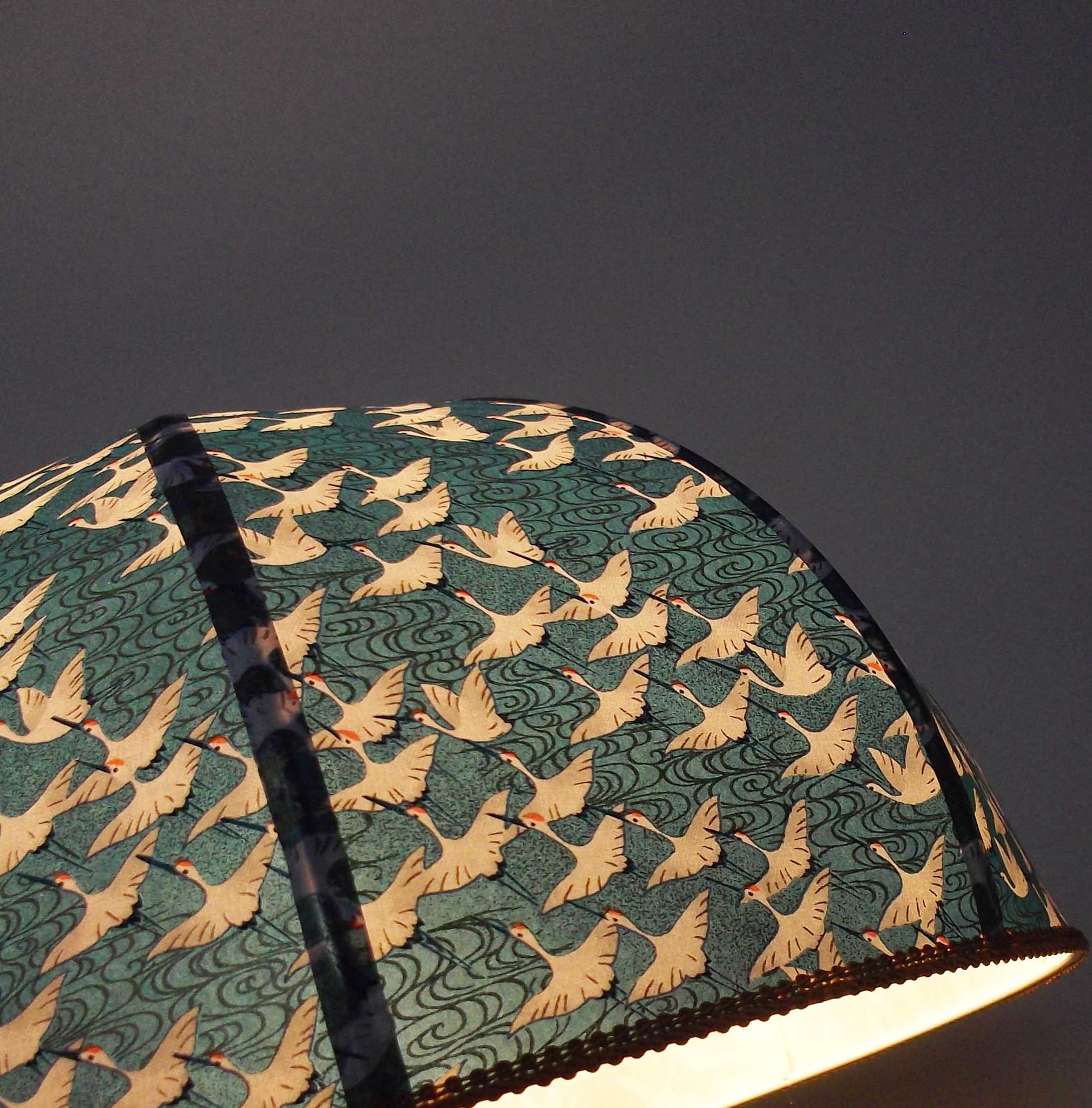 Abat-jour forme dôme, papier japonais grues sur fond vert/bleu, galon doré. Dimensions : Diamètre 35 cm, hauteur 18 cm.