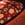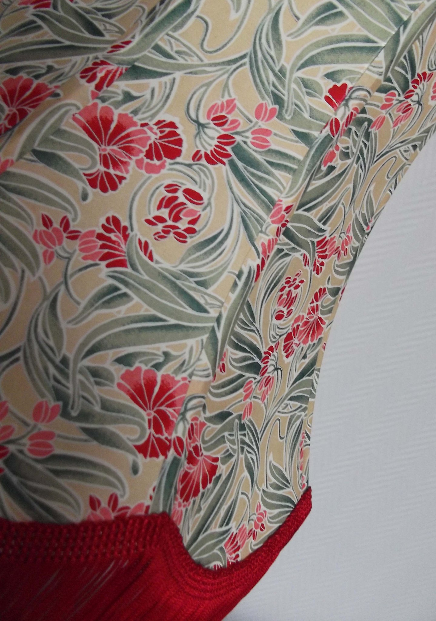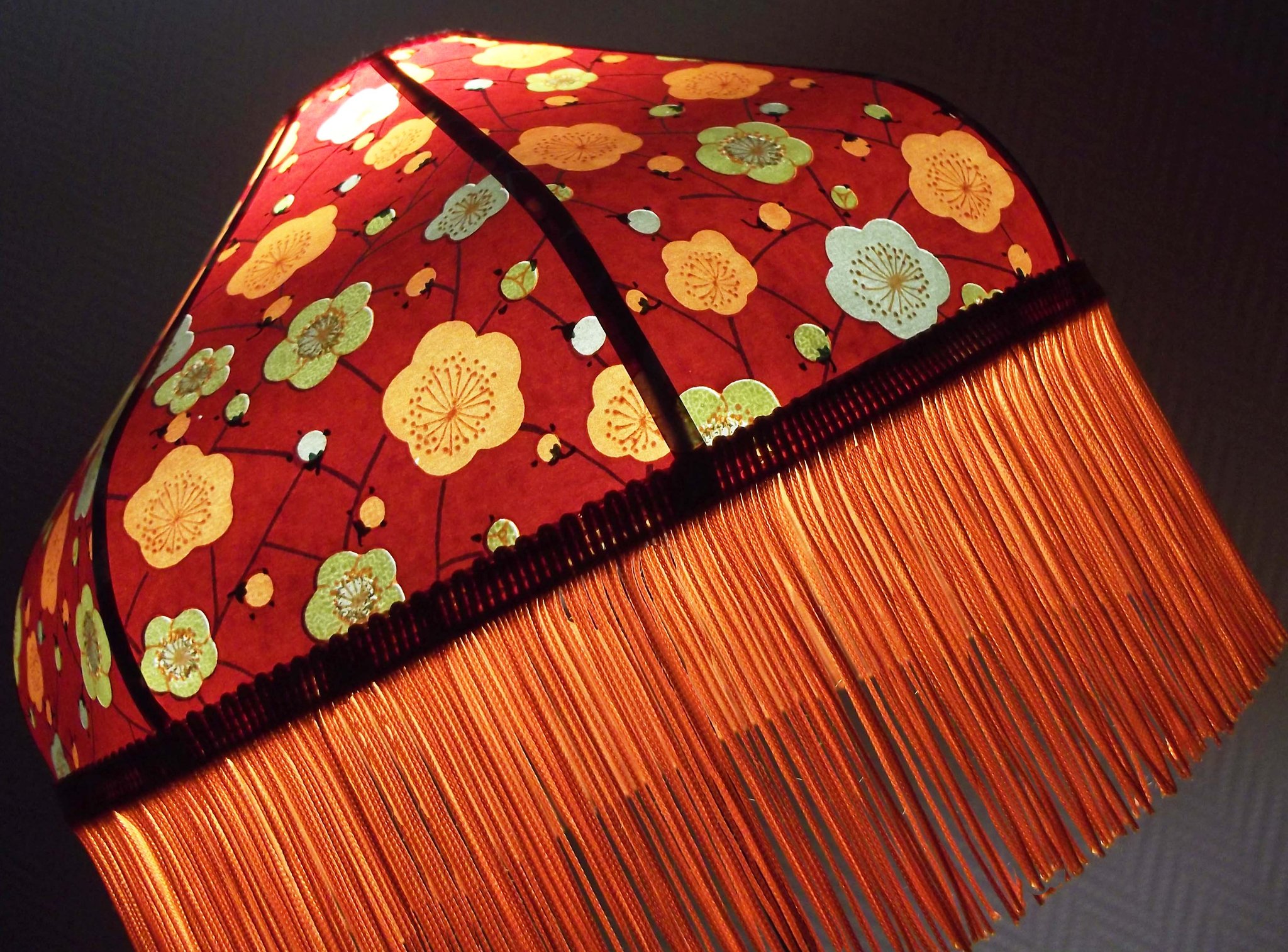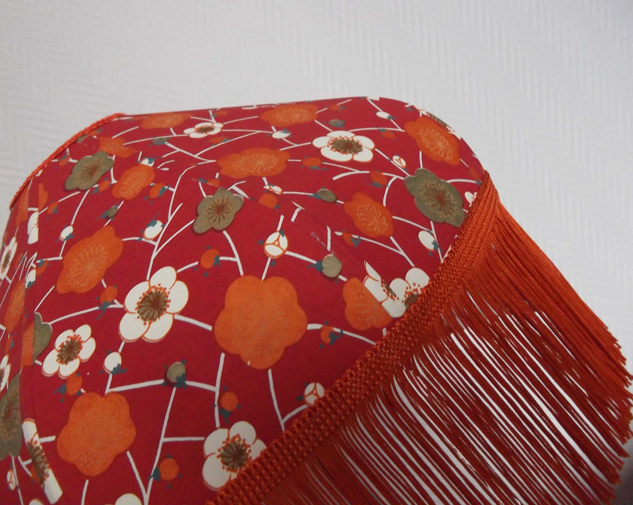 Abat-jour forme dôme aplati, papier japonais rouge foncé à fleurs oranges et blanches. Frange orange. Dimensions : Diamètre 30 cm, hauteur 15 cm + 10 cm de frange.