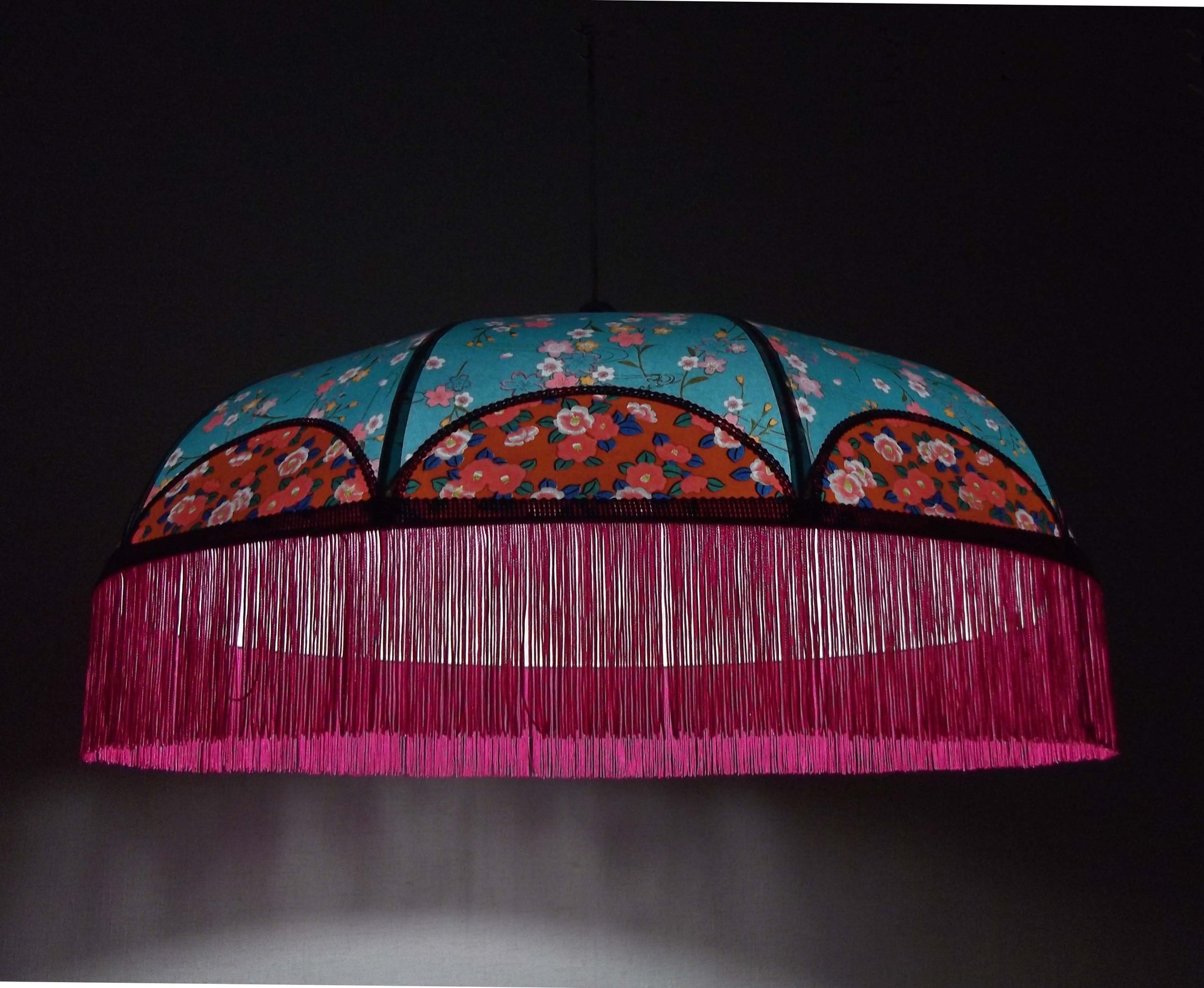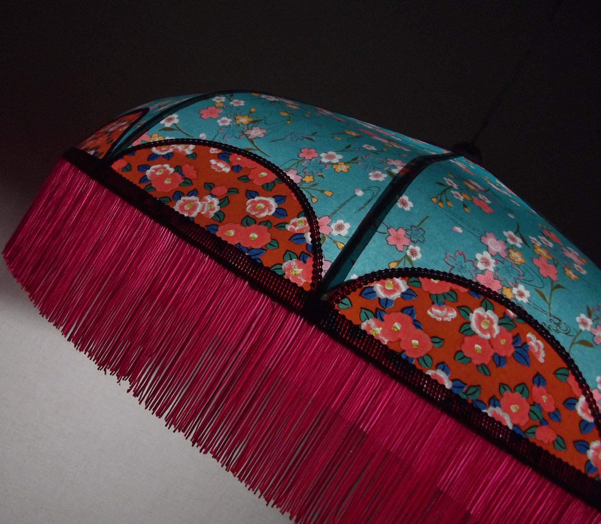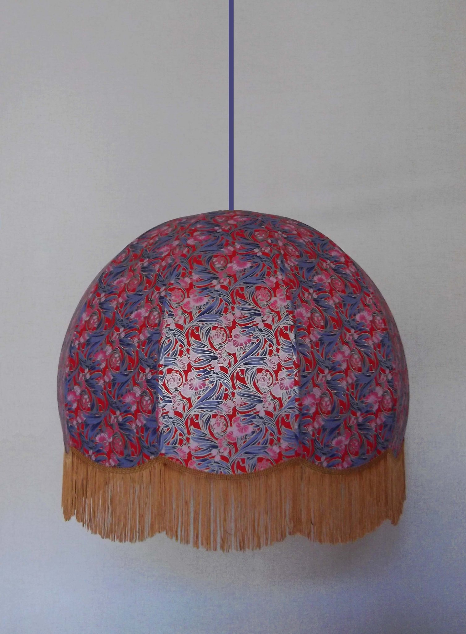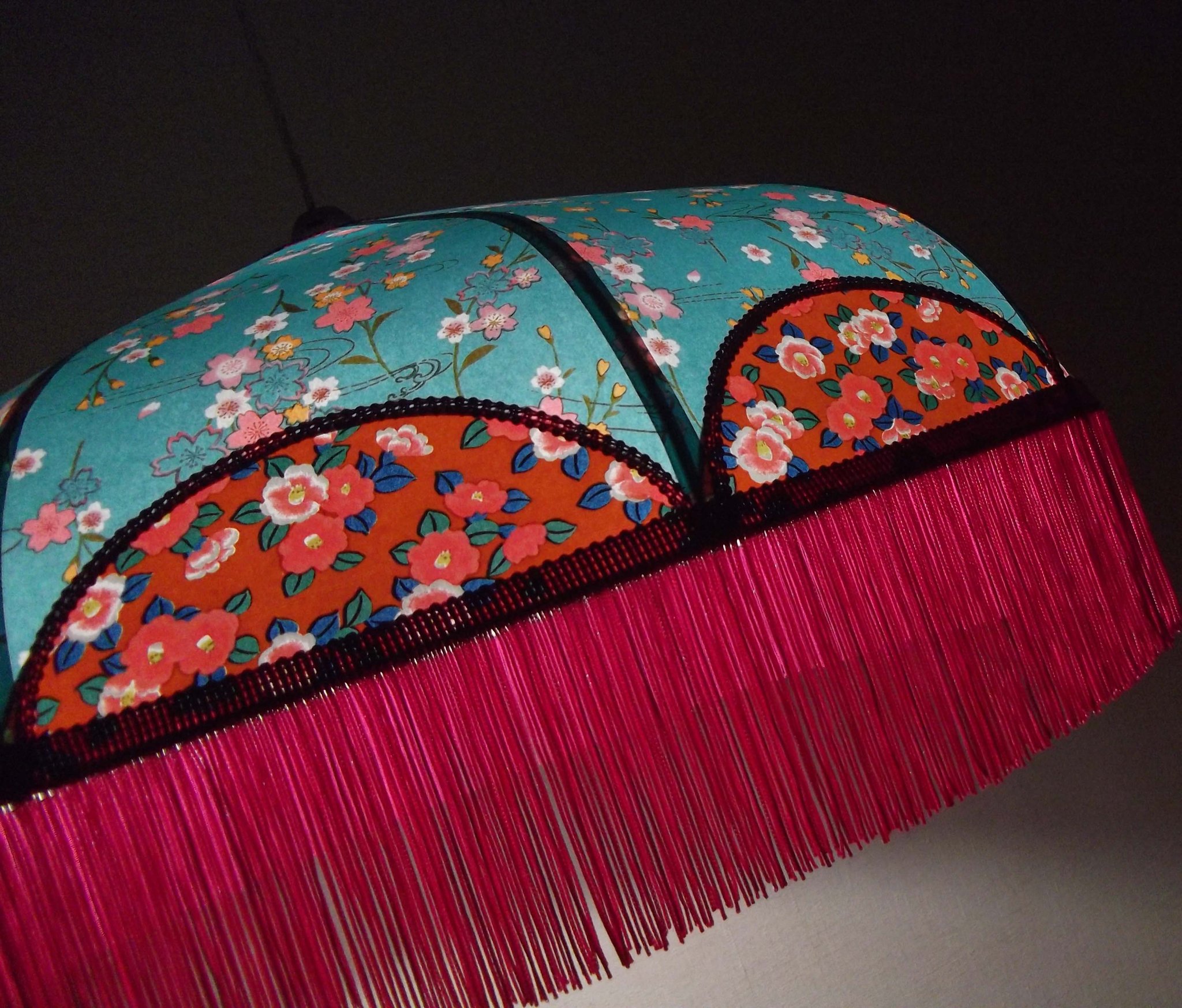Suspension forme dôme feston, papier japonais fleurs bleues et roses sur fond rouge, frange dorée 10 cm.
