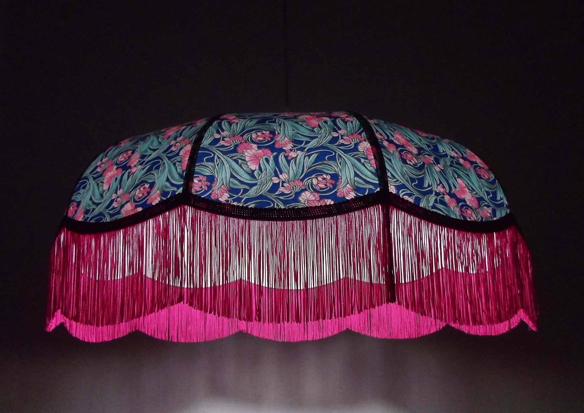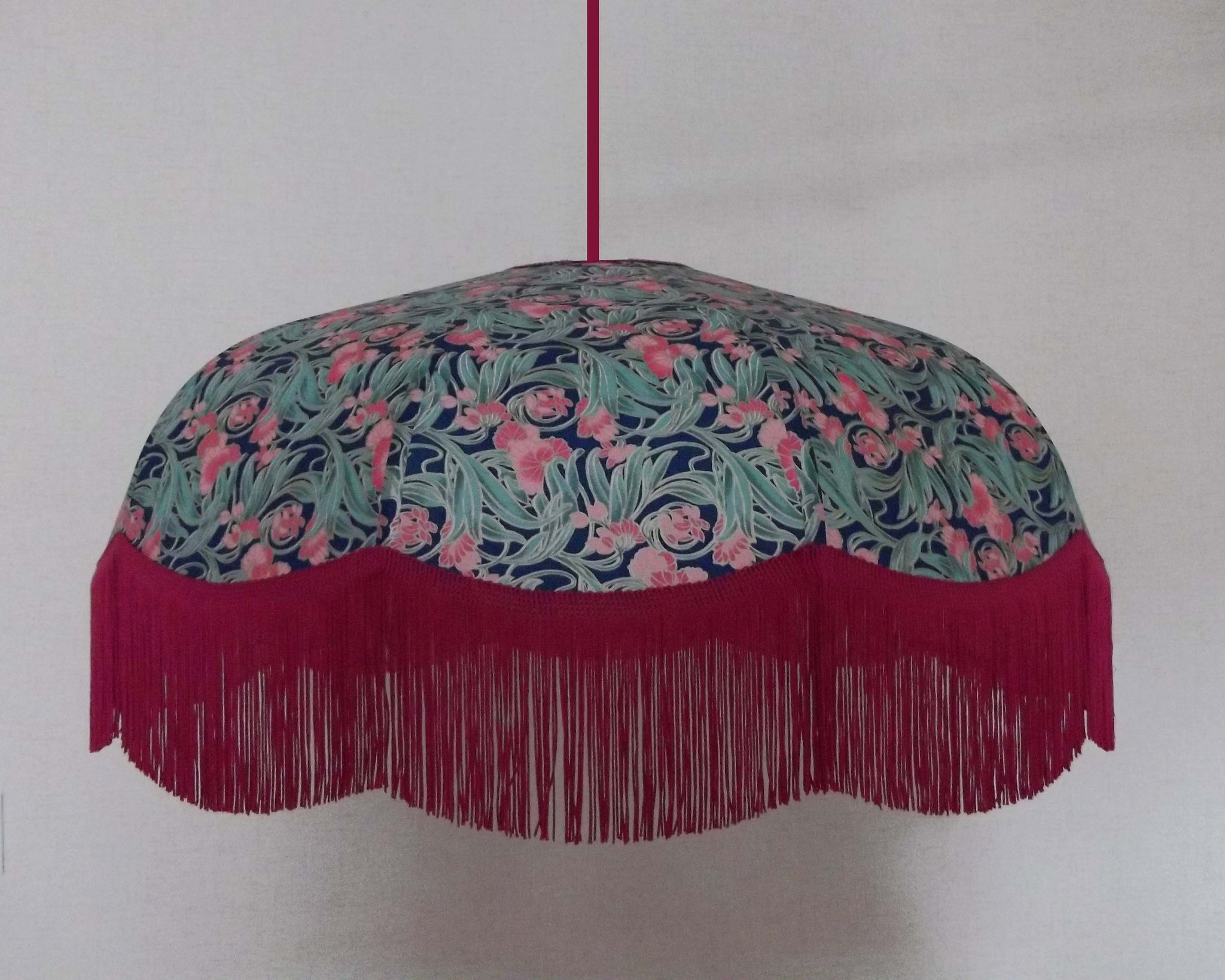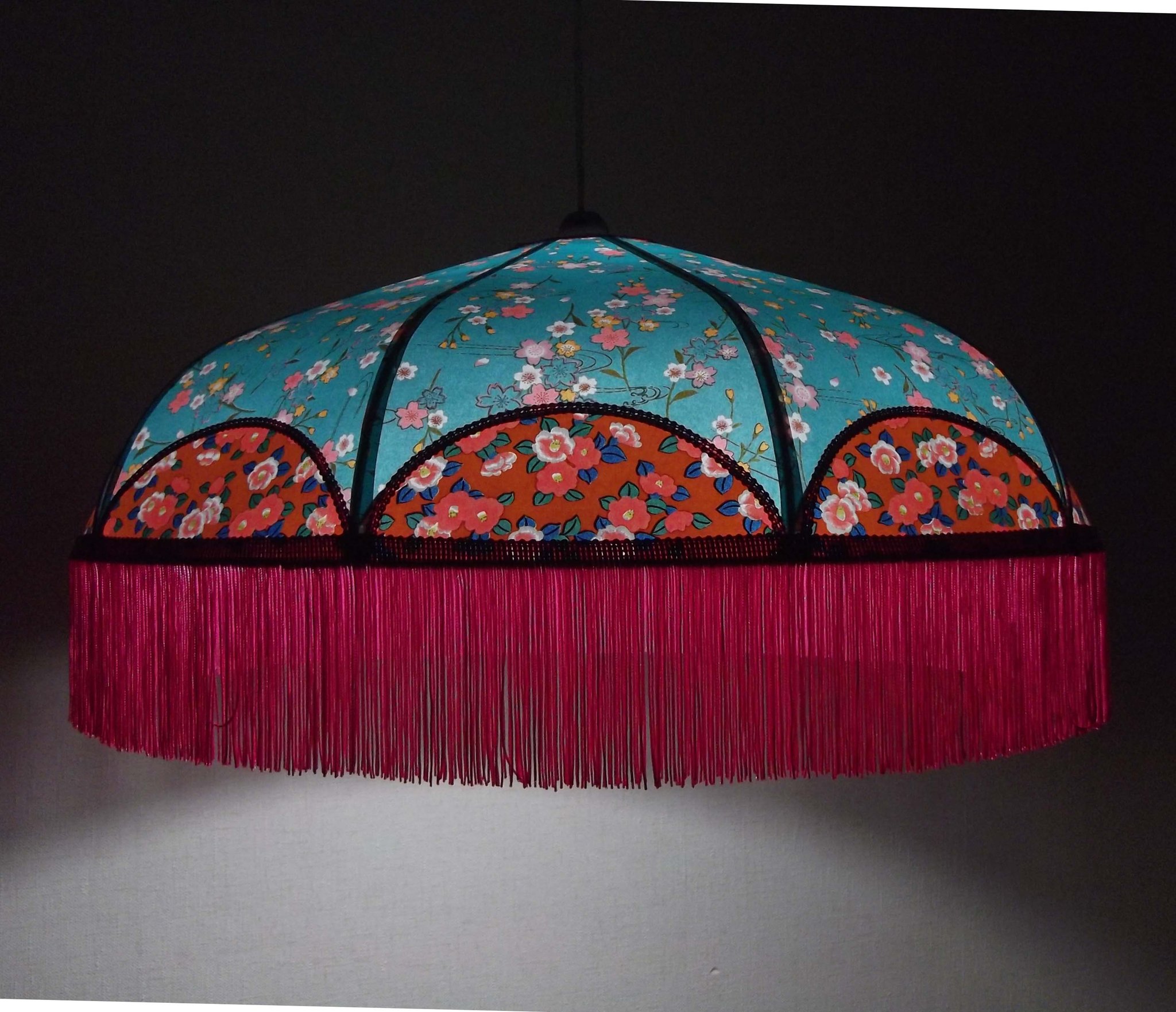 Suspension forme dôme feston, papier japonais fleurs bleues et roses sur fond rouge, frange dorée 10 cm.