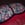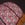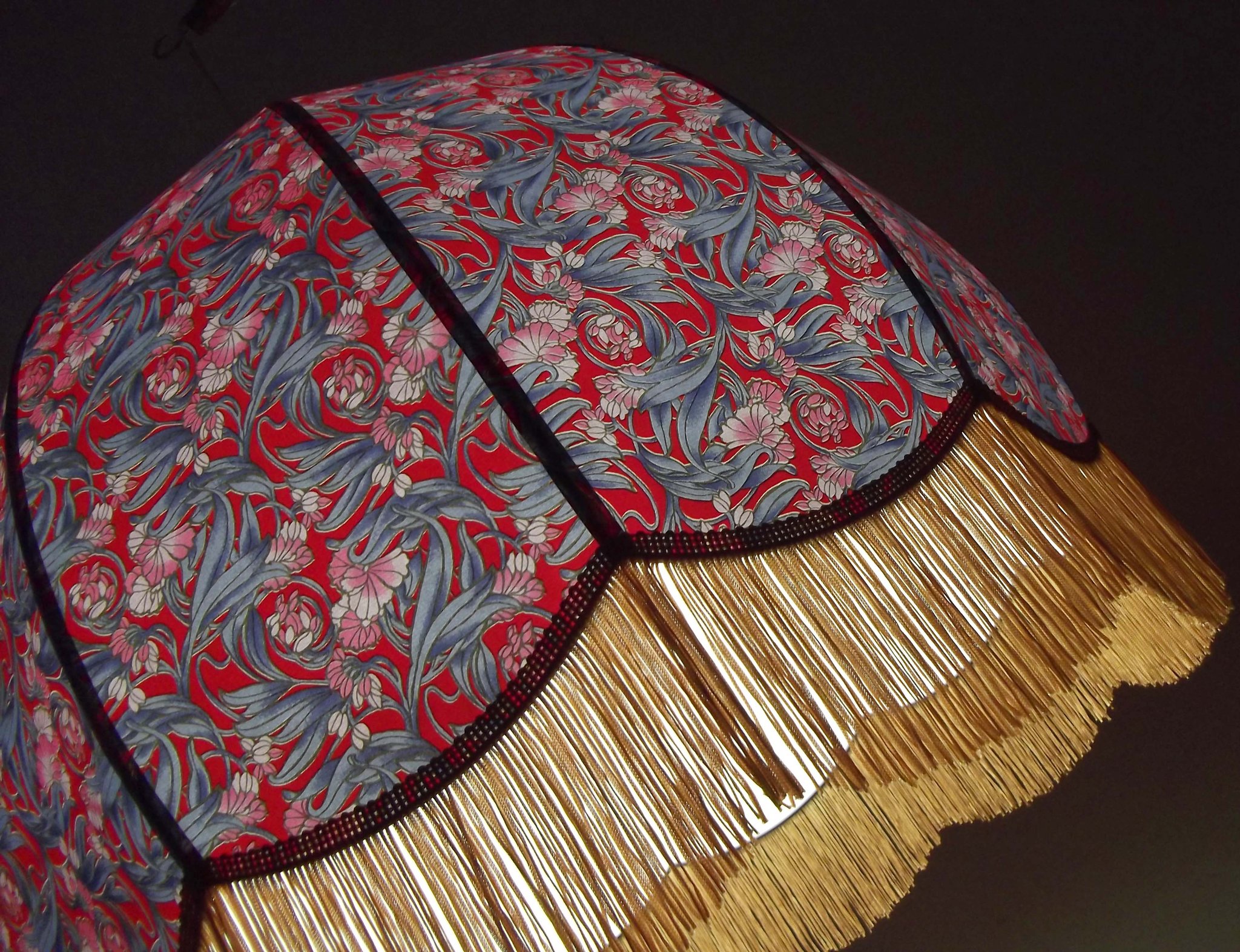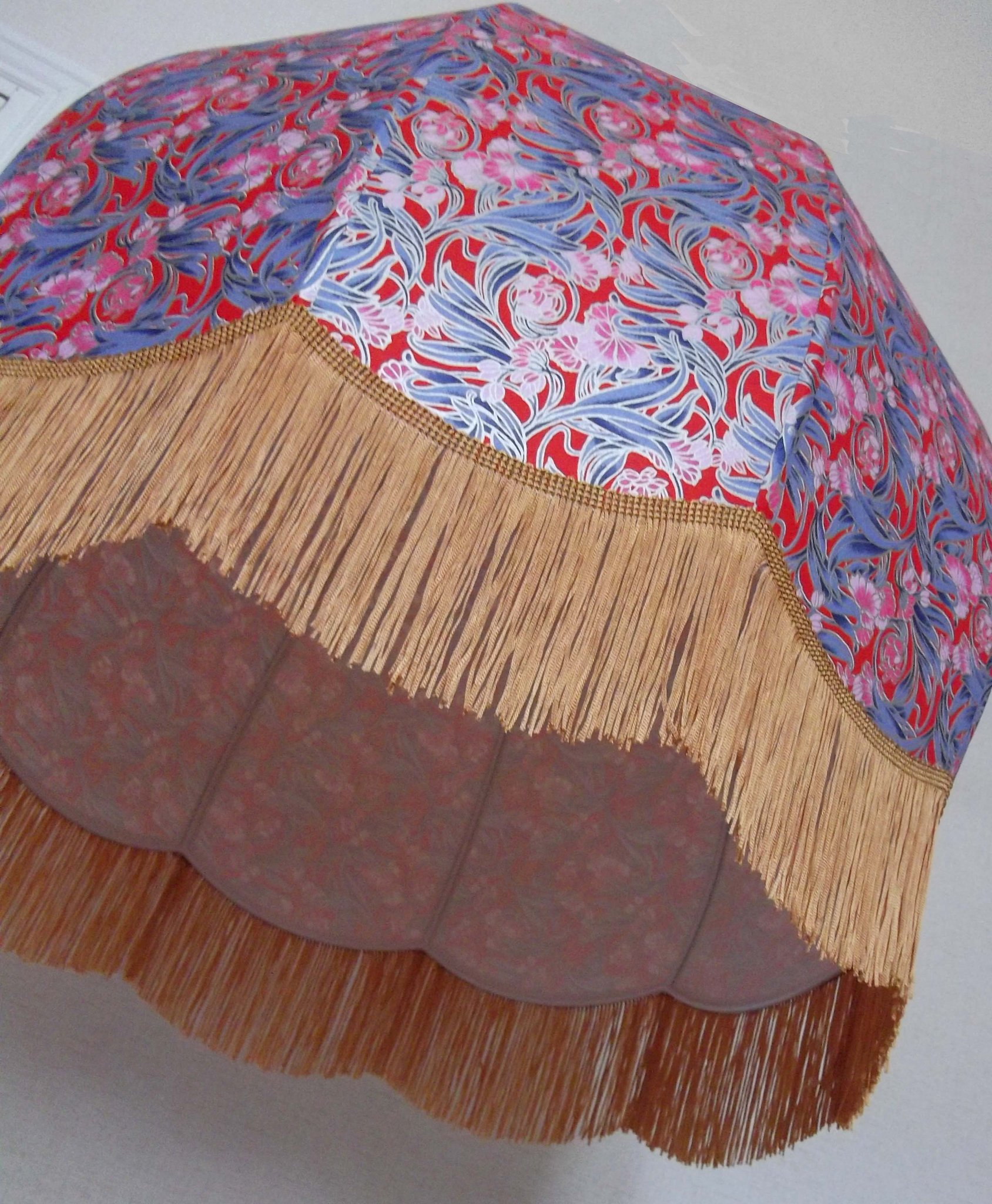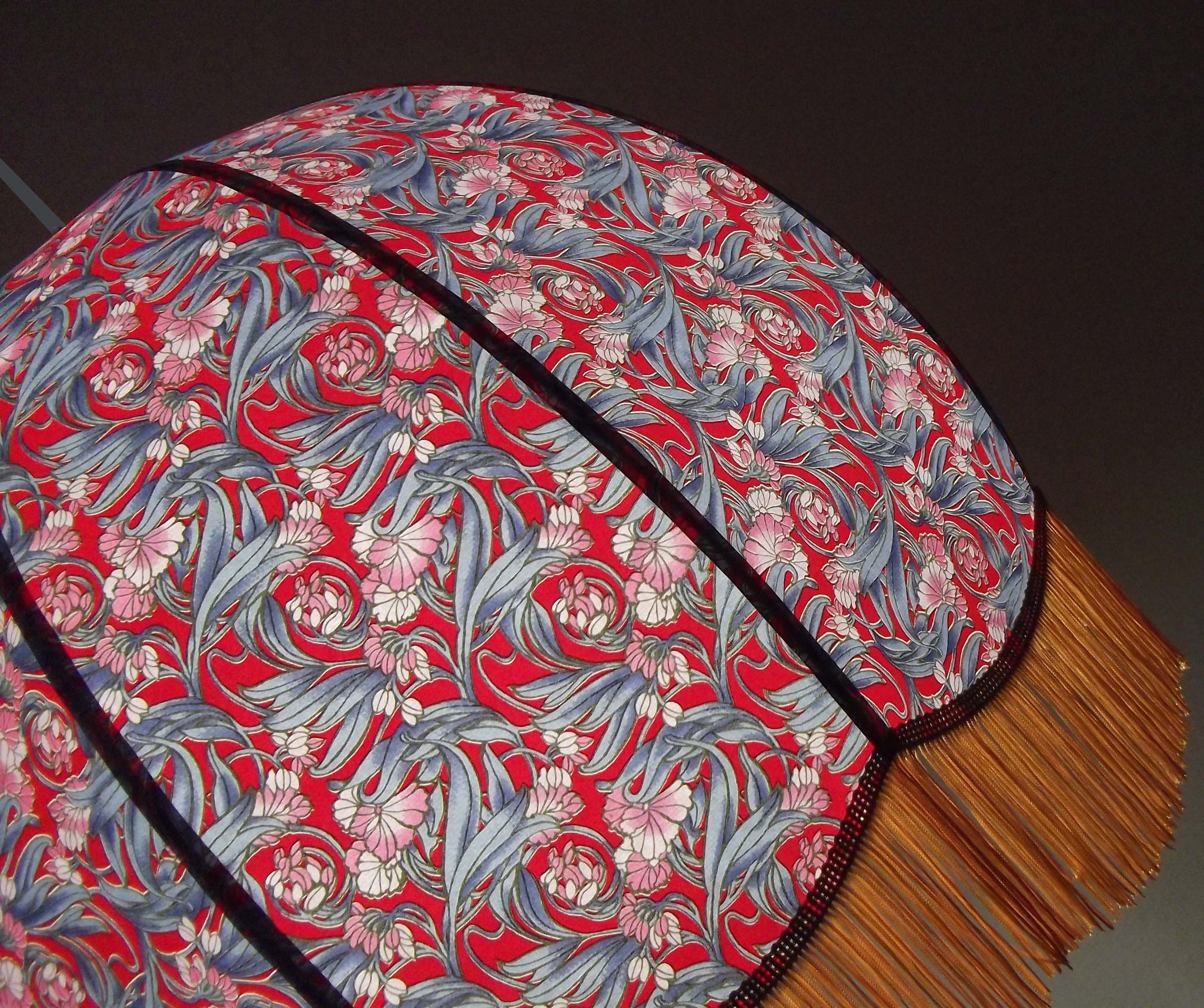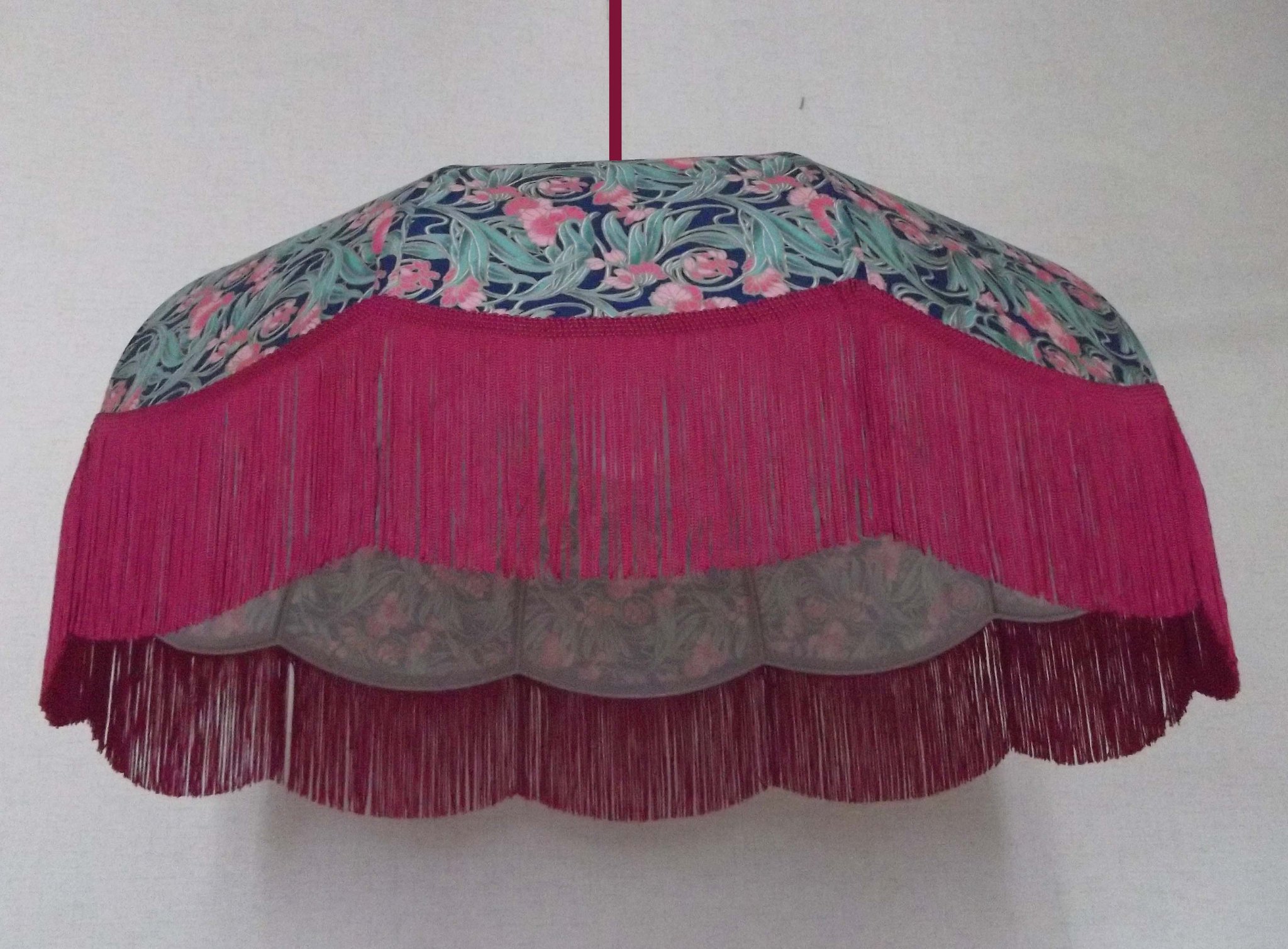 Suspension forme dôme feston, papier japonais fleurs bleues et roses sur fond rouge, frange dorée 10 cm.