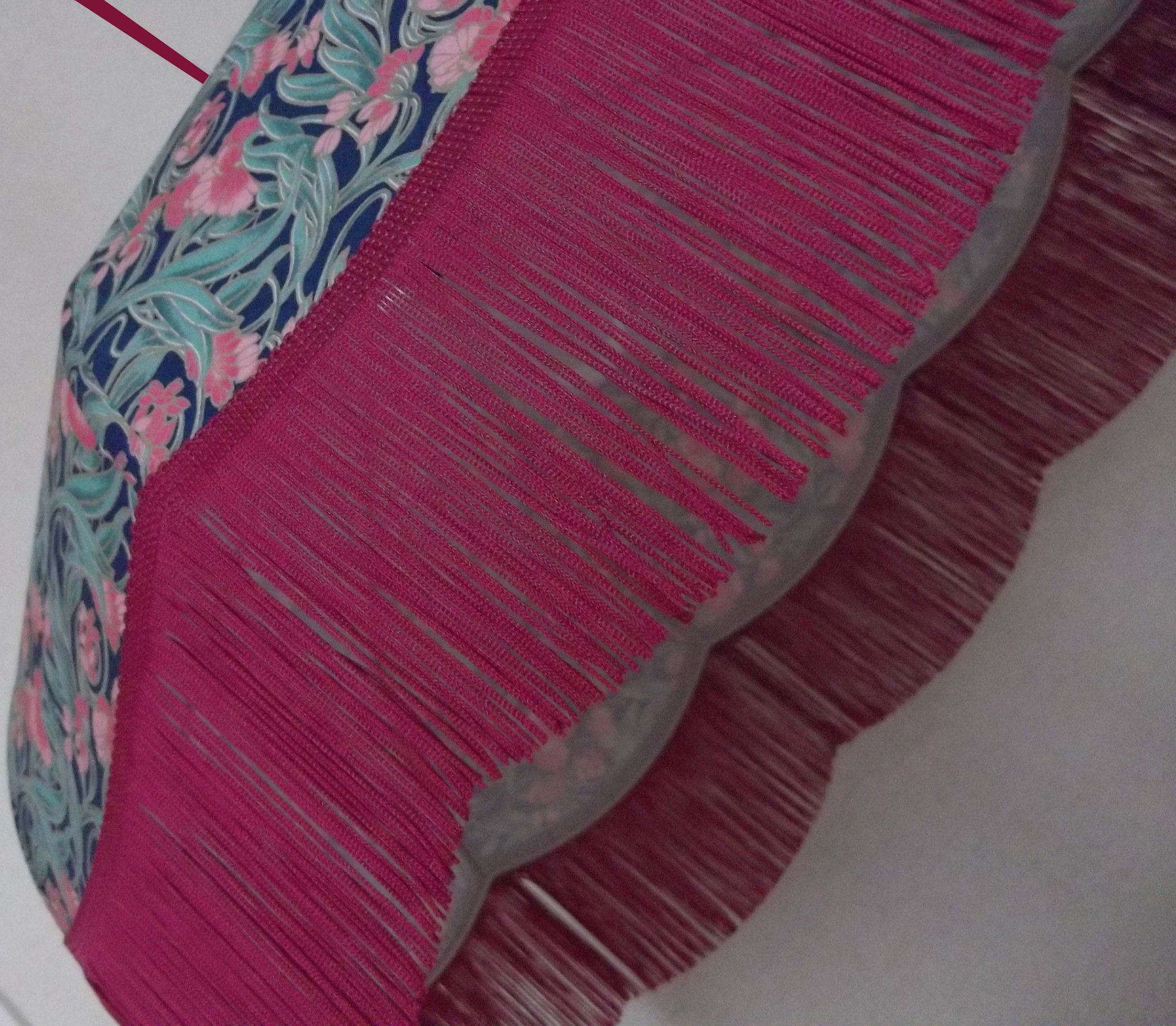 Suspension en papier japonais fleurs style art déco sur fond bleu. Frange 10 cm fuchsia.