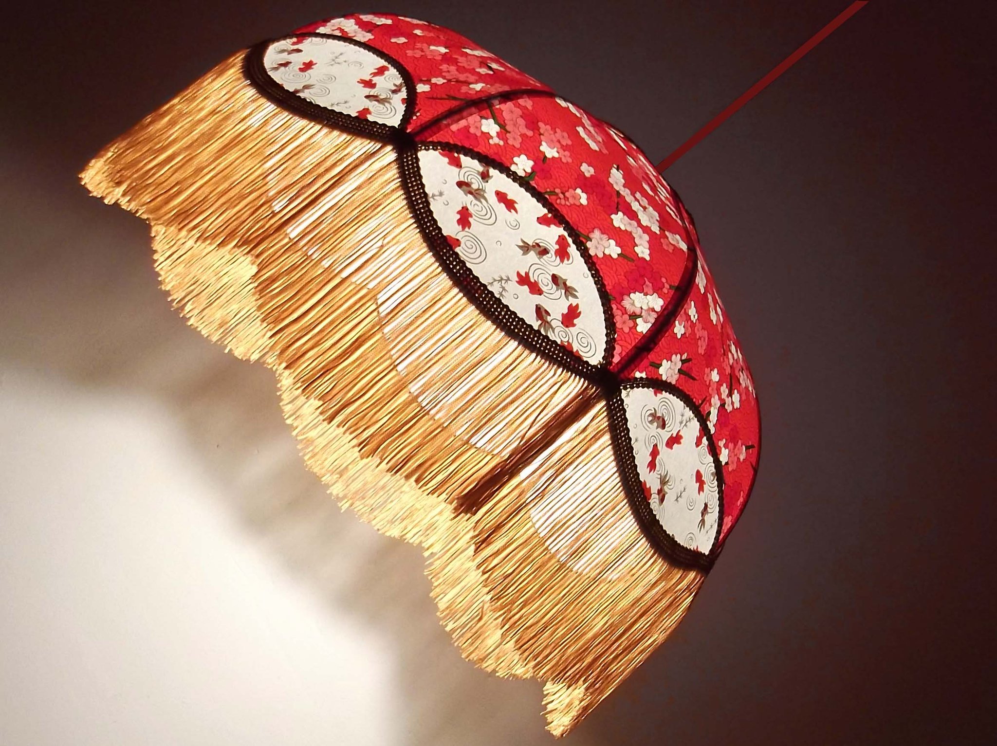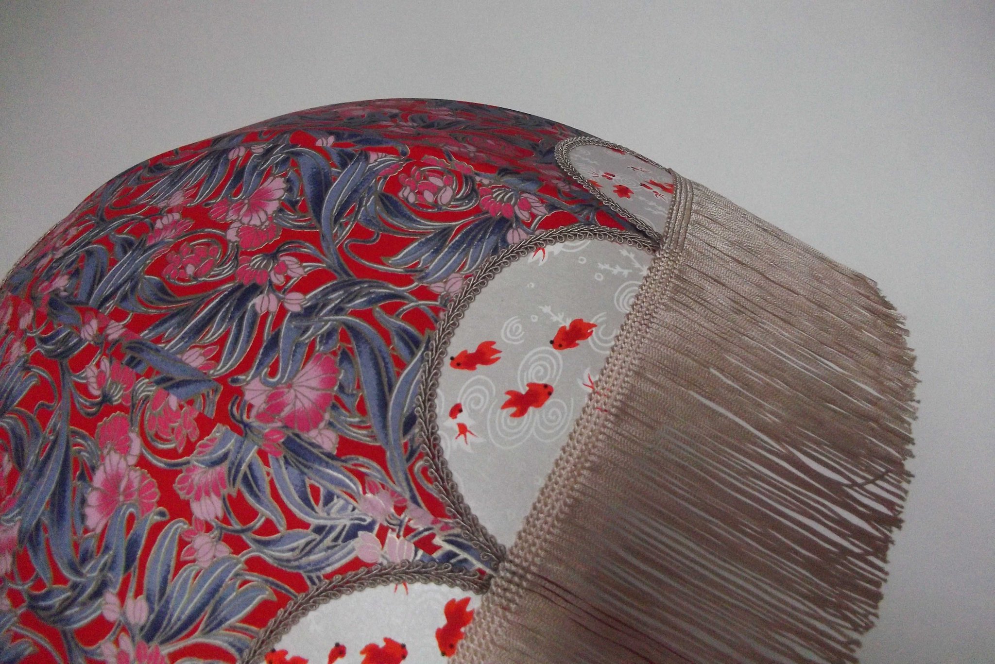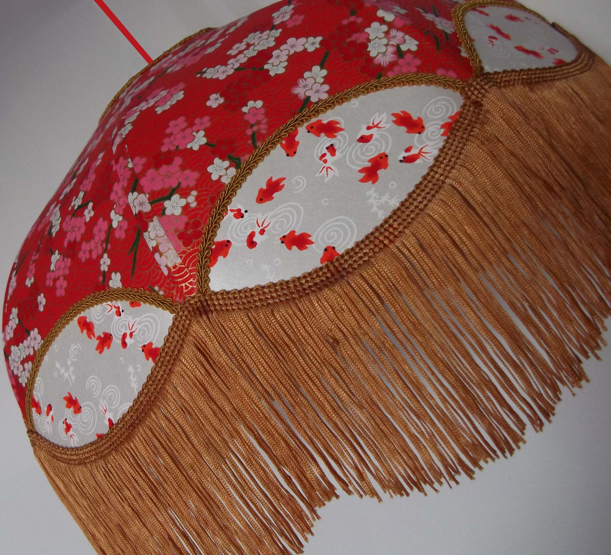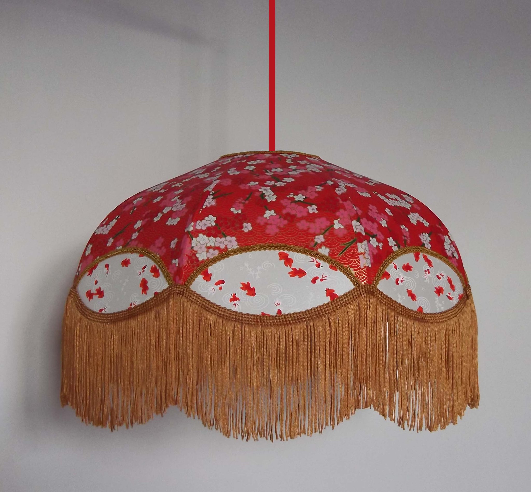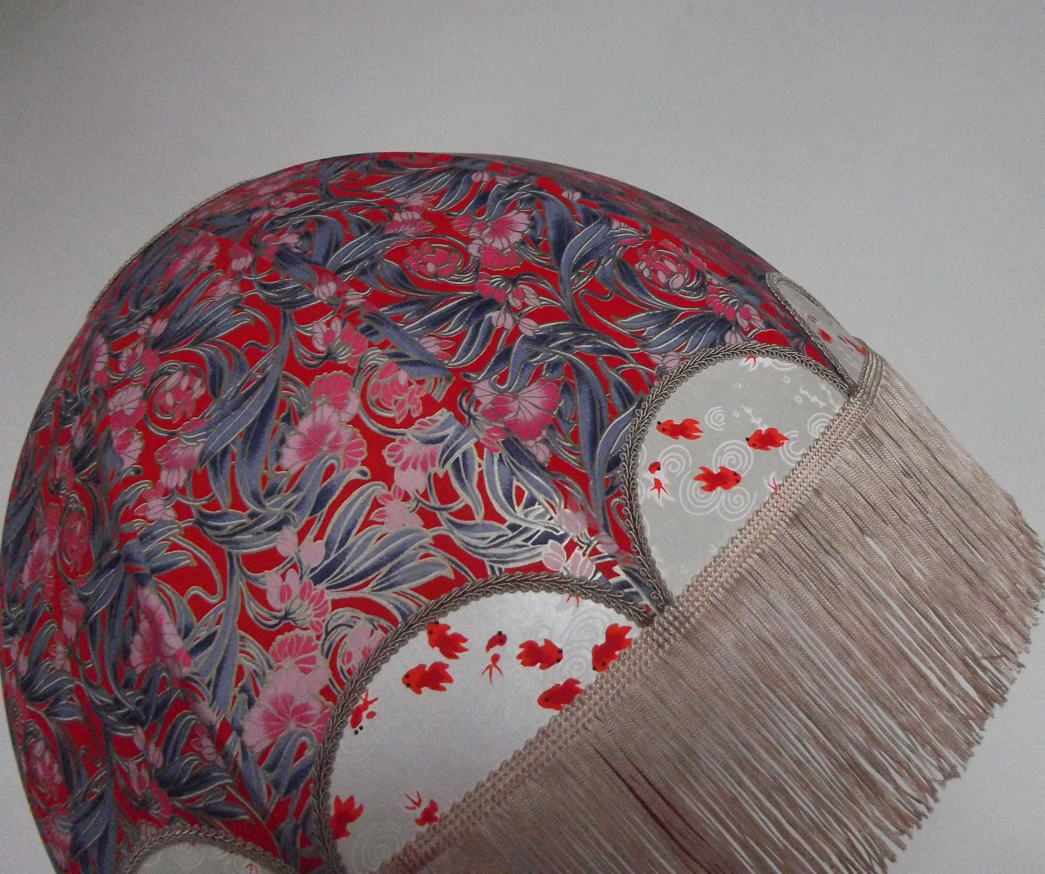Abat-jour en papier japonais fleurs art déco sur fond rouge en haut et poissons rouges sur fond blanc en bas. Frange beige. Diamètre 40 cm, hauteur 23 cm + 10 cm de frange. Douille E27, 40 w max.