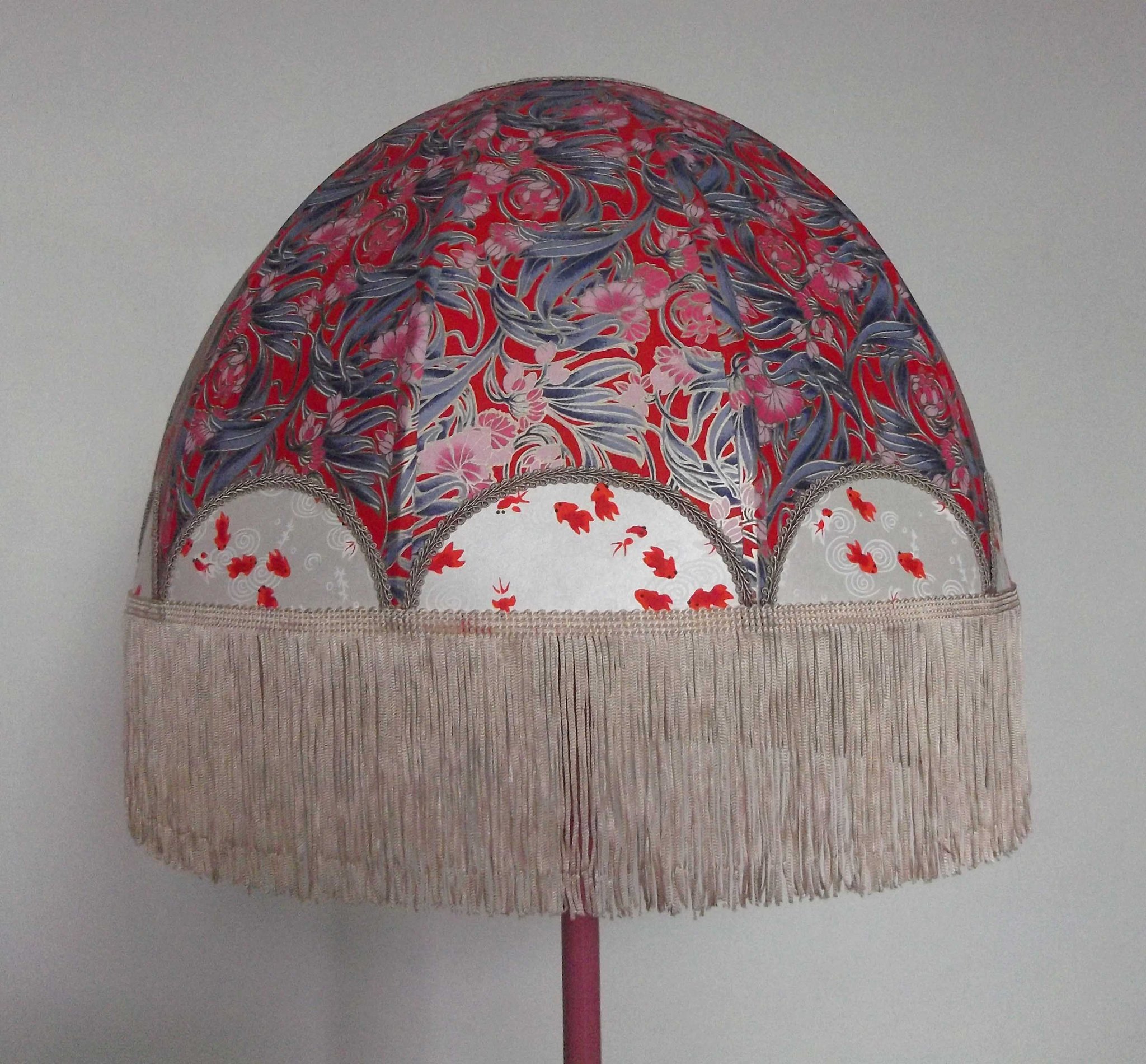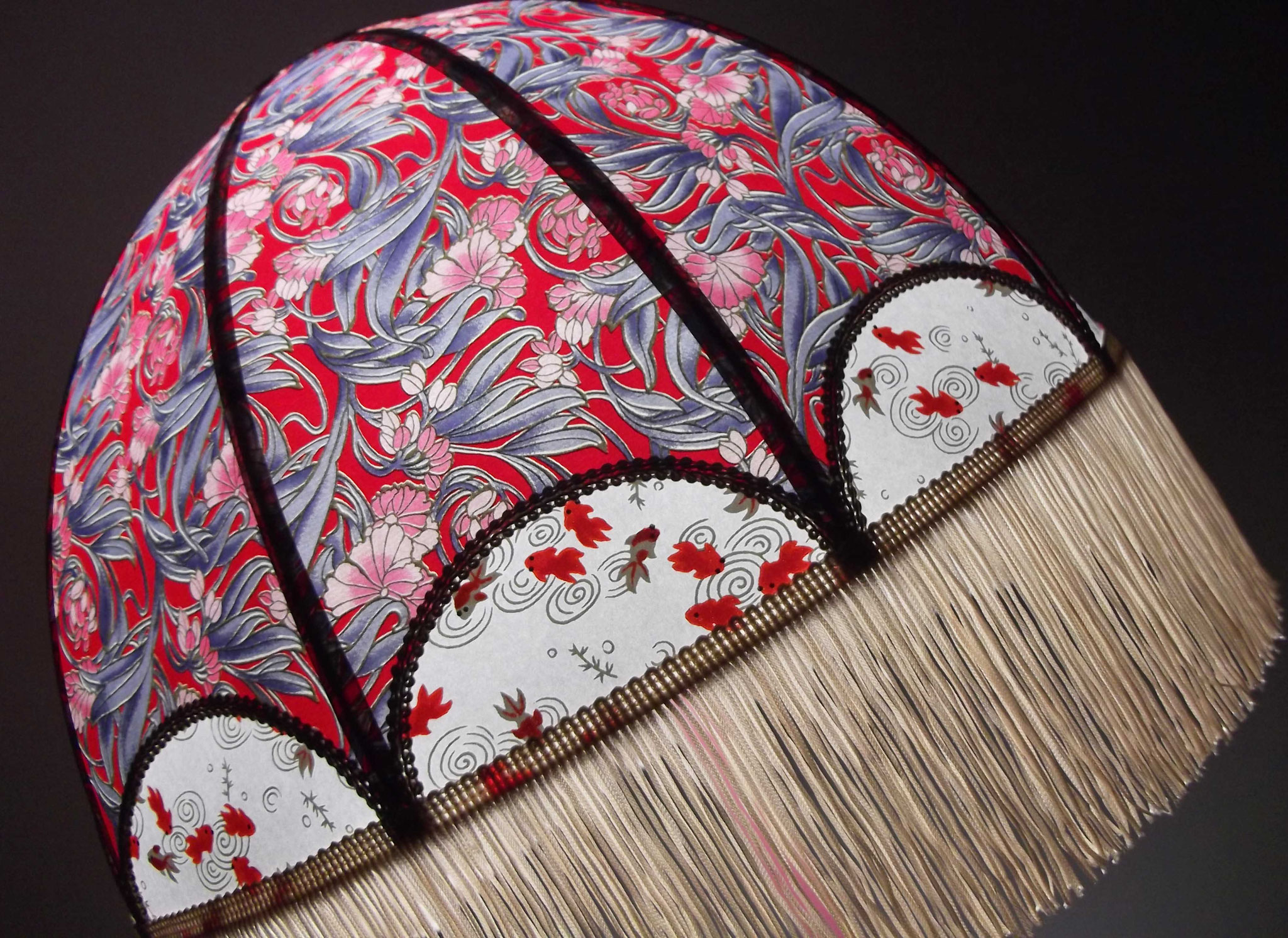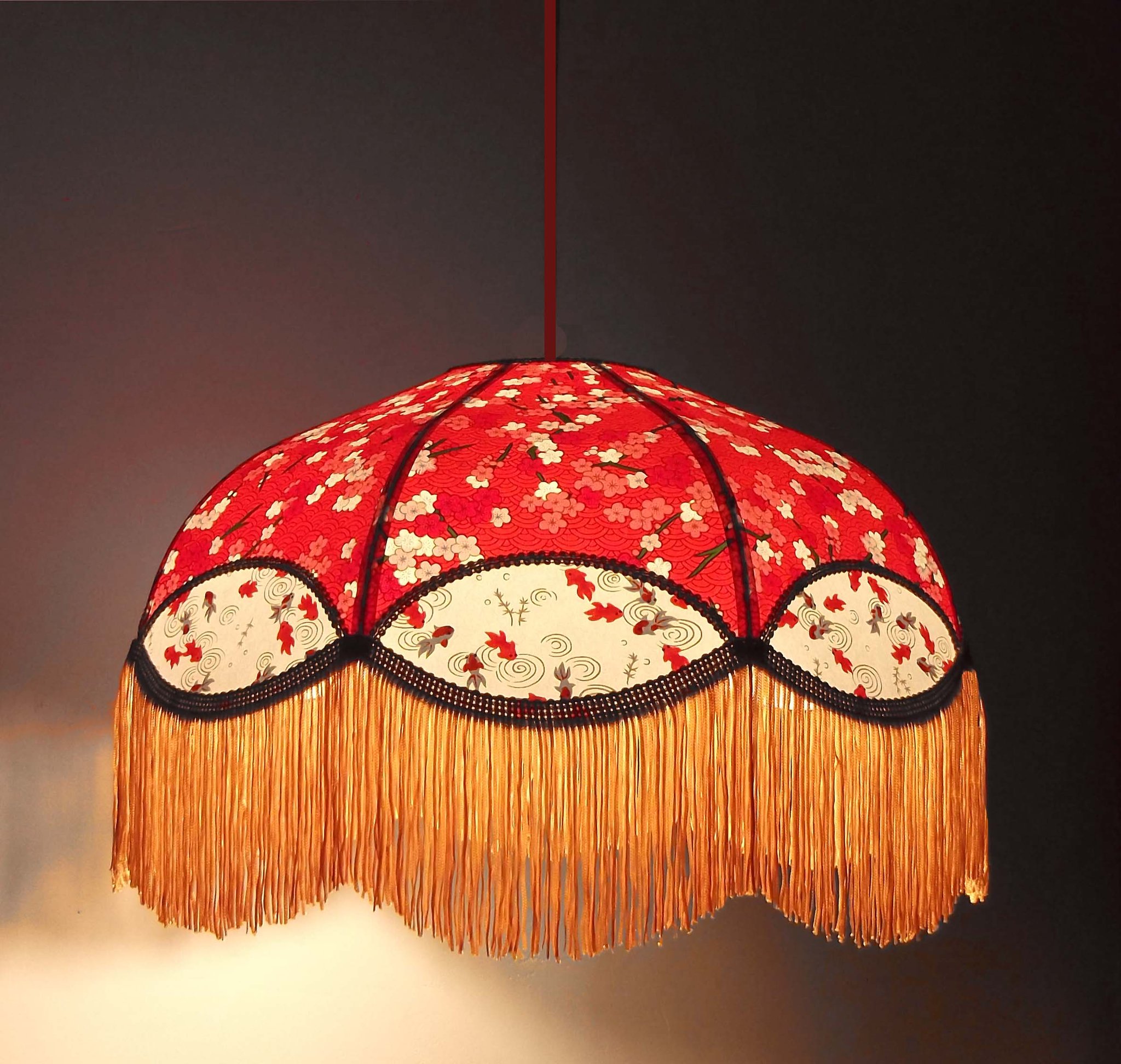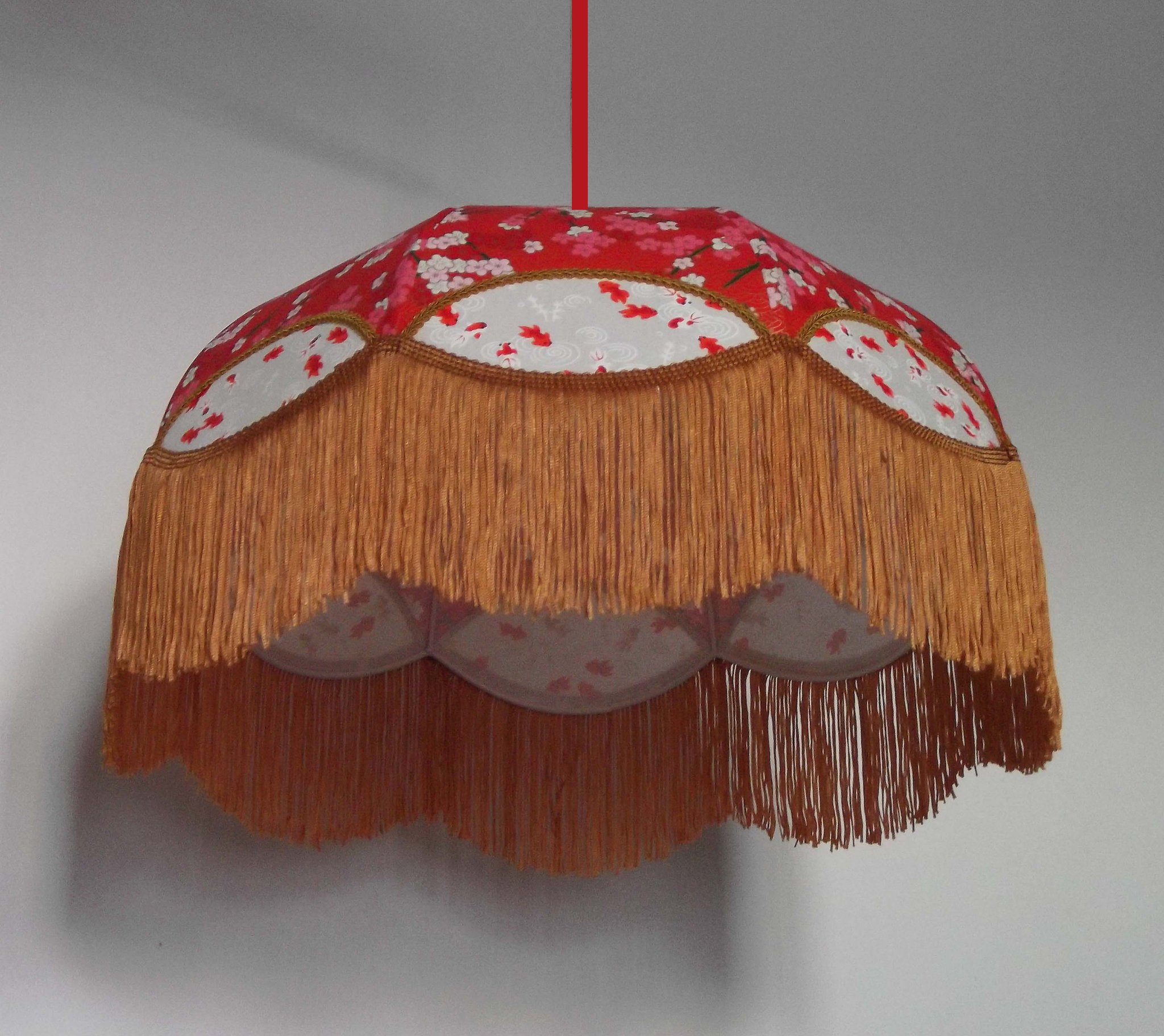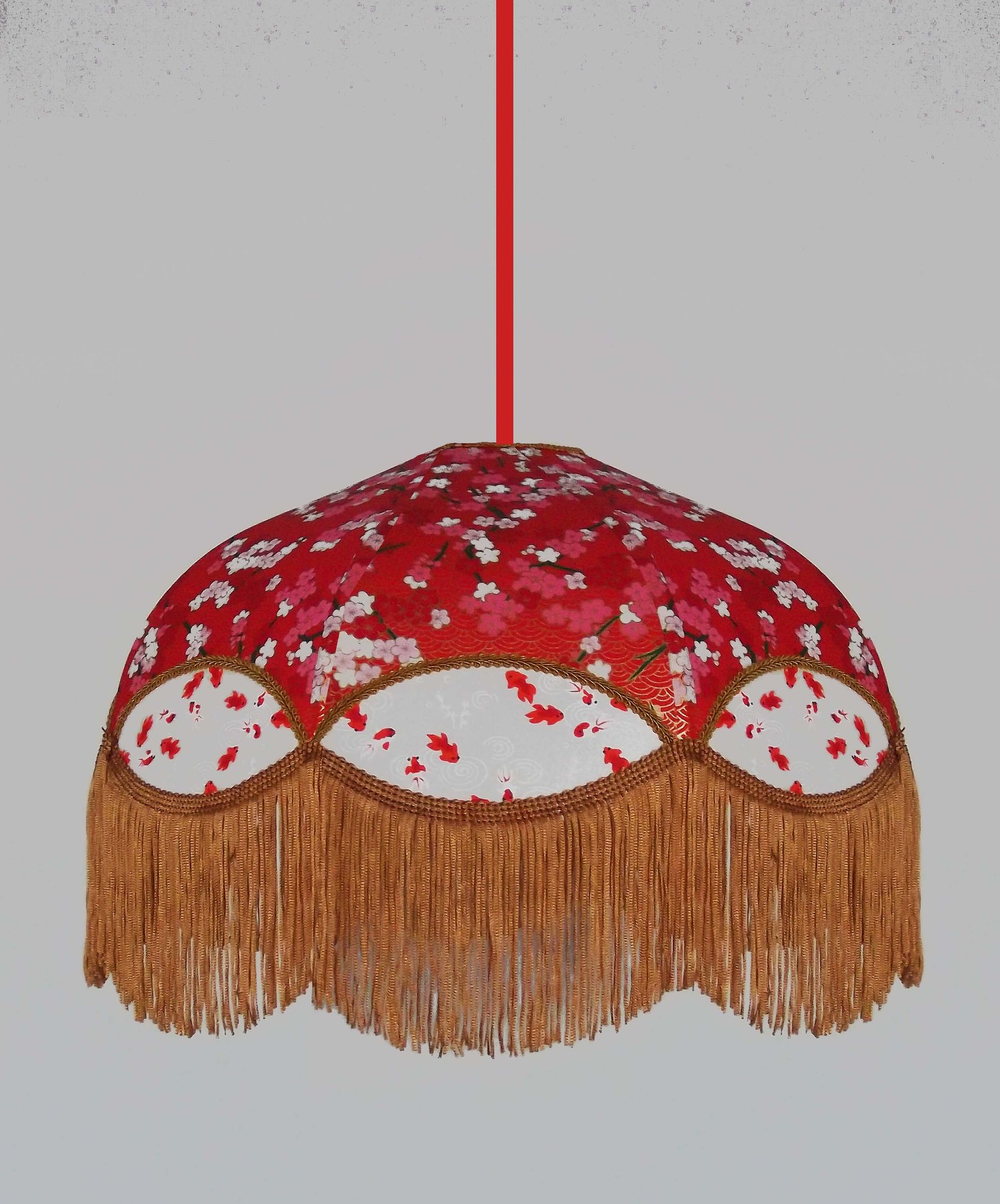 Abat-jour en papier japonais fleurs art déco sur fond rouge en haut et poissons rouges sur fond blanc en bas. Frange beige. Diamètre 40 cm, hauteur 23 cm + 10 cm de frange. Douille E27, 40 w max.