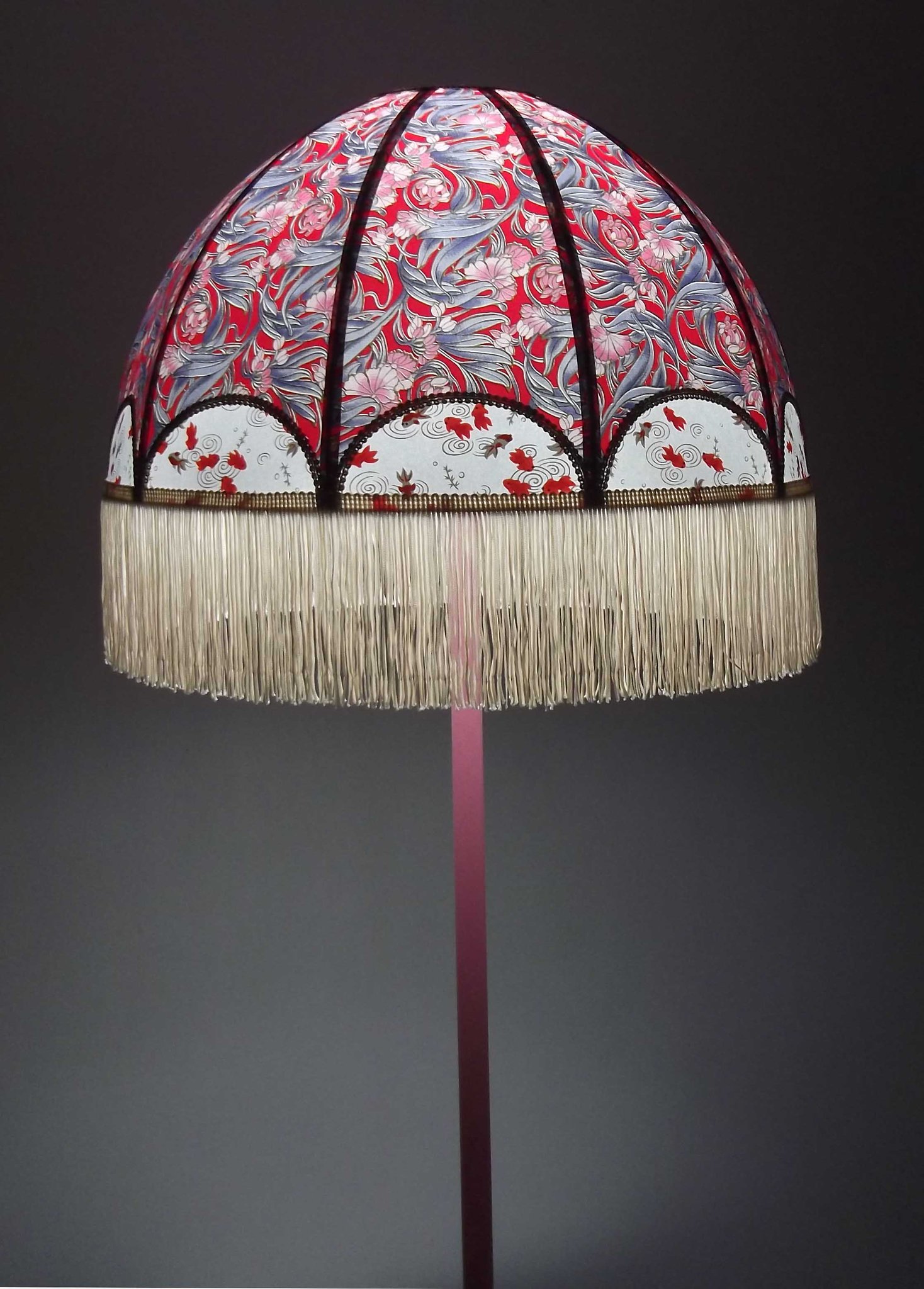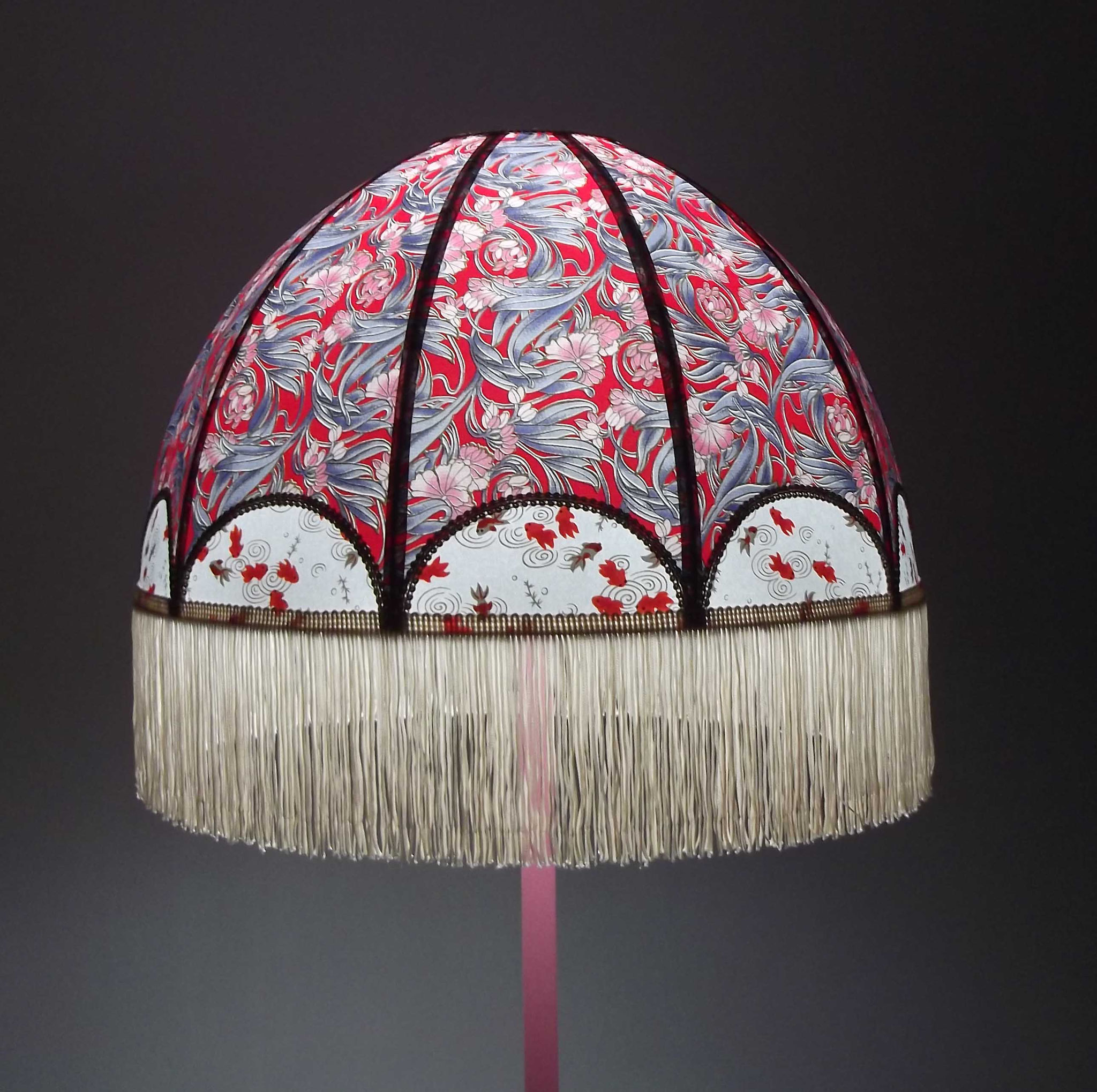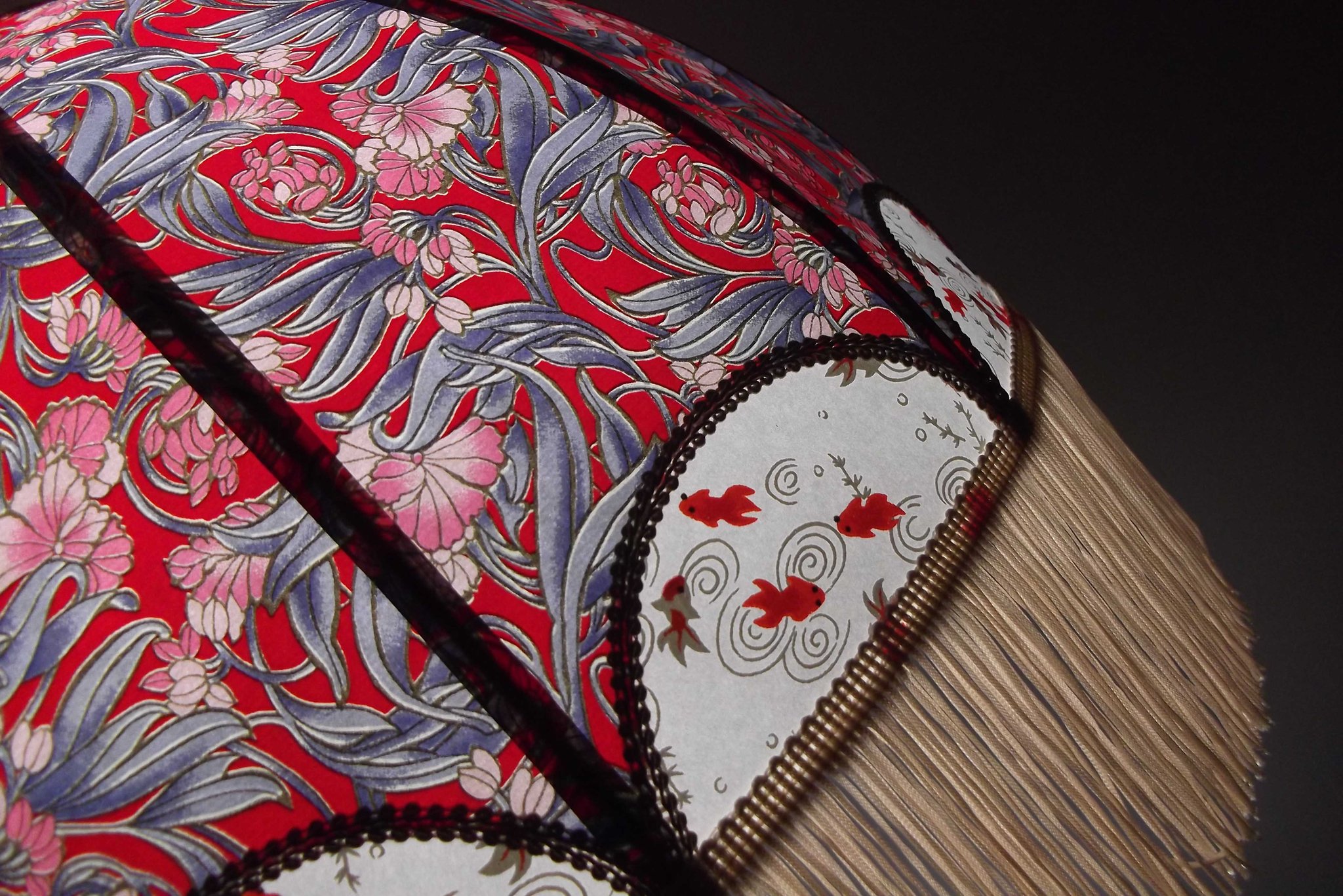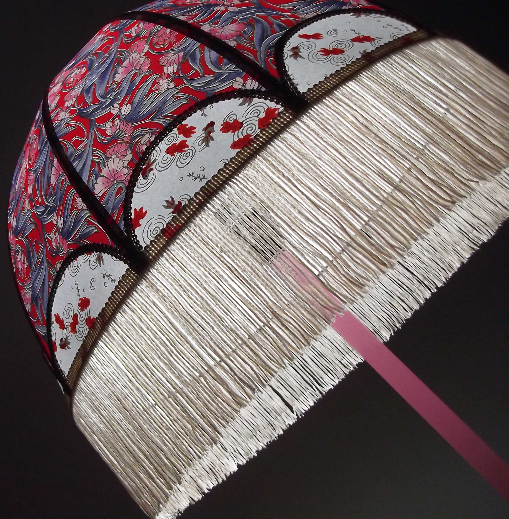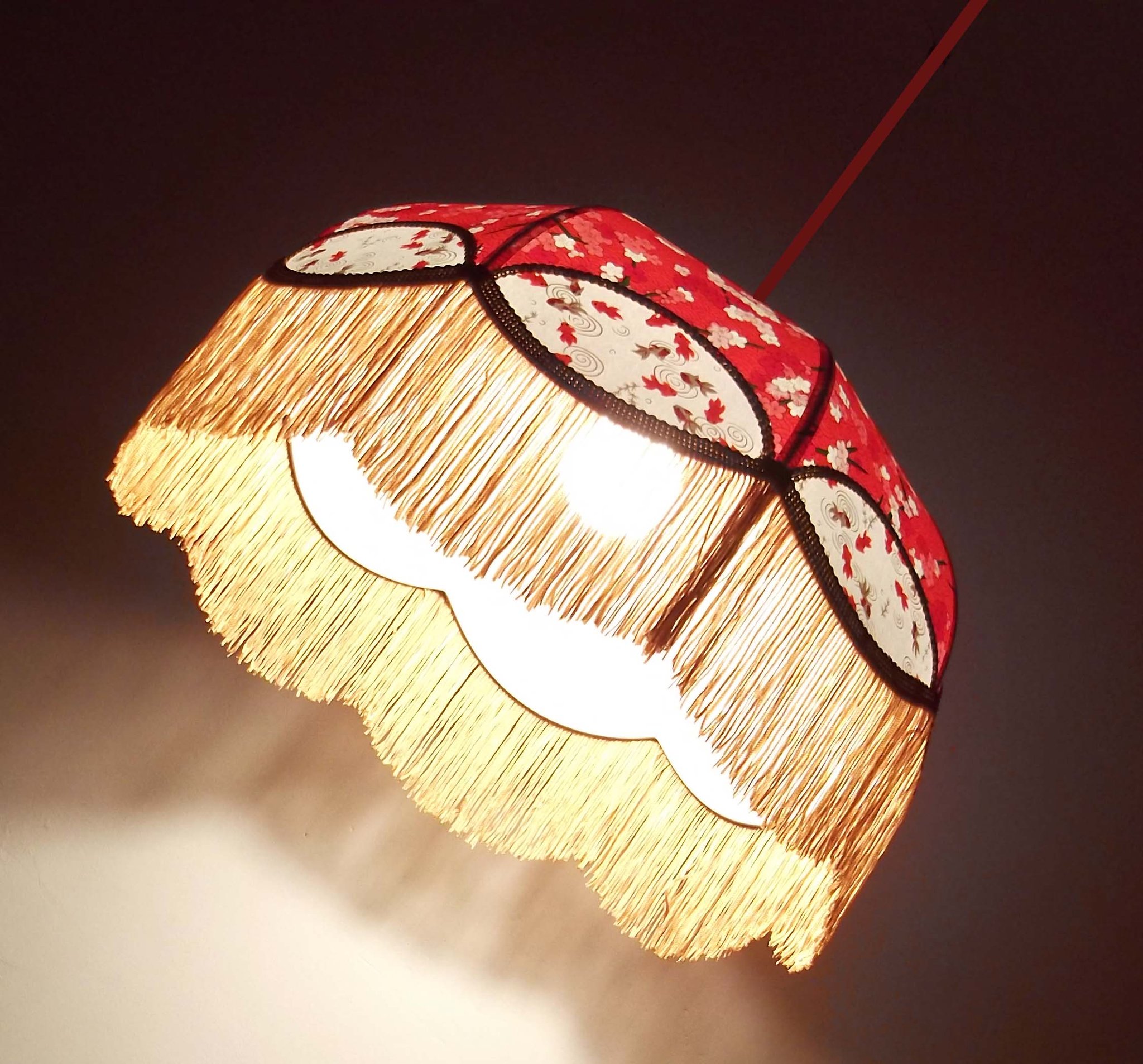 Abat-jour en papier japonais fleurs art déco sur fond rouge en haut et poissons rouges sur fond blanc en bas. Frange beige. Diamètre 40 cm, hauteur 23 cm + 10 cm de frange. Douille E27, 40 w max.