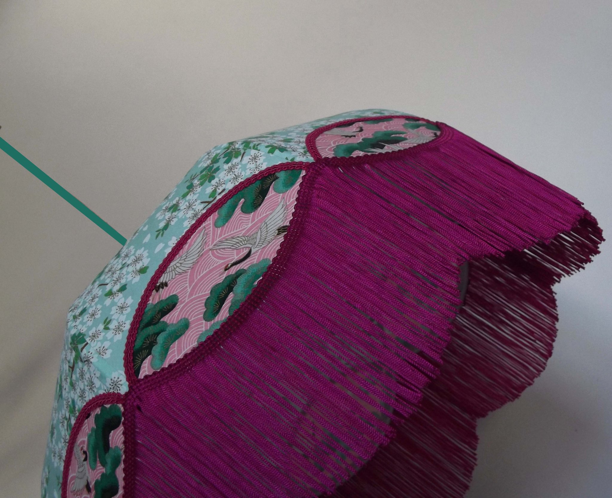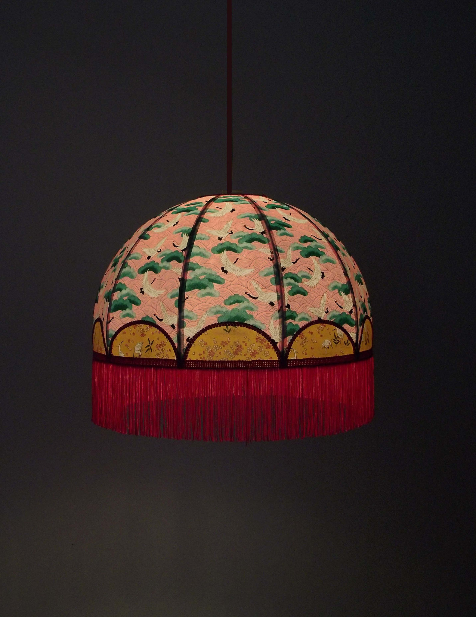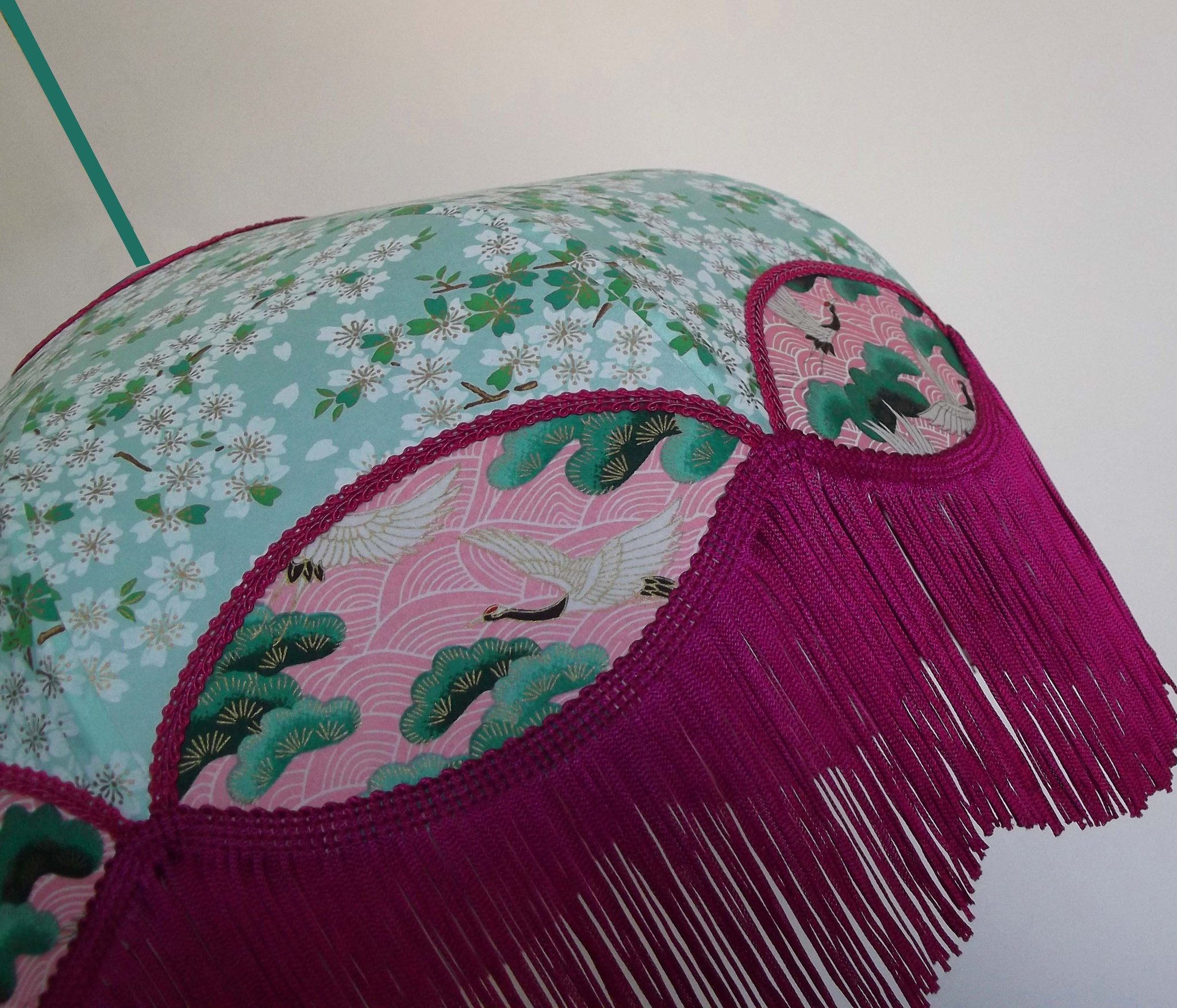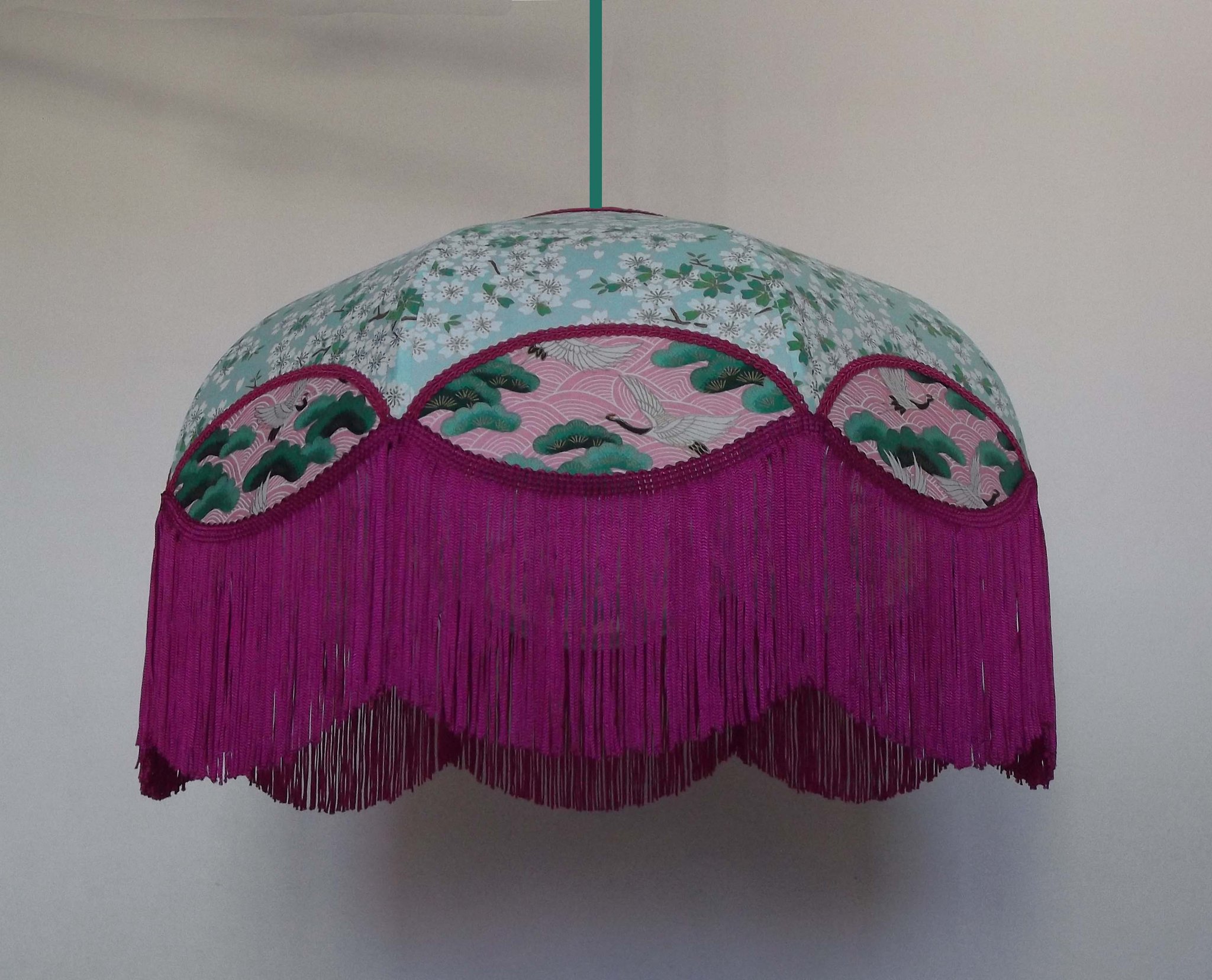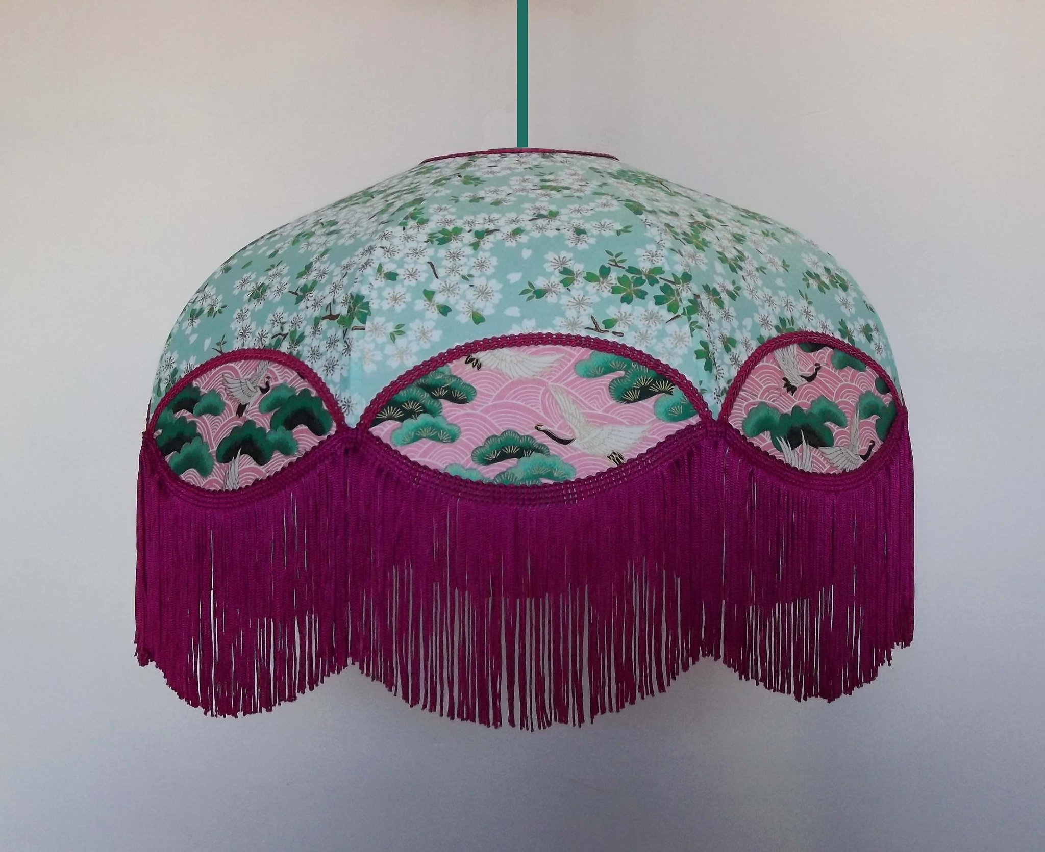 Suspension en papier japonais fleurs de cerisier sur fond vert d'eau en haut et grues sur fond rose en bas. Frange fuschia. Forme dôme. Diamètre 40 cm, hauteur 16 cm + 10 cm de frange. Douille E27, 40 w max.