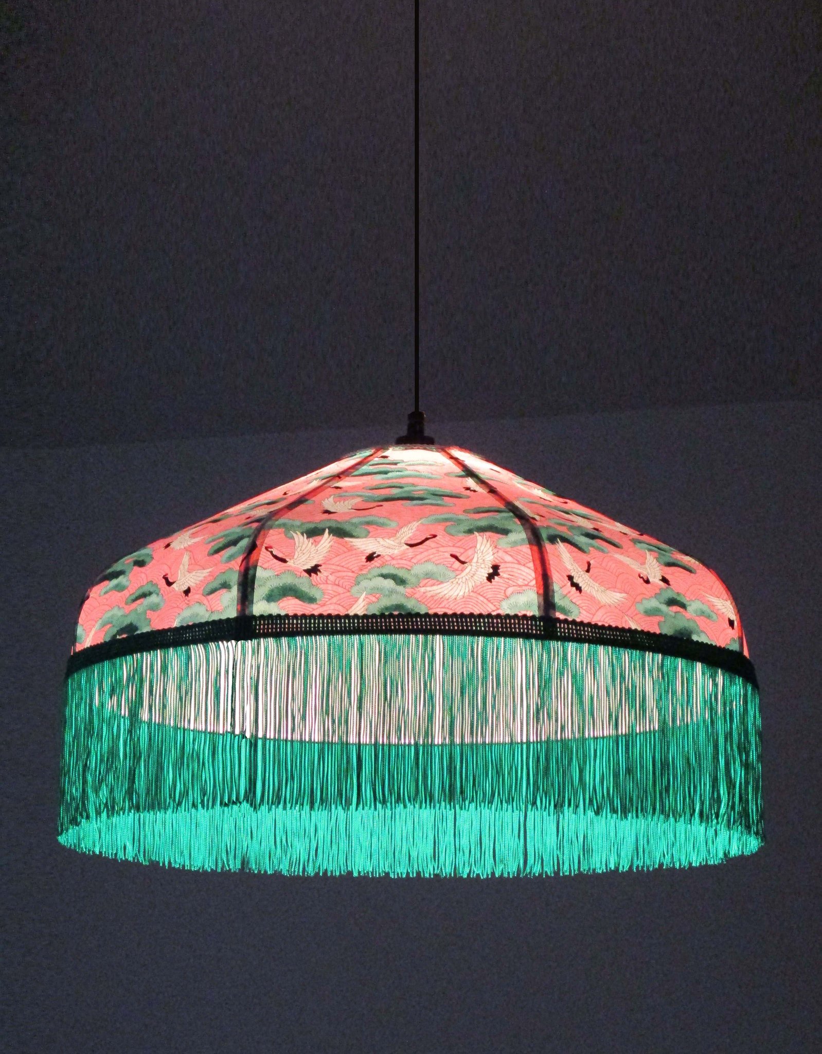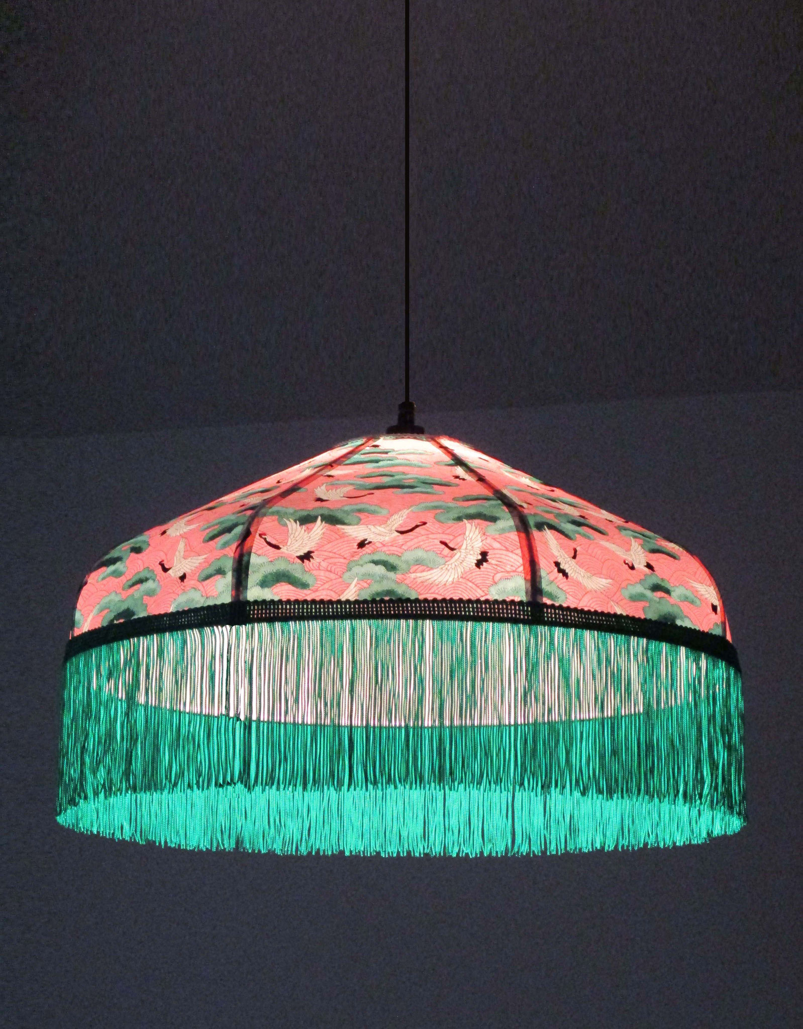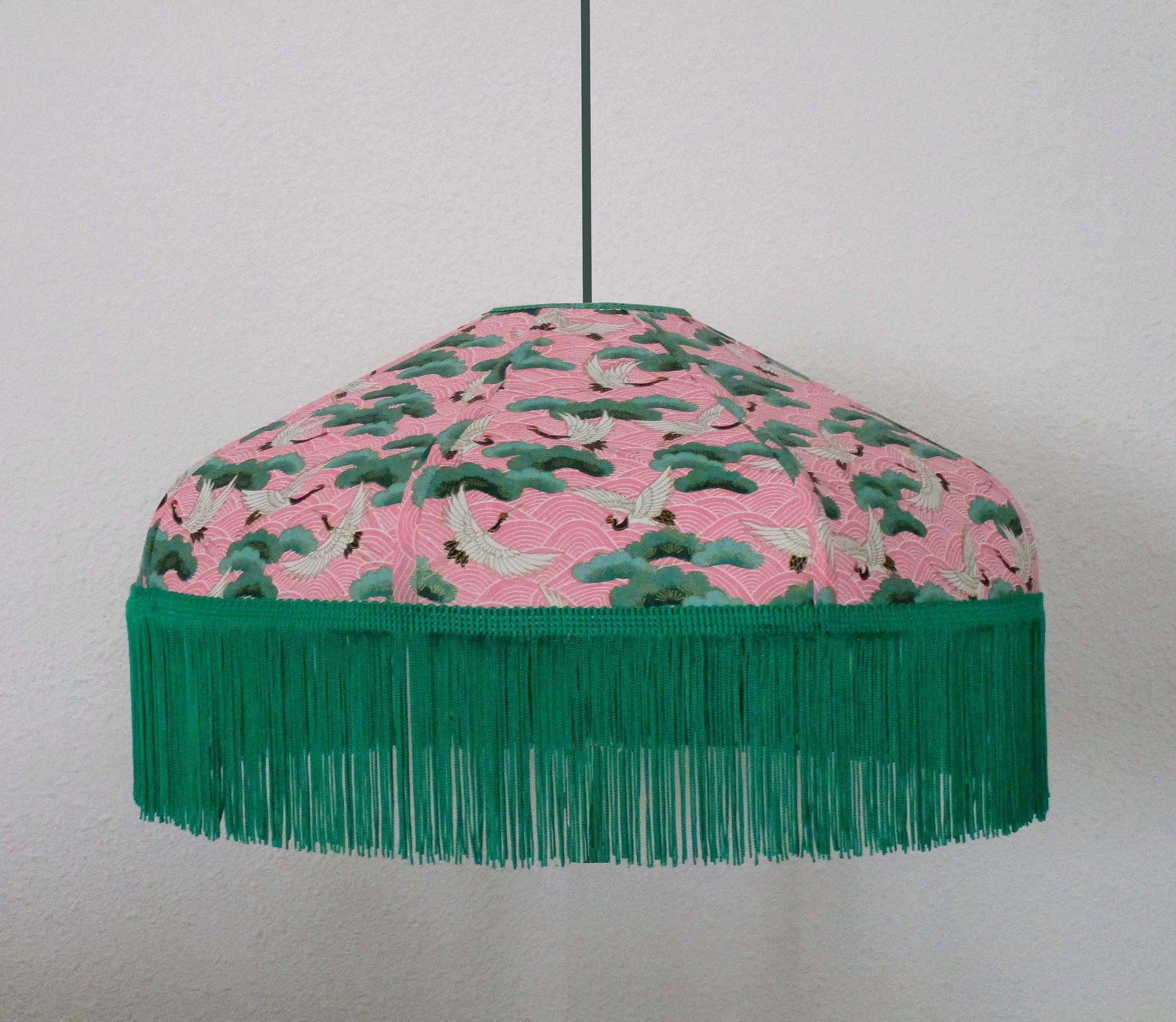 Suspension 40 cm de diamètre. Papier japonais grues sur fond rose. Frange verte. Hauteur 14 cm + 10 cm de frange. Douille E27, 40 w max. Sur commande, envoi sous 15 jours.