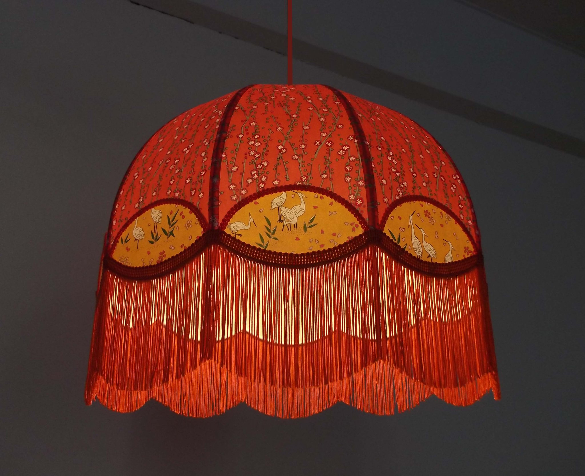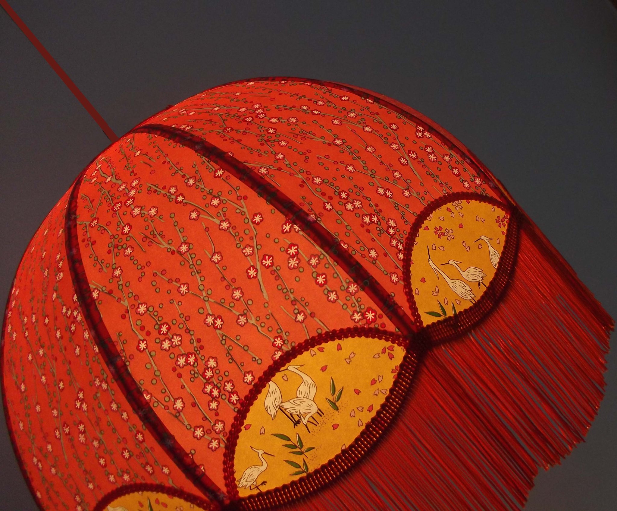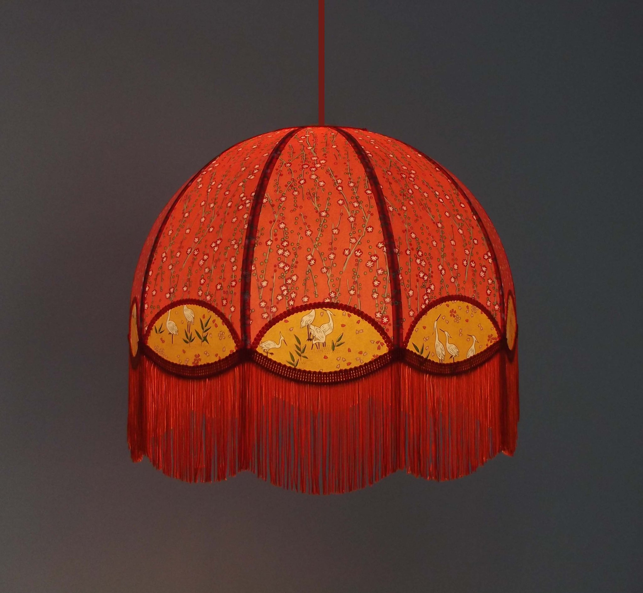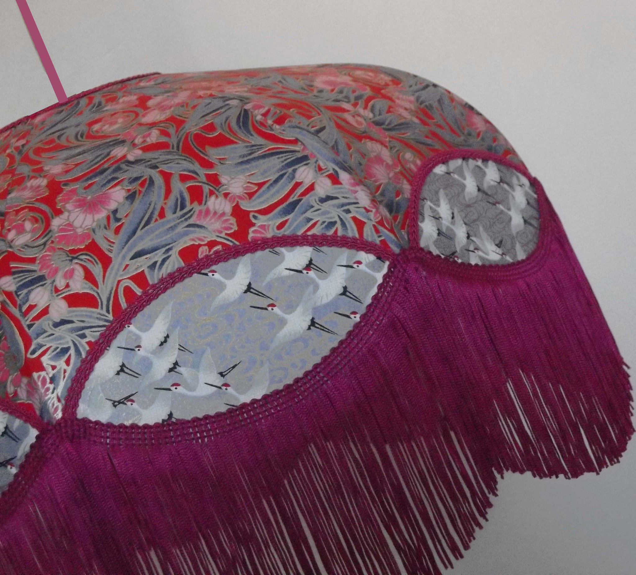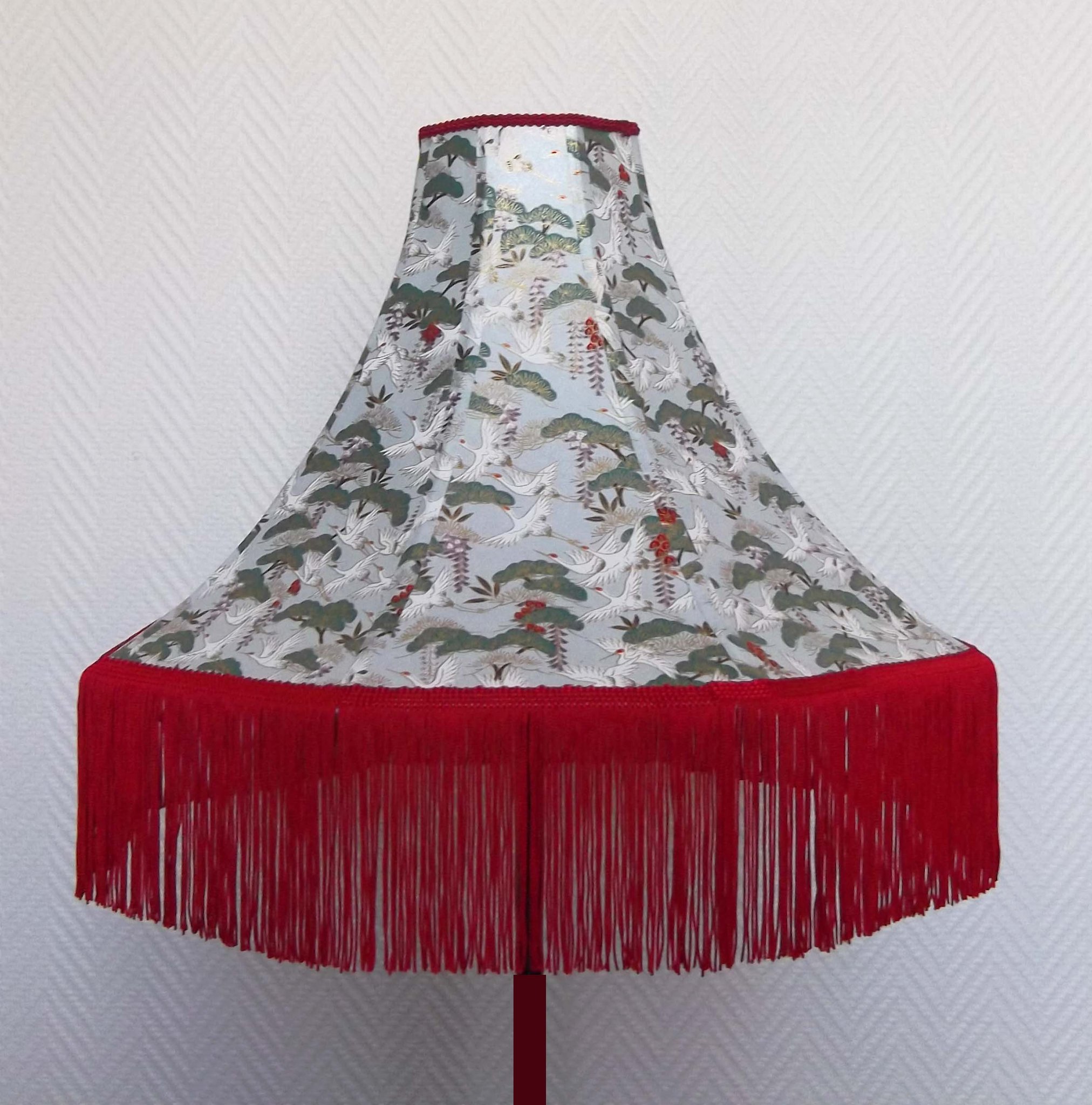 Abat-jour 40 cm de diamètre. Papier japonais fleurs style art déco sur fond rouge en haut et grues sur fond gris en bas. Frange