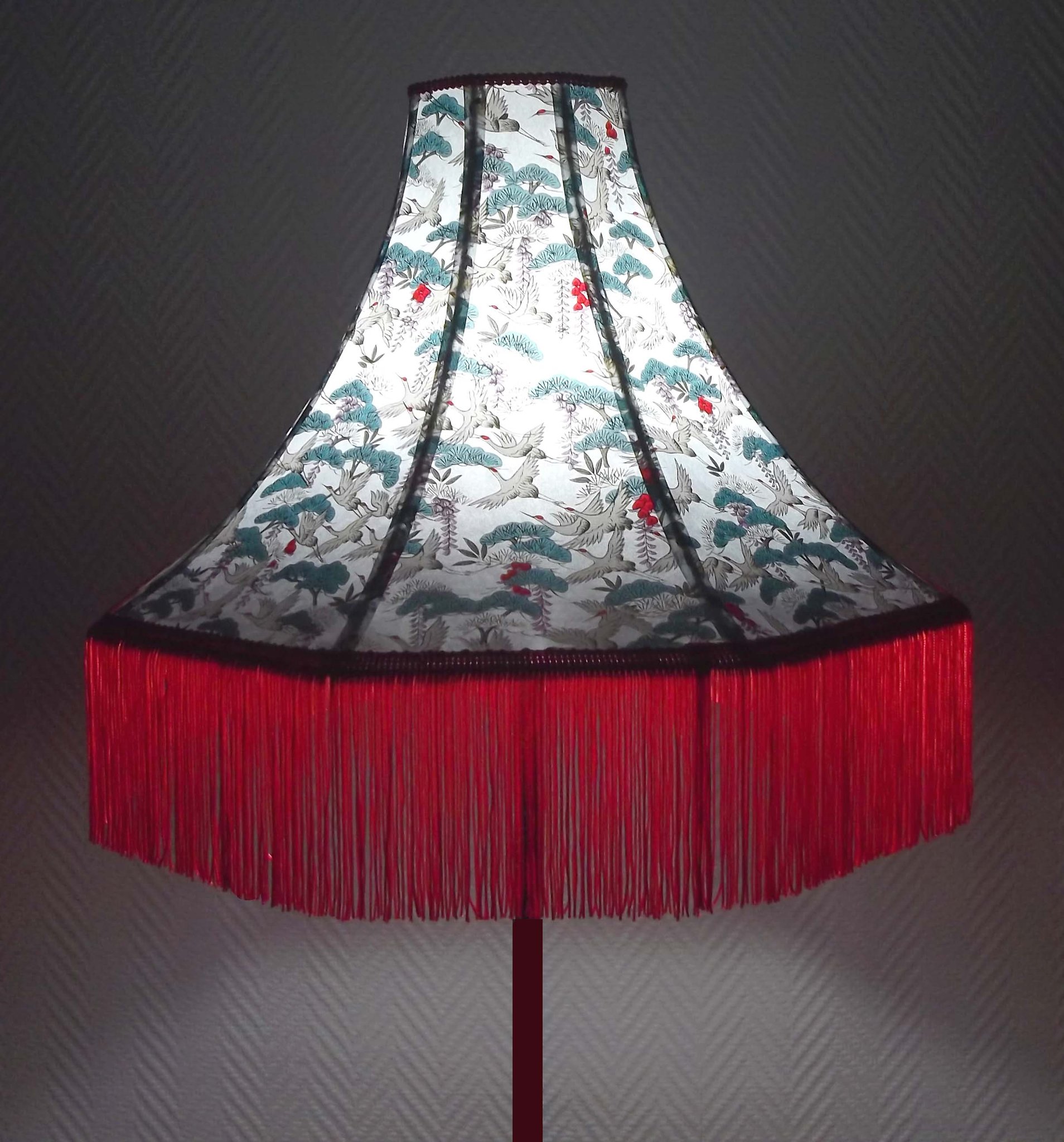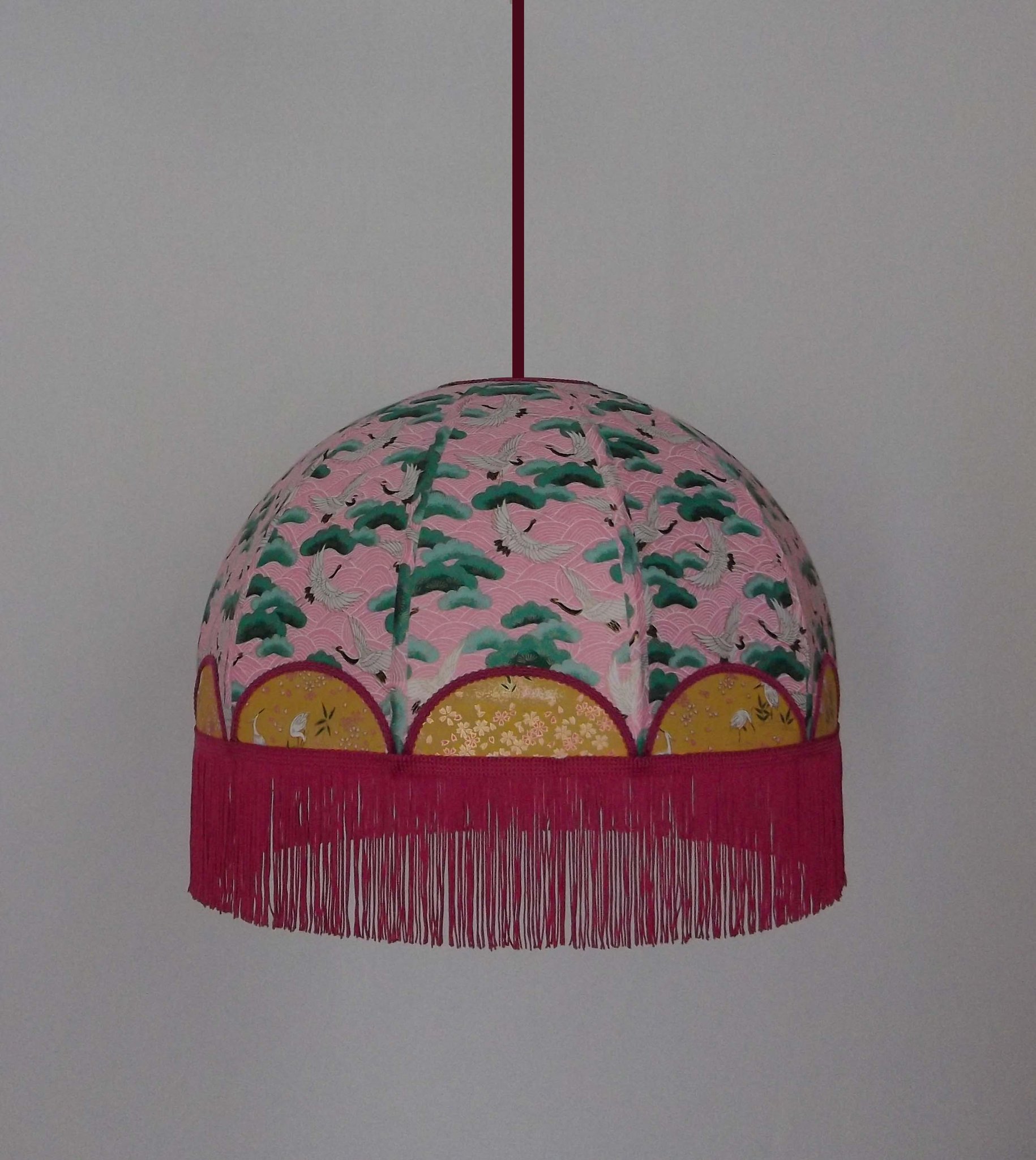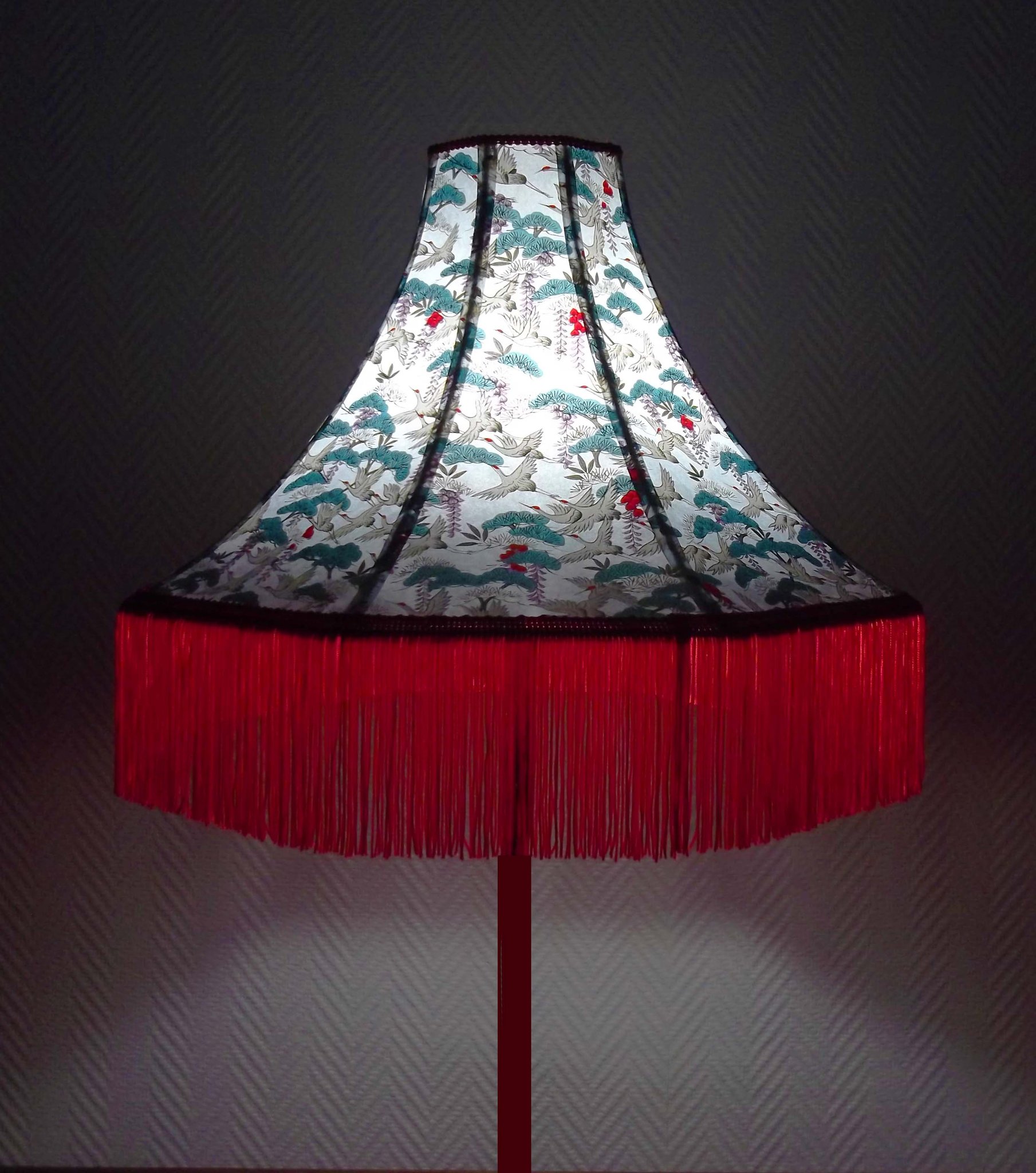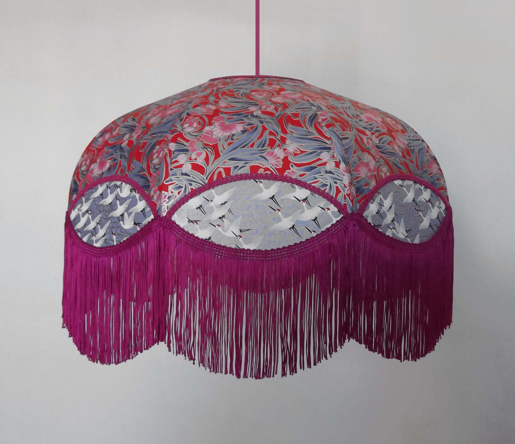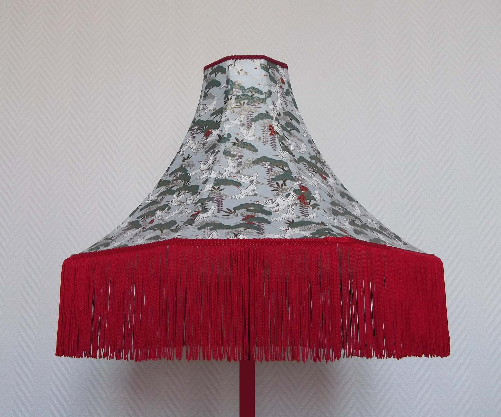 Abat-jour 40 cm de diamètre. Papier japonais fleurs style art déco sur fond rouge en haut et grues sur fond gris en bas. Frange