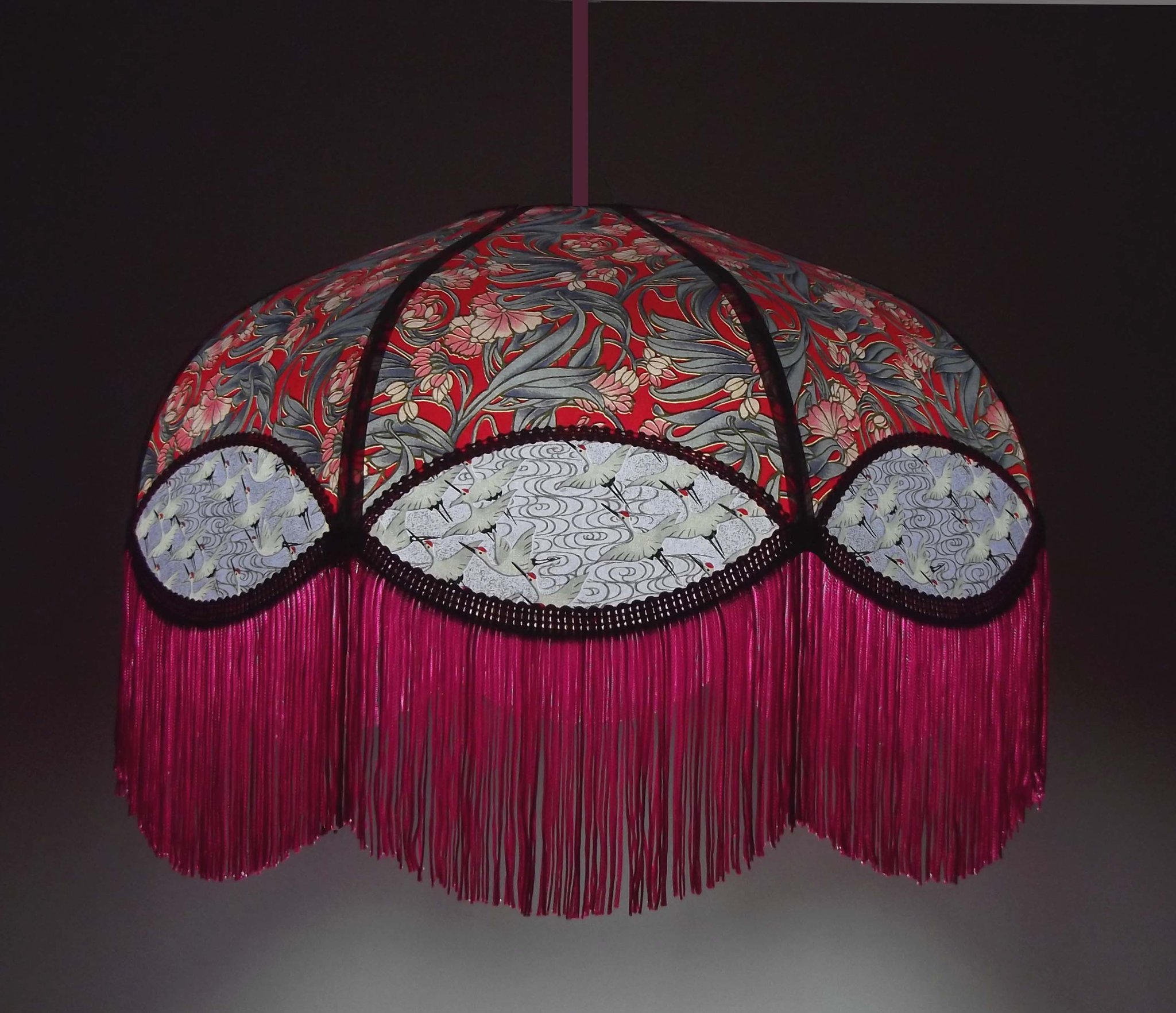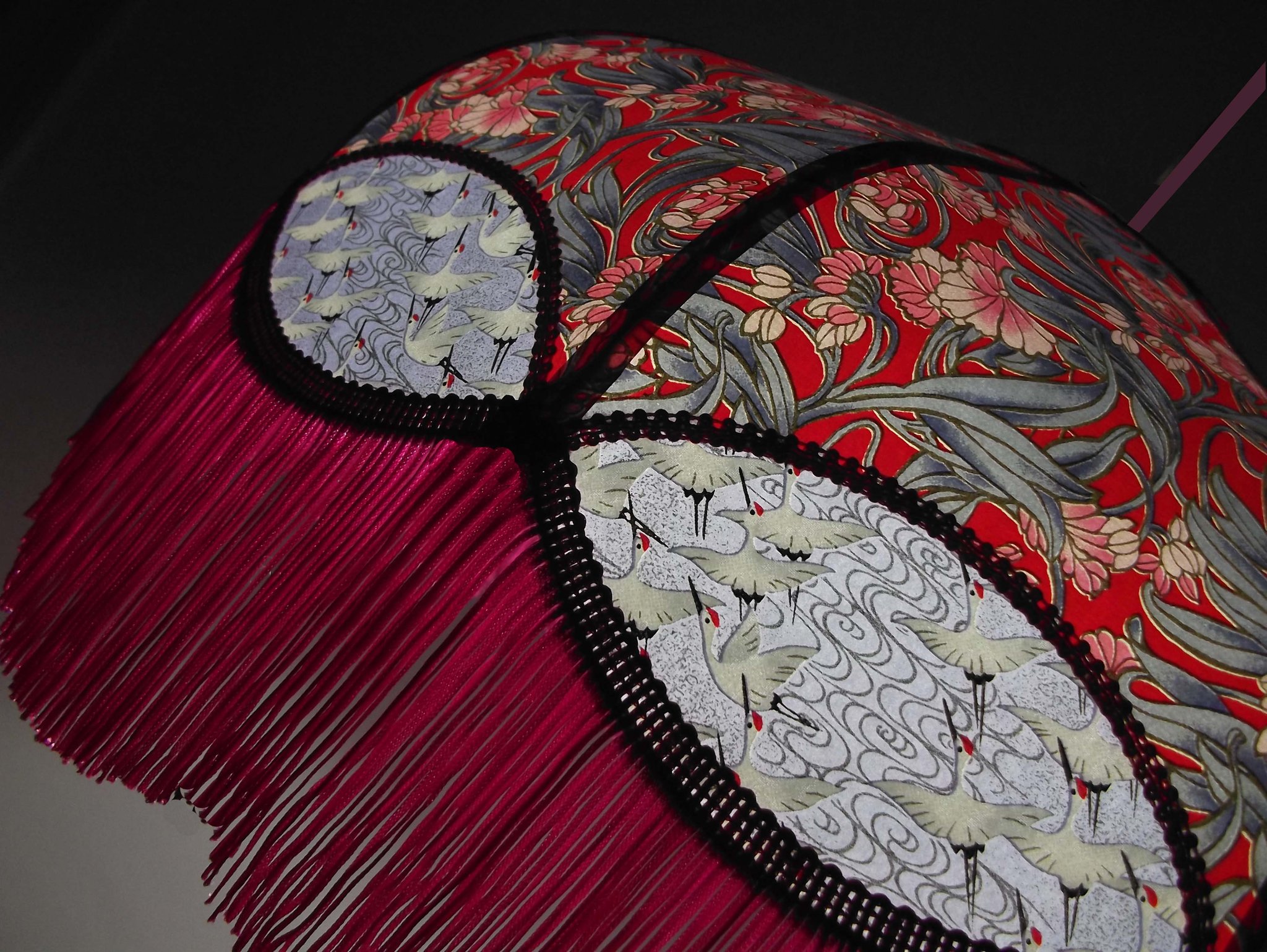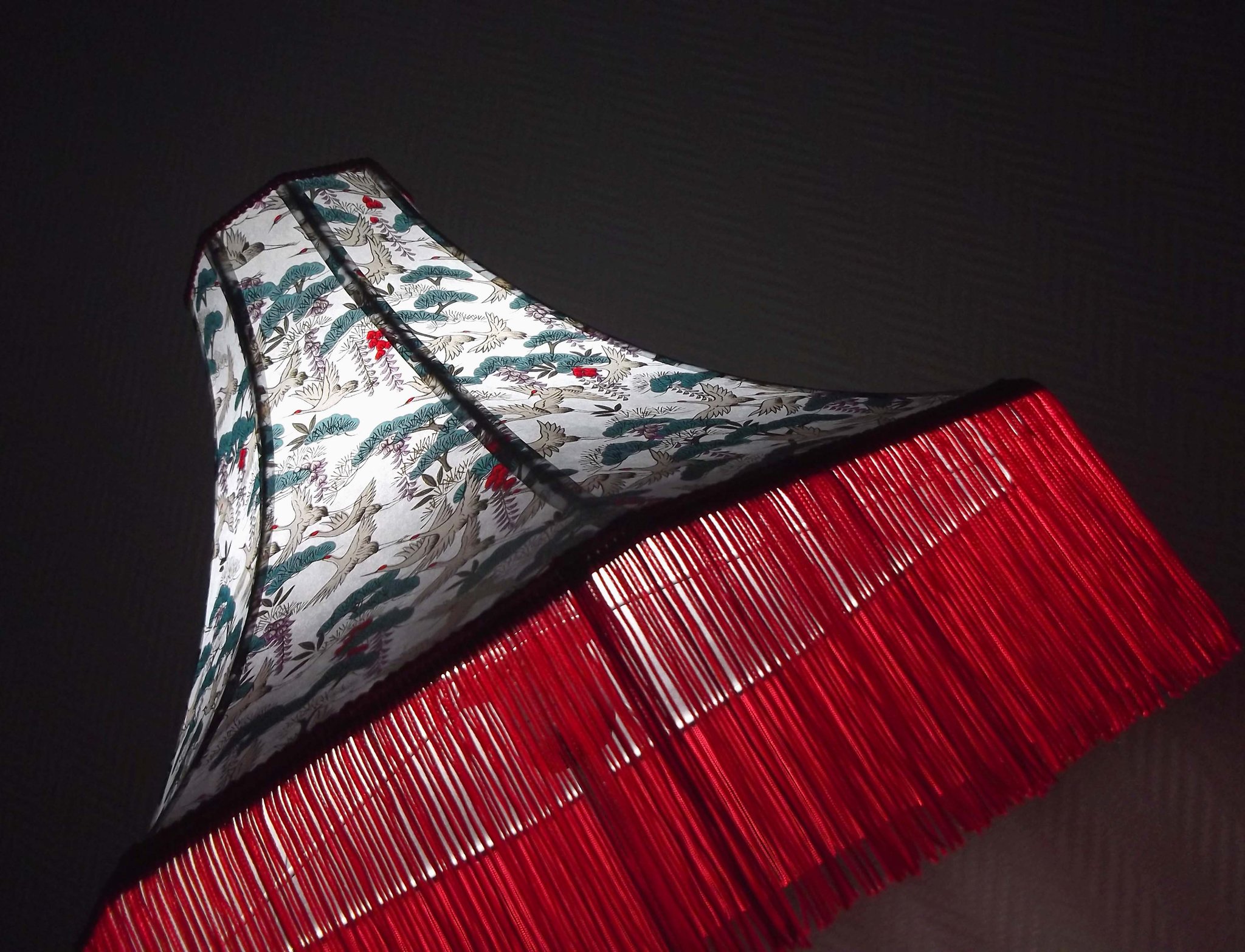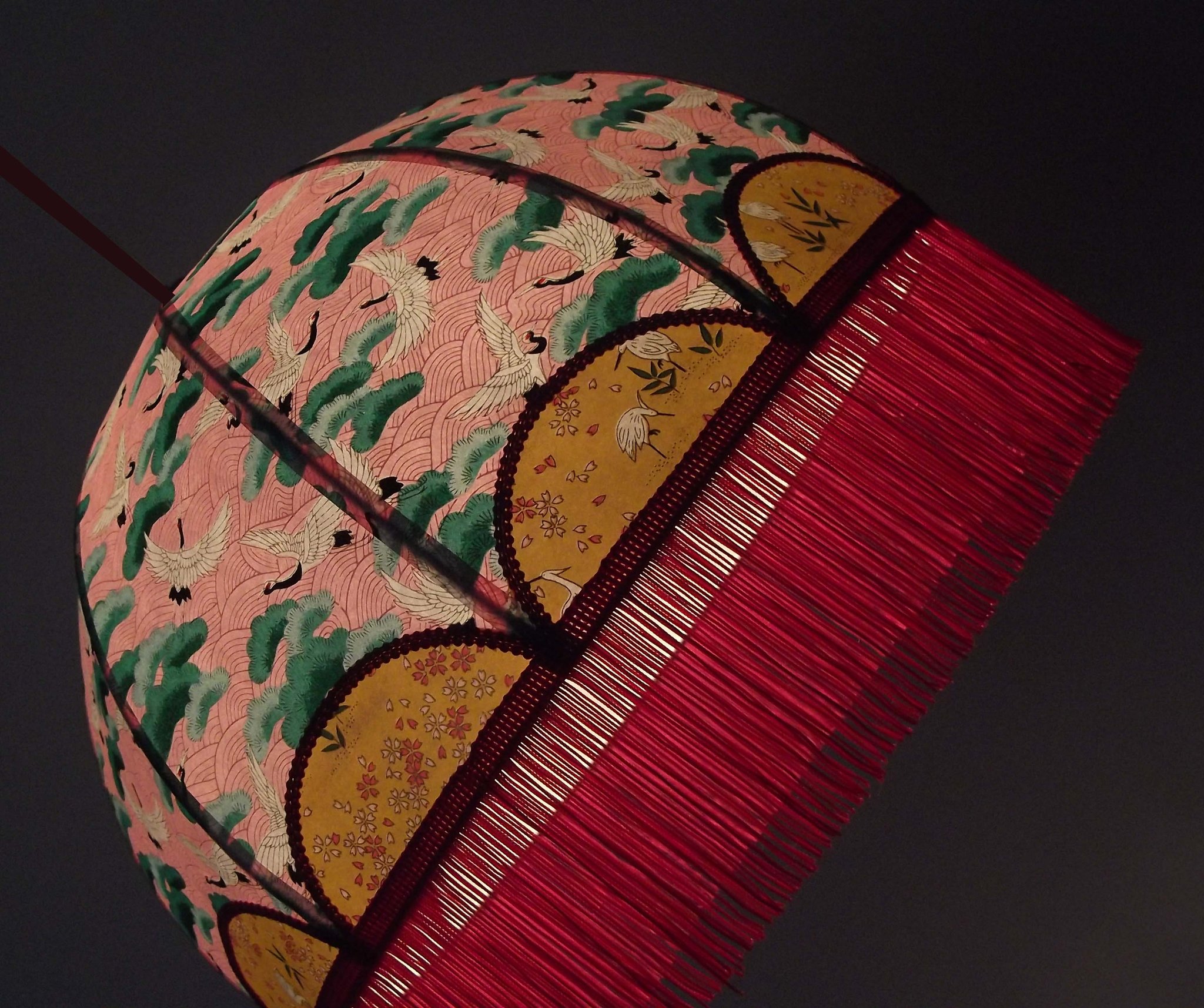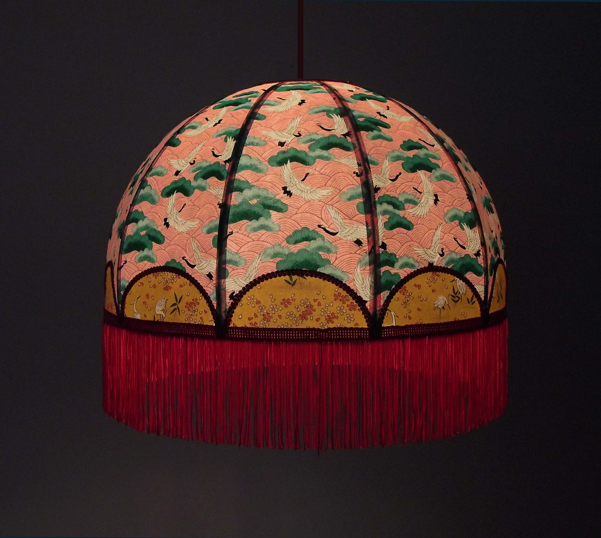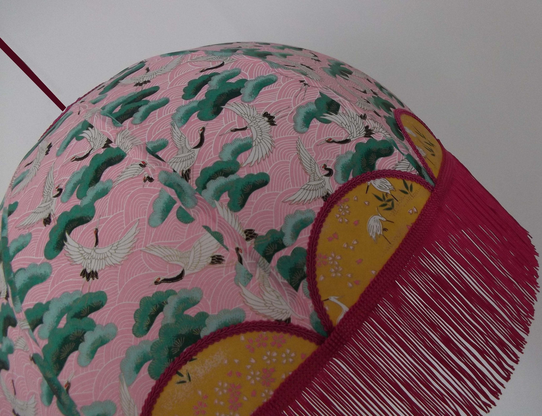 Abat-jour 40 cm de diamètre. Papier japonais fleurs style art déco sur fond rouge en haut et grues sur fond gris en bas. Frange