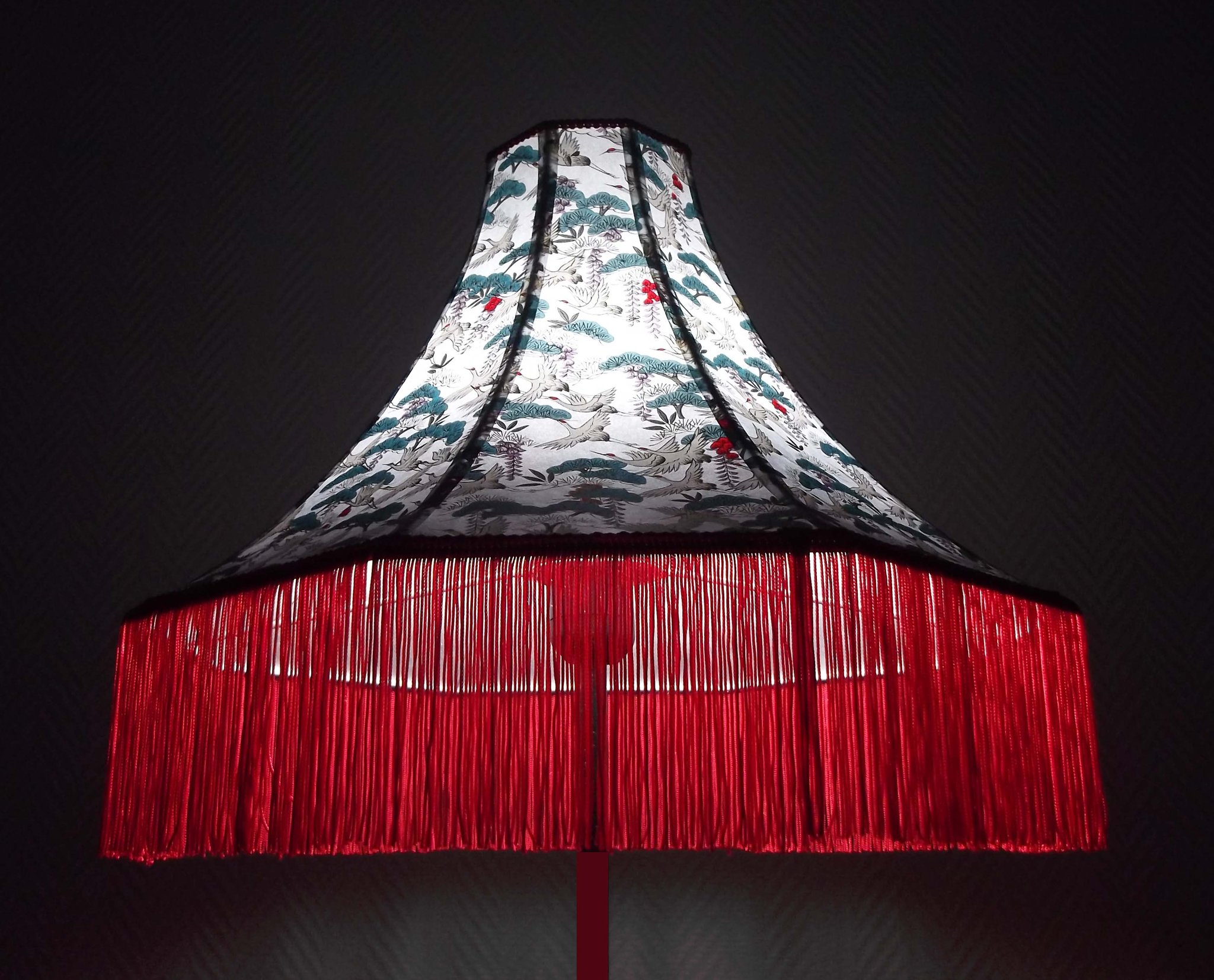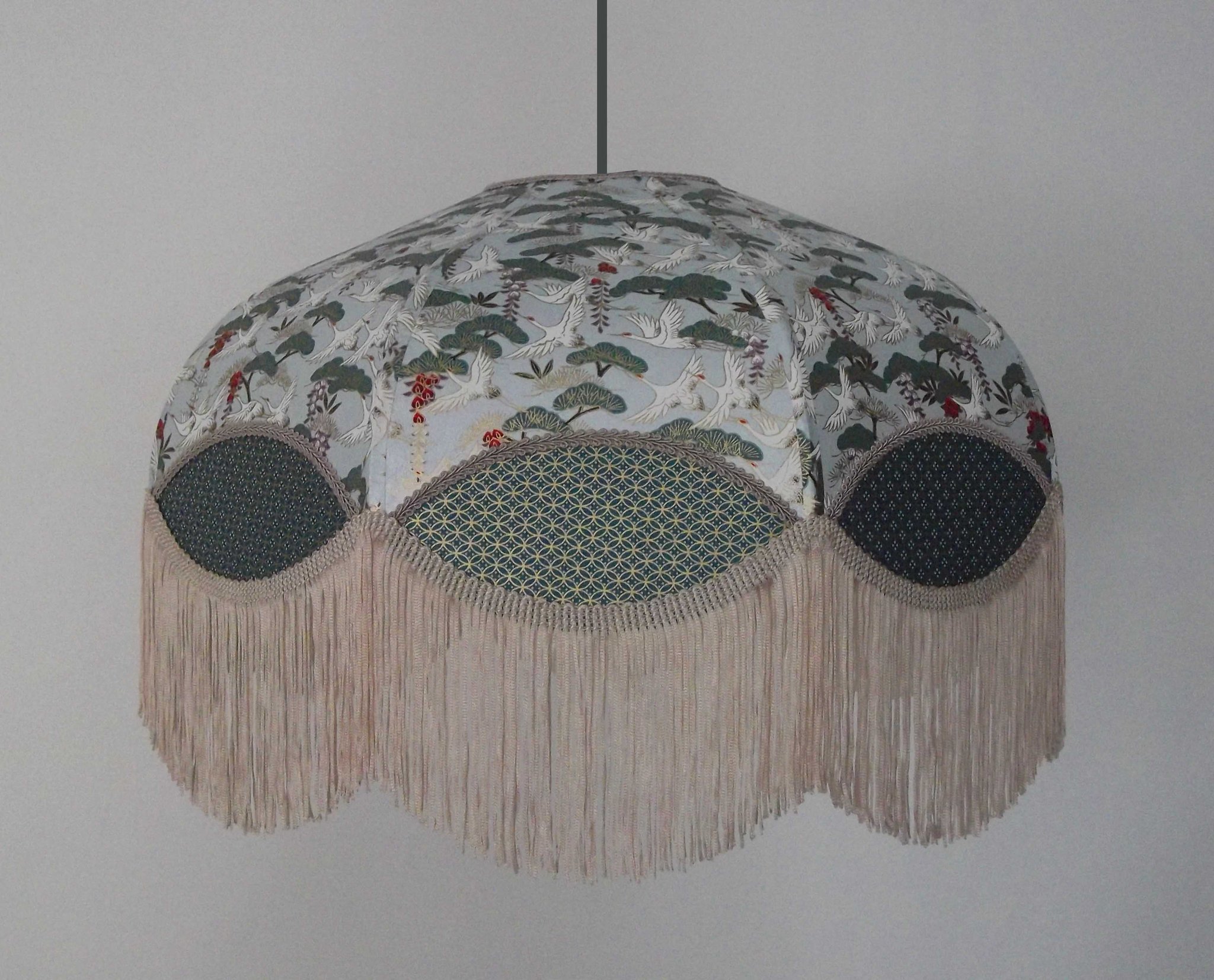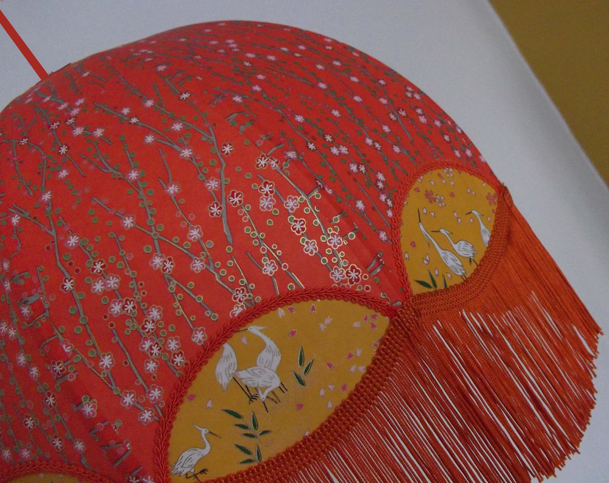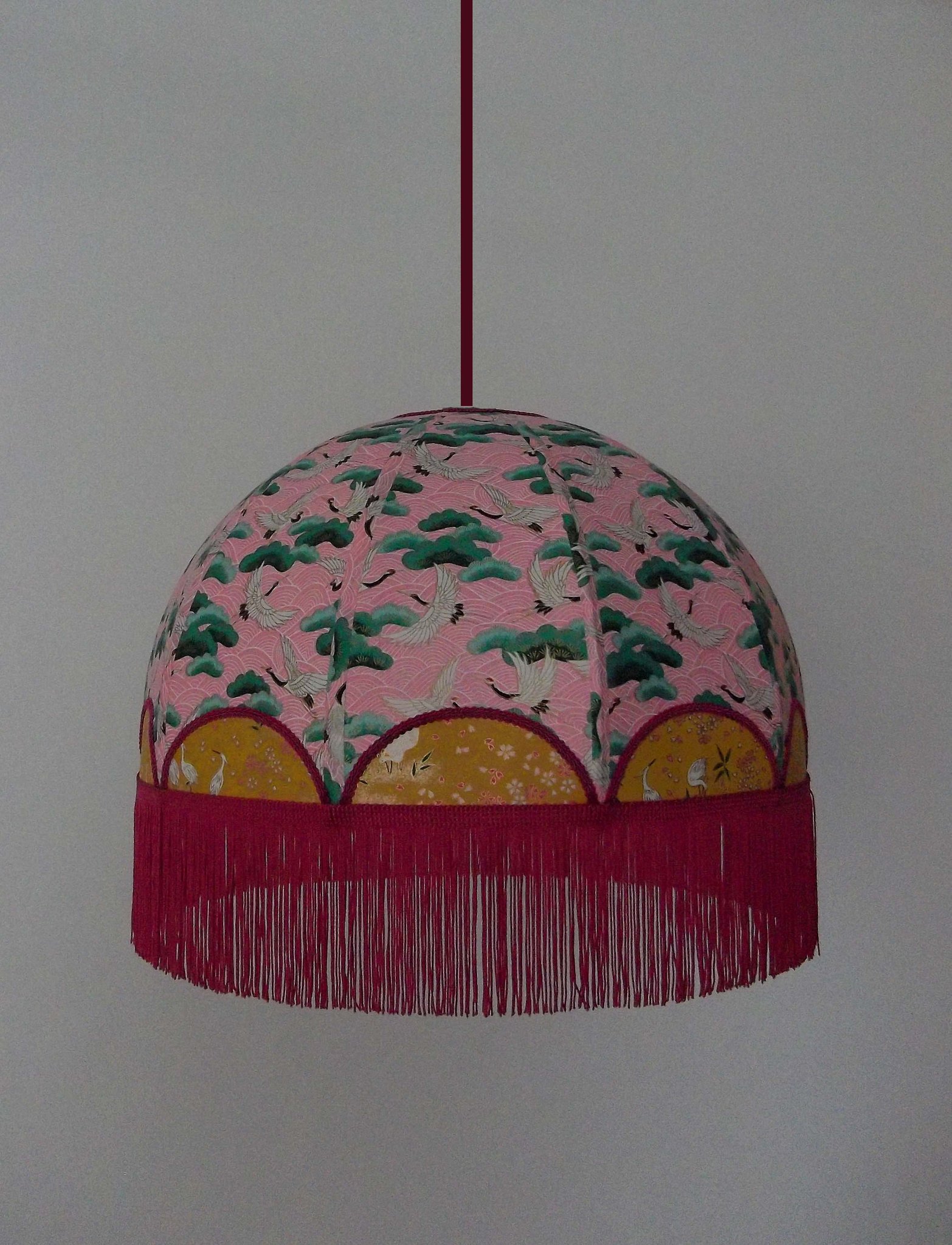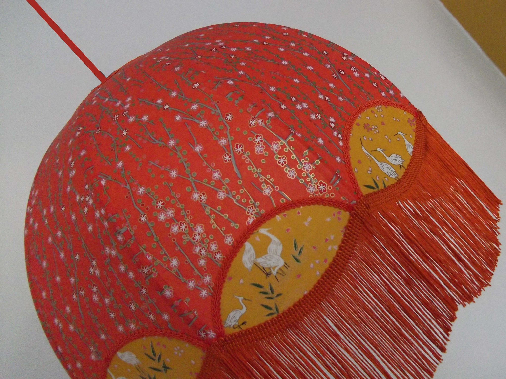 Abat-jour 40 cm de diamètre. Papier japonais fleurs style art déco sur fond rouge en haut et grues sur fond gris en bas. Frange