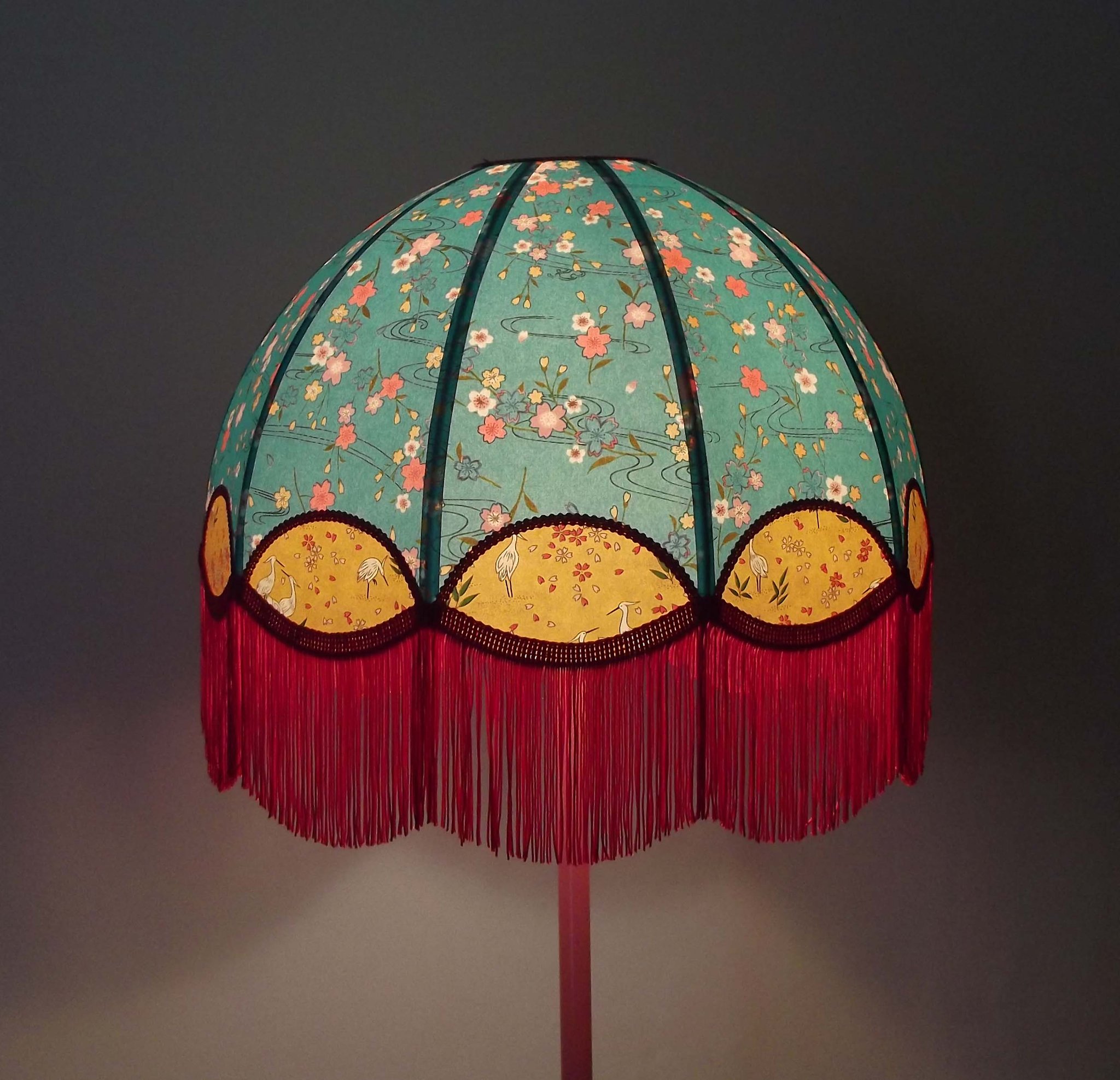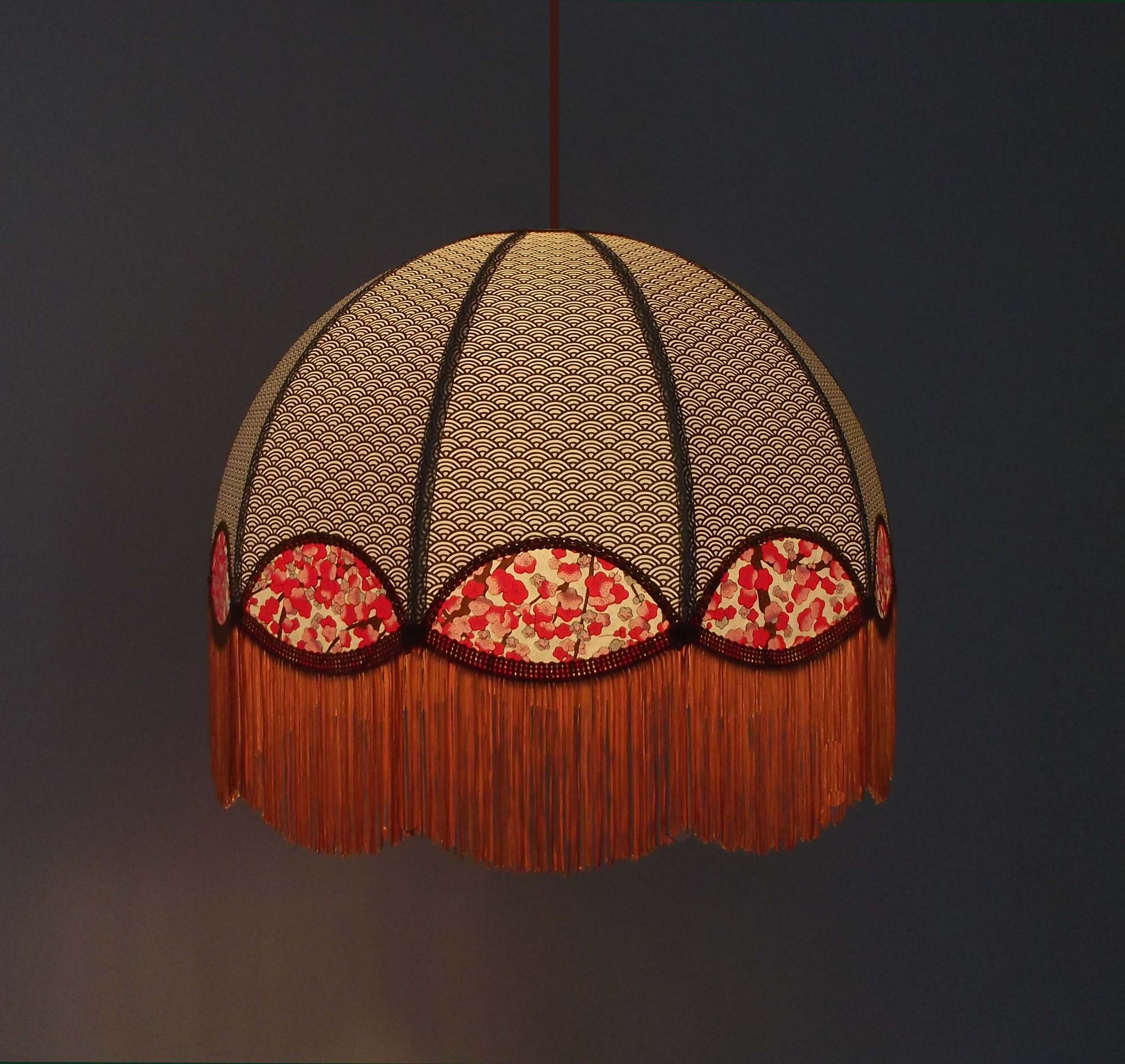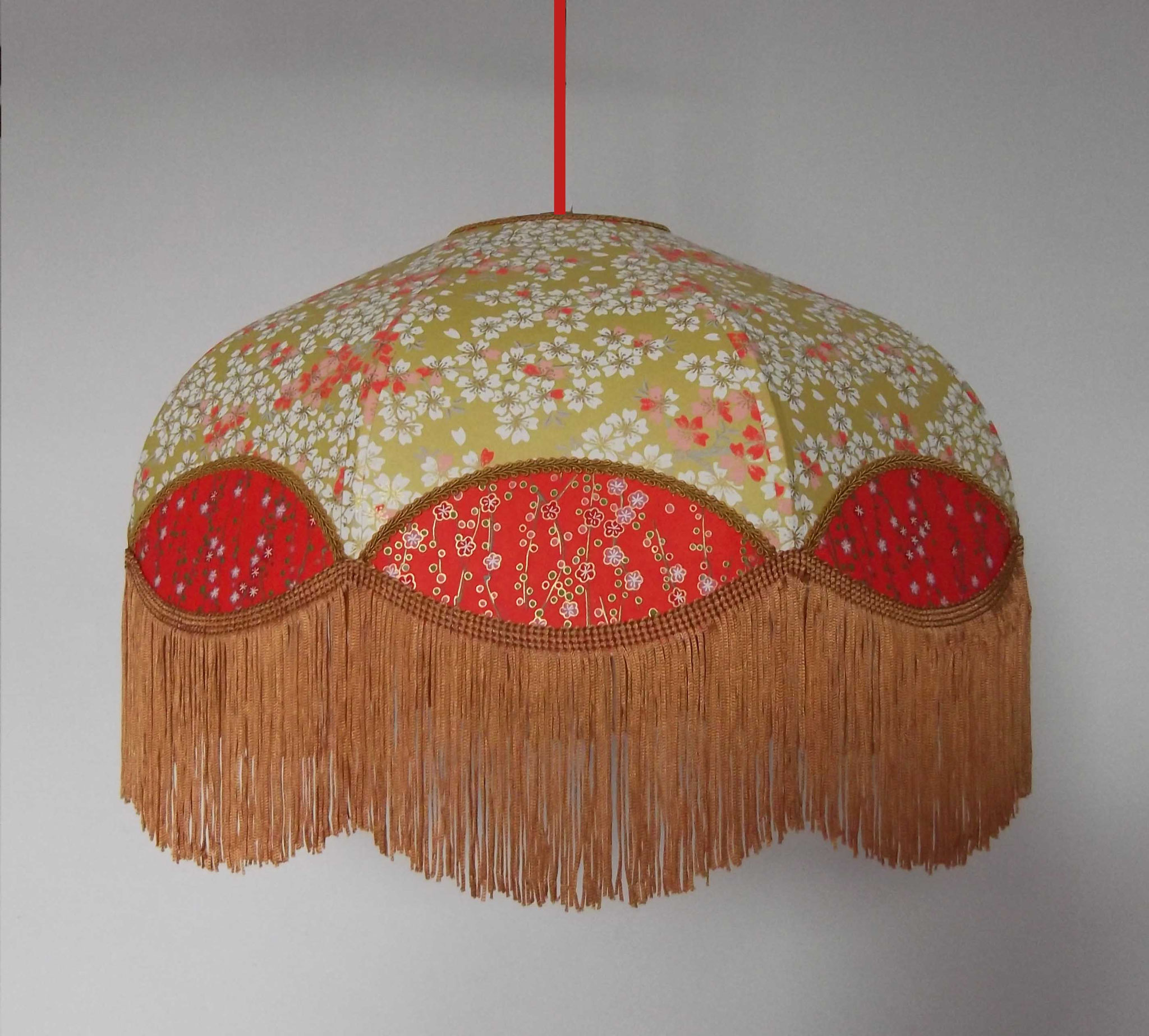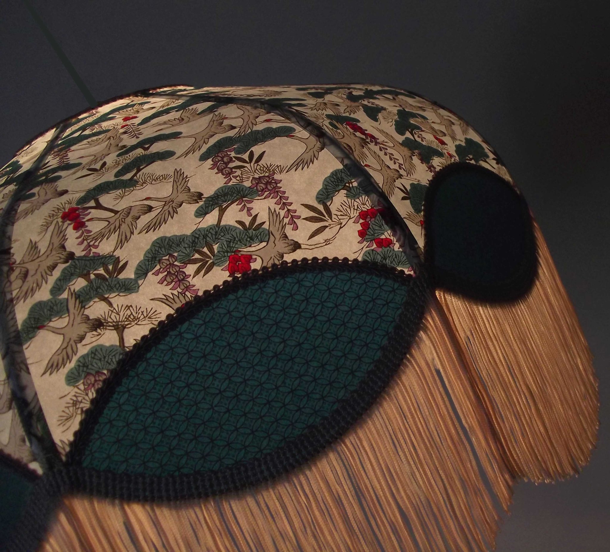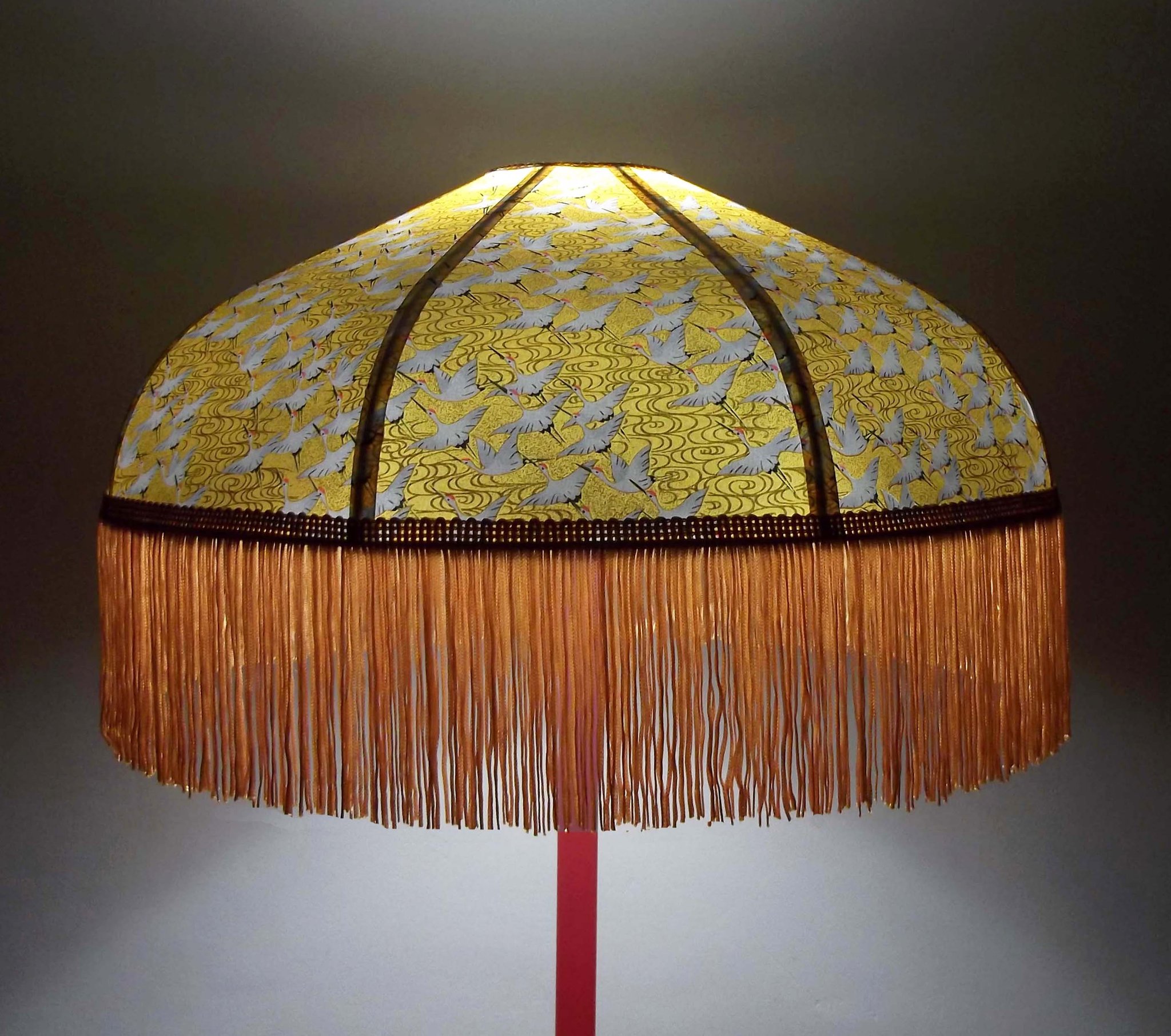 Abat-jour 40 cm de diamètre. Papier japonais fleurs style art déco sur fond rouge en haut et grues sur fond gris en bas. Frange