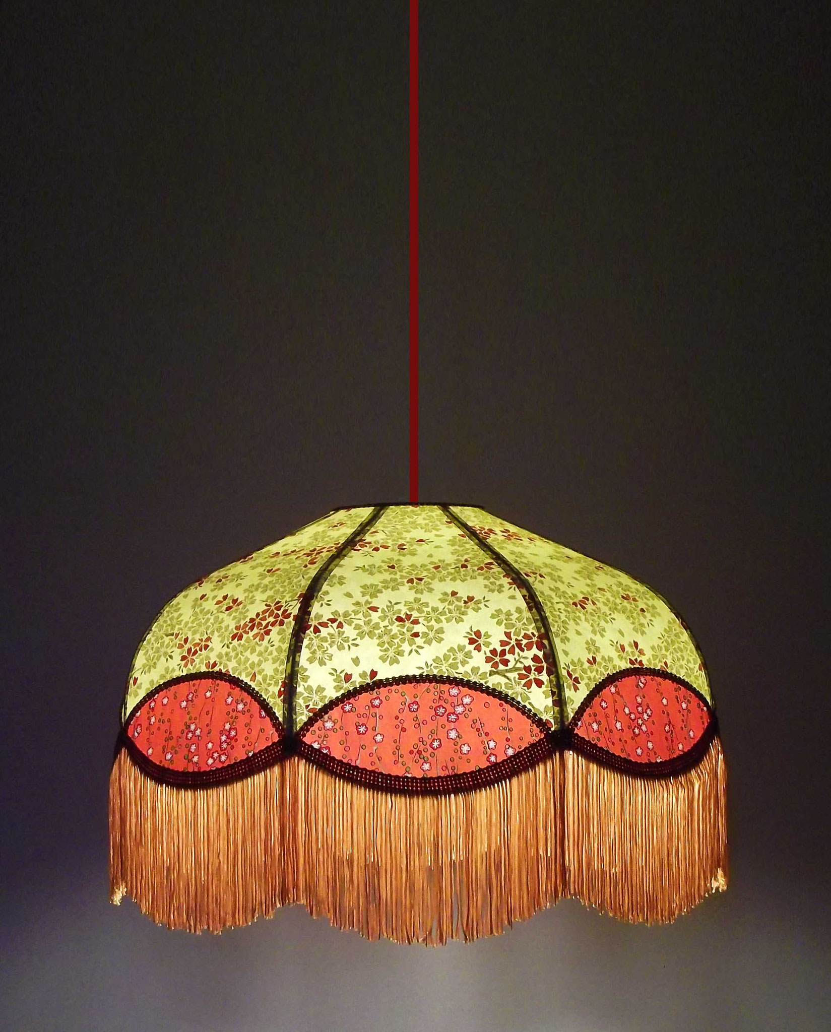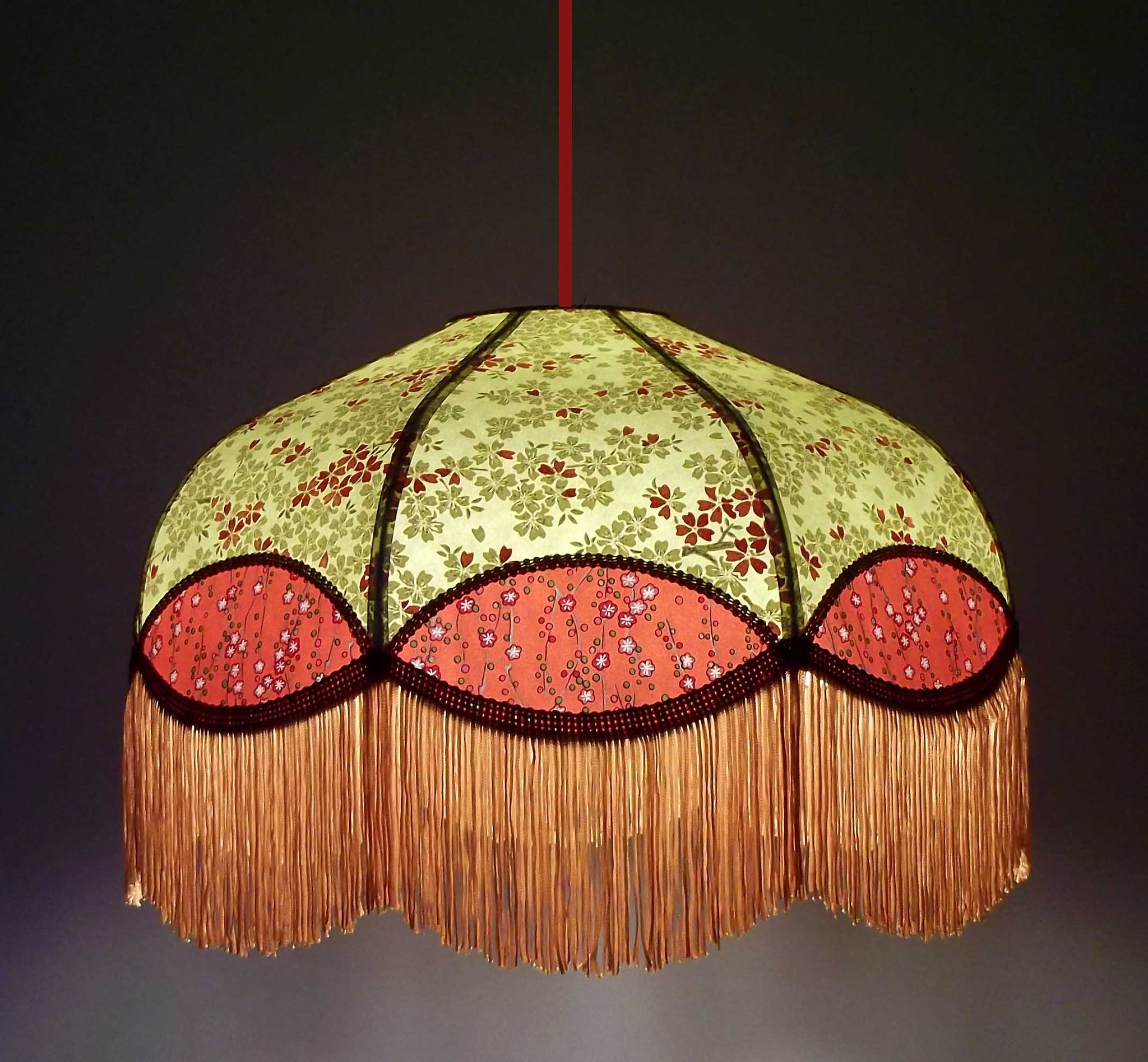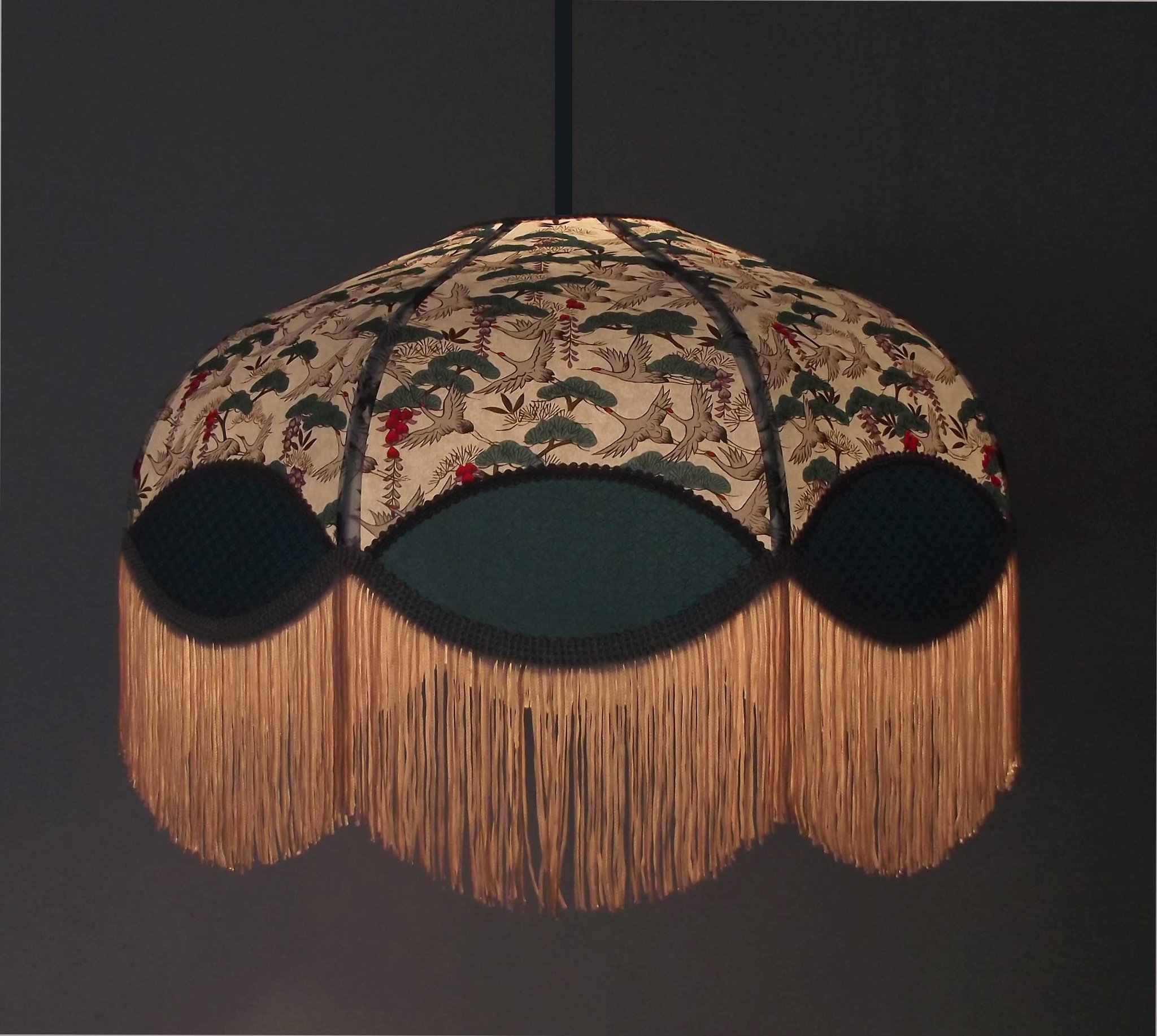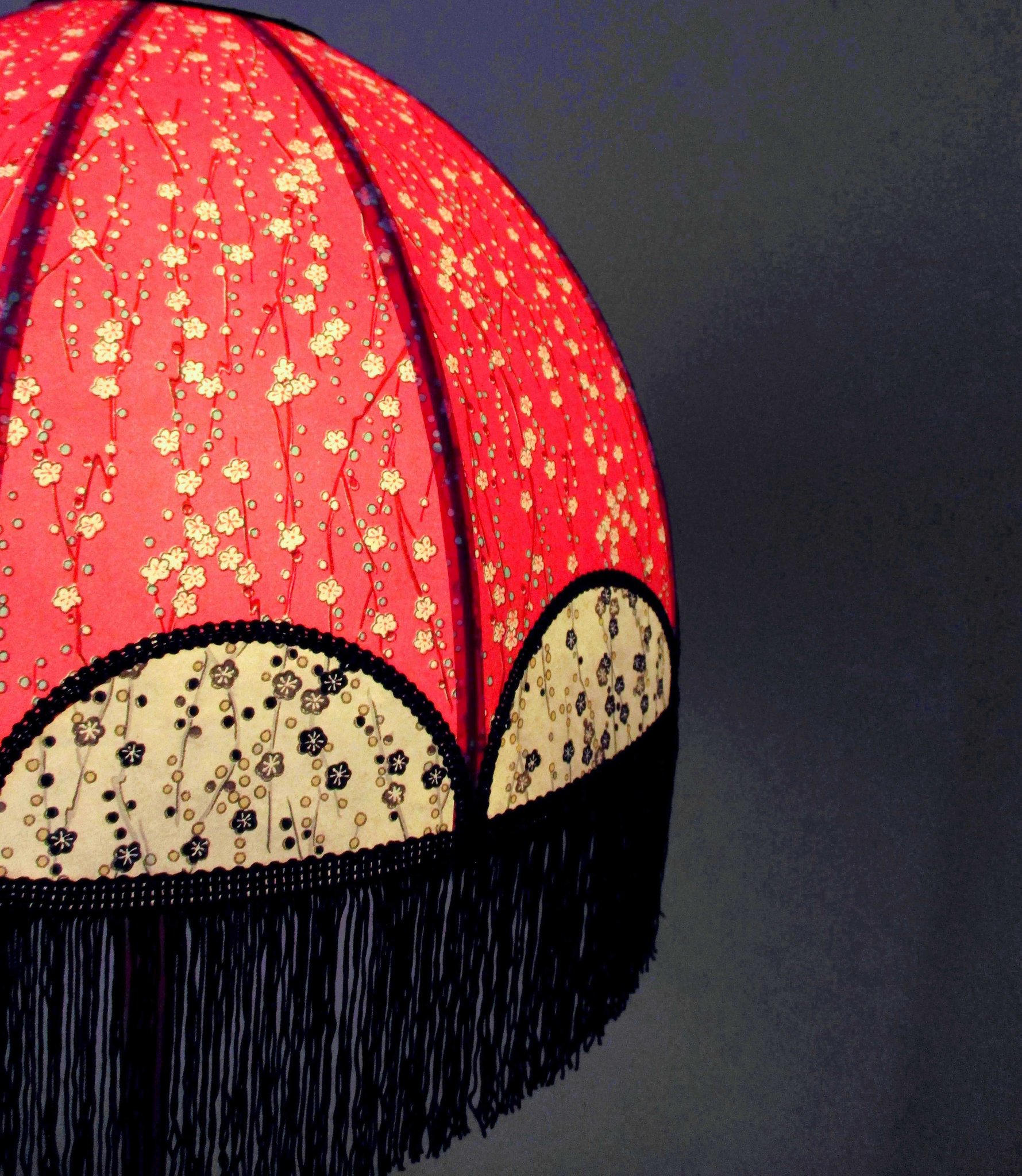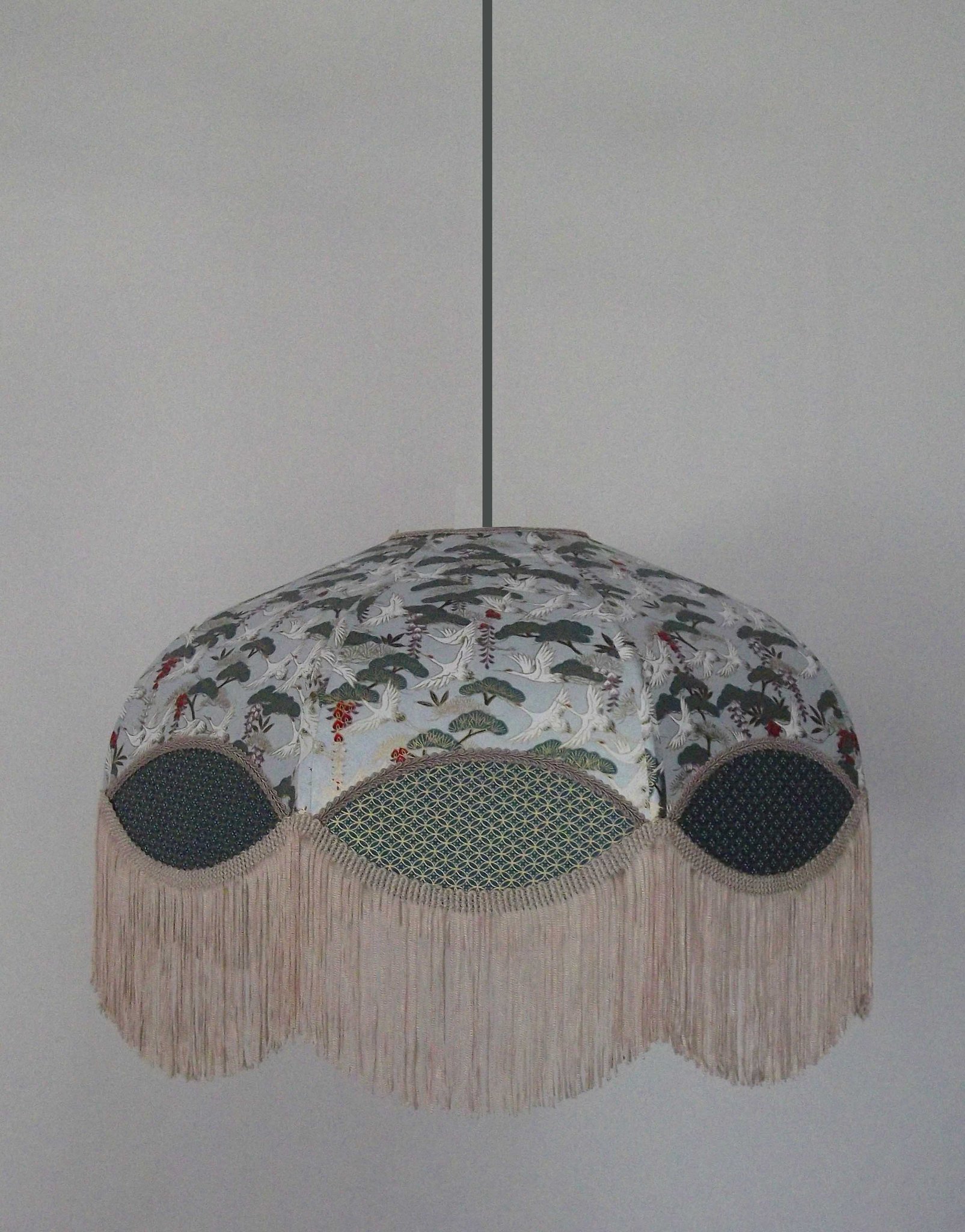 Abat-jour 40 cm de diamètre. Papier japonais fleurs style art déco sur fond rouge en haut et grues sur fond gris en bas. Frange