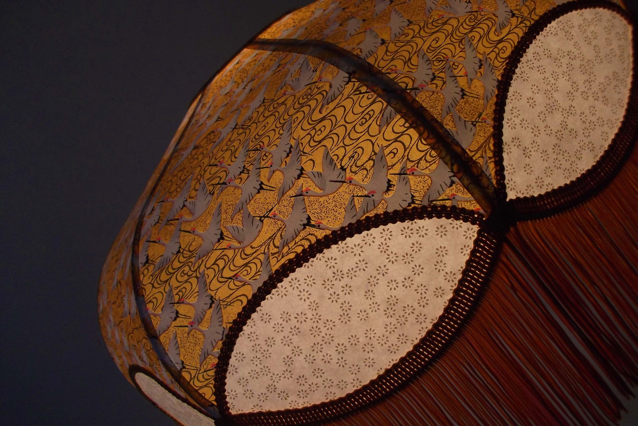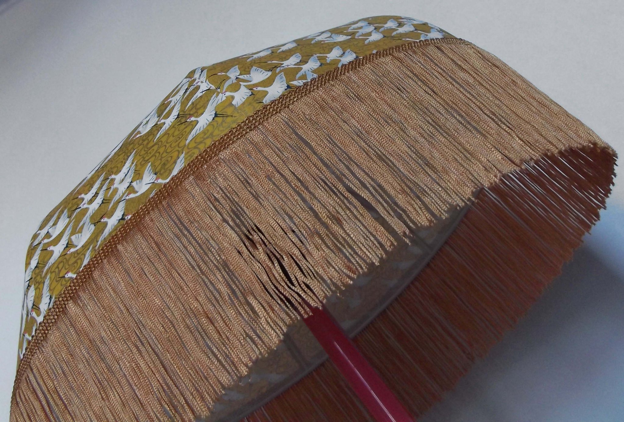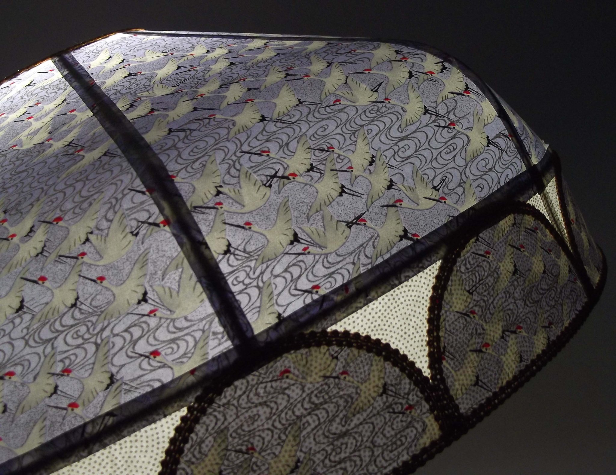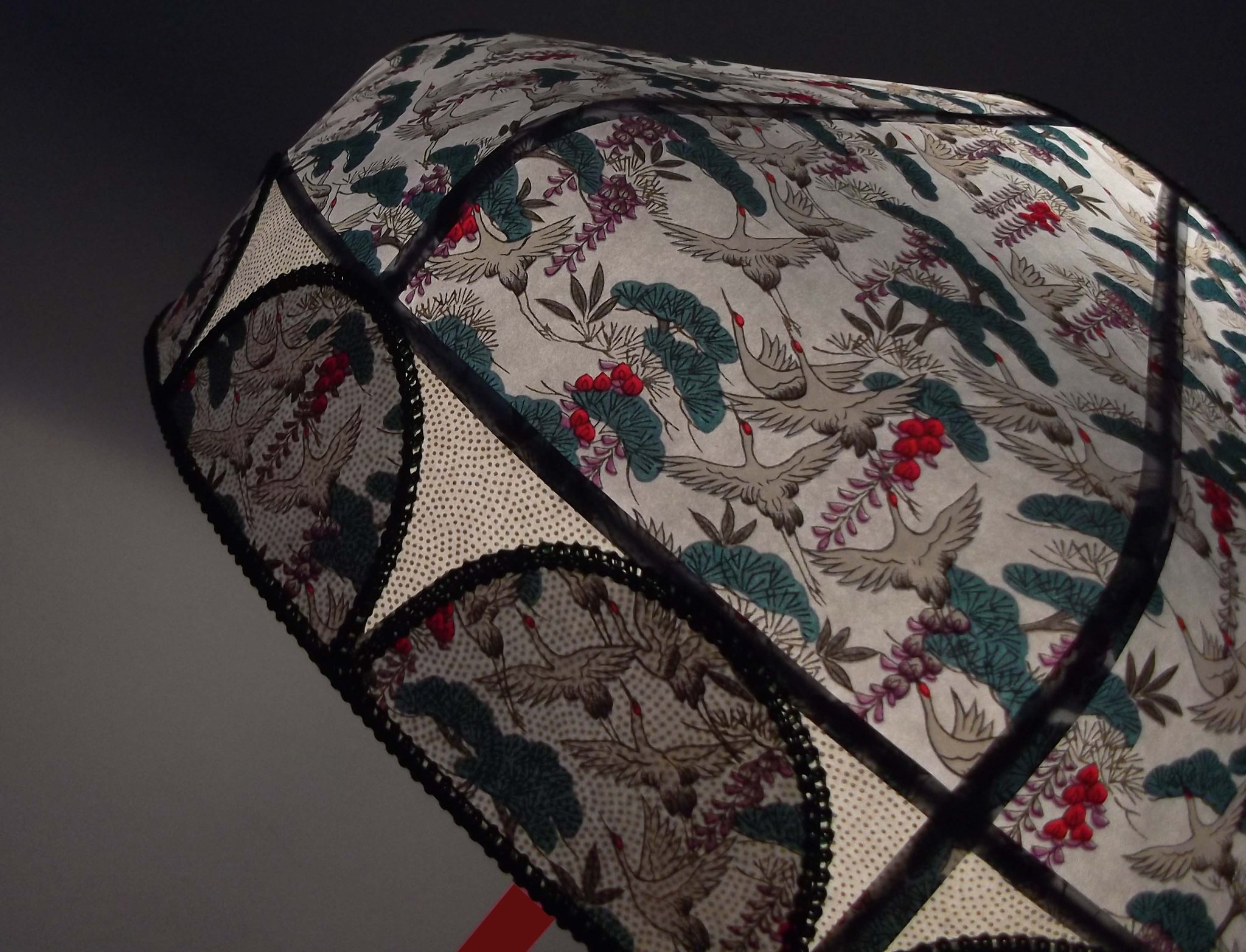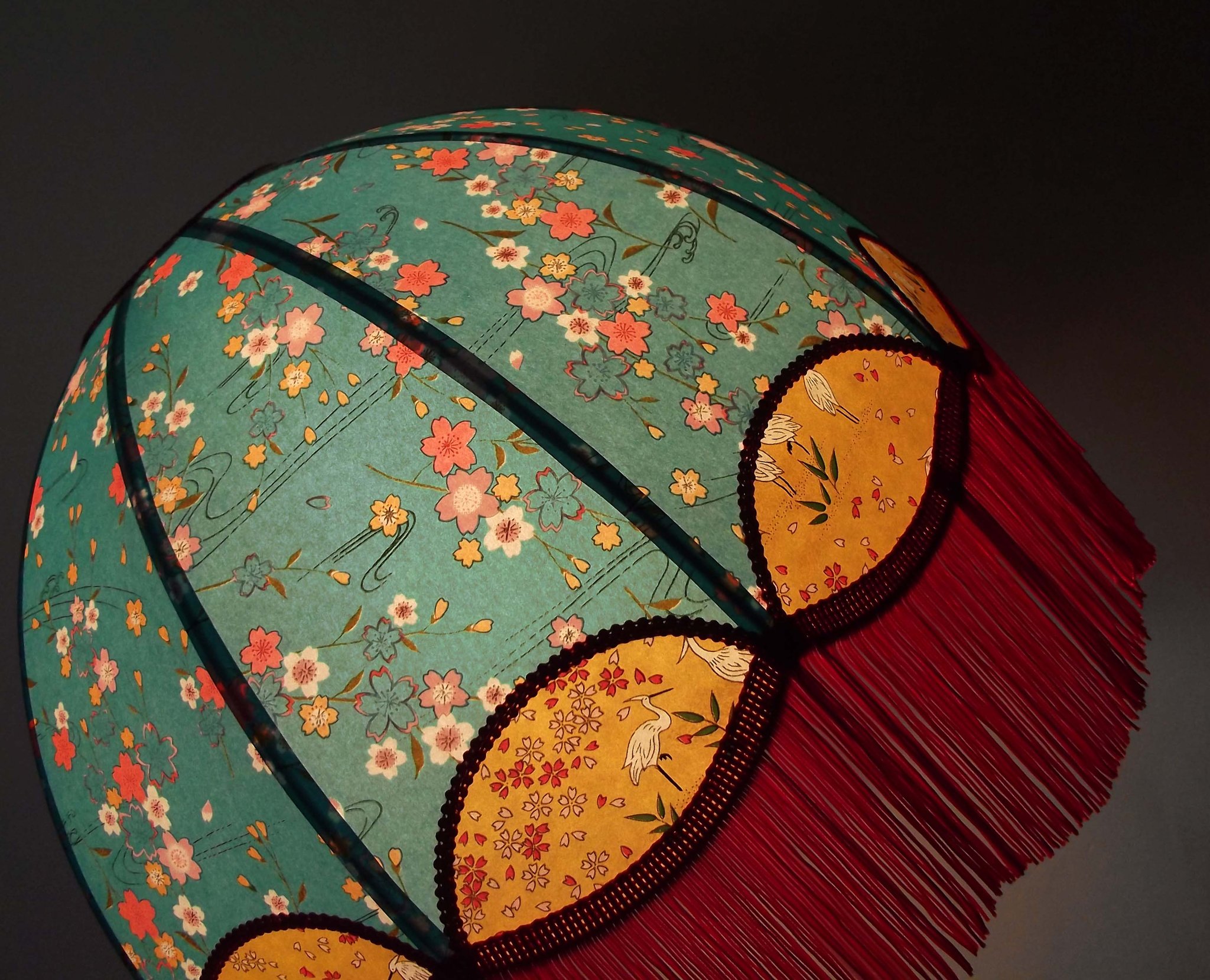 Abat-jour 40 cm de diamètre. Papier japonais fleurs style art déco sur fond rouge en haut et grues sur fond gris en bas. Frange