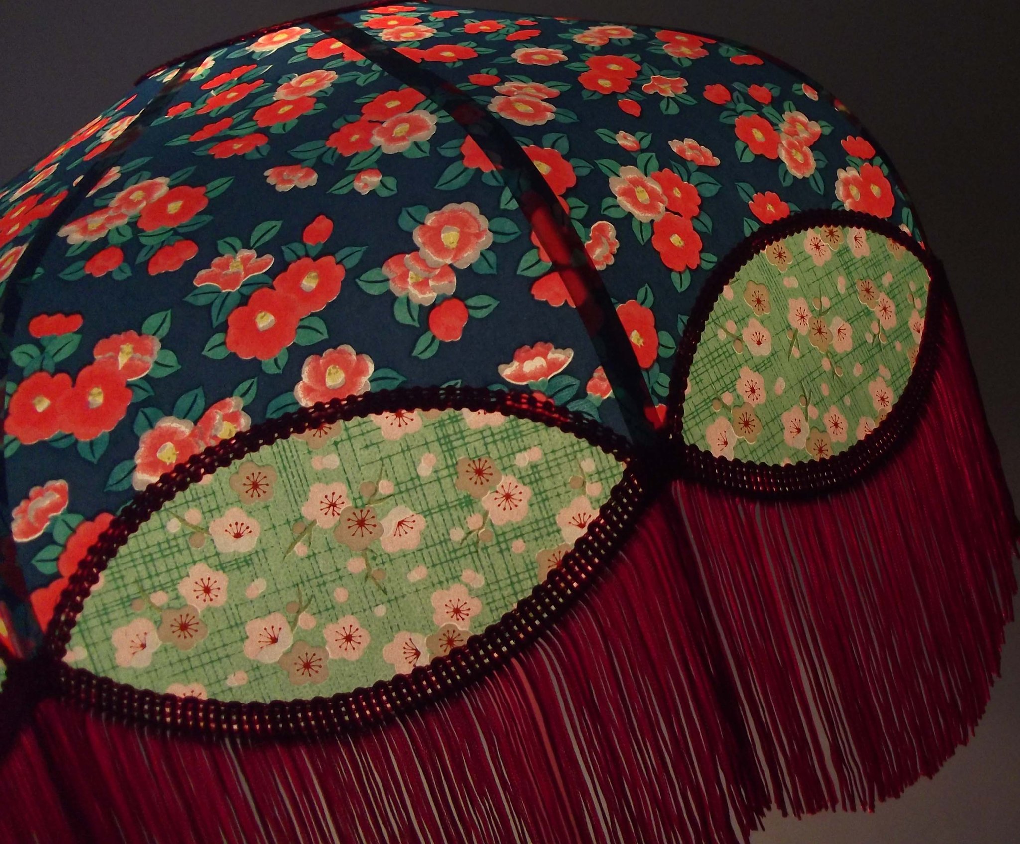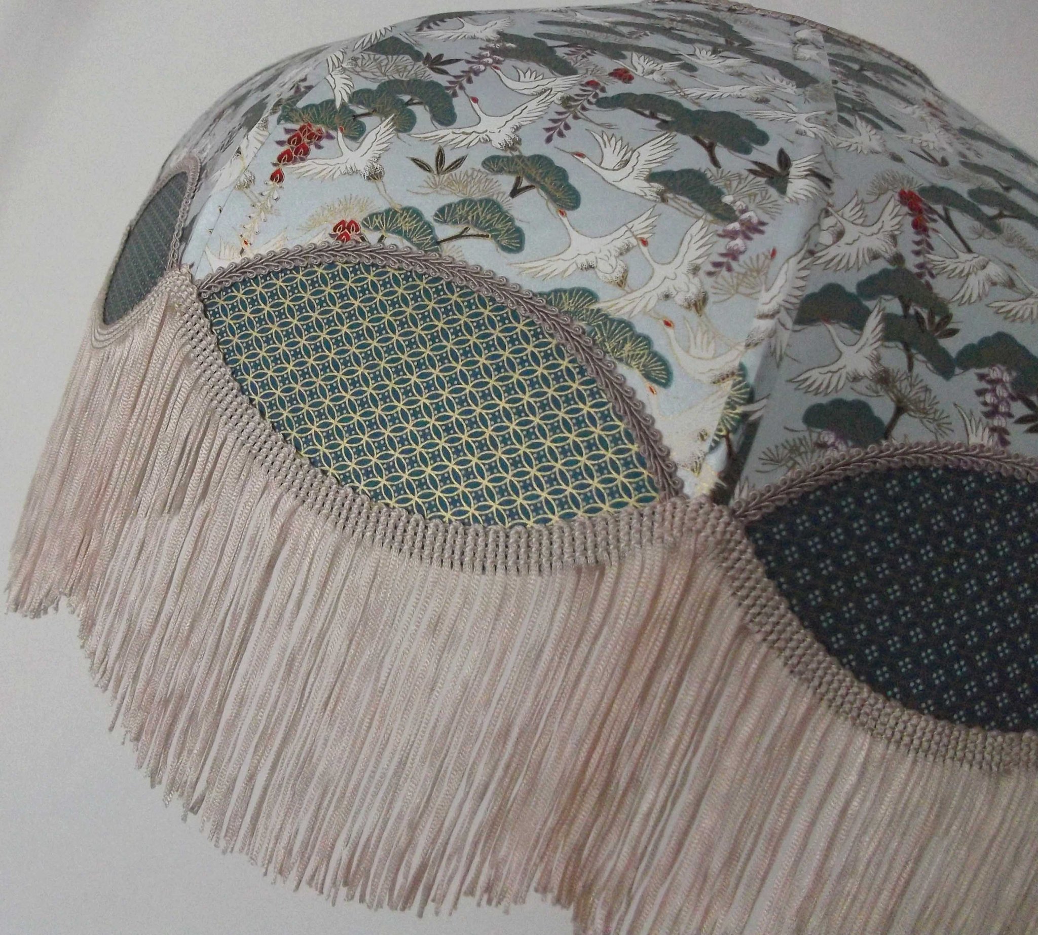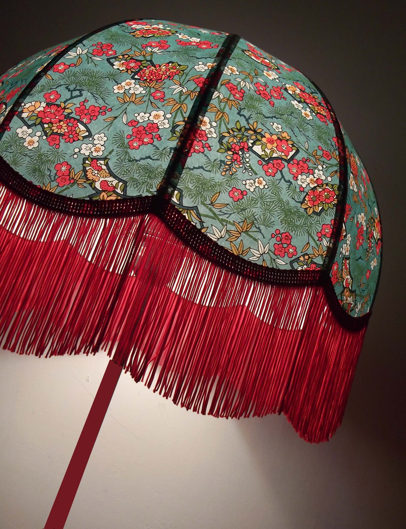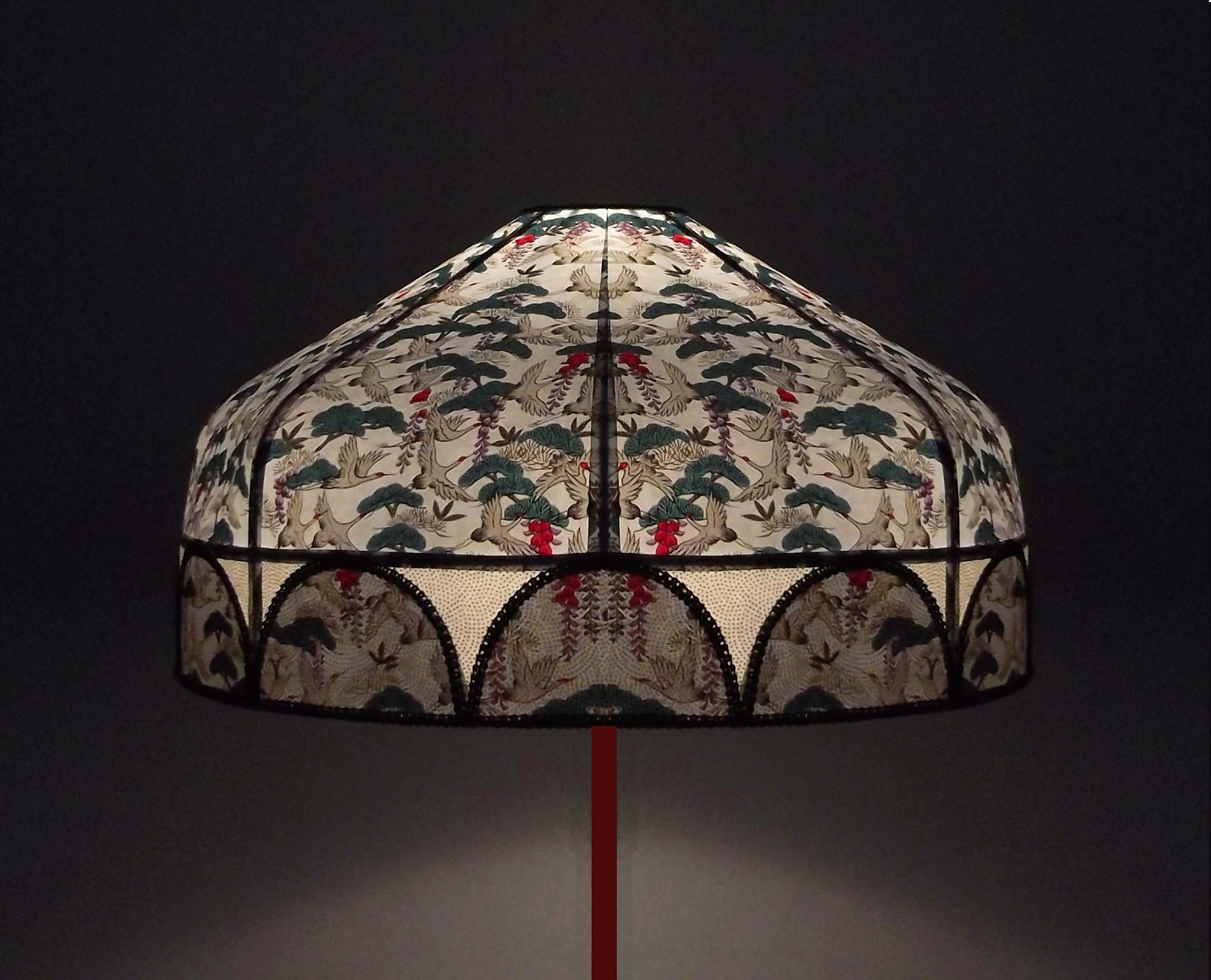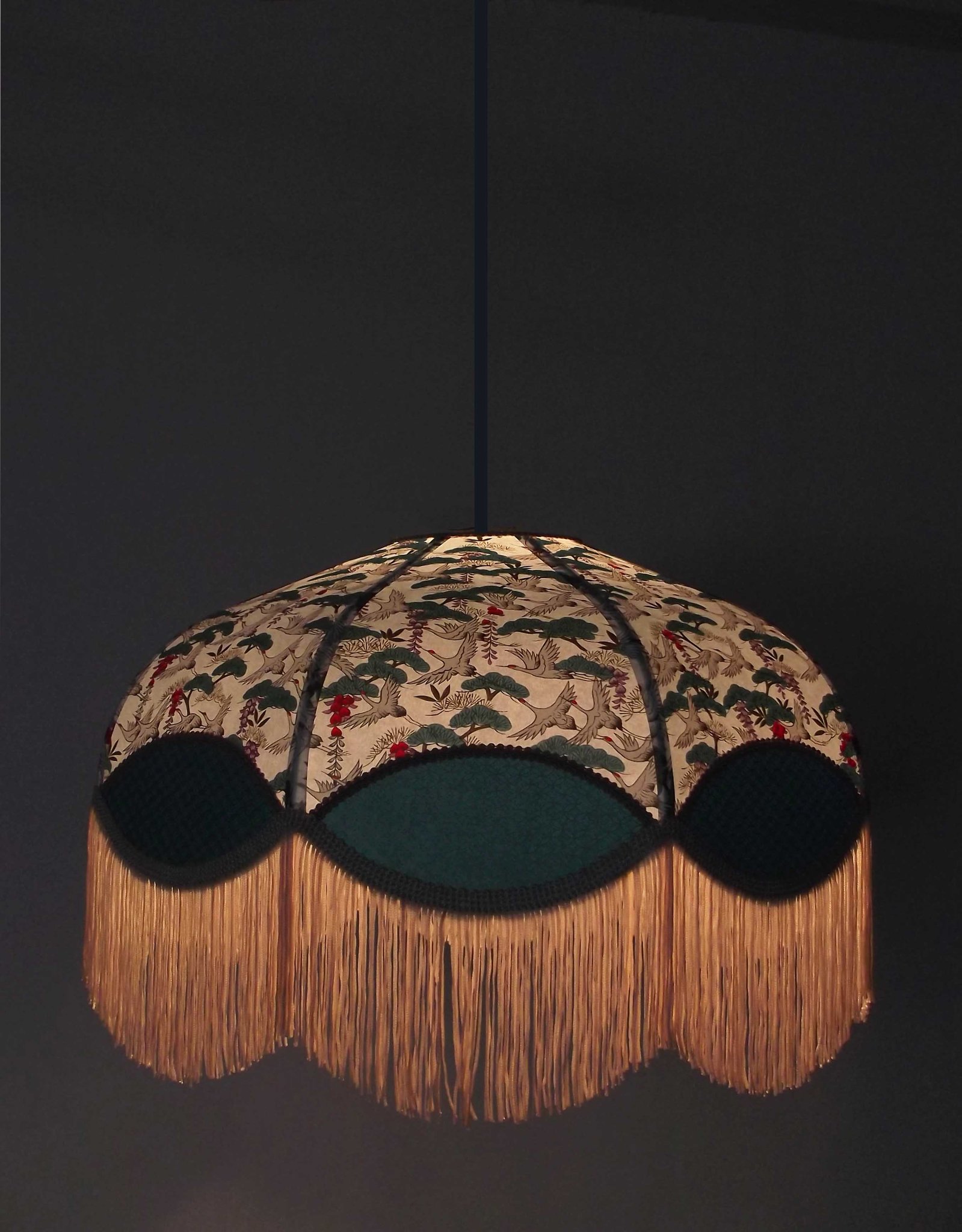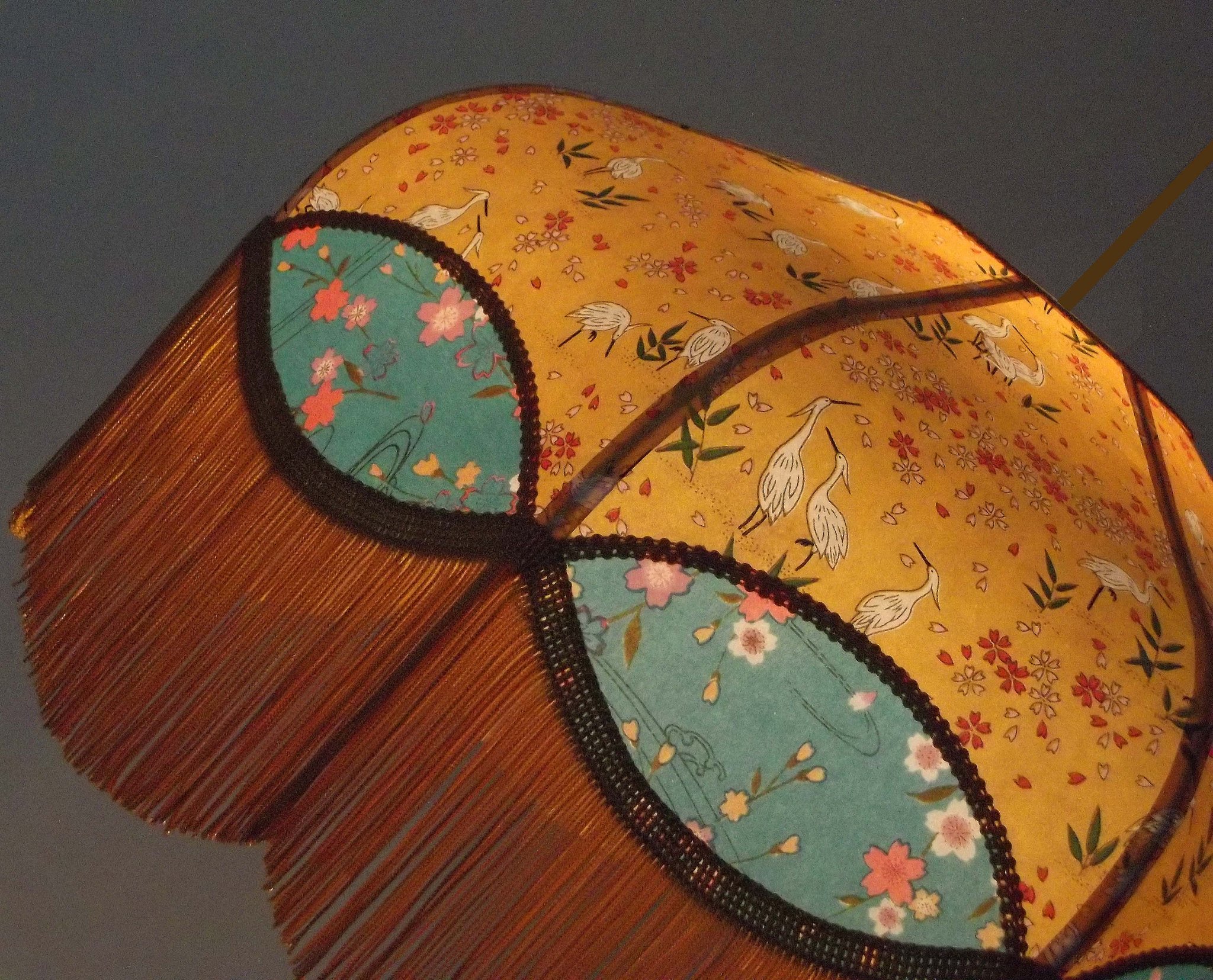 Abat-jour 40 cm de diamètre. Papier japonais fleurs style art déco sur fond rouge en haut et grues sur fond gris en bas. Frange