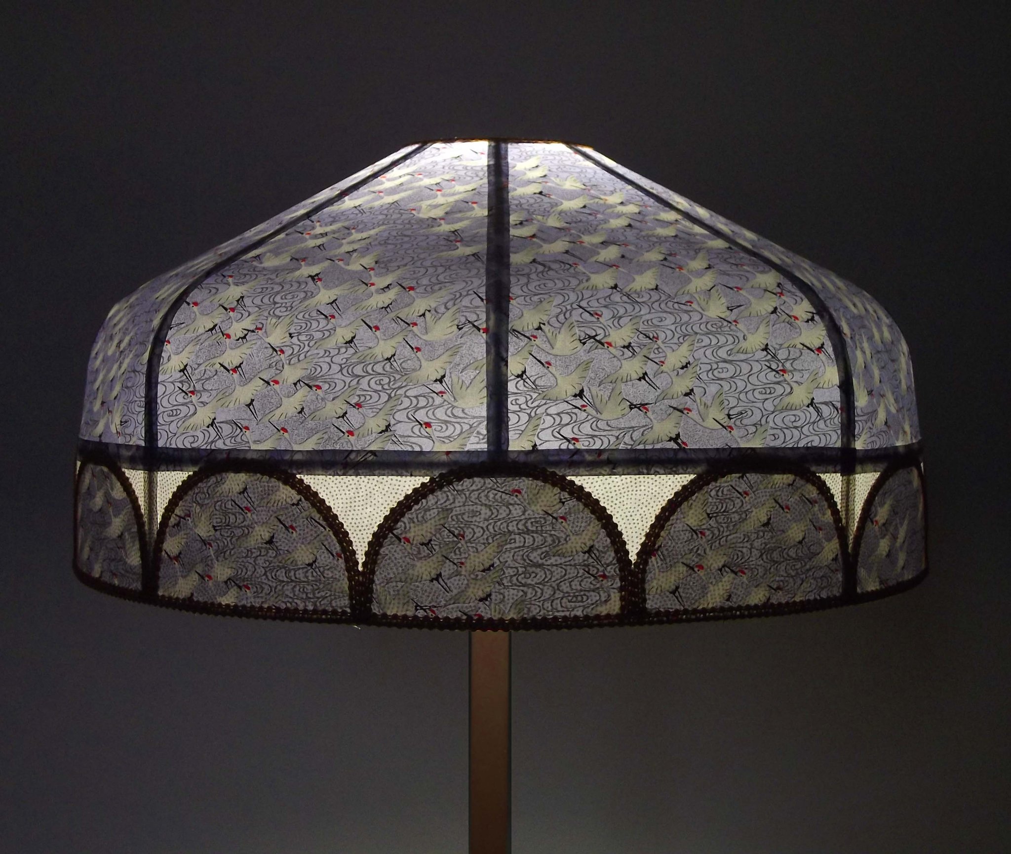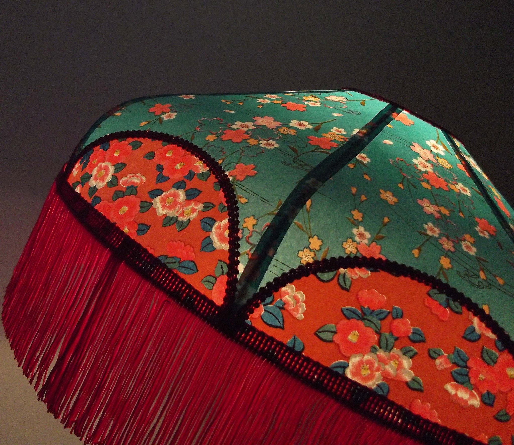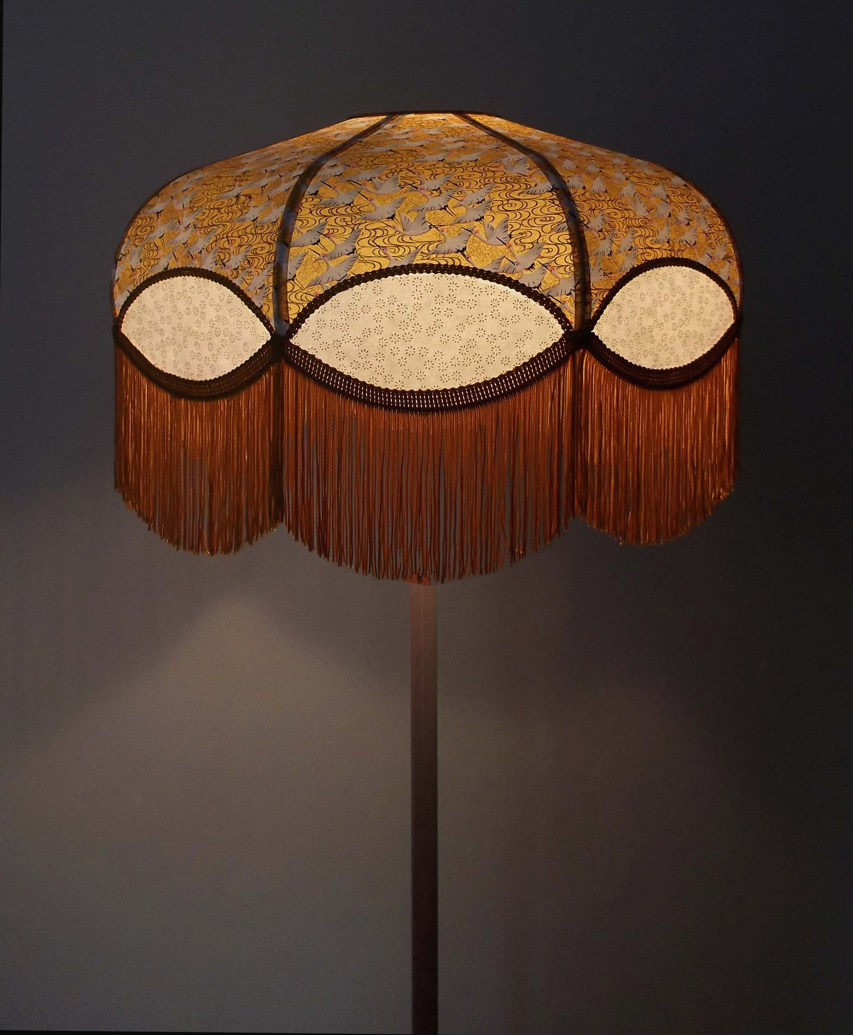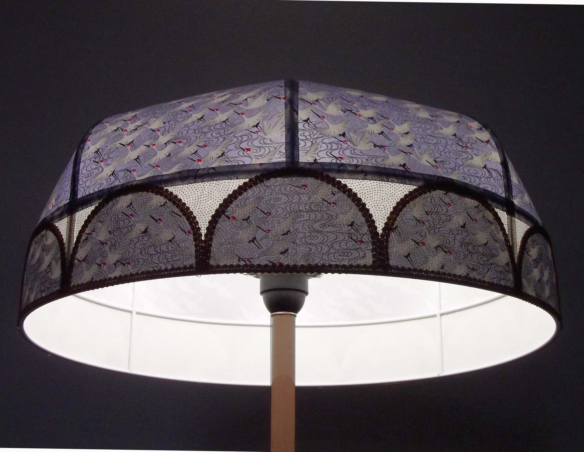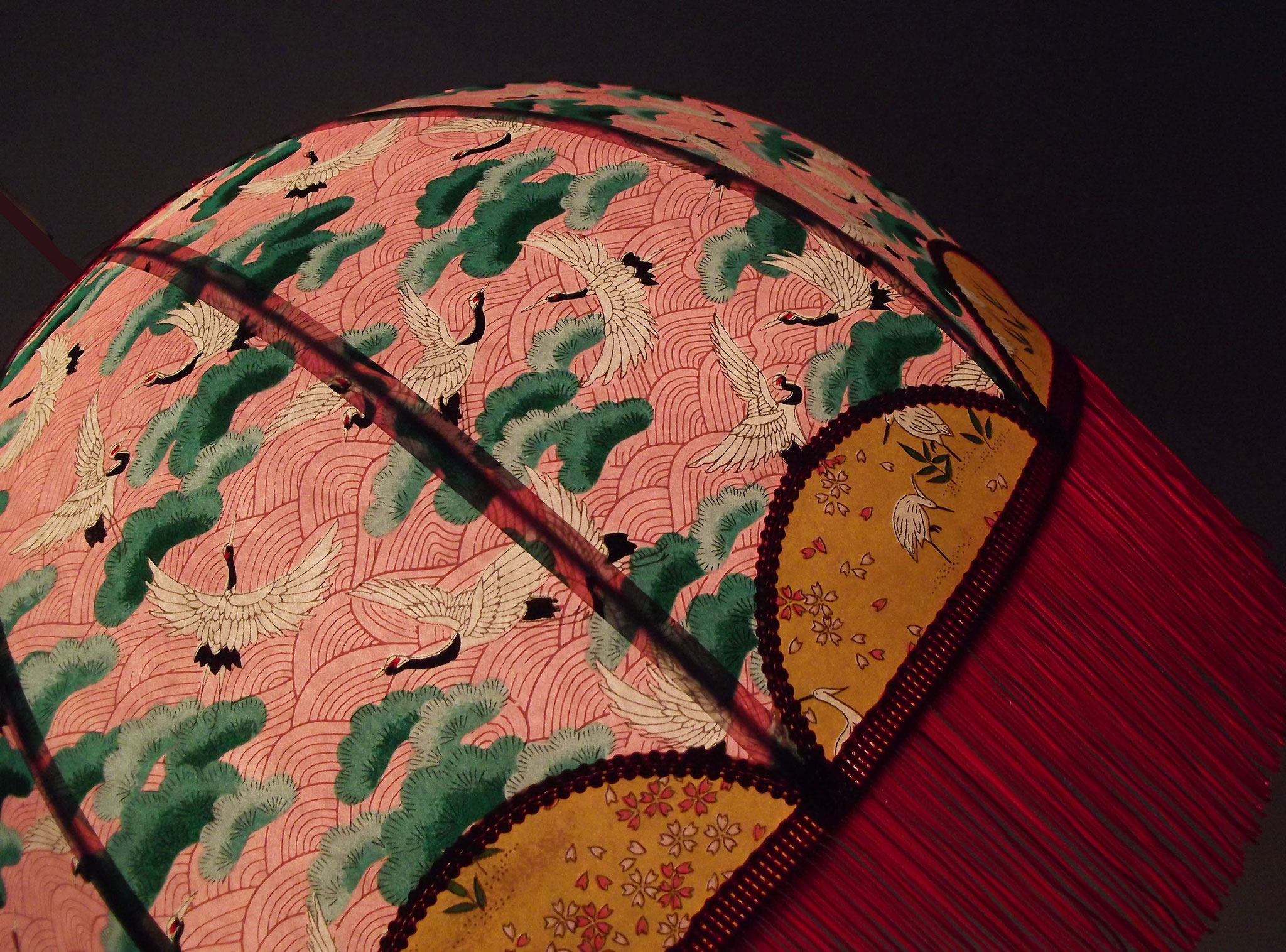 Abat-jour 40 cm de diamètre. Papier japonais fleurs style art déco sur fond rouge en haut et grues sur fond gris en bas. Frange