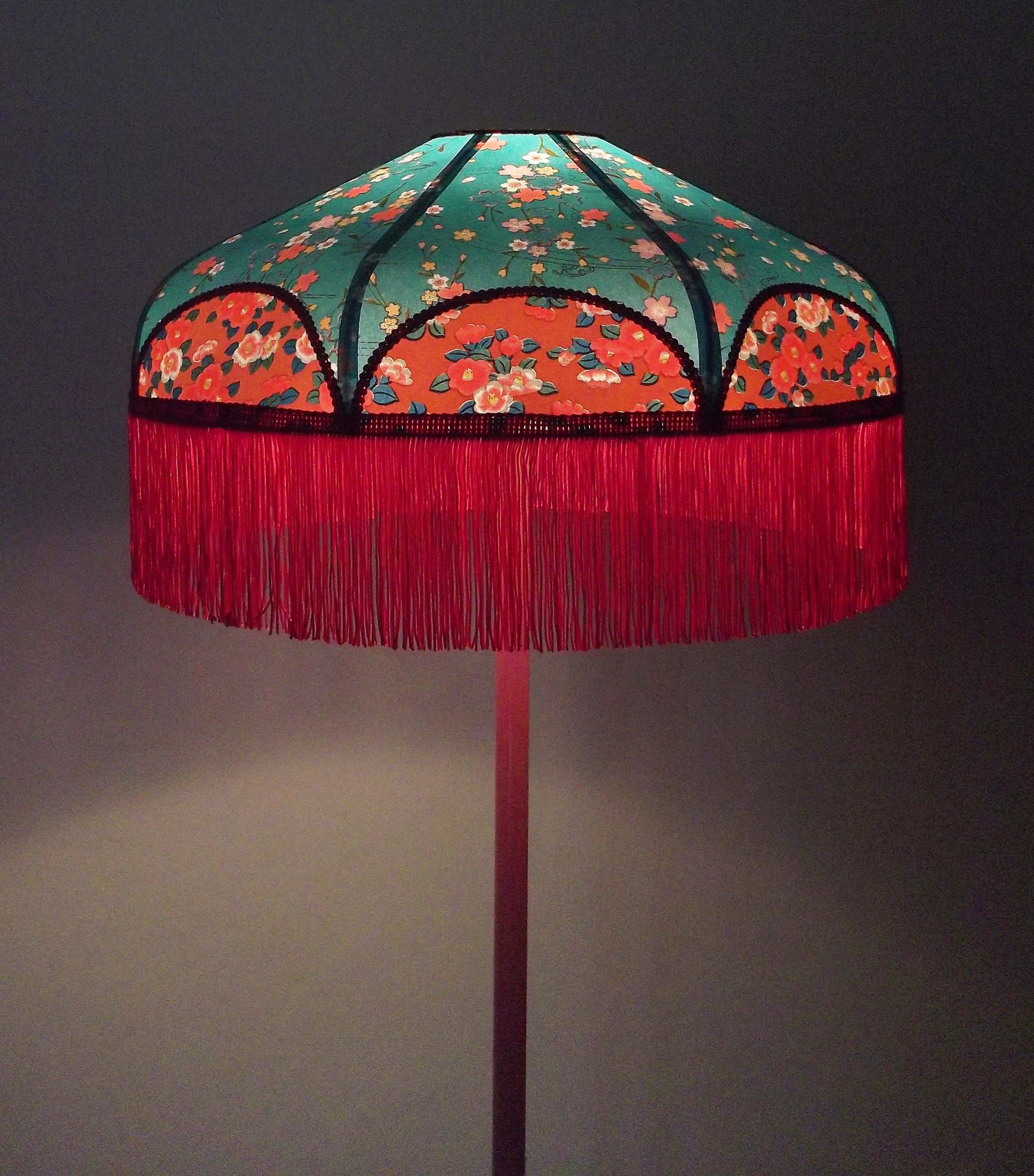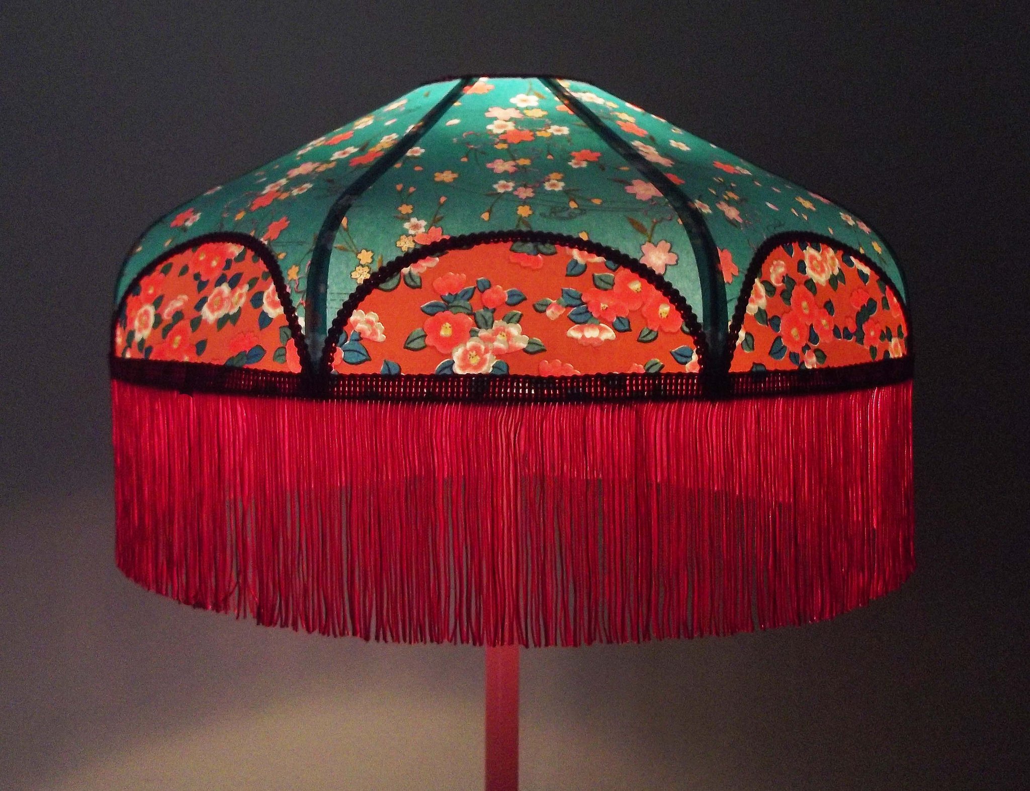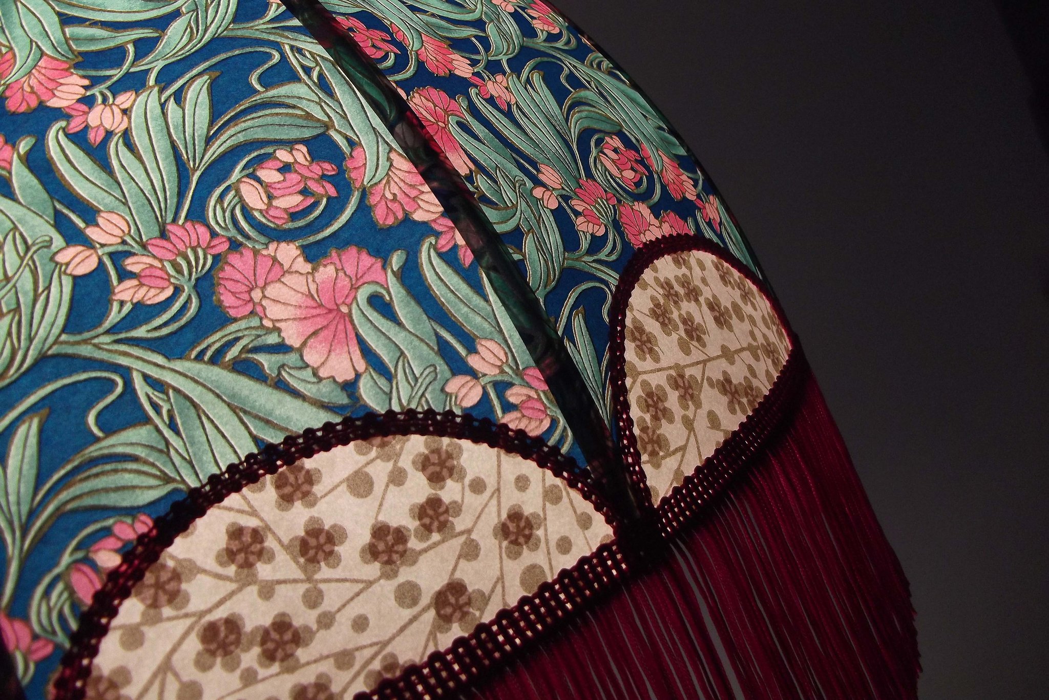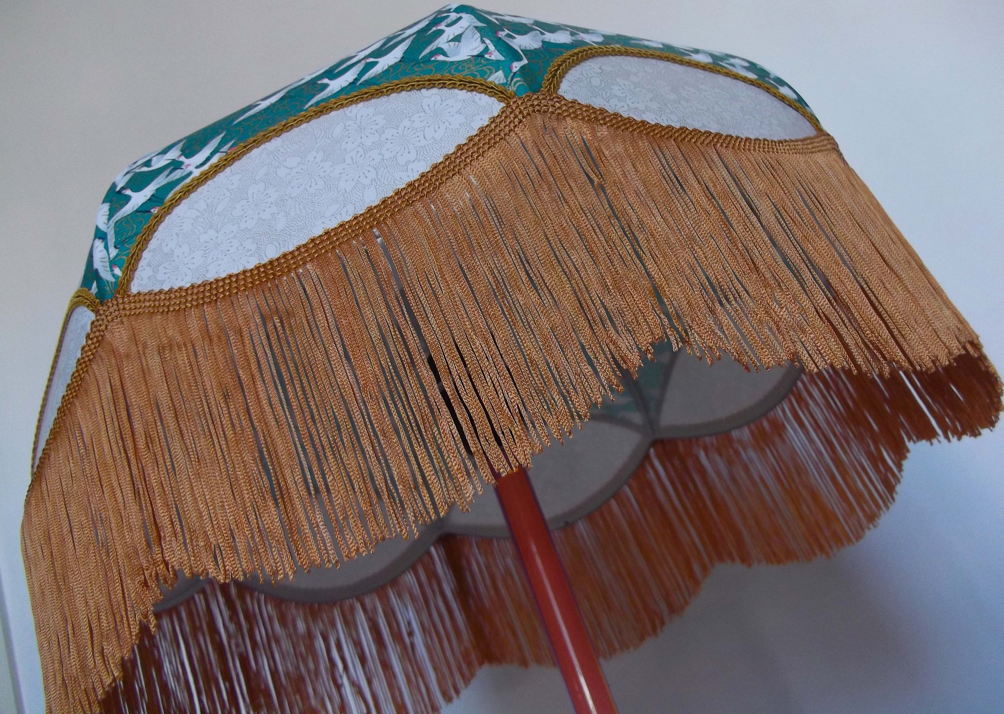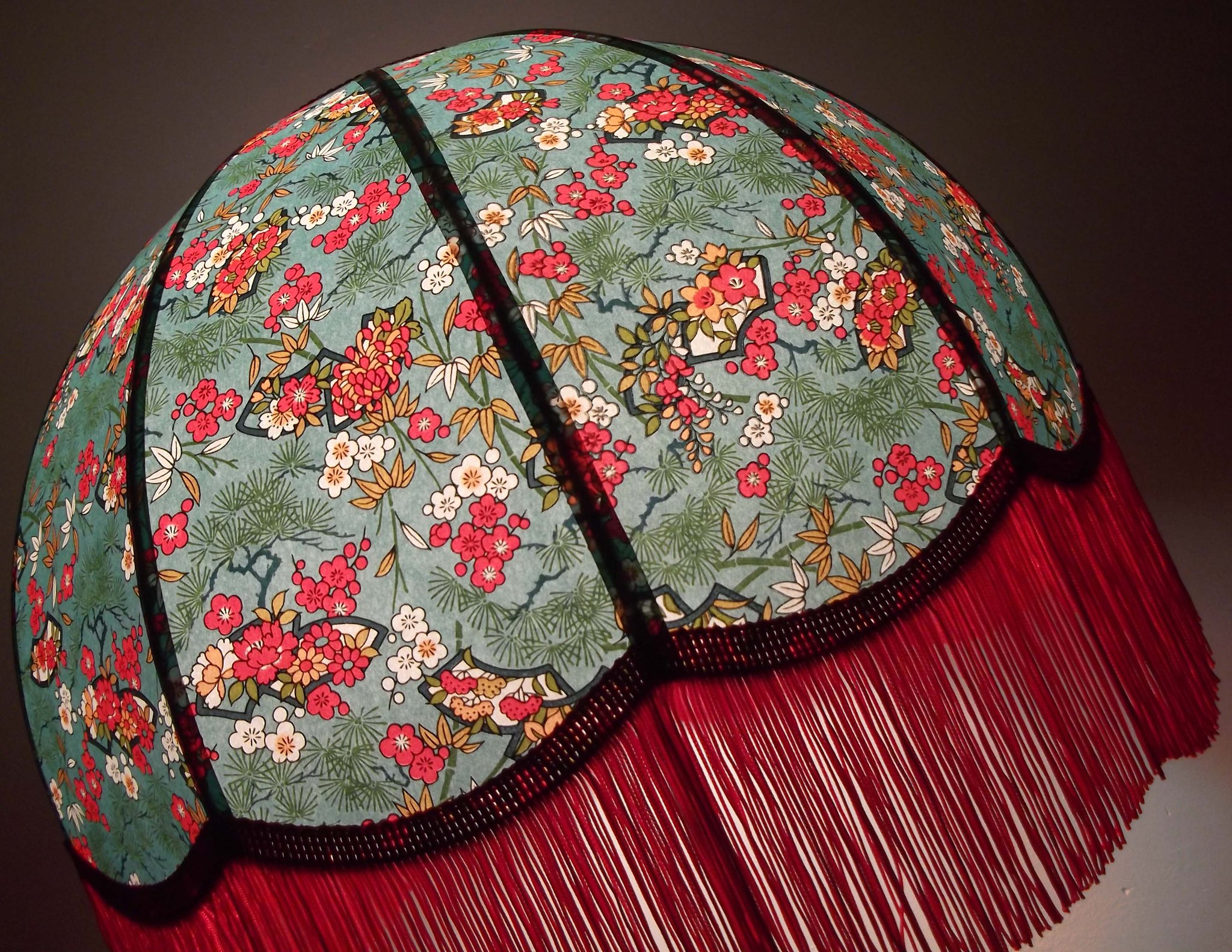 Abat-jour 40 cm de diamètre. Papier japonais fleurs style art déco sur fond rouge en haut et grues sur fond gris en bas. Frange