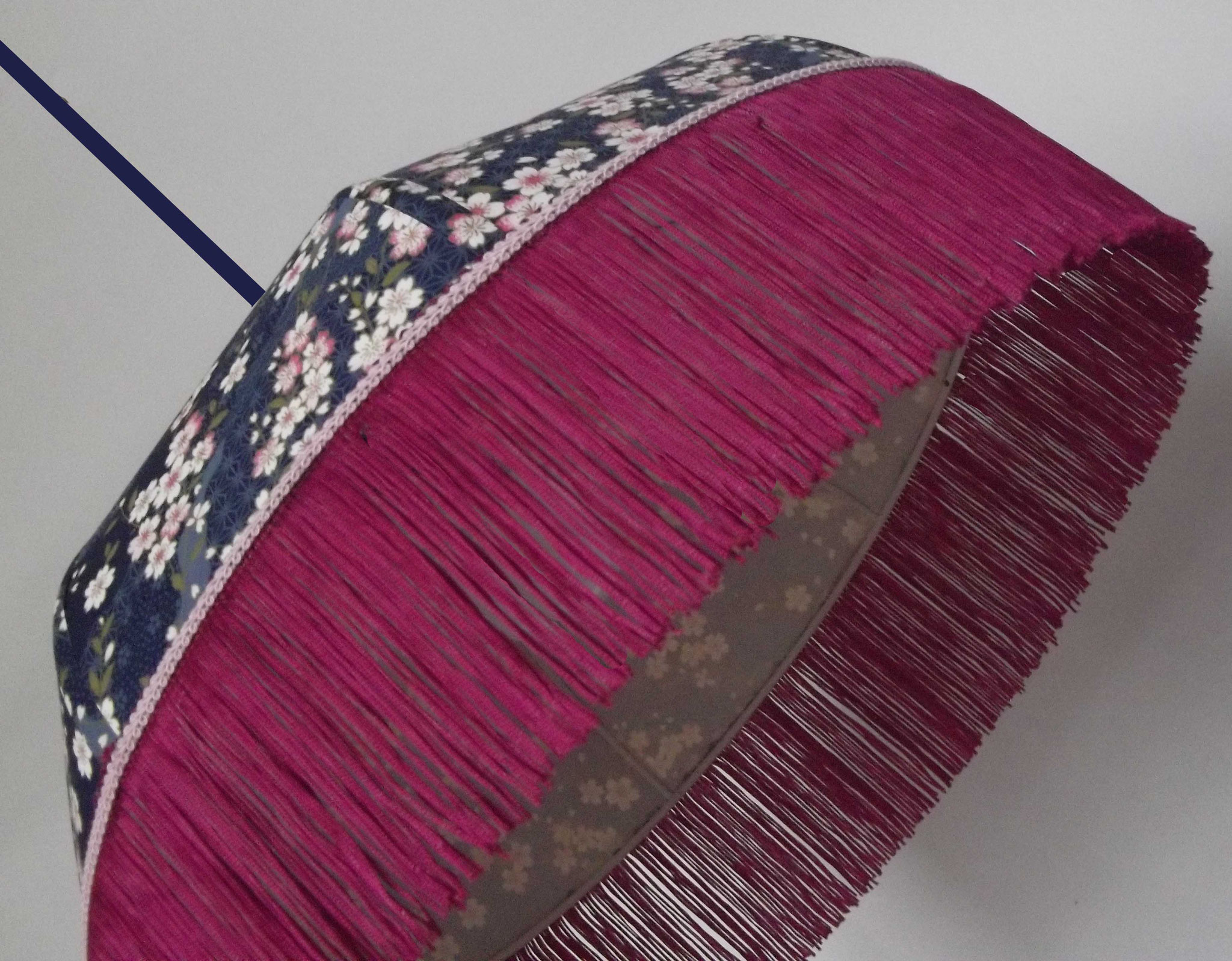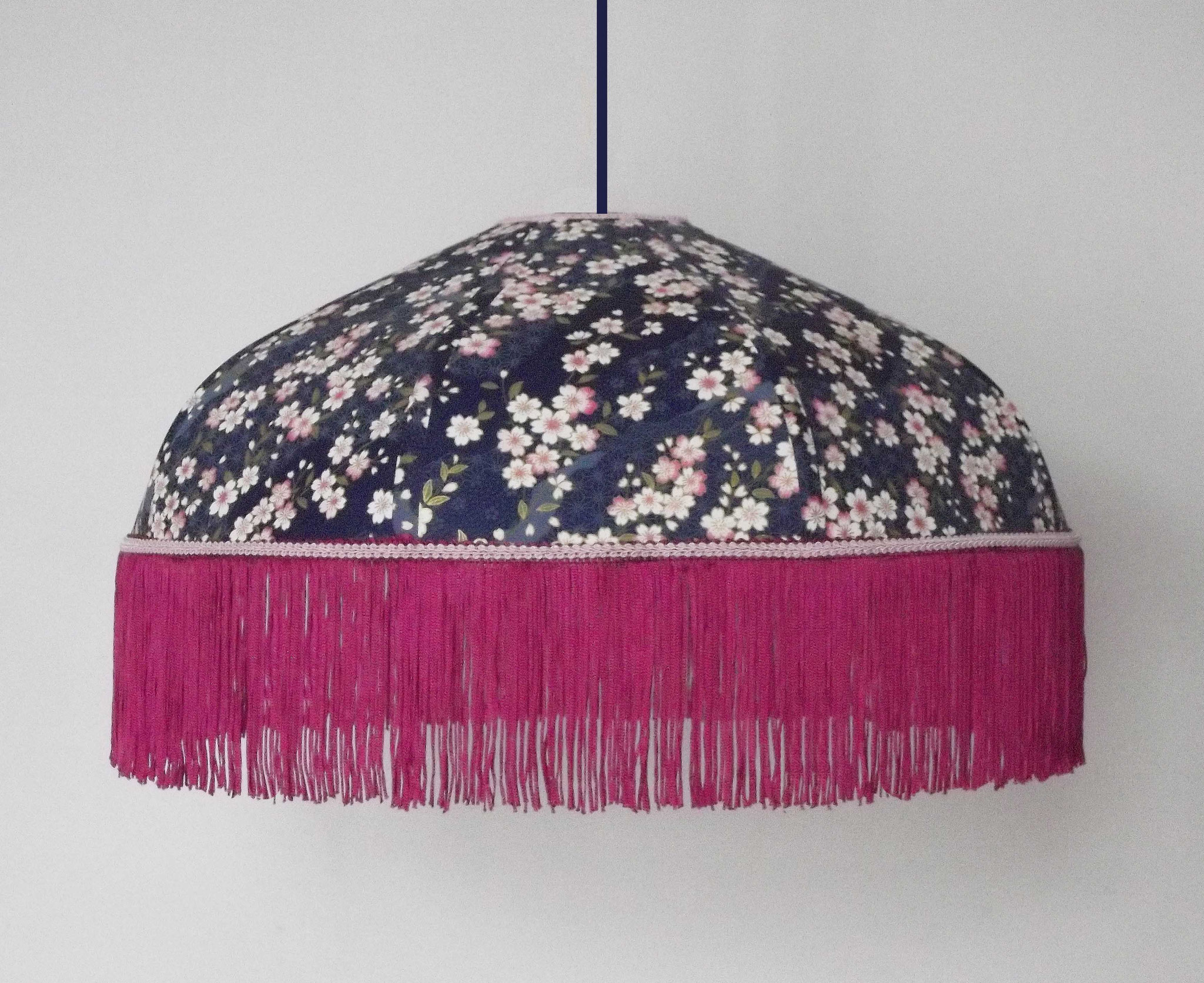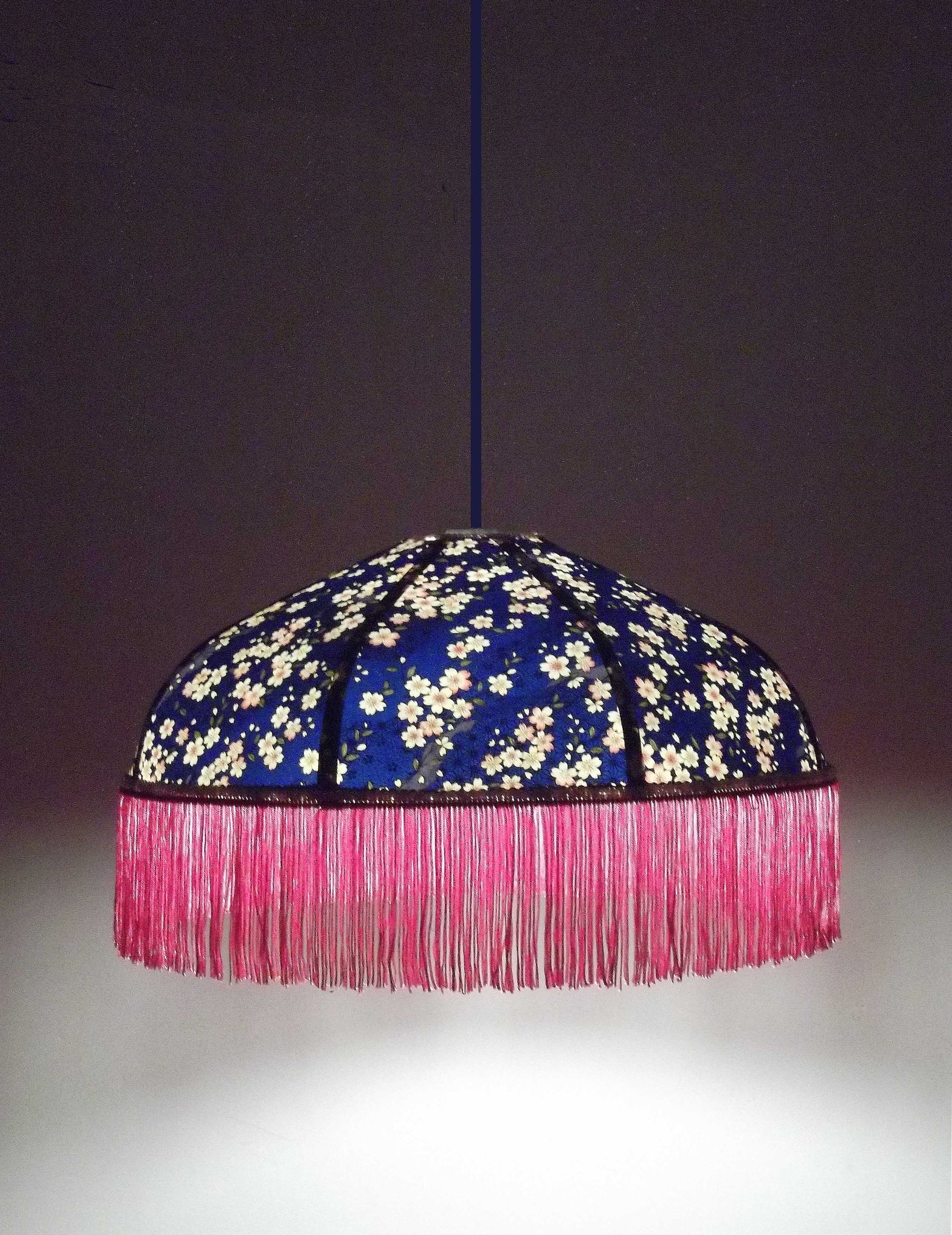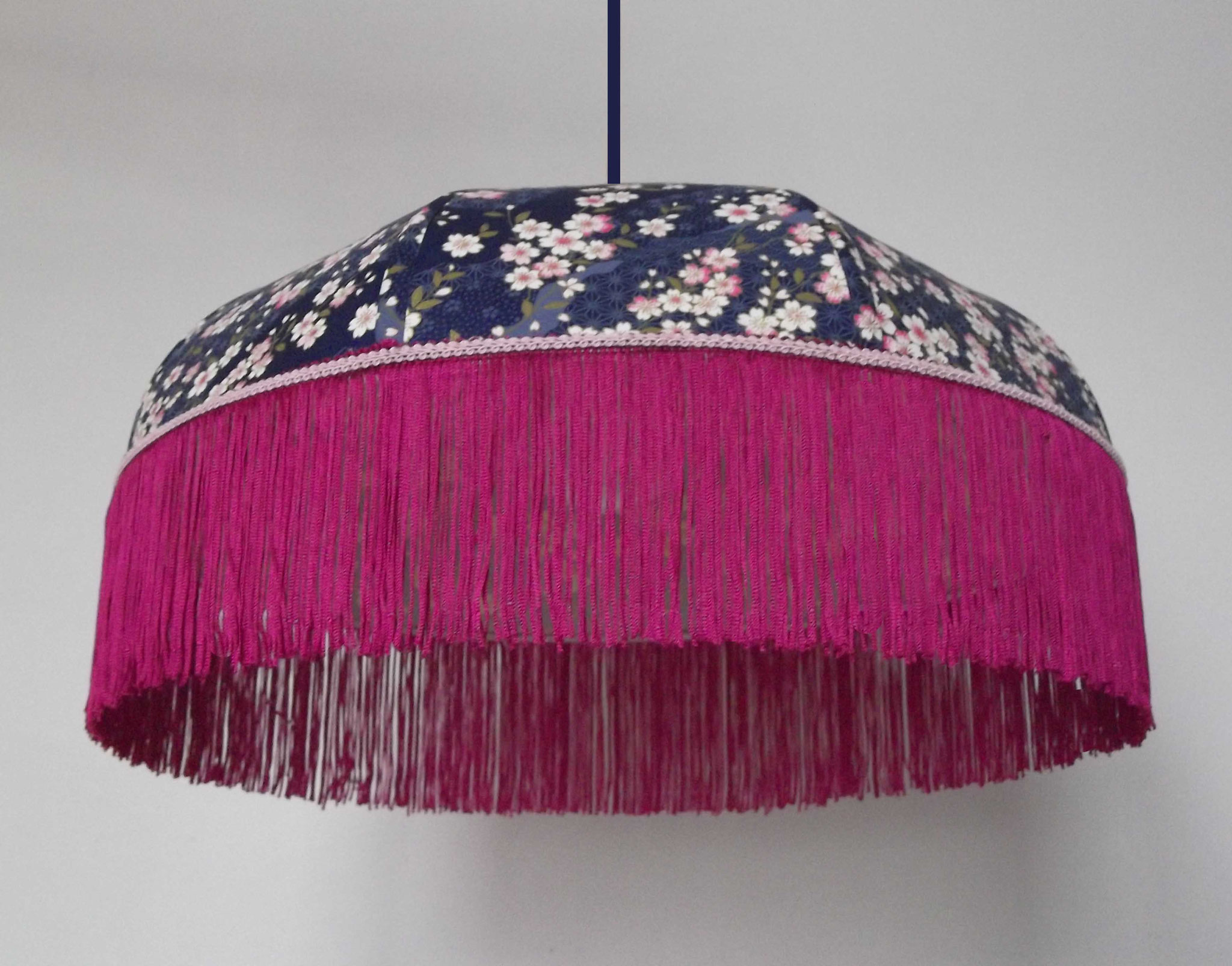 Abat-jour 40 cm de diamètre. Papier japonais fleurs art déco roses sur fond bleu . Frange fuchsia. Hauteur 16 cm + 10 cm de frange. Douille E27, 40 w max.