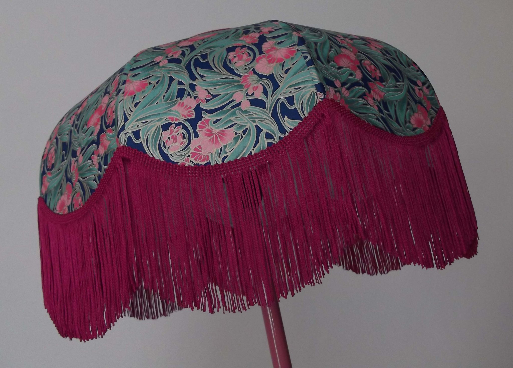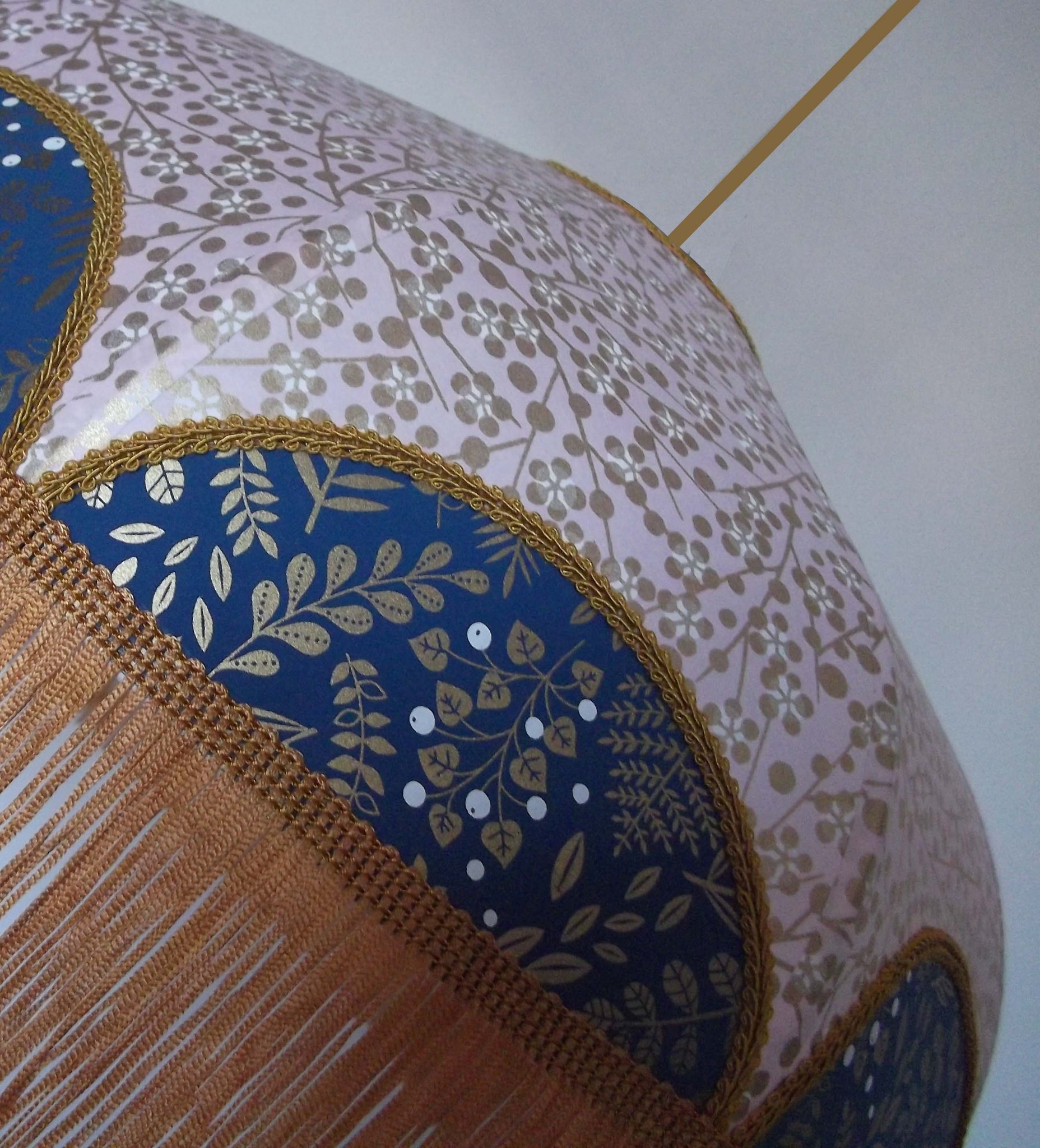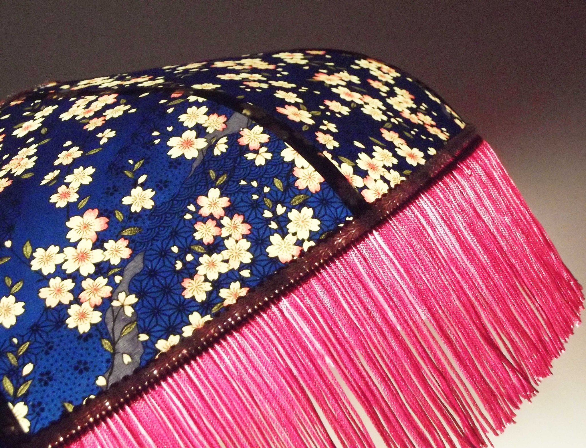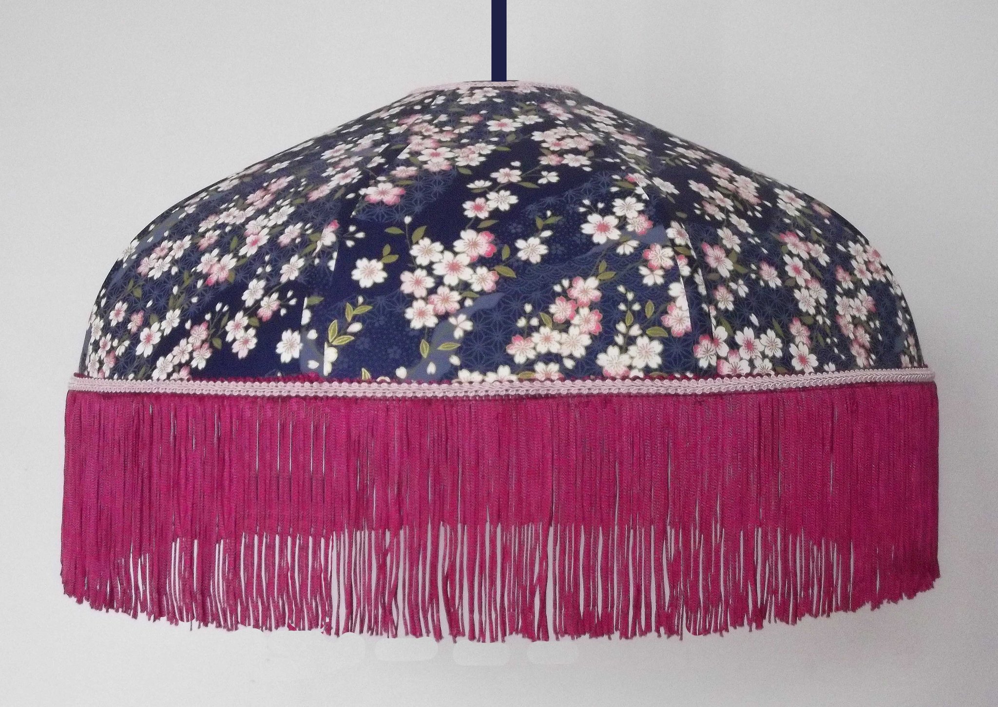 Abat-jour 40 cm de diamètre. Papier japonais fleurs art déco roses sur fond bleu . Frange fuchsia. Hauteur 16 cm + 10 cm de frange. Douille E27, 40 w max.