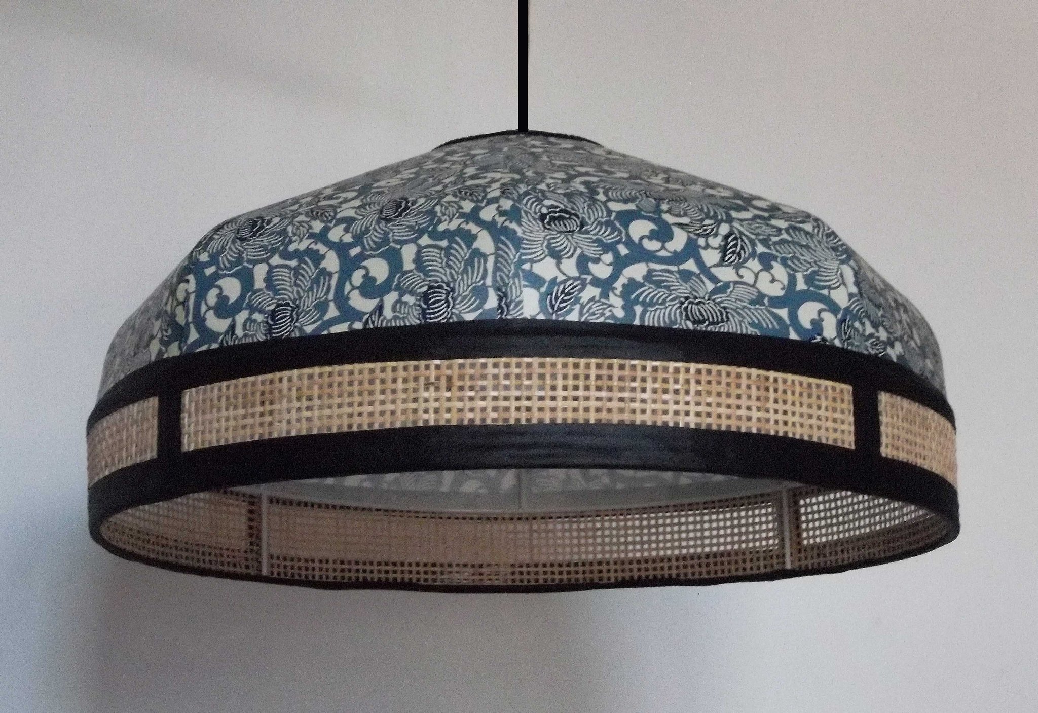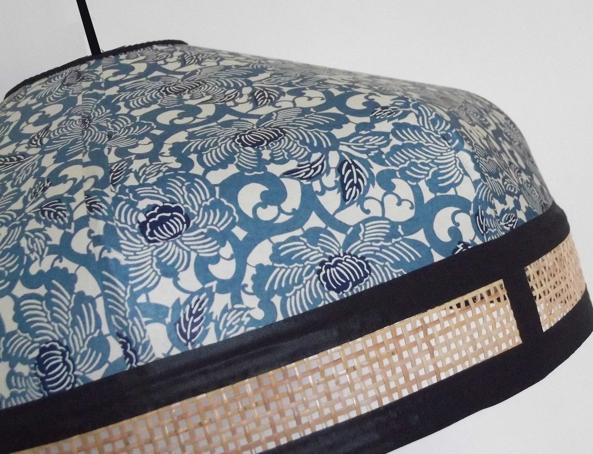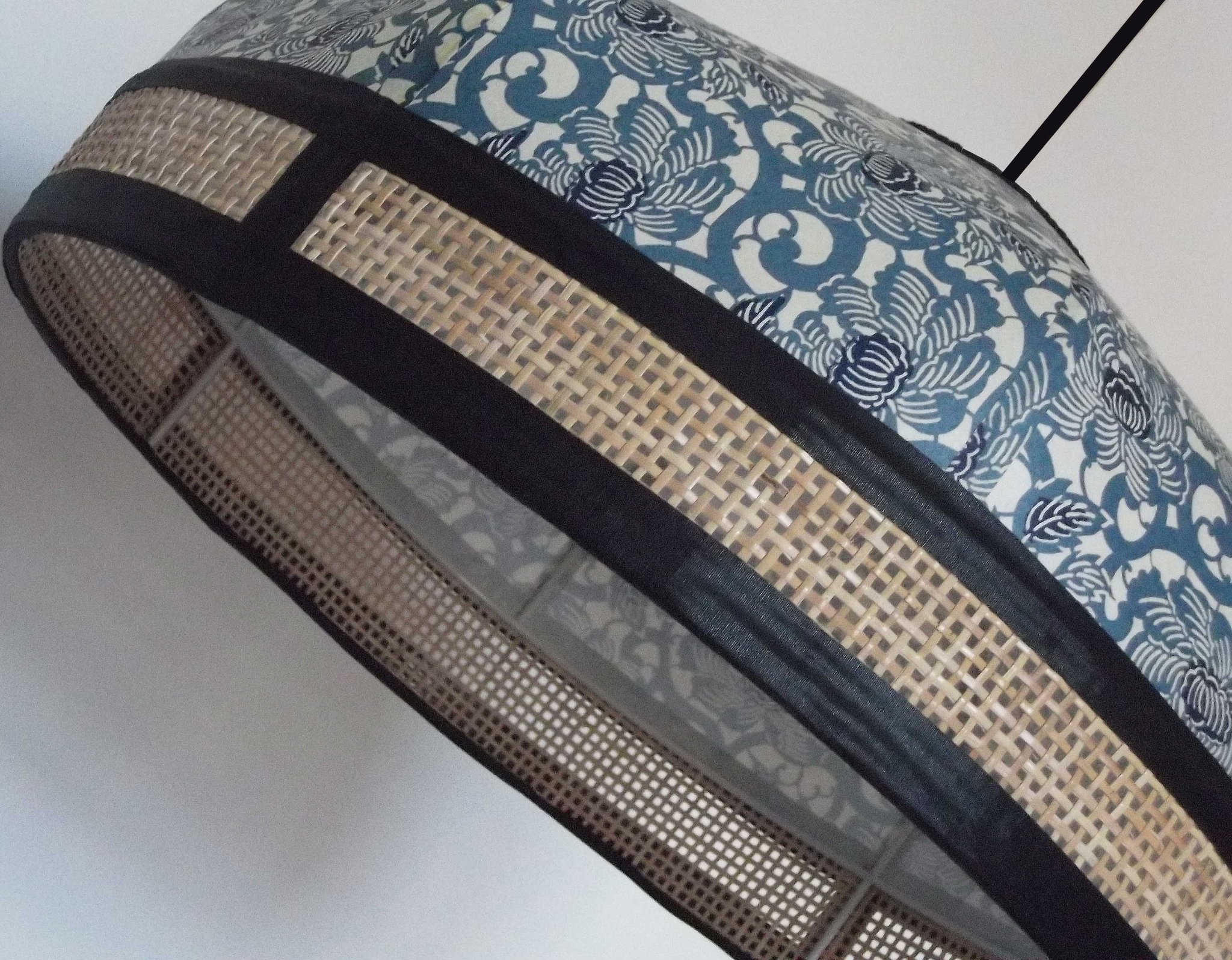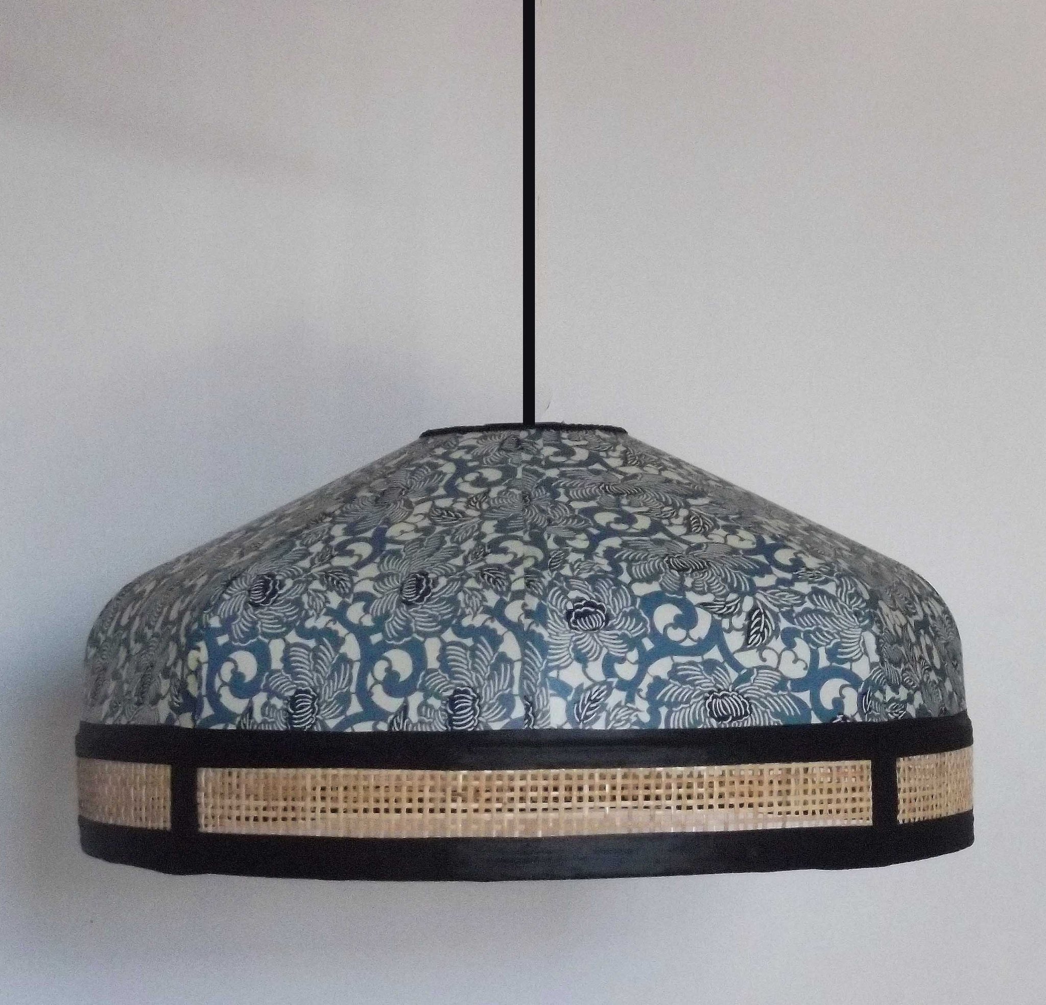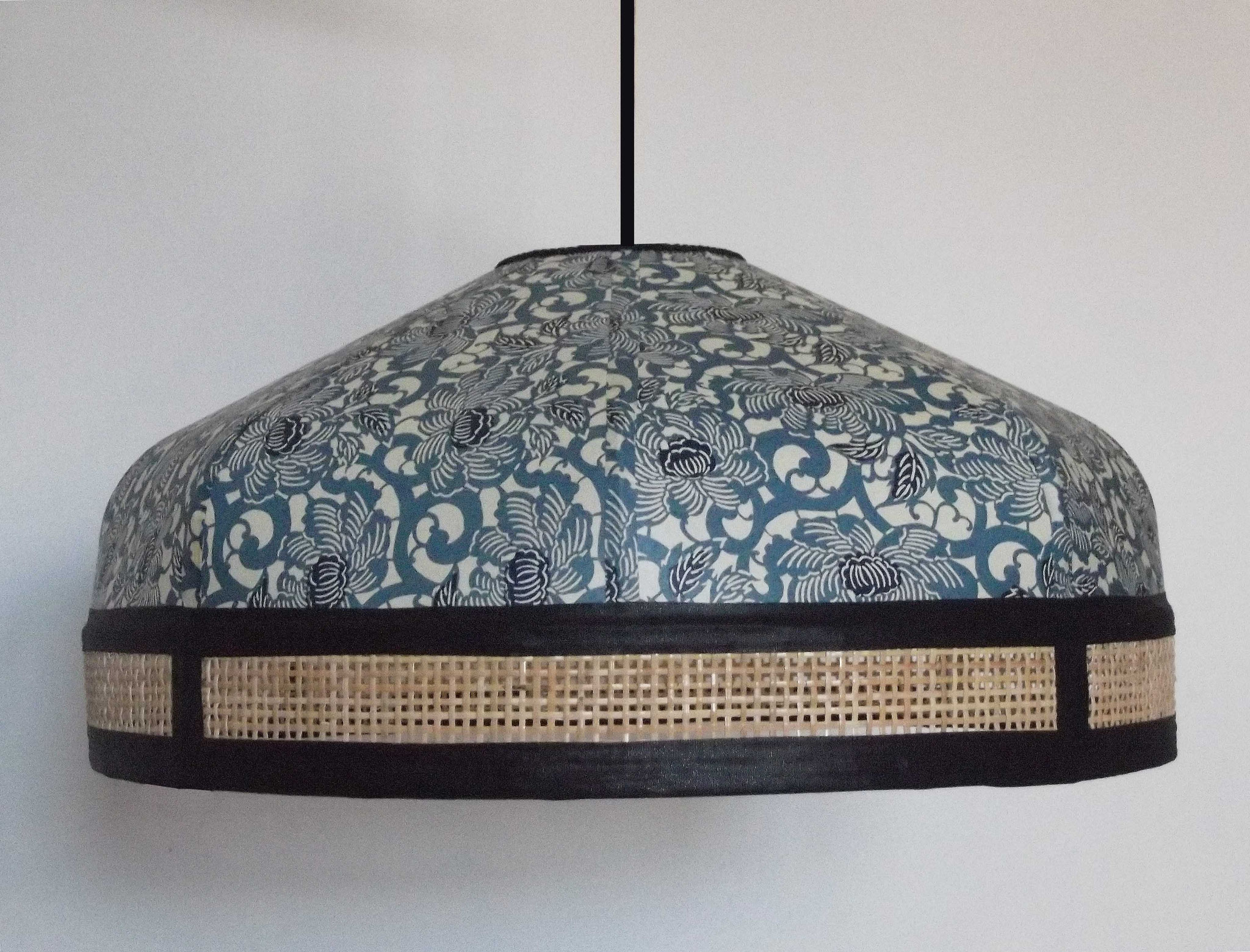 Suspension en papier japonais fleurs de lotus bleues sur fond écru et cannage naturel. Diamètre 40 cm, hauteur 20 cm.