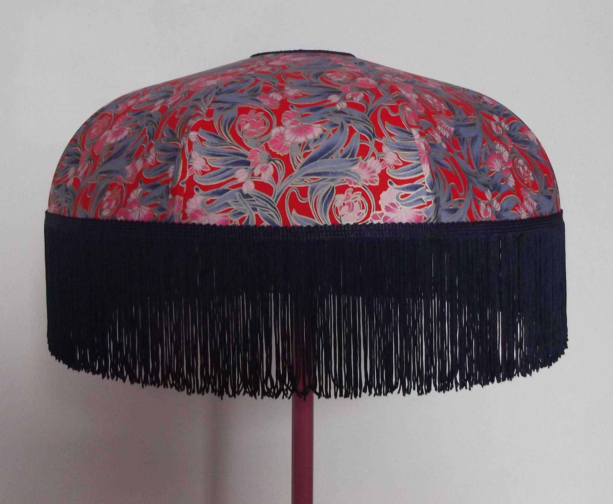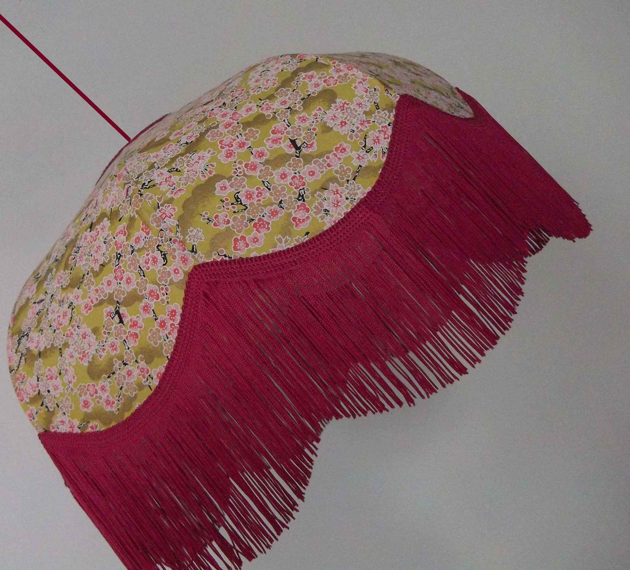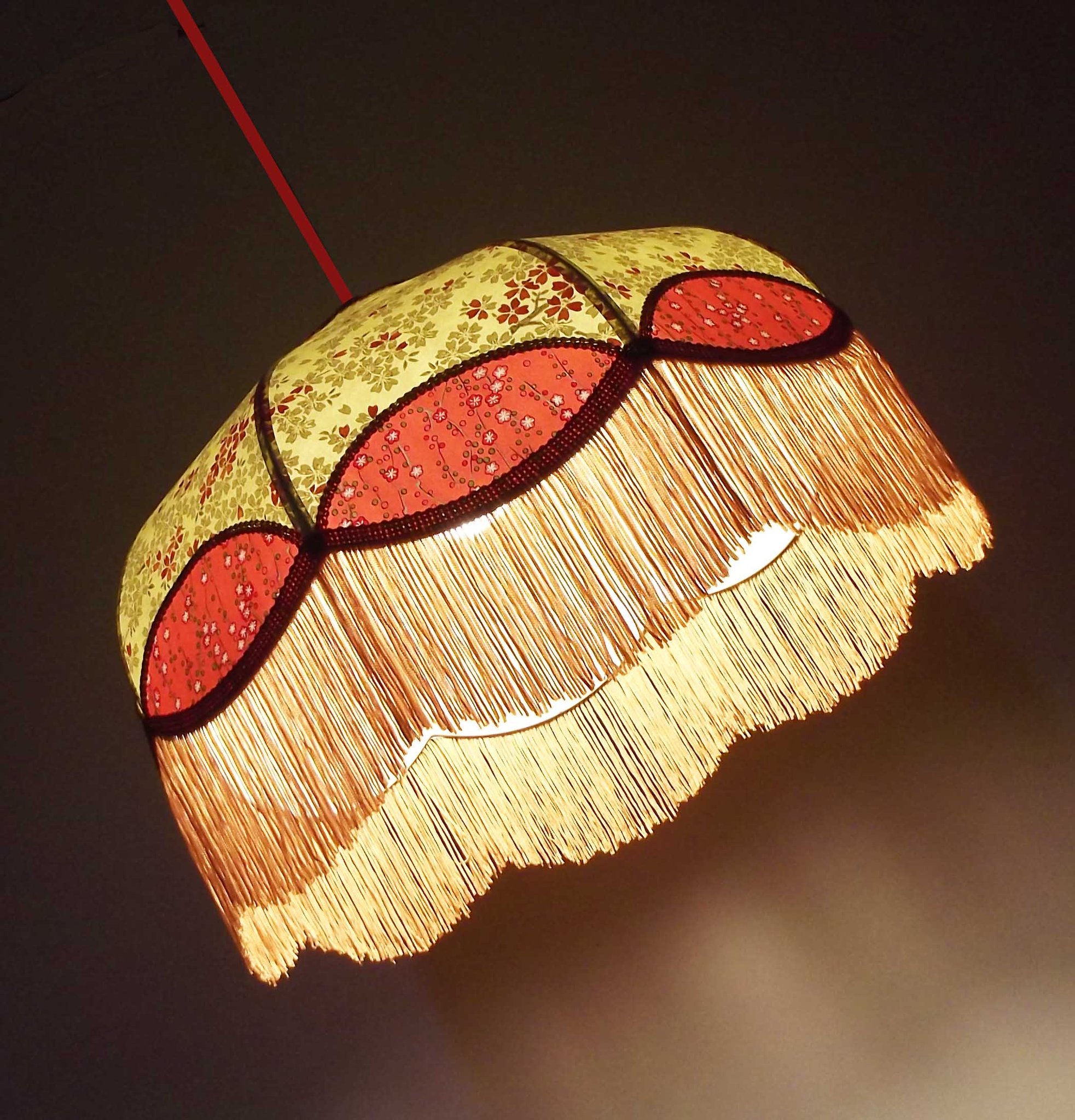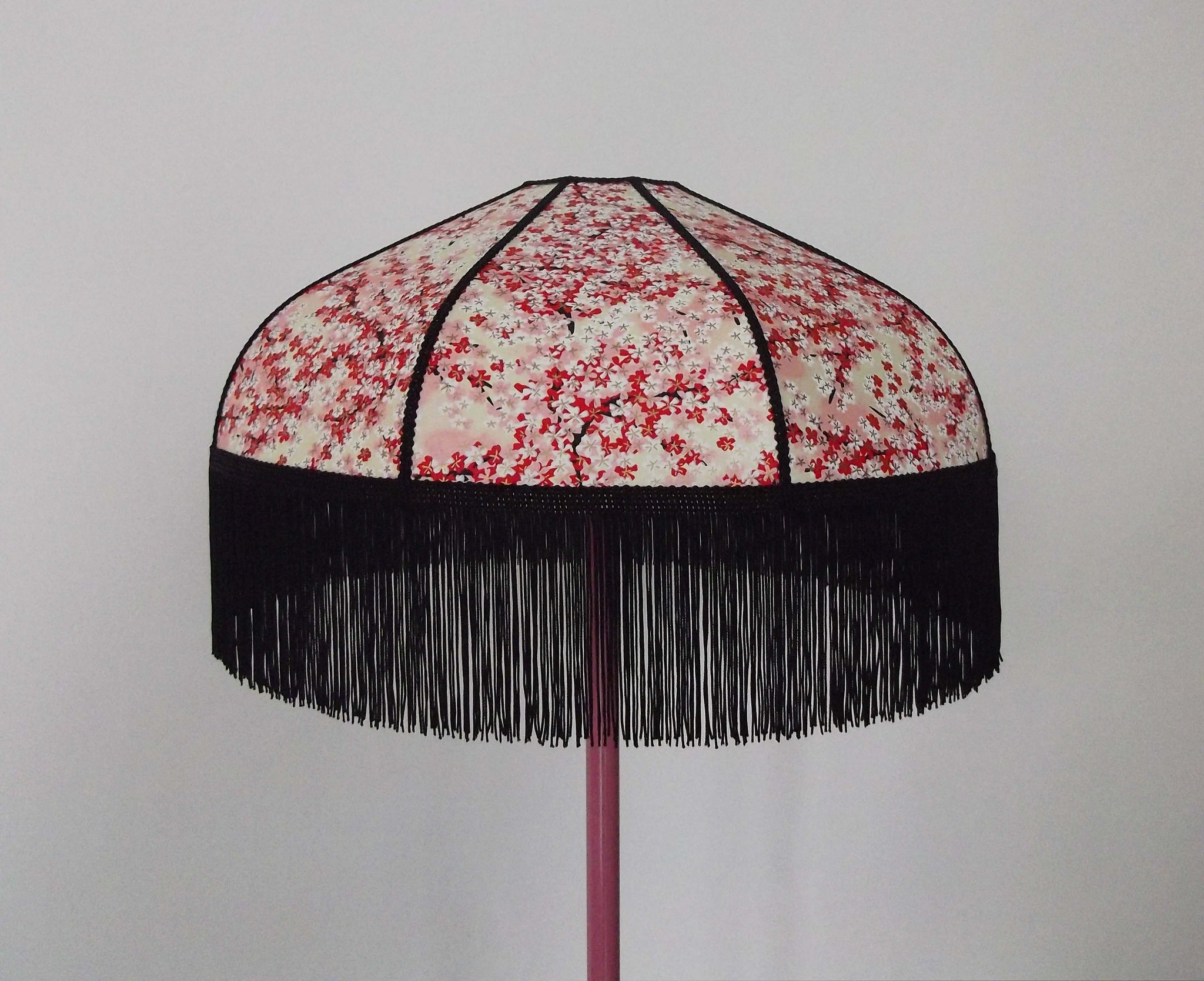 Abat-jour 40 cm de diamètre. Papier japonais petites fleurs rouges et roses sur fond écru. Frange et galon noir. Hauteur 14 cm + 10 cm de frange. Douille E27, 40 w max.