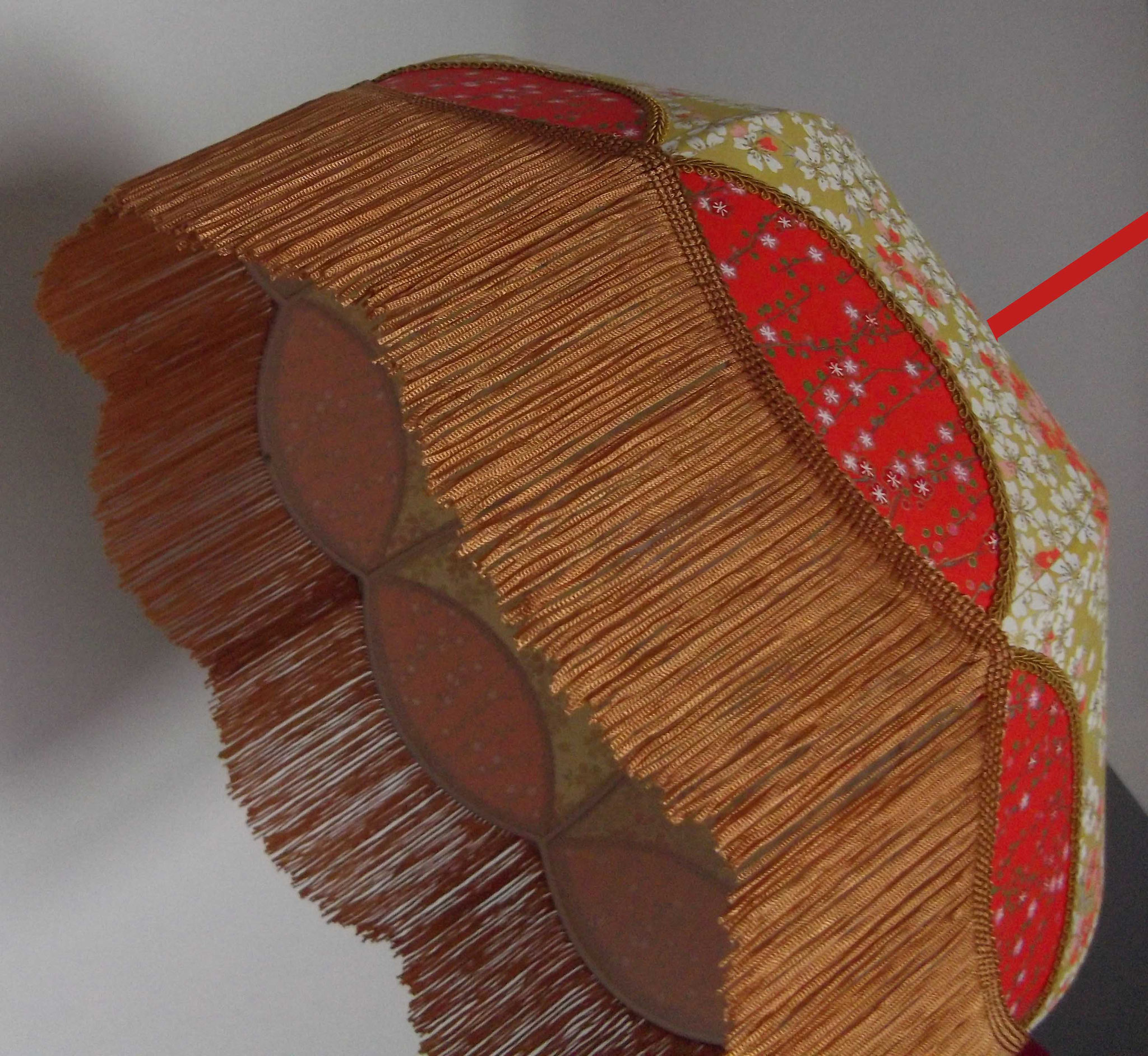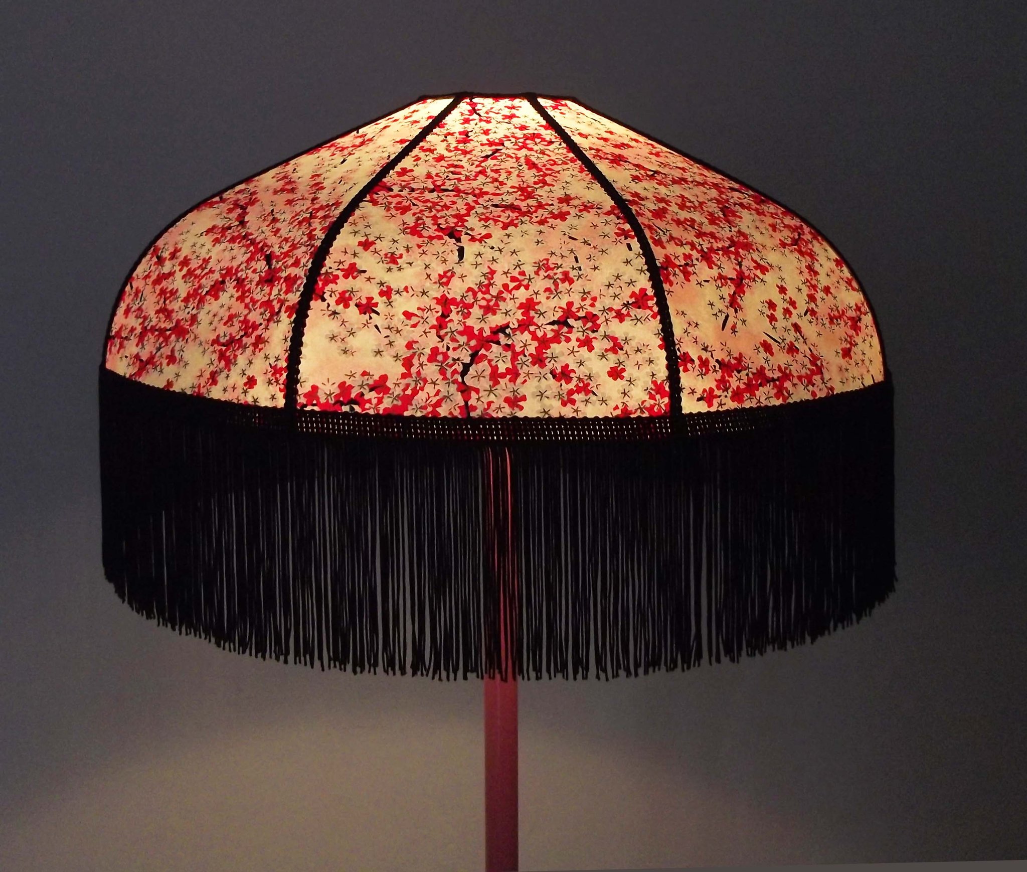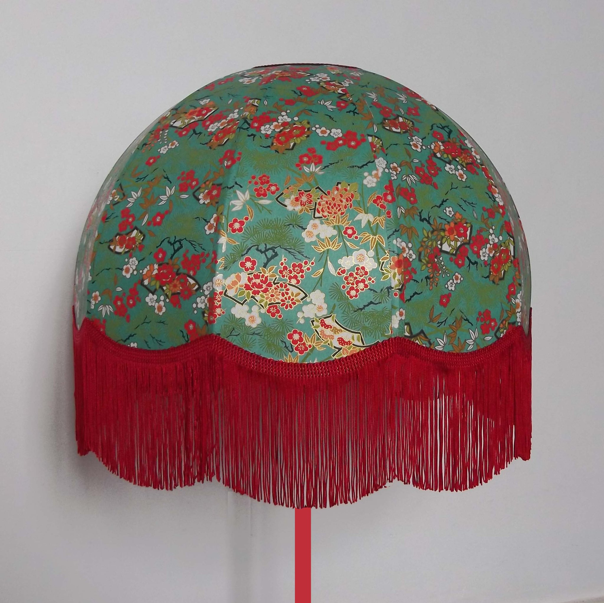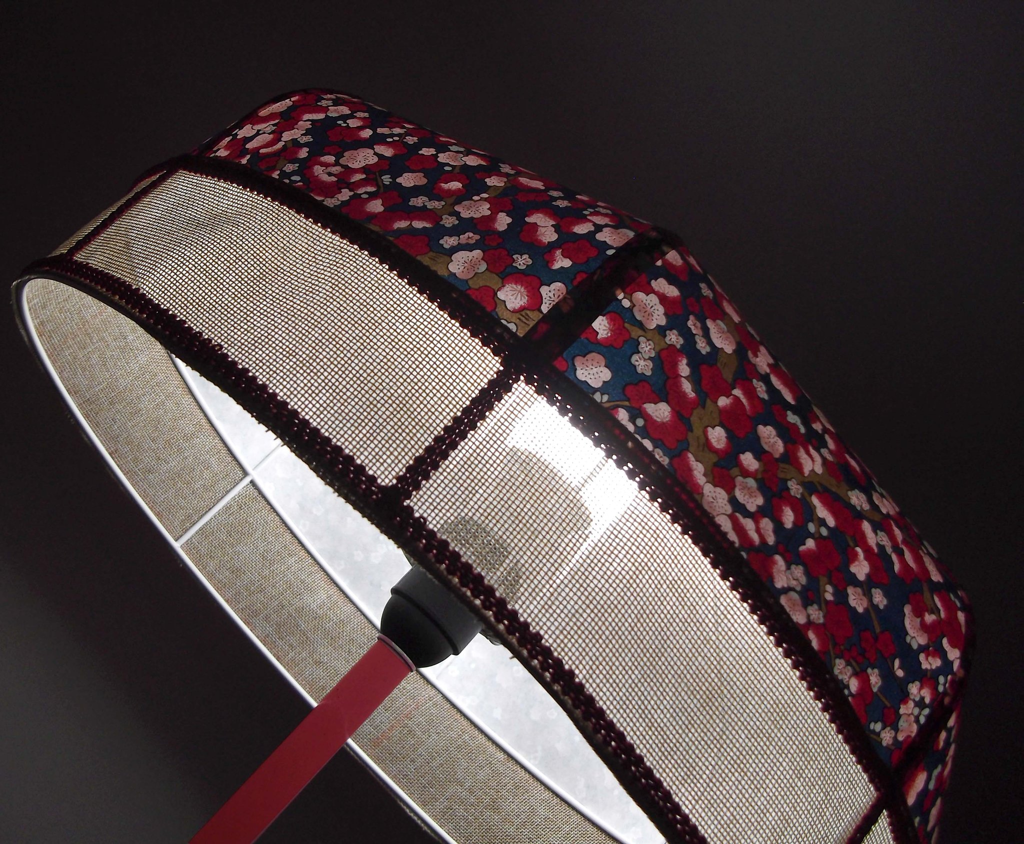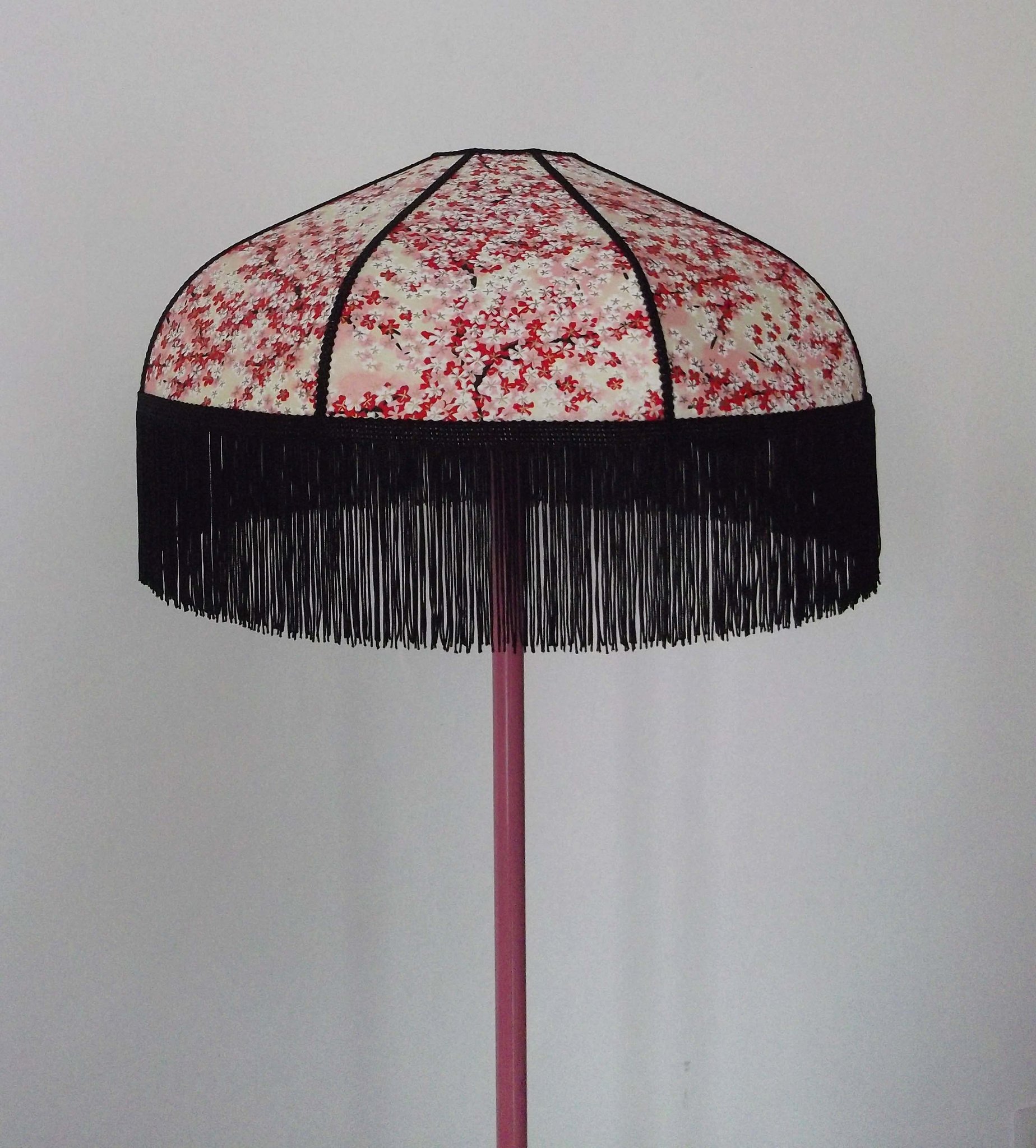 Abat-jour 40 cm de diamètre. Papier japonais petites fleurs rouges et roses sur fond écru. Frange et galon noir. Hauteur 14 cm + 10 cm de frange. Douille E27, 40 w max.