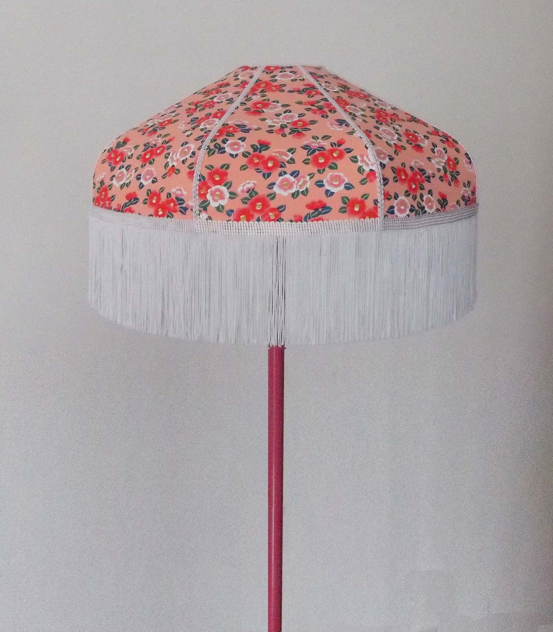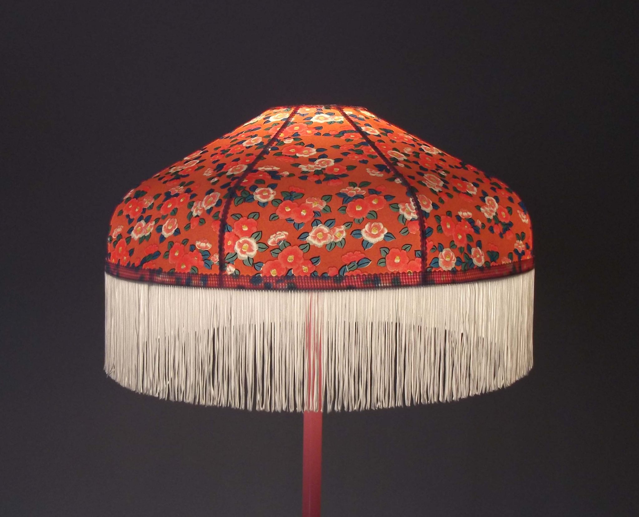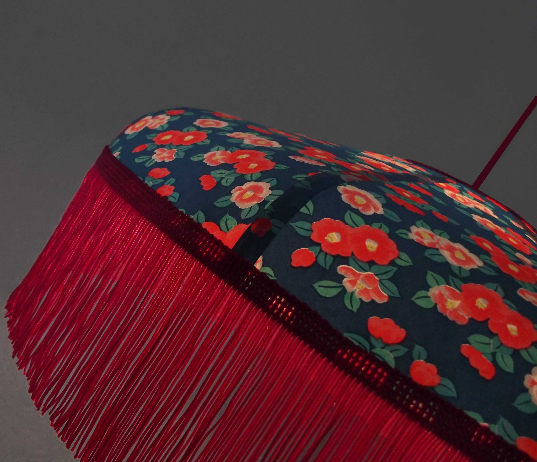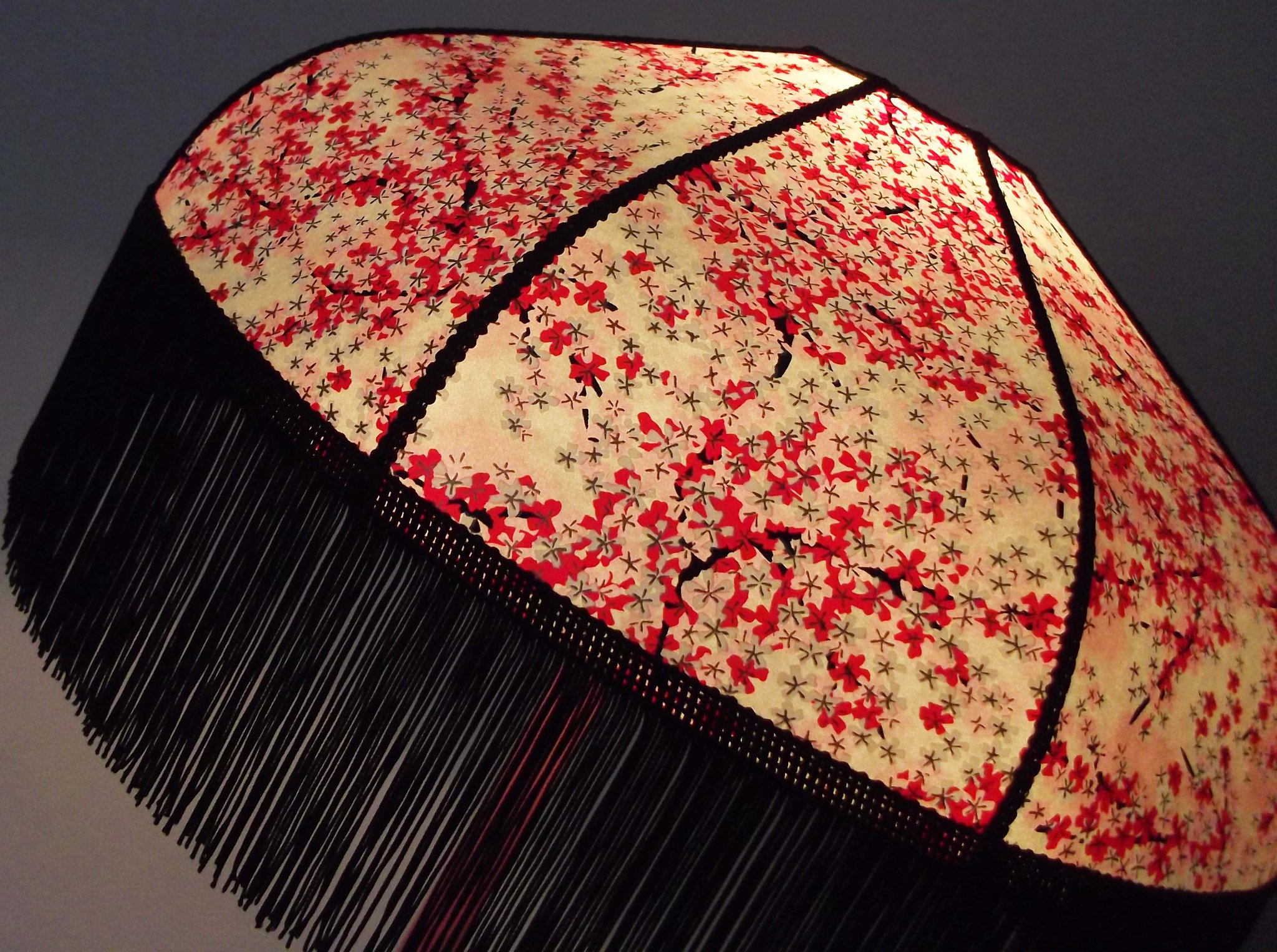 Abat-jour 40 cm de diamètre. Papier japonais petites fleurs rouges et roses sur fond écru. Frange et galon noir. Hauteur 14 cm + 10 cm de frange. Douille E27, 40 w max.