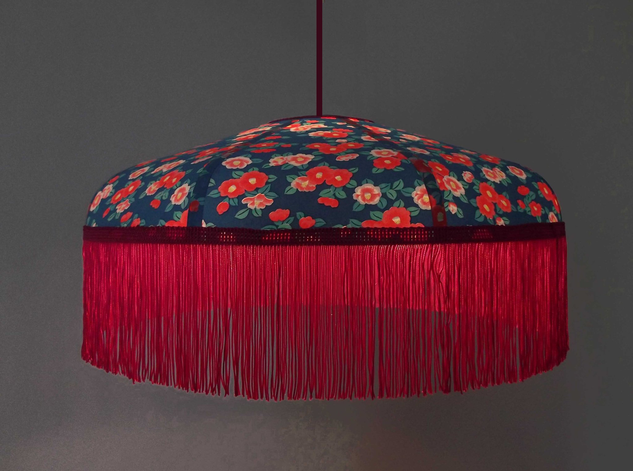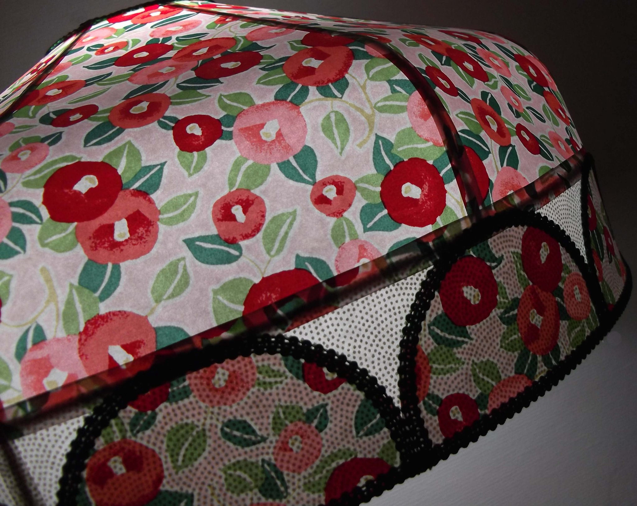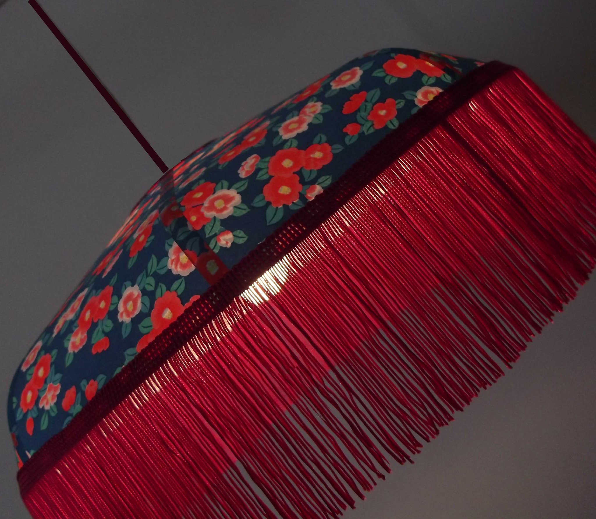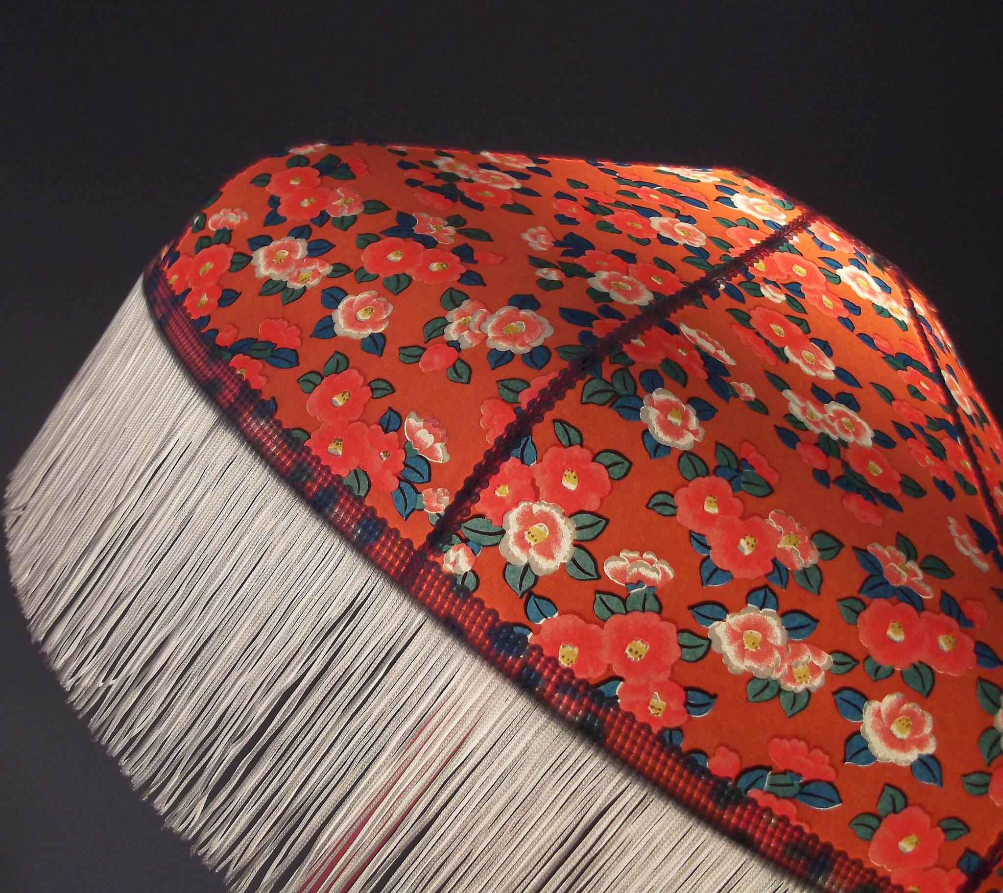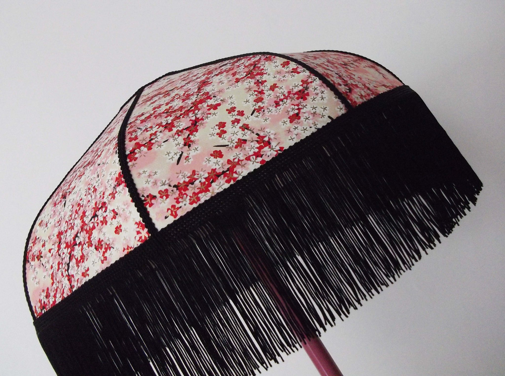 Abat-jour 40 cm de diamètre. Papier japonais petites fleurs rouges et roses sur fond écru. Frange et galon noir. Hauteur 14 cm + 10 cm de frange. Douille E27, 40 w max.