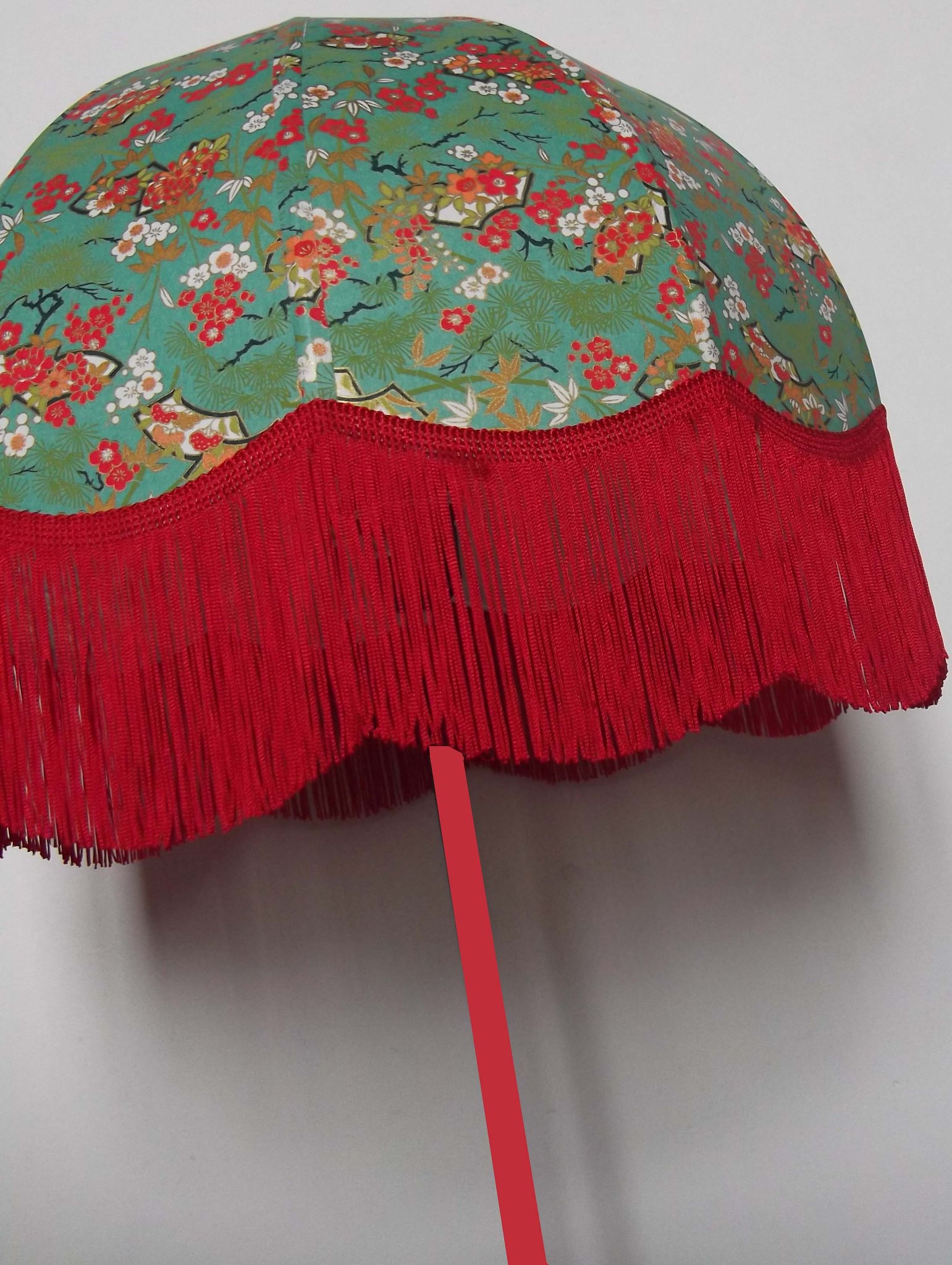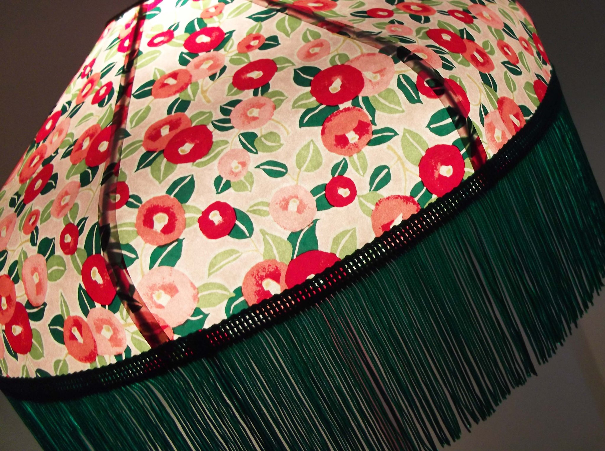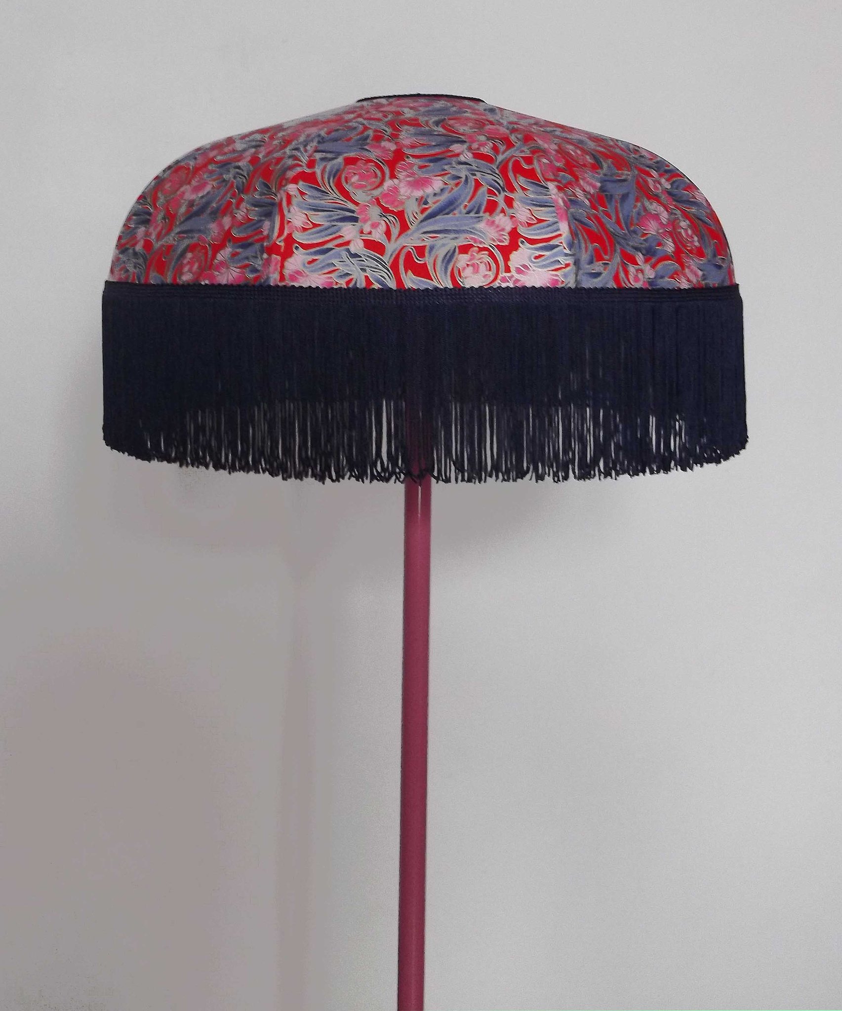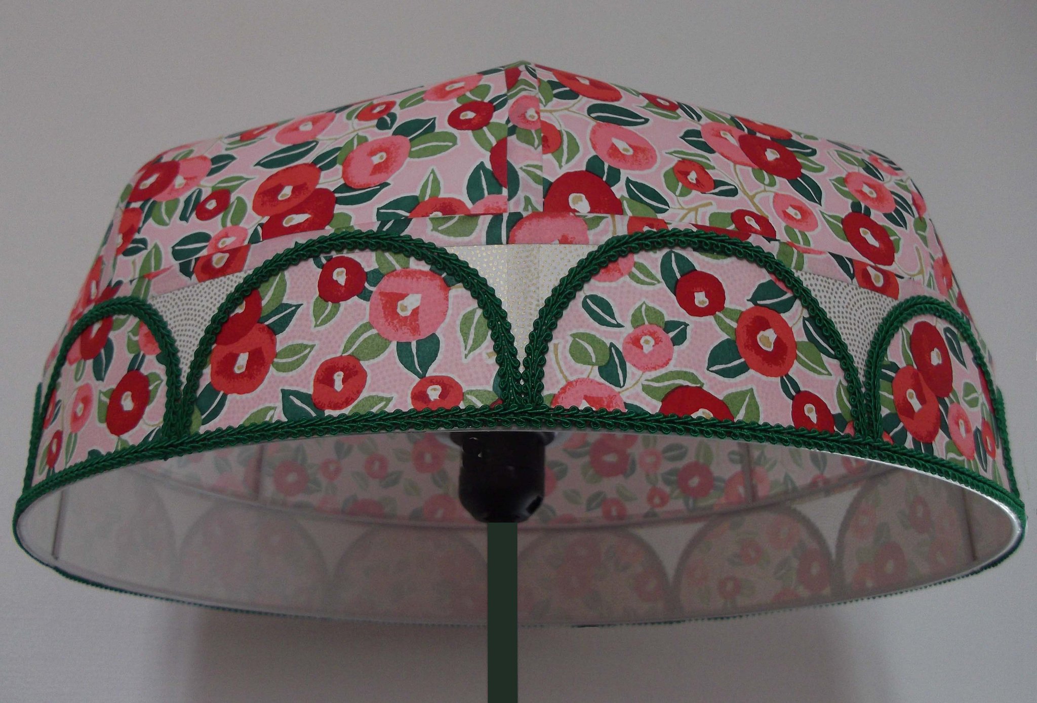 Abat-jour 40 cm de diamètre. Papier japonais petites fleurs rouges et roses sur fond écru. Frange et galon noir. Hauteur 14 cm + 10 cm de frange. Douille E27, 40 w max.