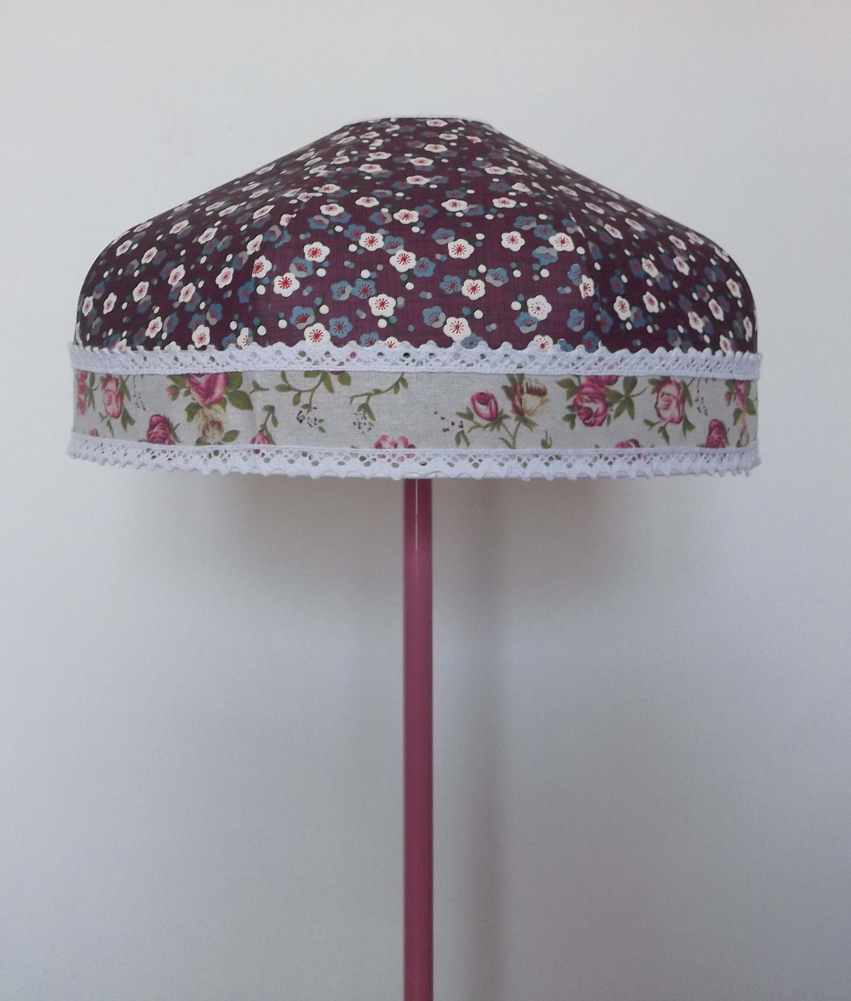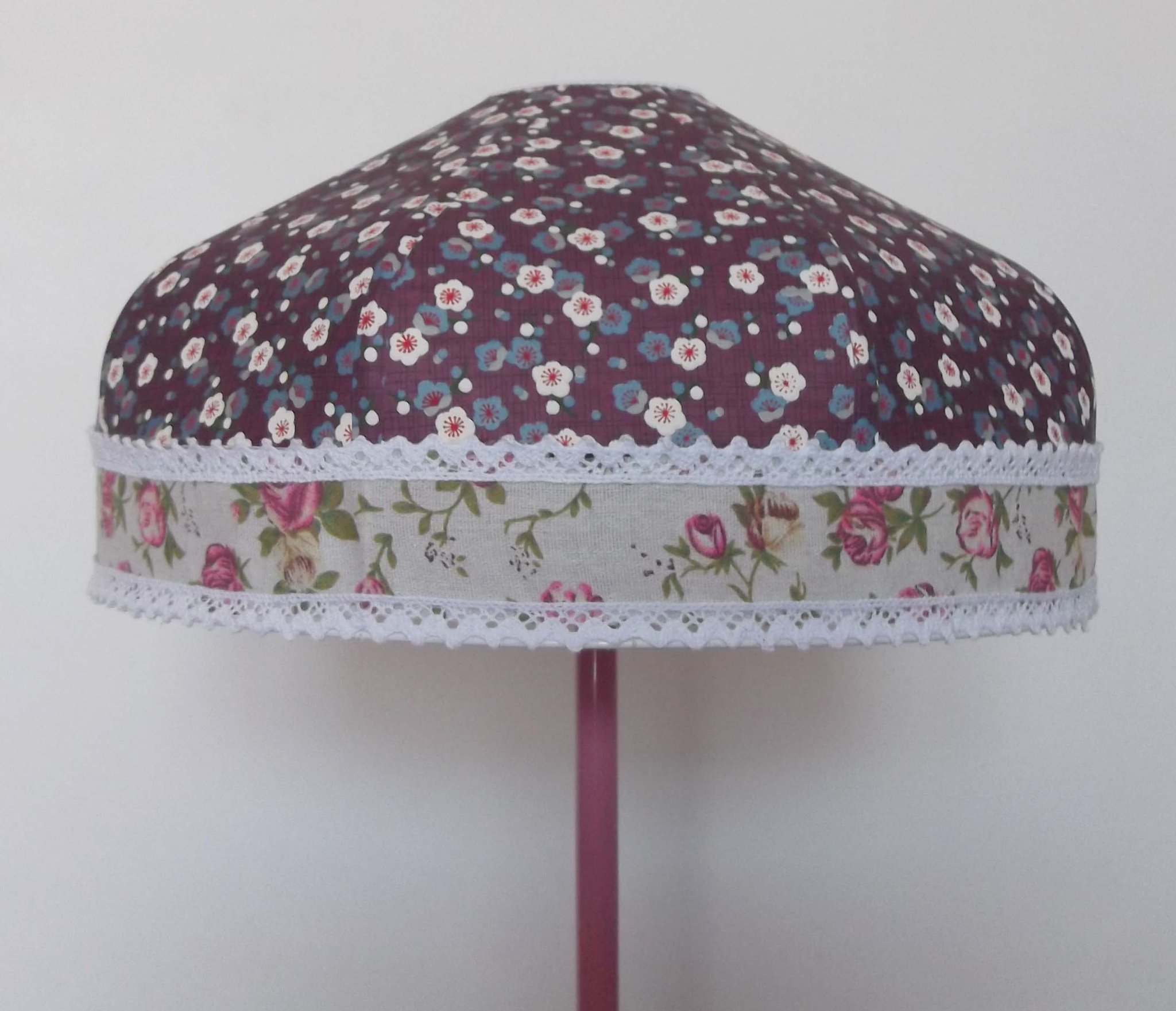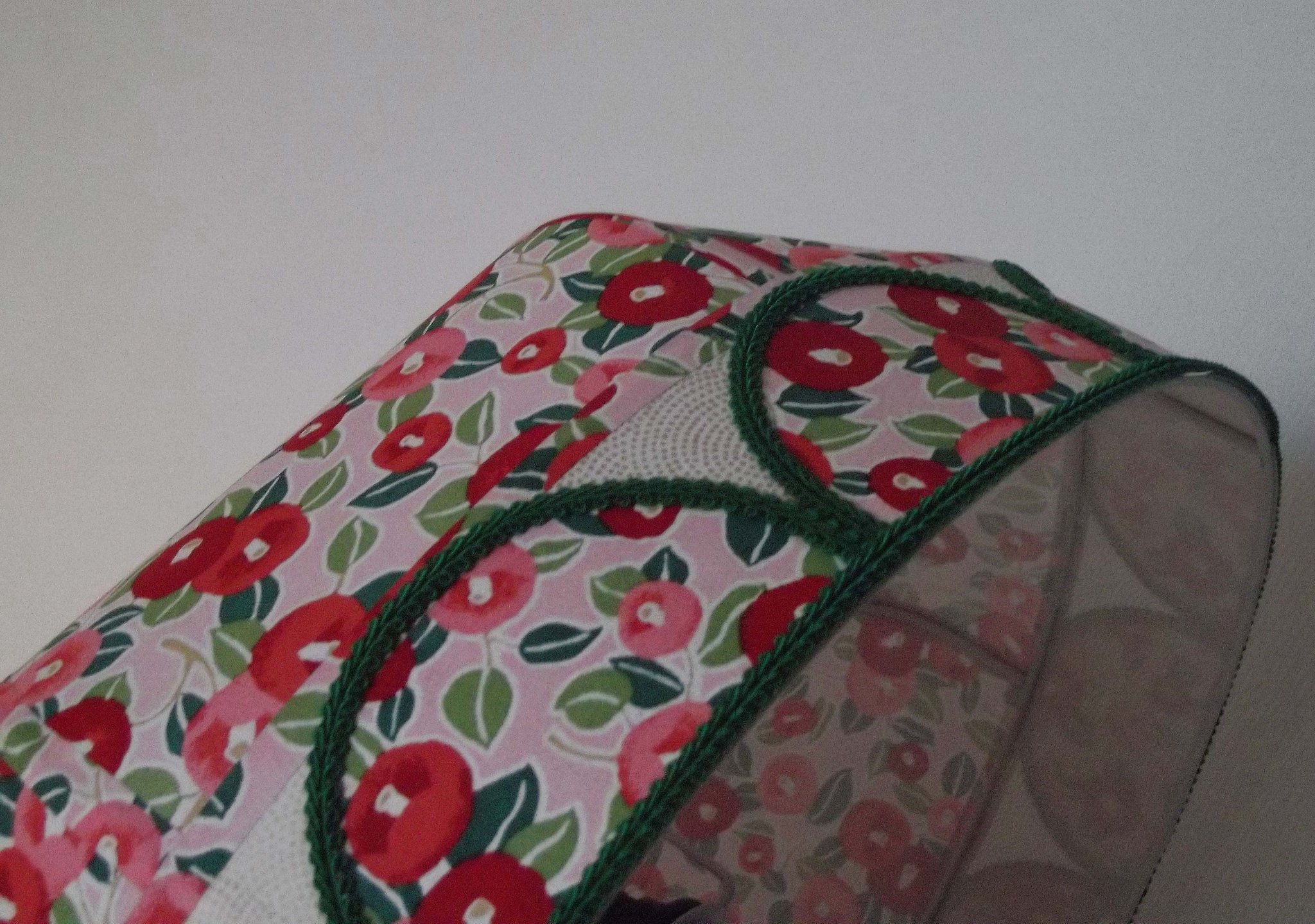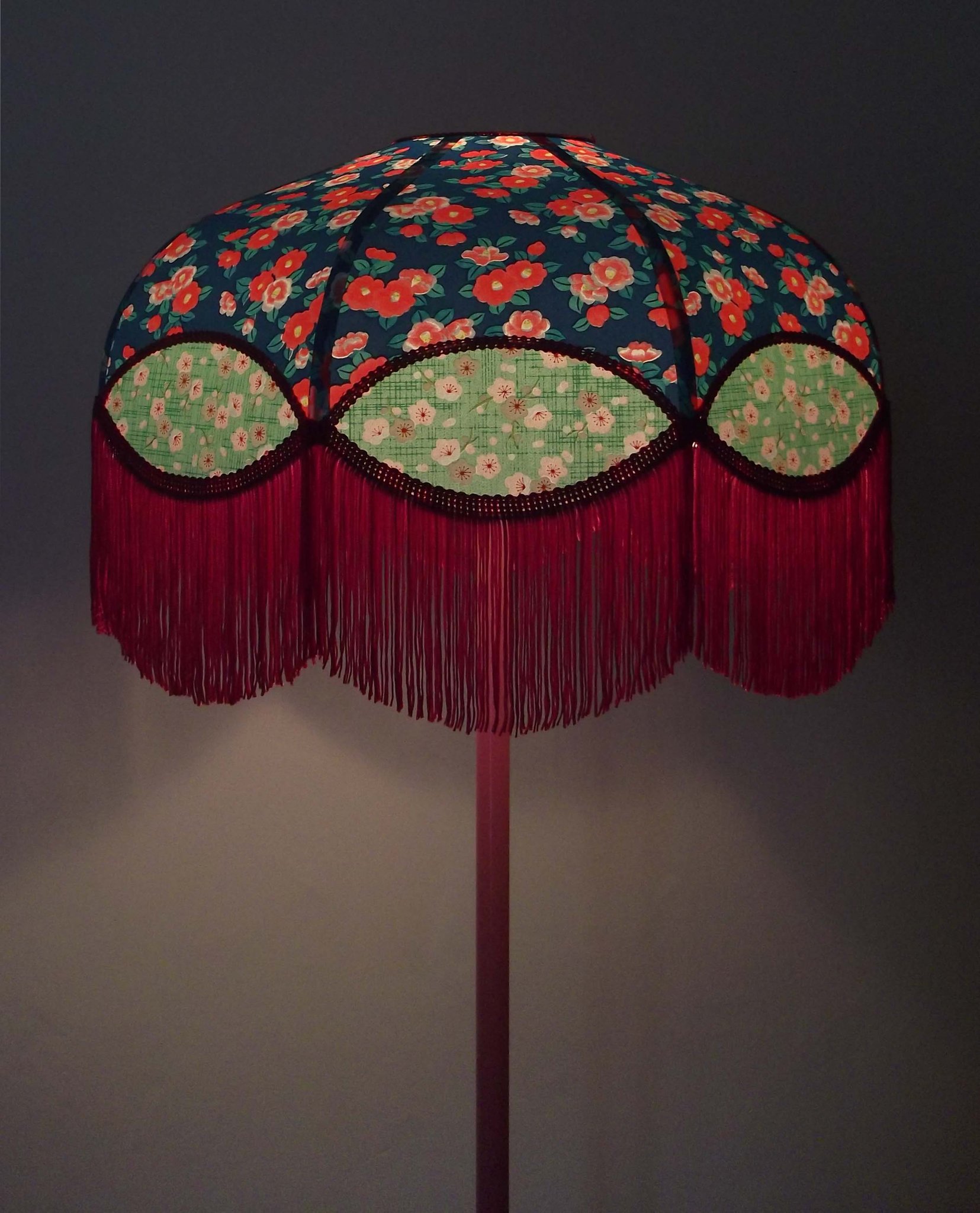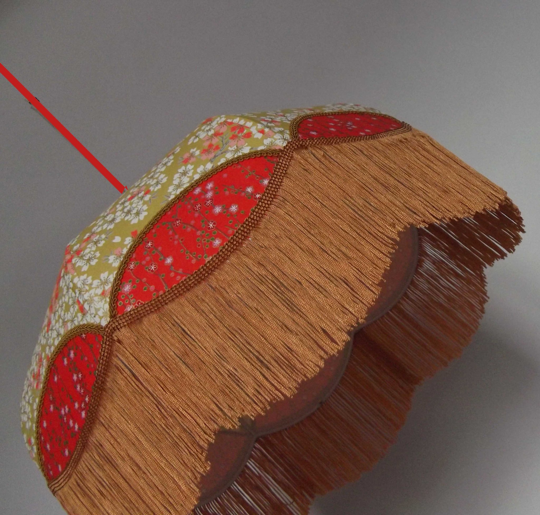 Abat-jour 40 cm de diamètre. Papier japonais petites fleurs rouges et roses sur fond écru. Frange et galon noir. Hauteur 14 cm + 10 cm de frange. Douille E27, 40 w max.
