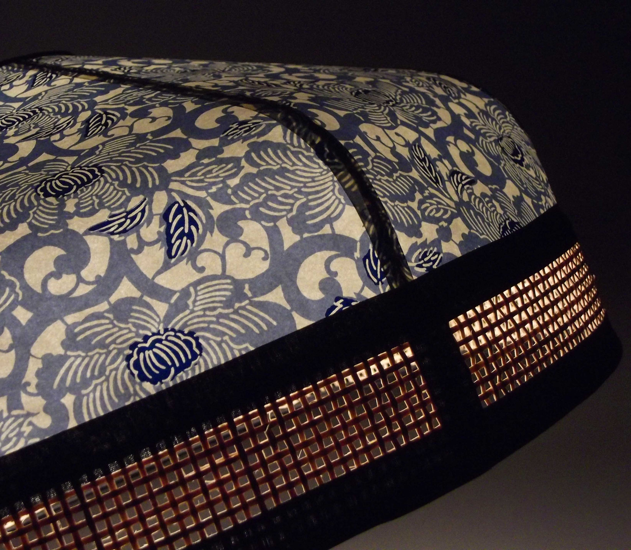Abat-jour ou suspension (à préciser au passage de commande) en papier japonais "grues" sur fond bleu pâle en haut. En