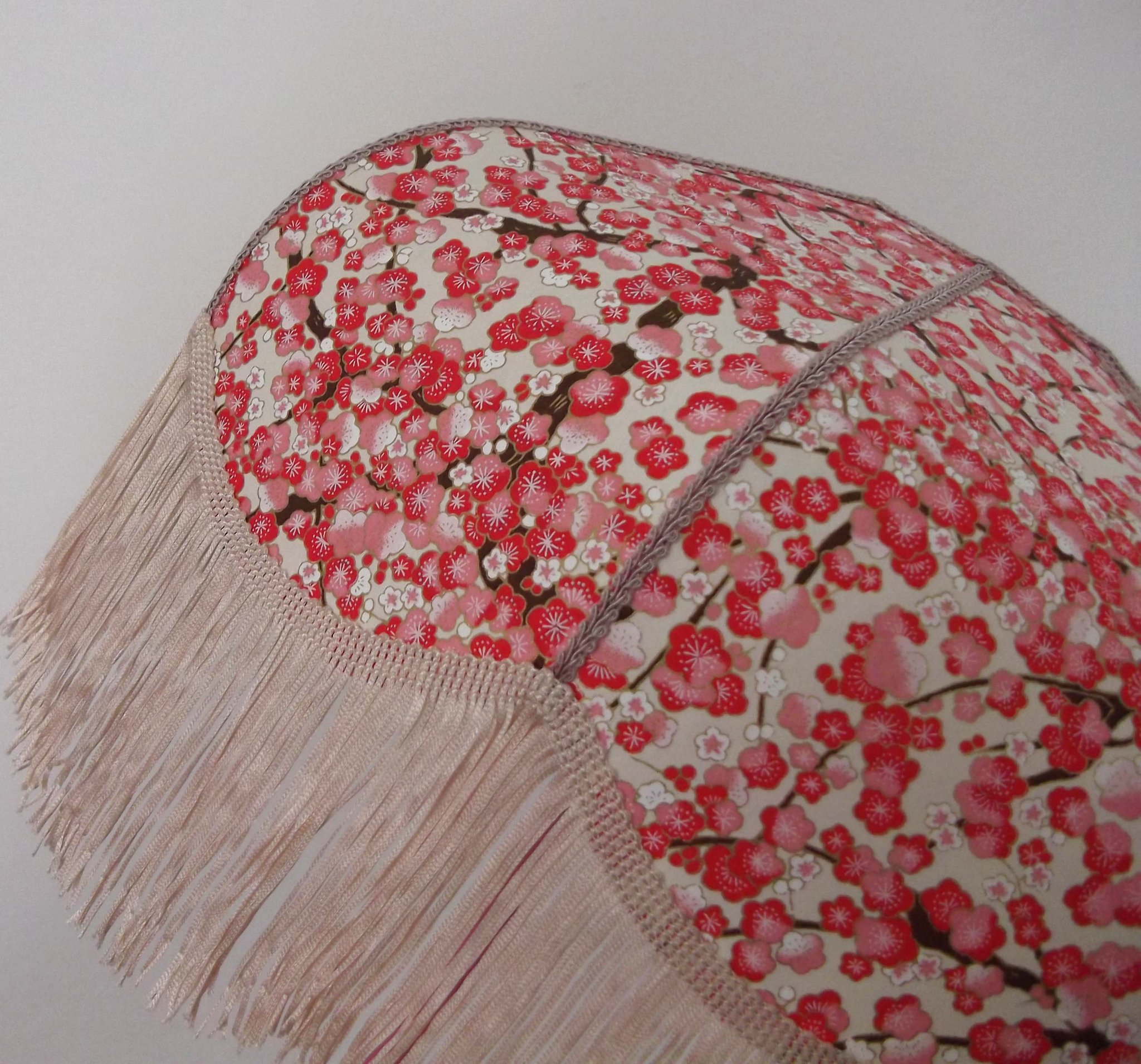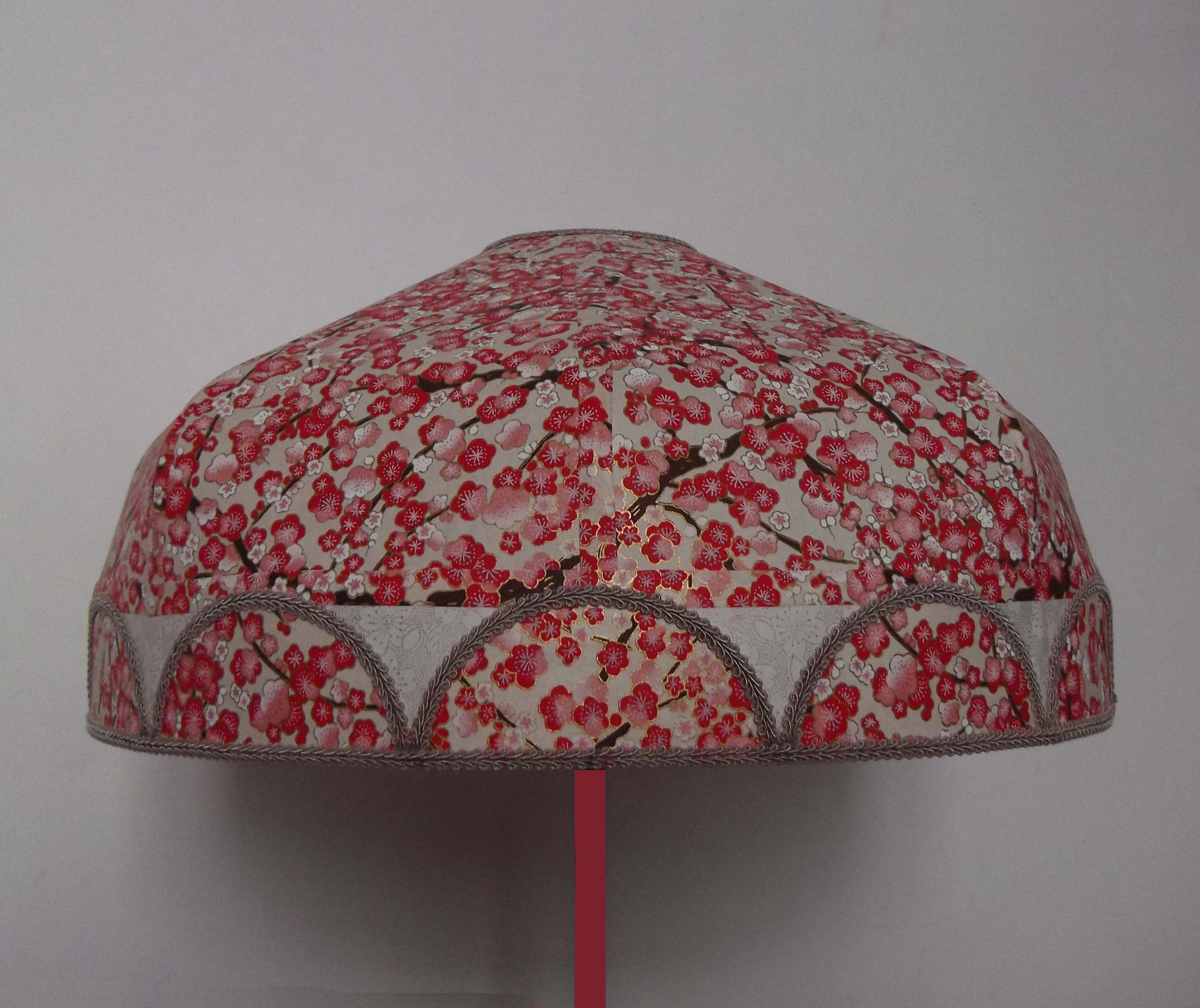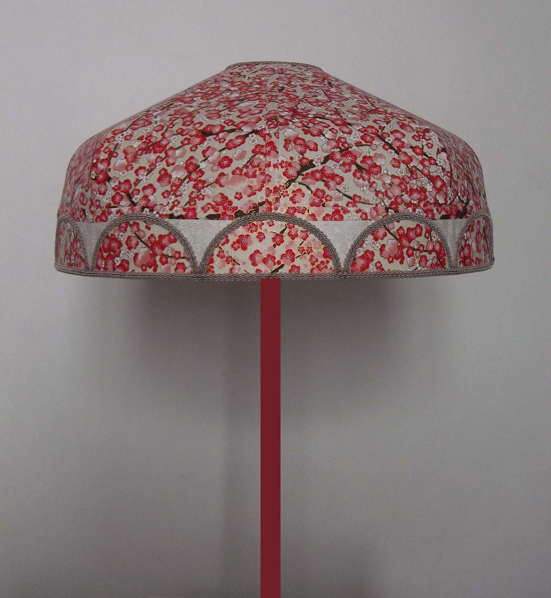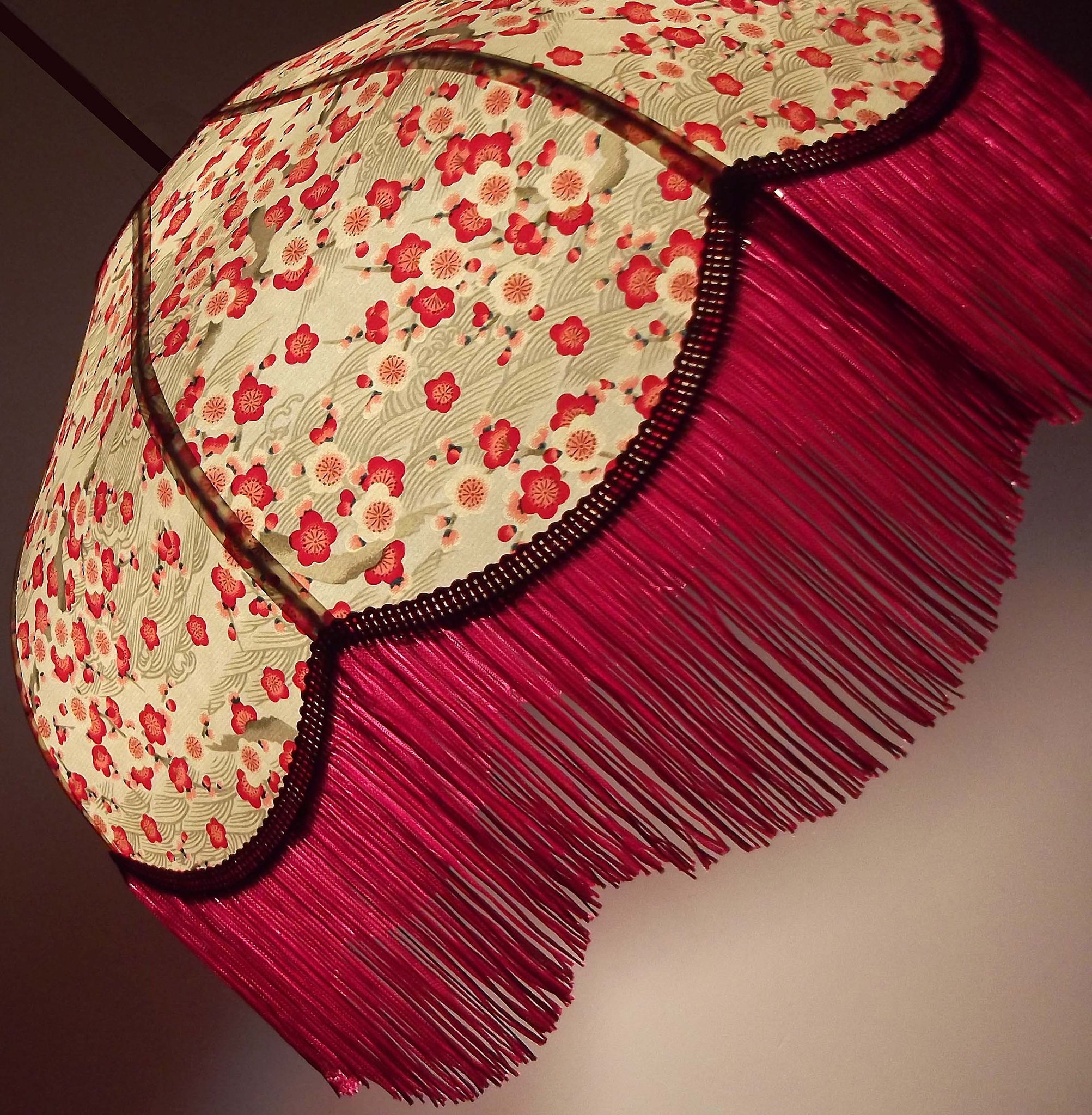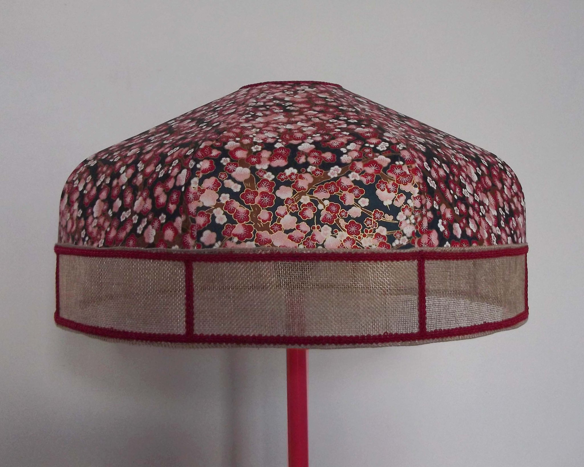 Abat-jour 40 cm de diamètre. Papier japonais fleurs de prunier rouges. Frange beige. Hauteur 16 cm + 10 cm de frange. Douille E27, 40 w max.