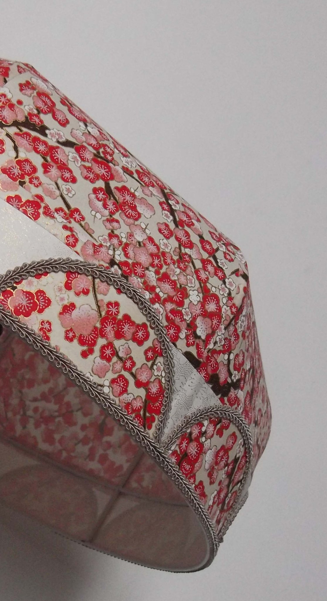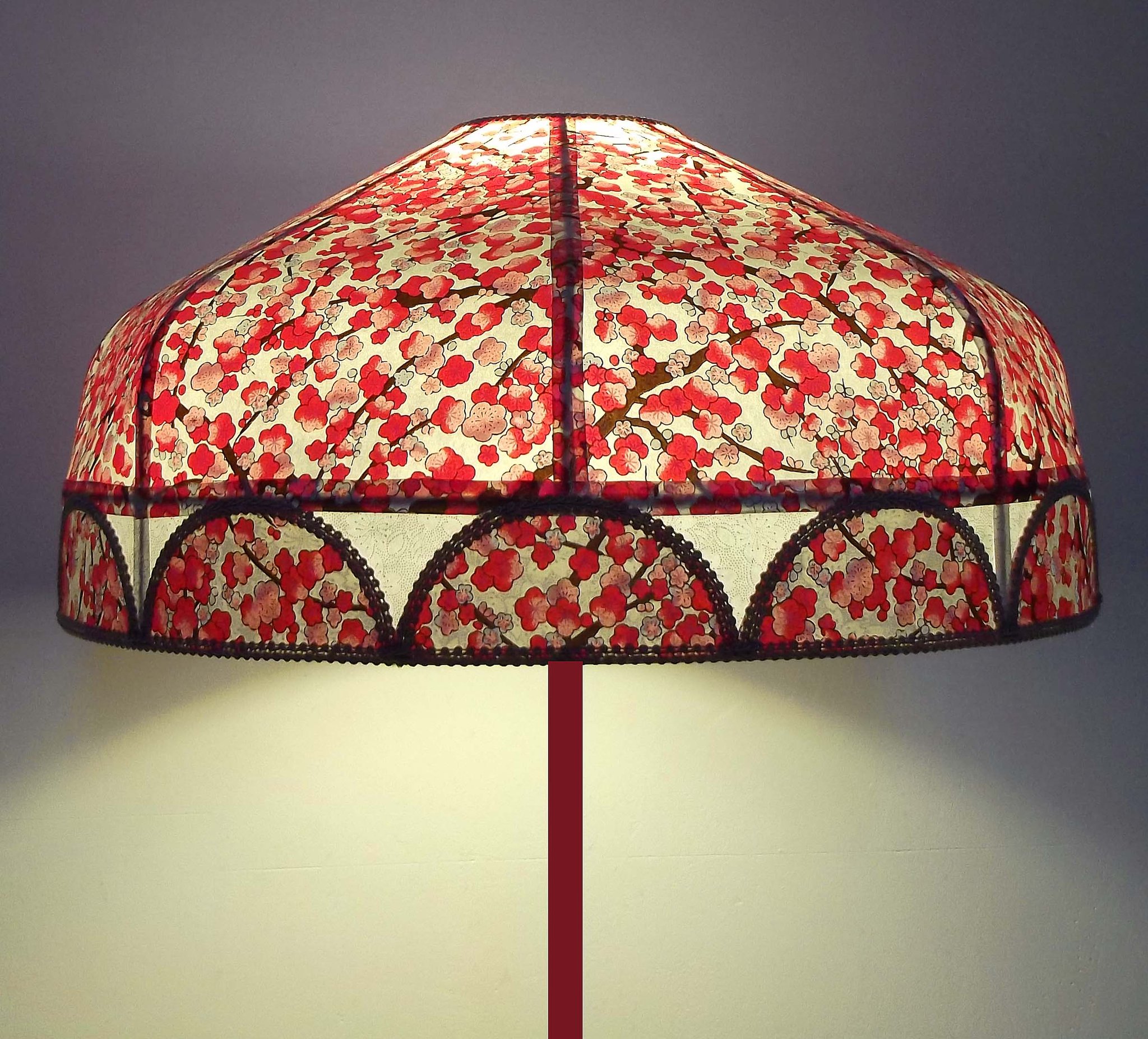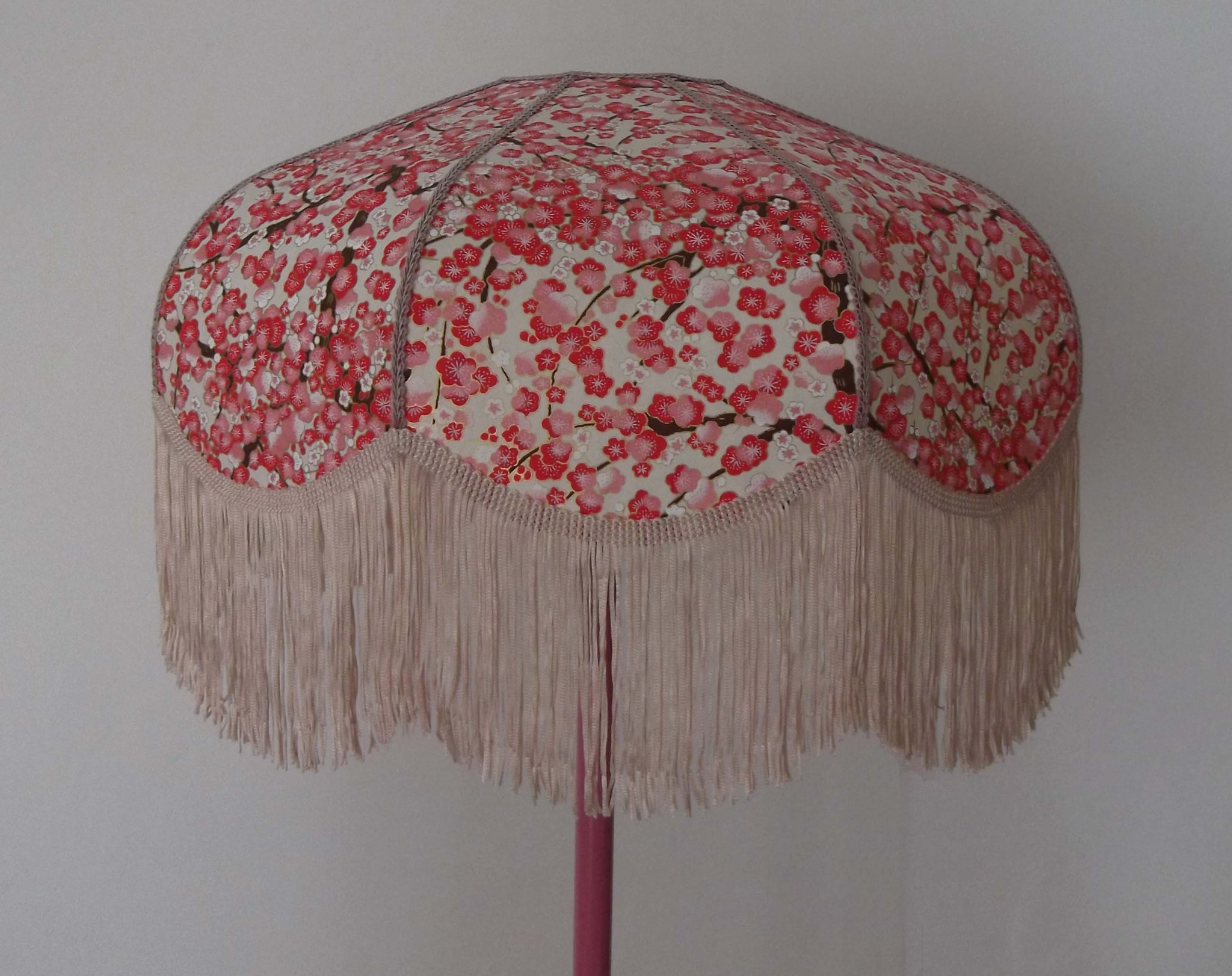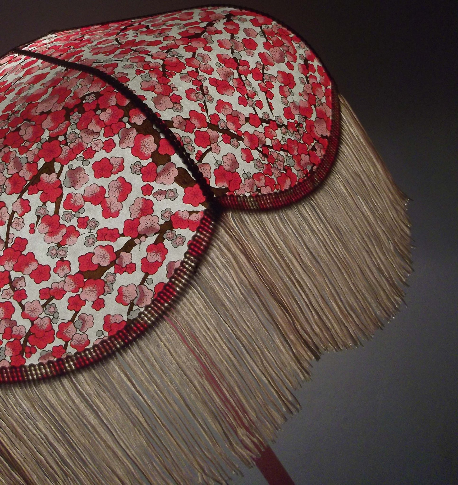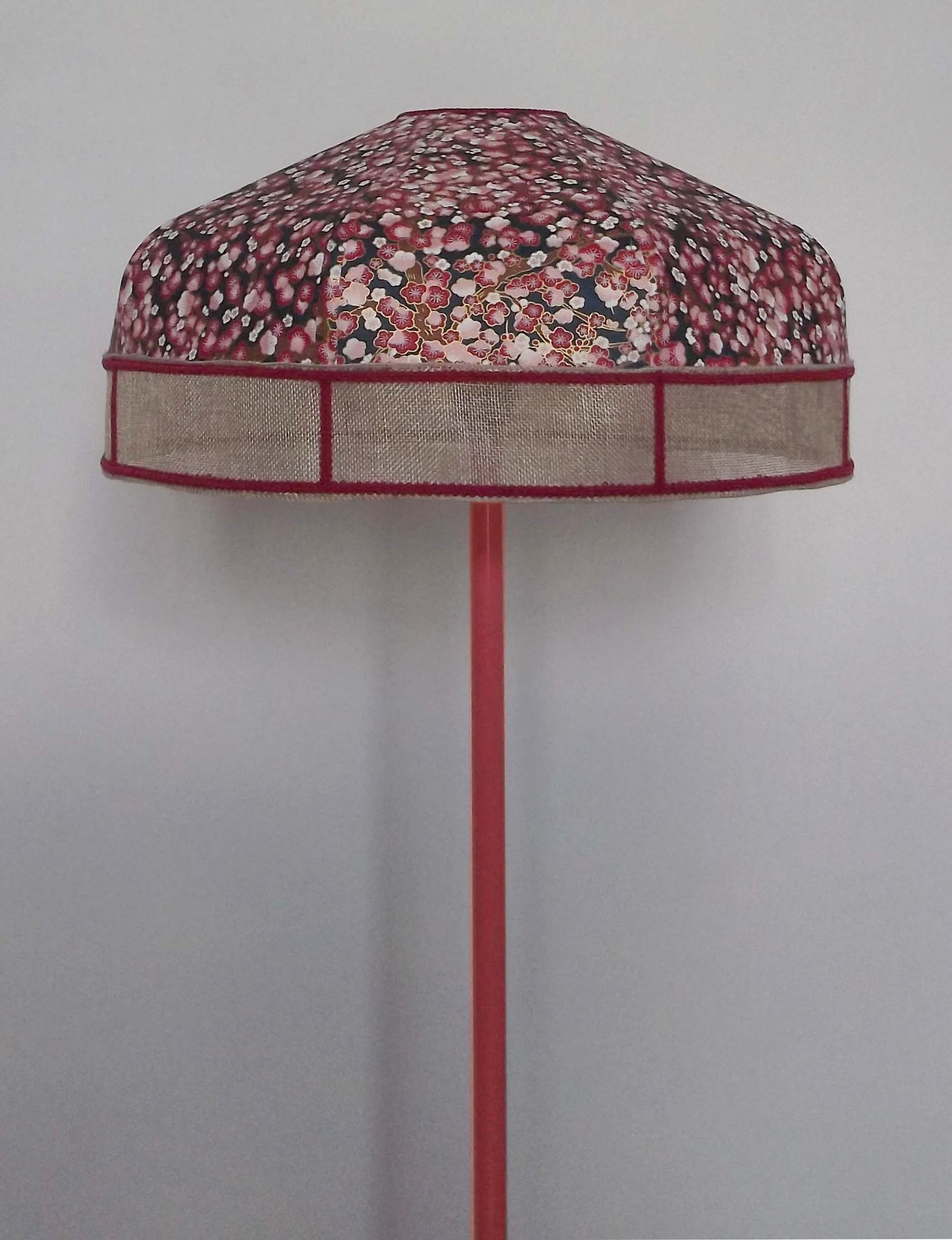 Abat-jour 40 cm de diamètre. Papier japonais fleurs de prunier rouges. Frange beige. Hauteur 16 cm + 10 cm de frange. Douille E27, 40 w max.