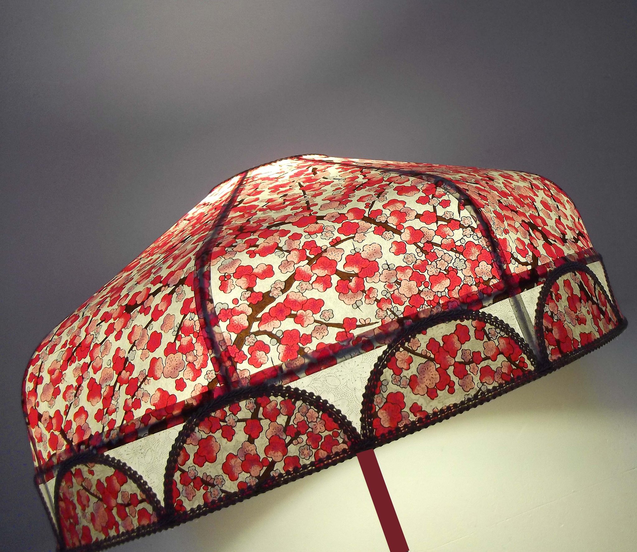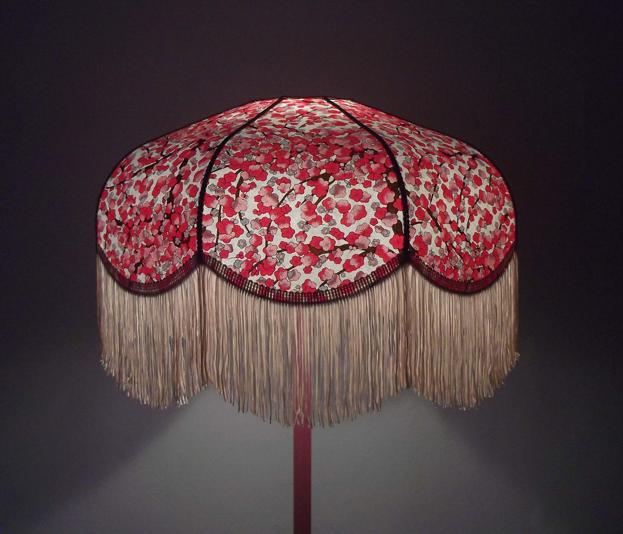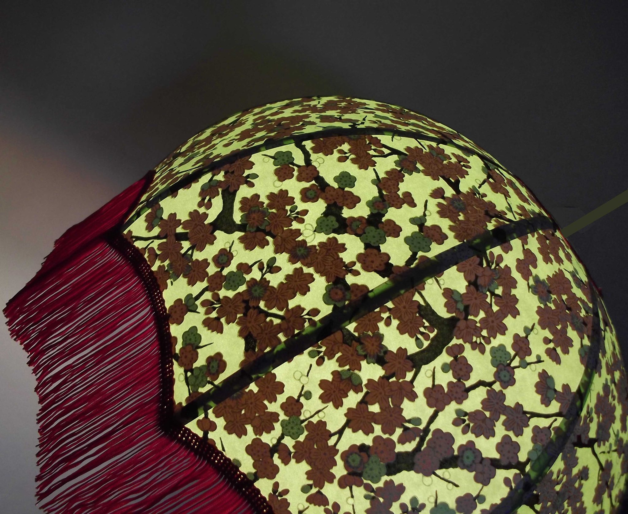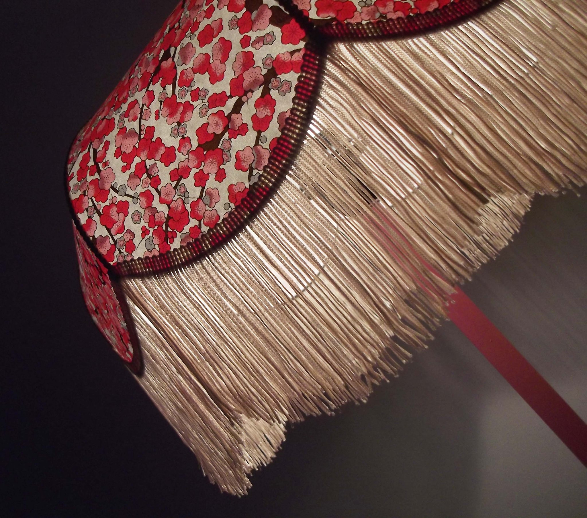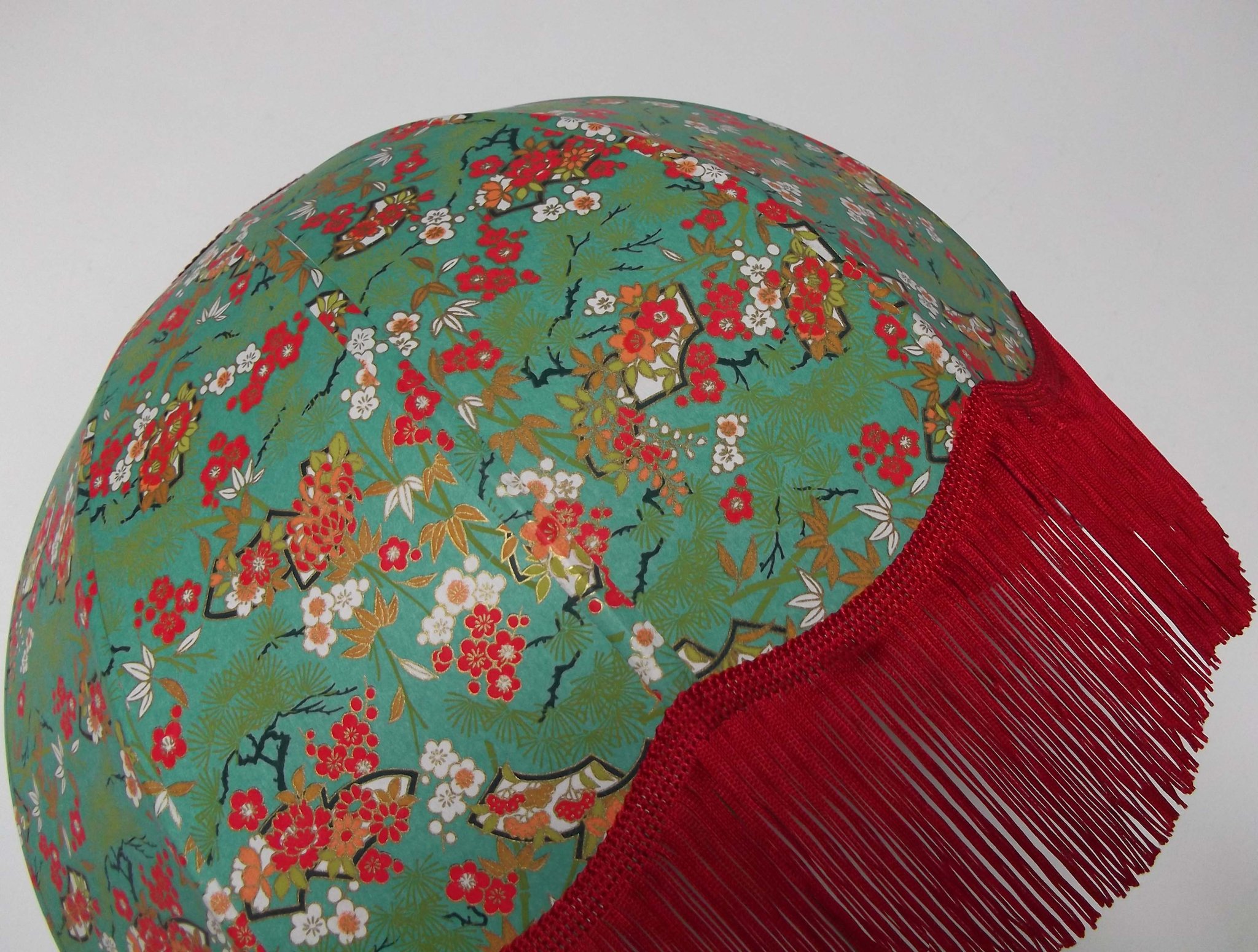 Abat-jour 40 cm de diamètre. Papier japonais fleurs de prunier rouges. Frange beige. Hauteur 16 cm + 10 cm de frange. Douille E27, 40 w max.