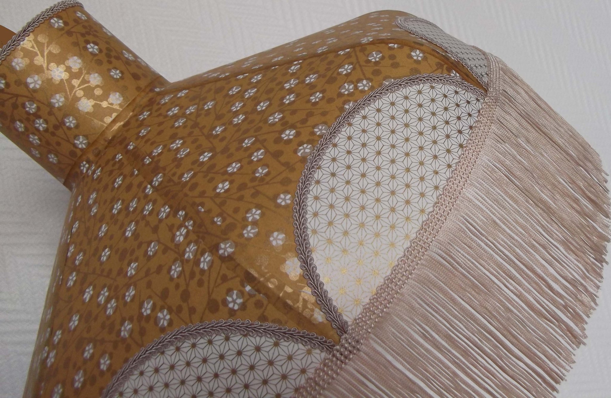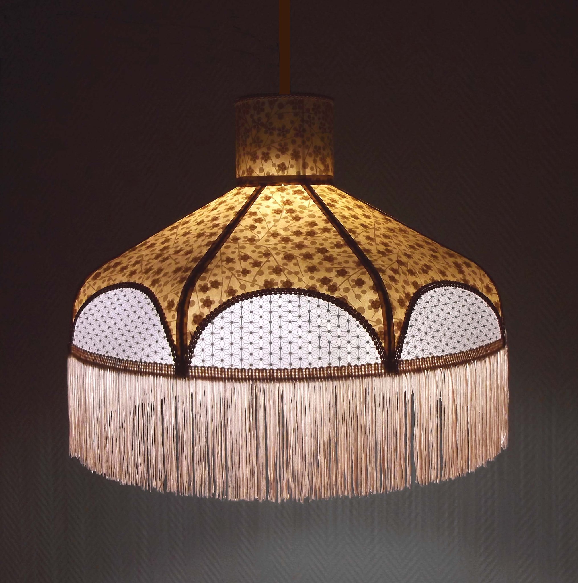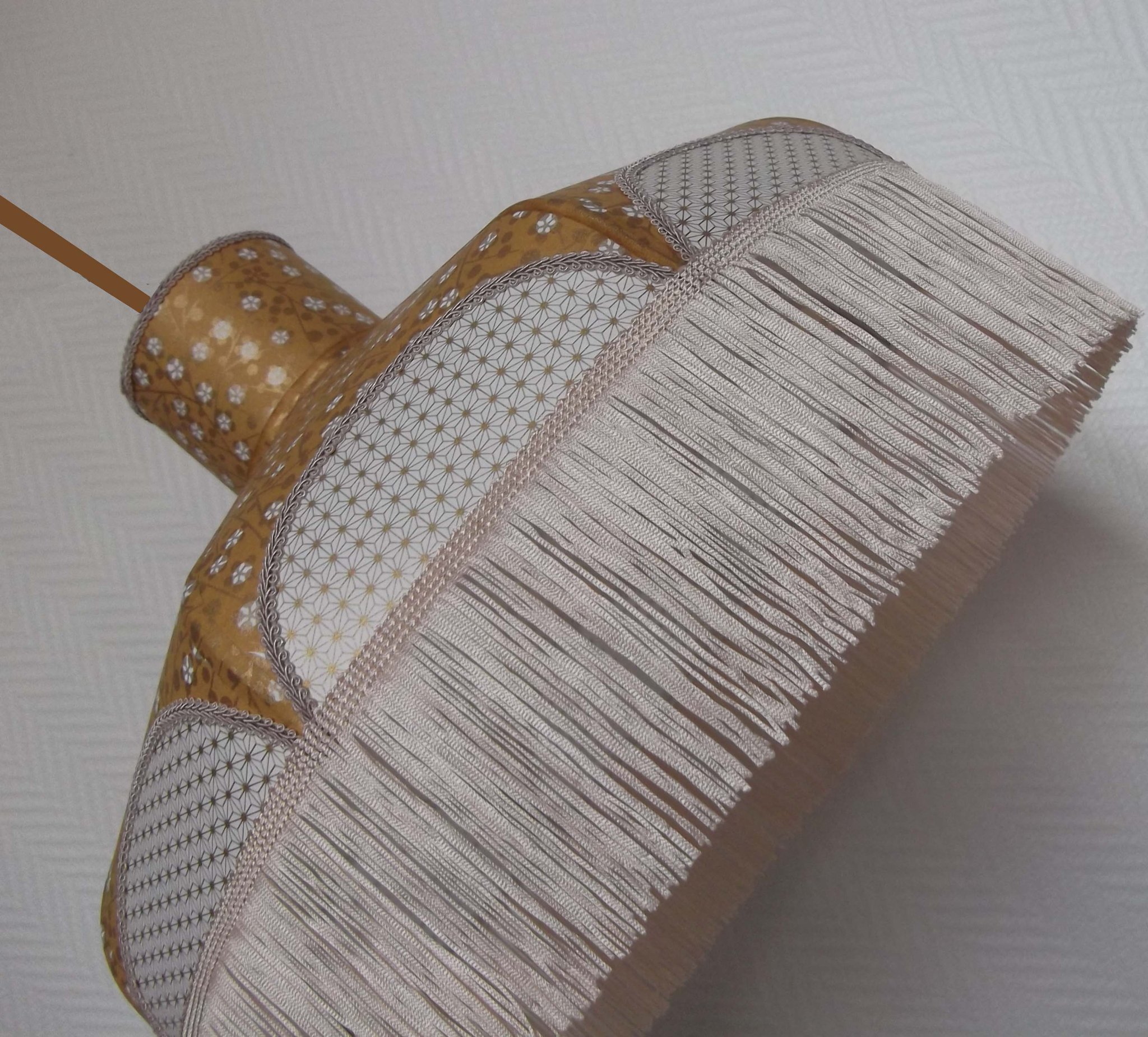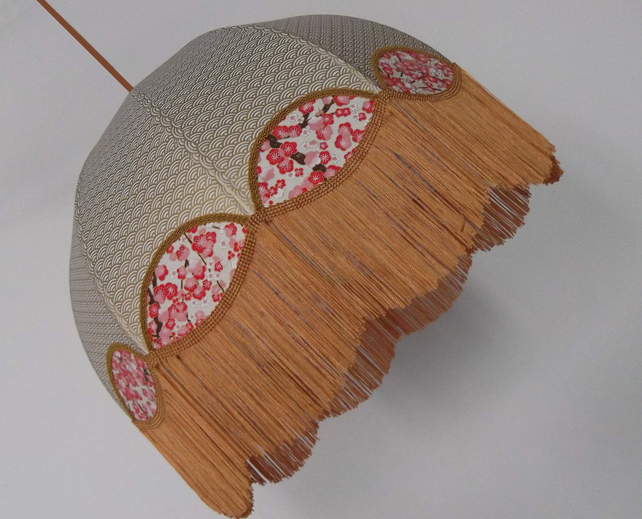 Papier japonais fleurs de cerisier sur fond moutarde en haut et fleurs sur fond orange en bas. Frange dorée. Douille E27, 40 W max.