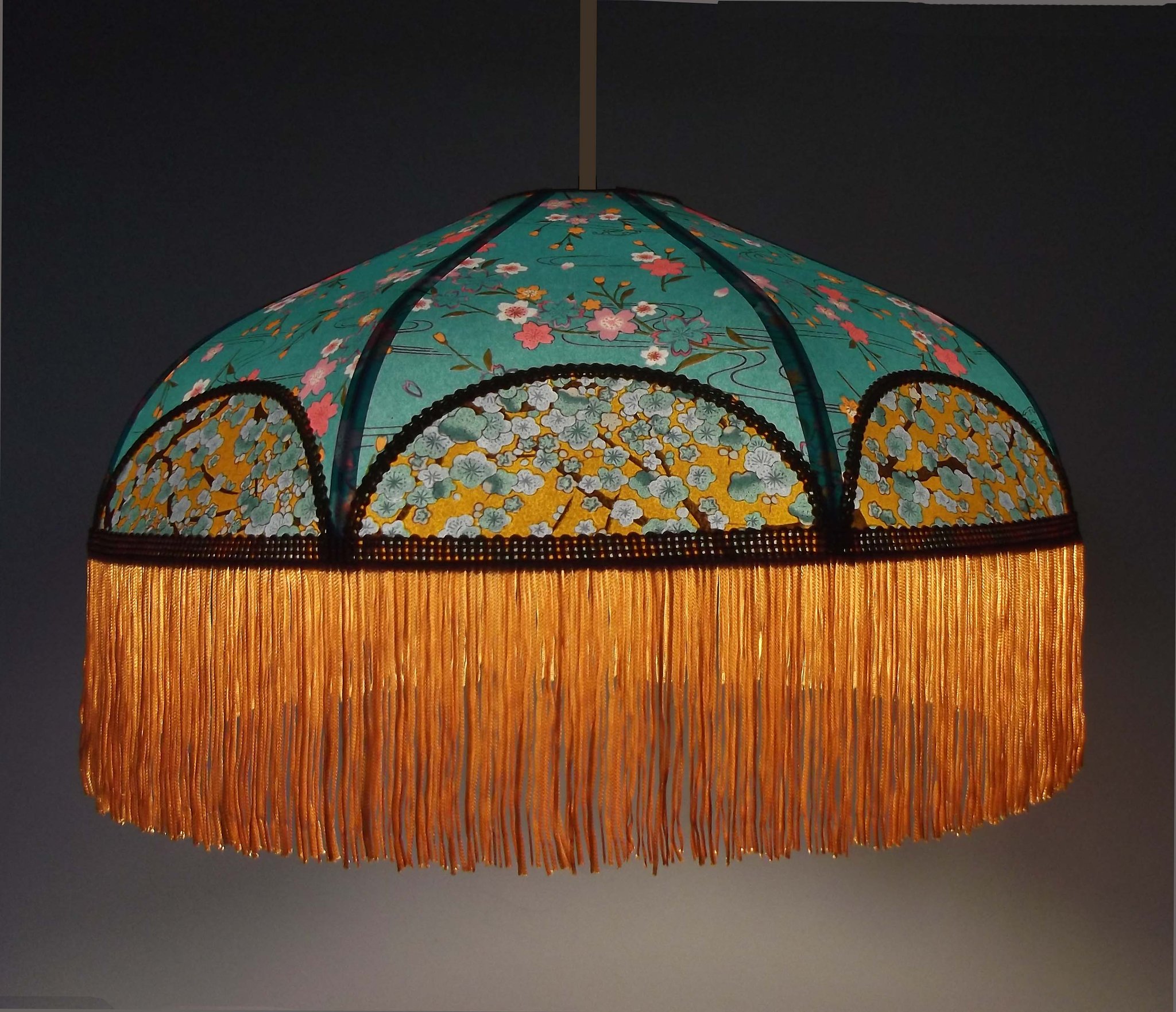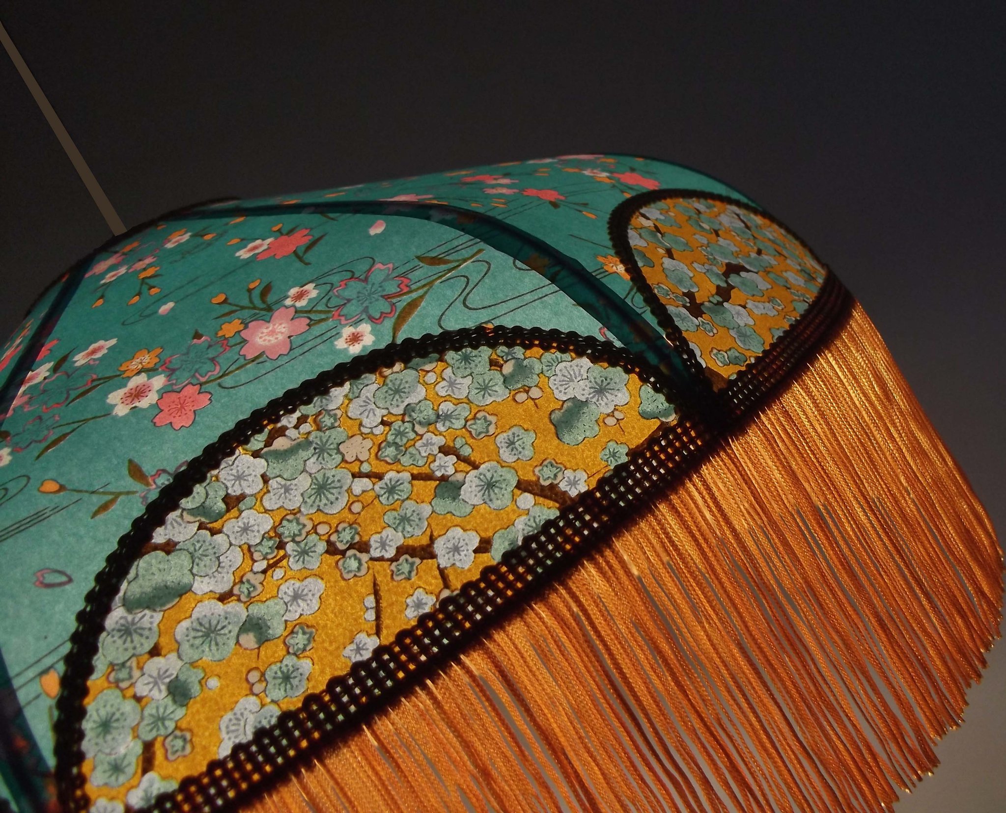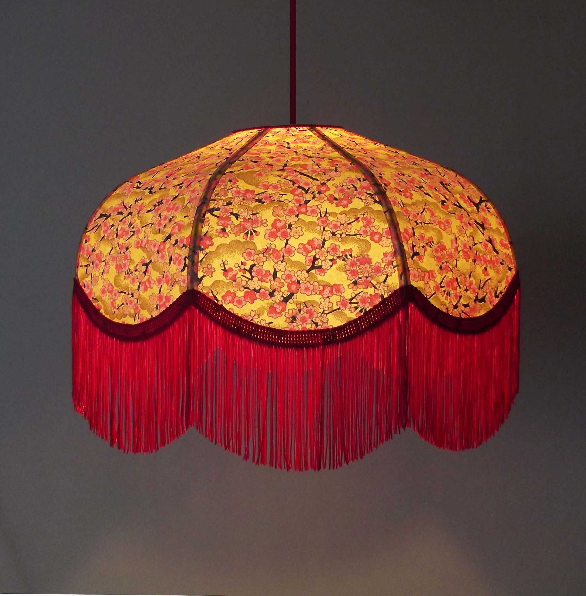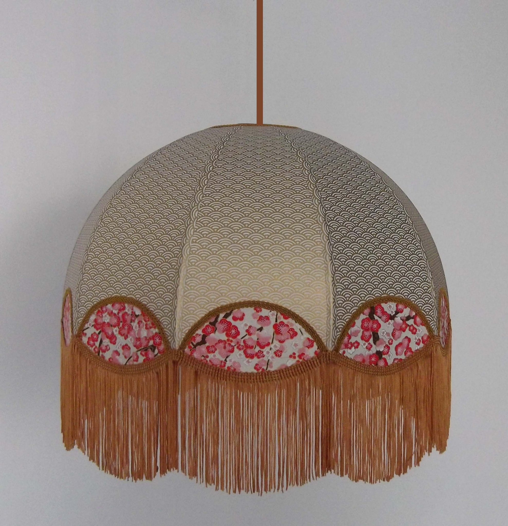 Papier japonais fleurs de cerisier sur fond moutarde en haut et fleurs sur fond orange en bas. Frange dorée. Douille E27, 40 W max.