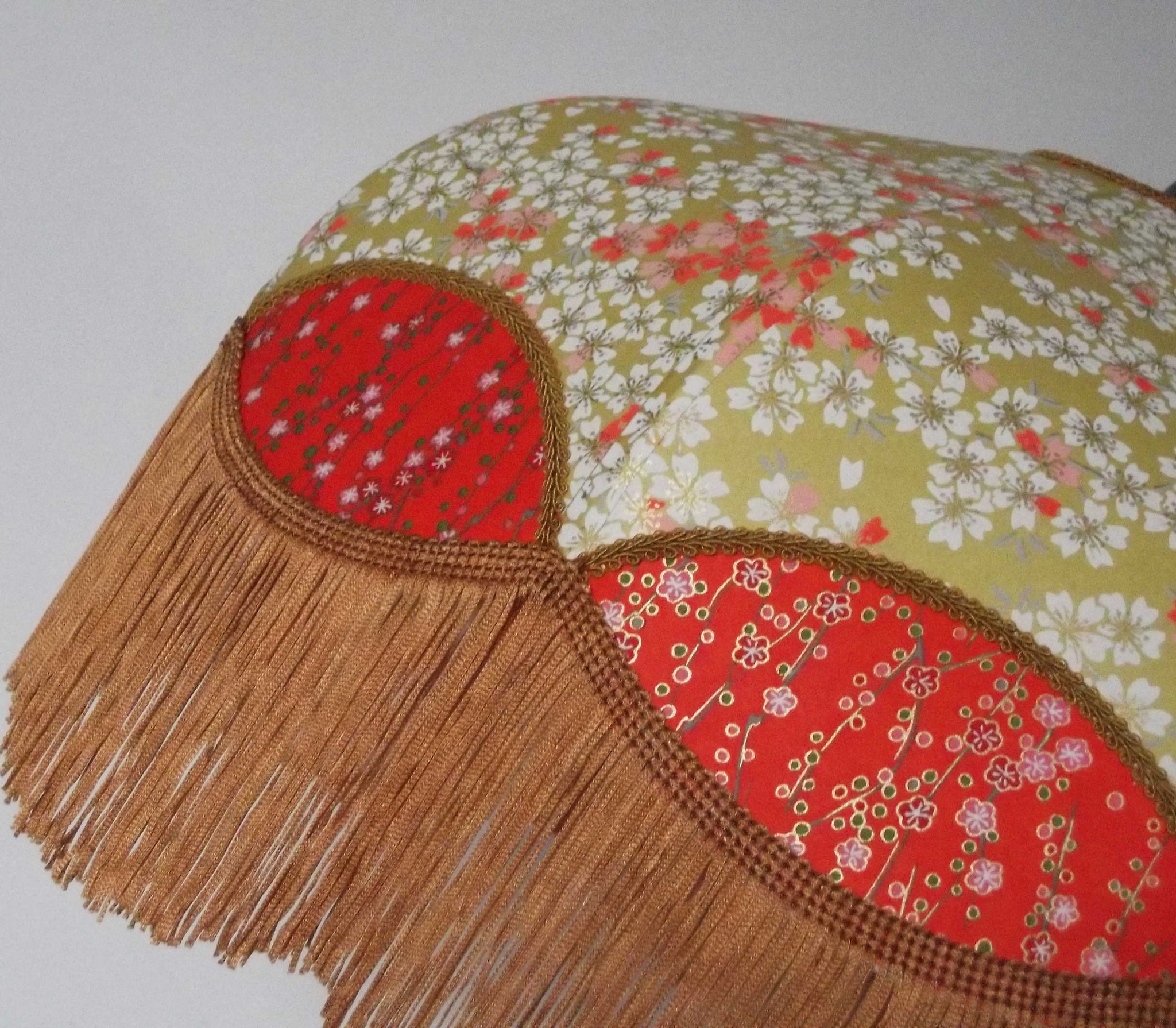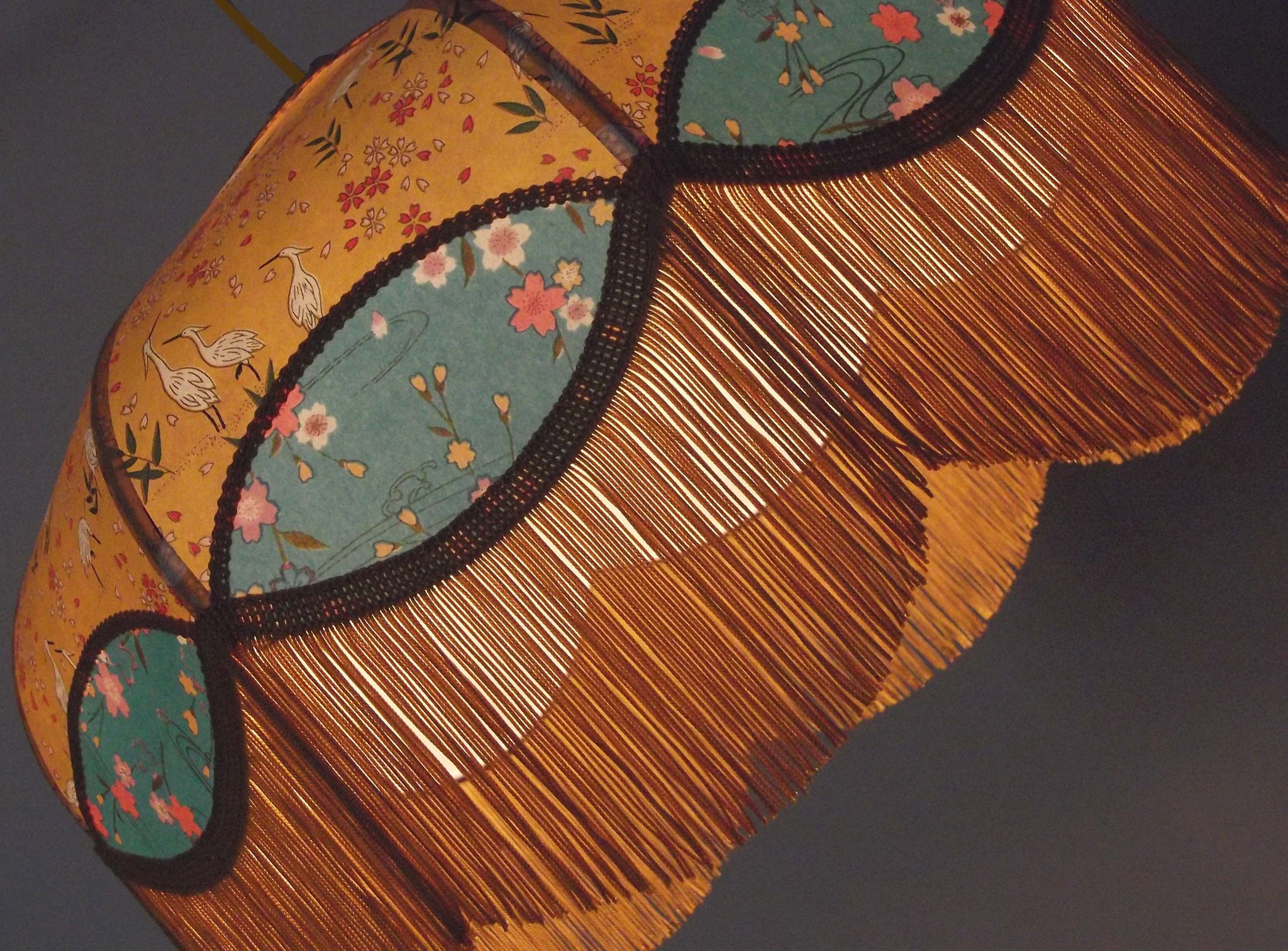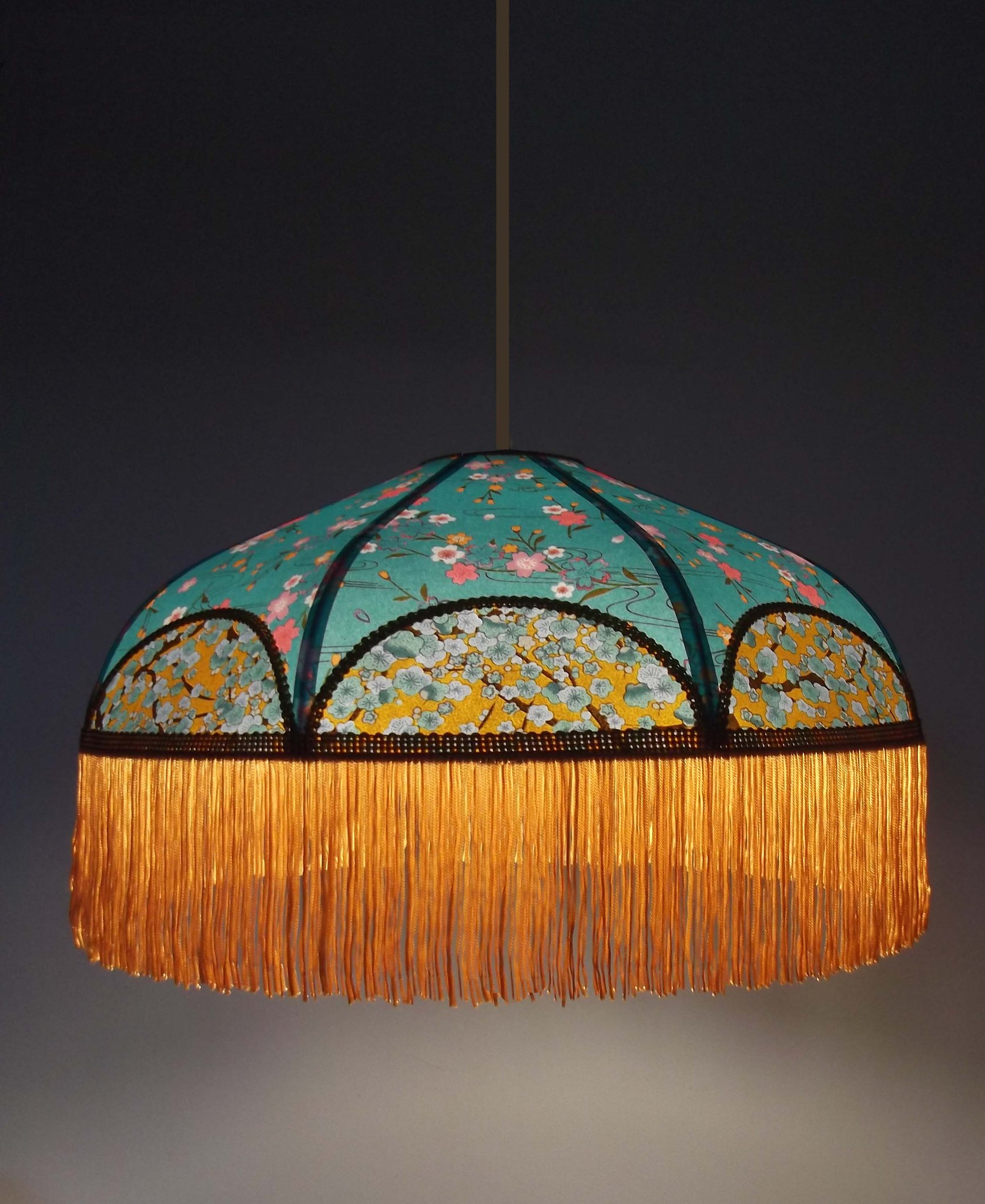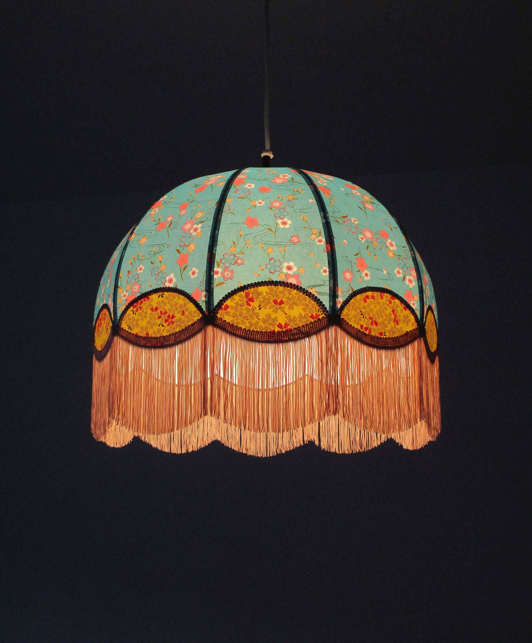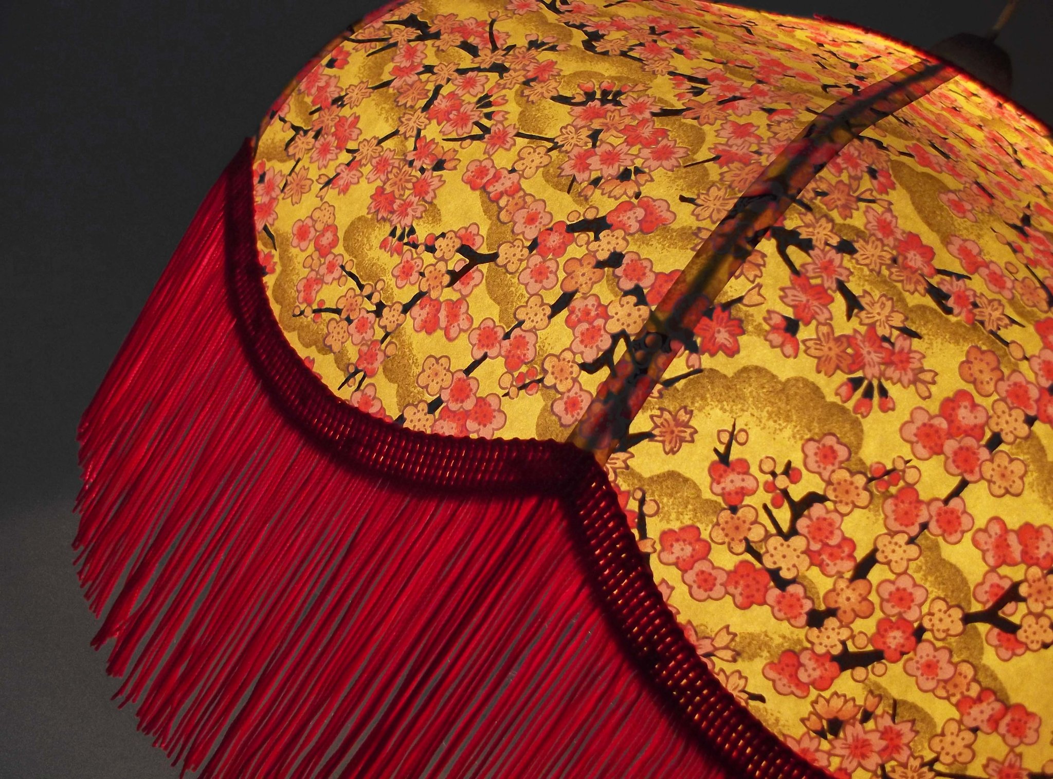 Papier japonais fleurs de cerisier sur fond moutarde en haut et fleurs sur fond orange en bas. Frange dorée. Douille E27, 40 W max.