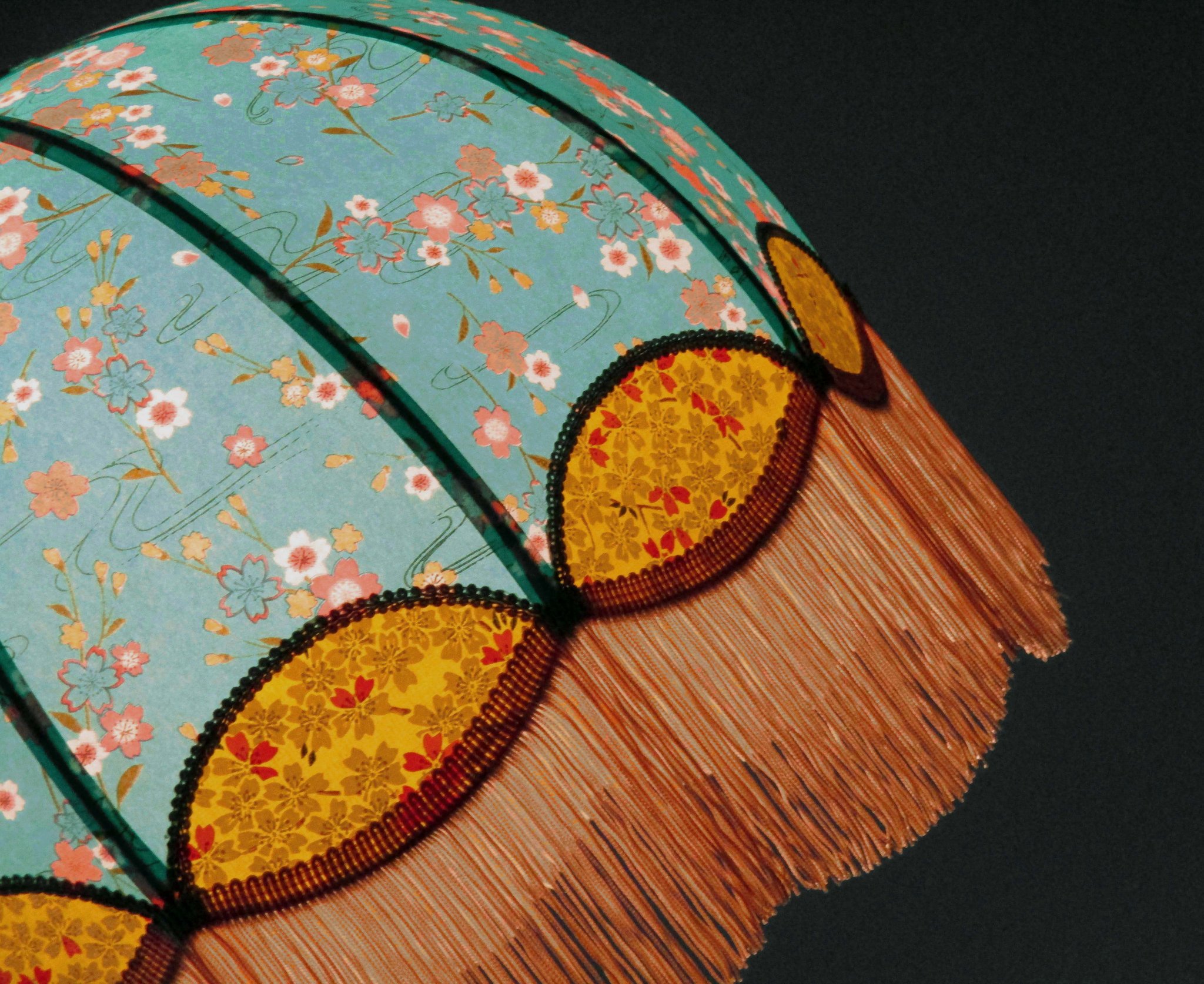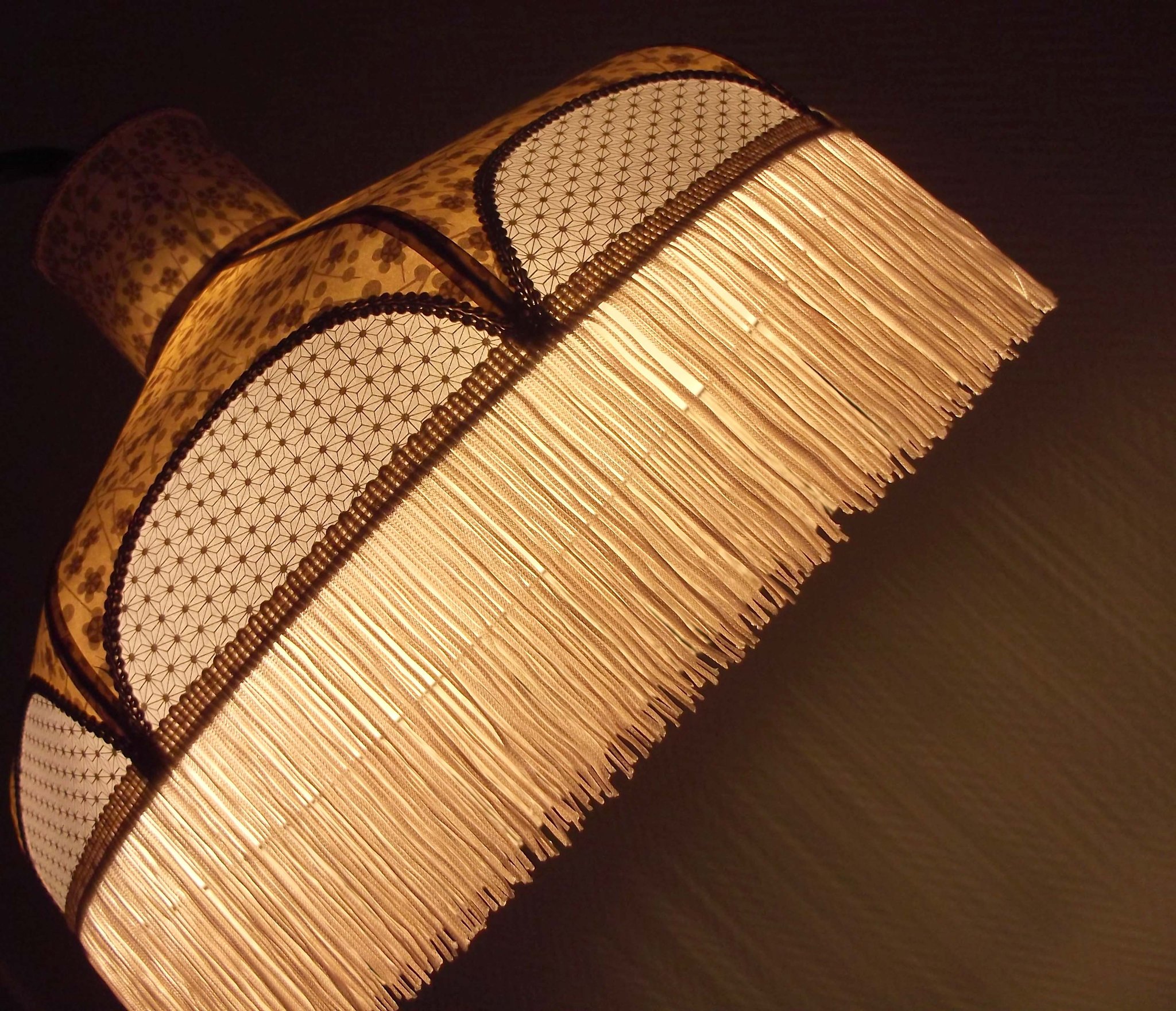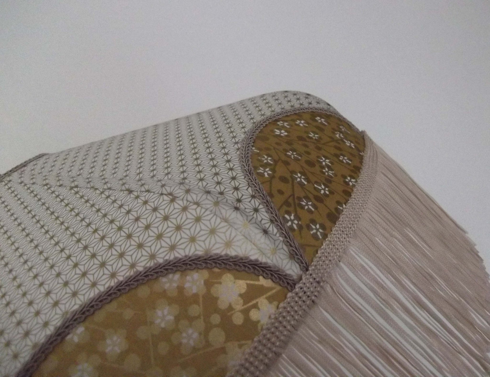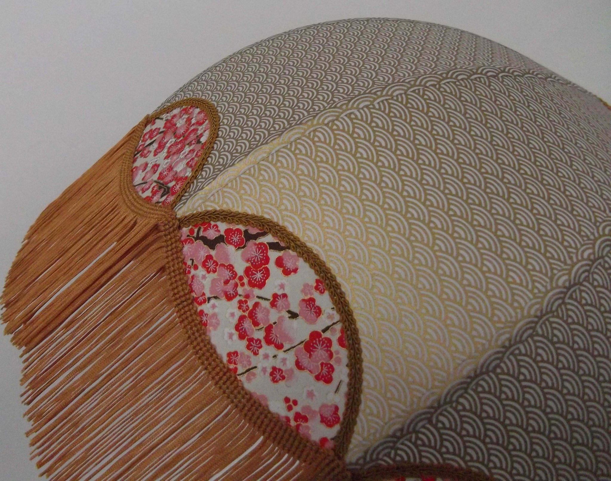 Papier japonais fleurs de cerisier sur fond moutarde en haut et fleurs sur fond orange en bas. Frange dorée. Douille E27, 40 W max.