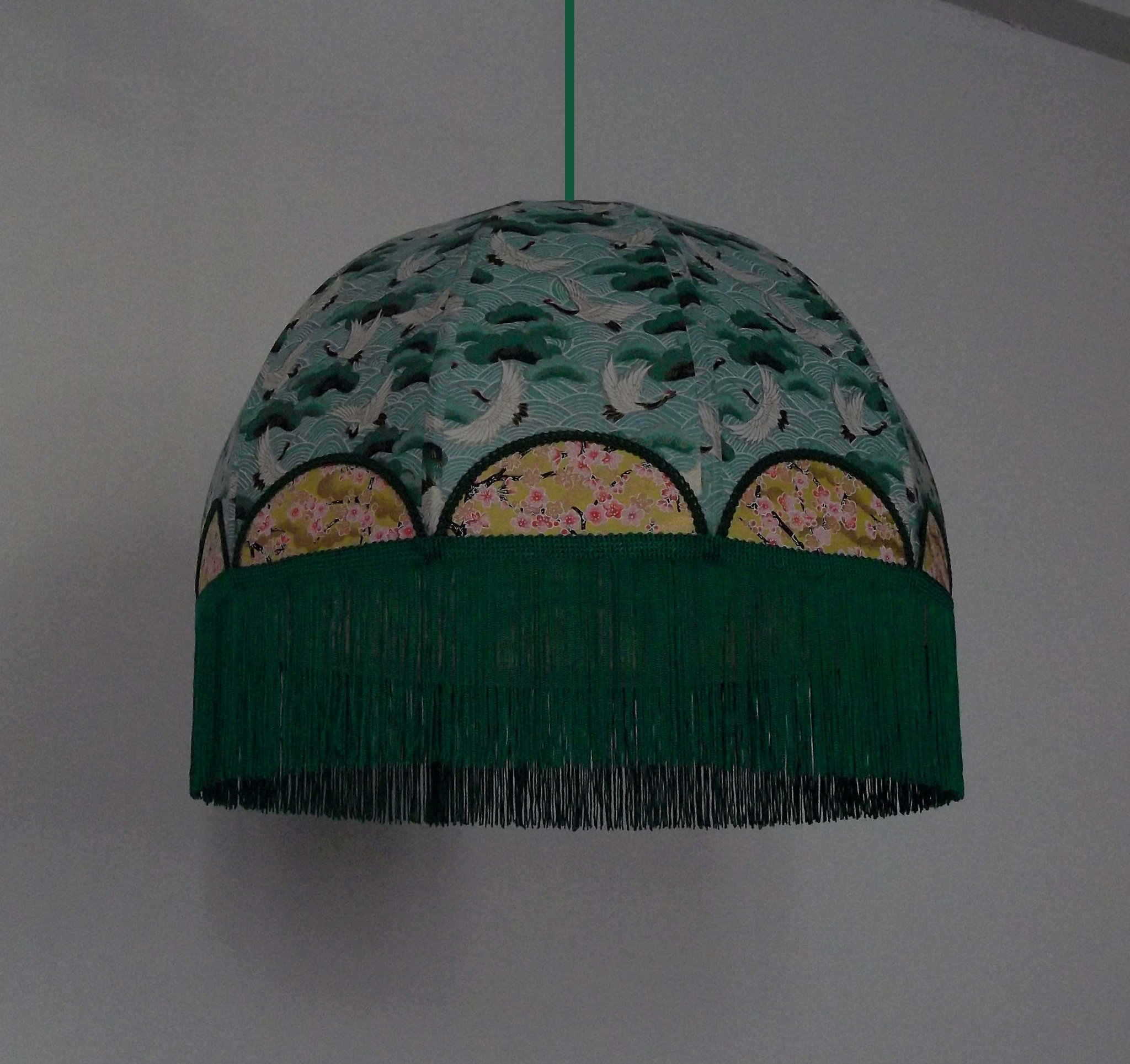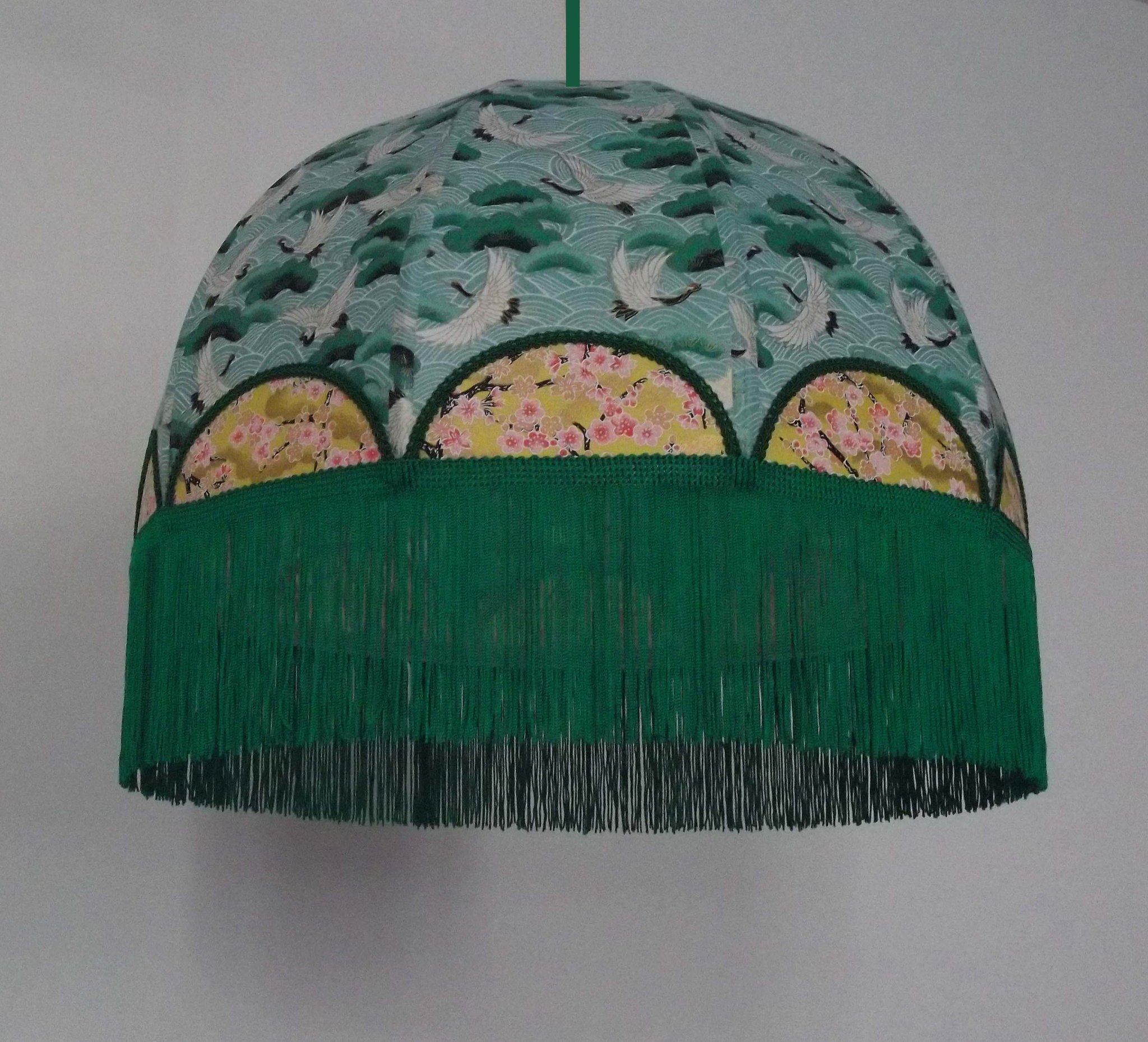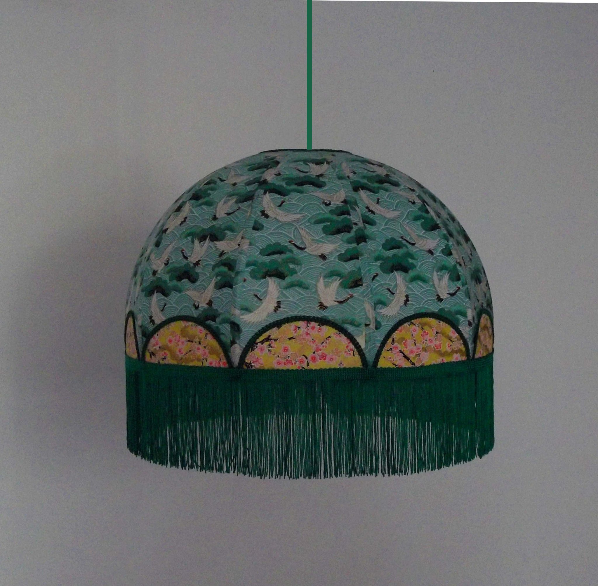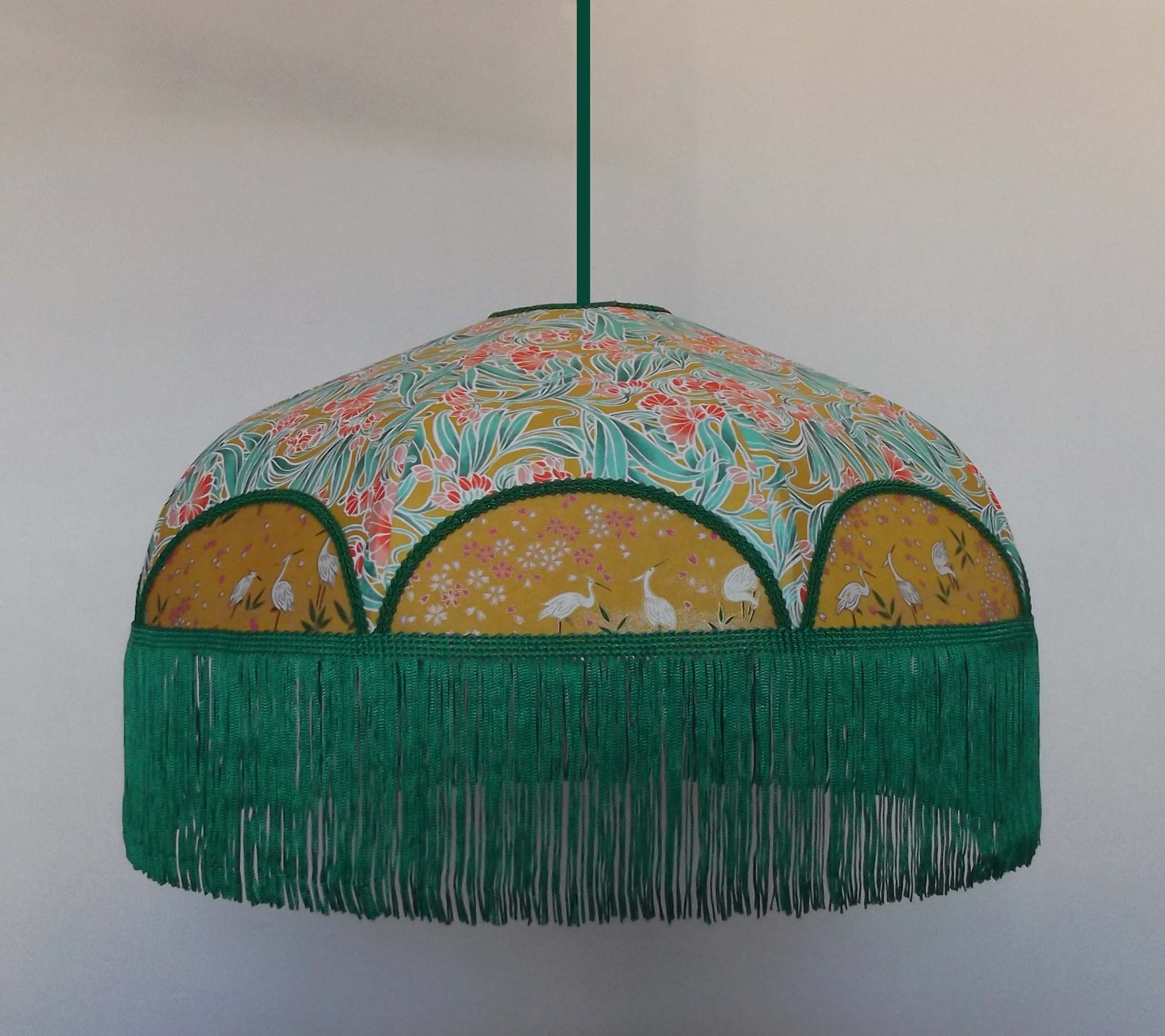 Abat-jour en papier japonais fleurs sur fond moutarde en haut et grues sur fond vert en bas. Frange verte. Forme dôme. Diamètre 40 cm, hauteur 23 cm + 10 cm de frange. Douille E27, 40 w max.