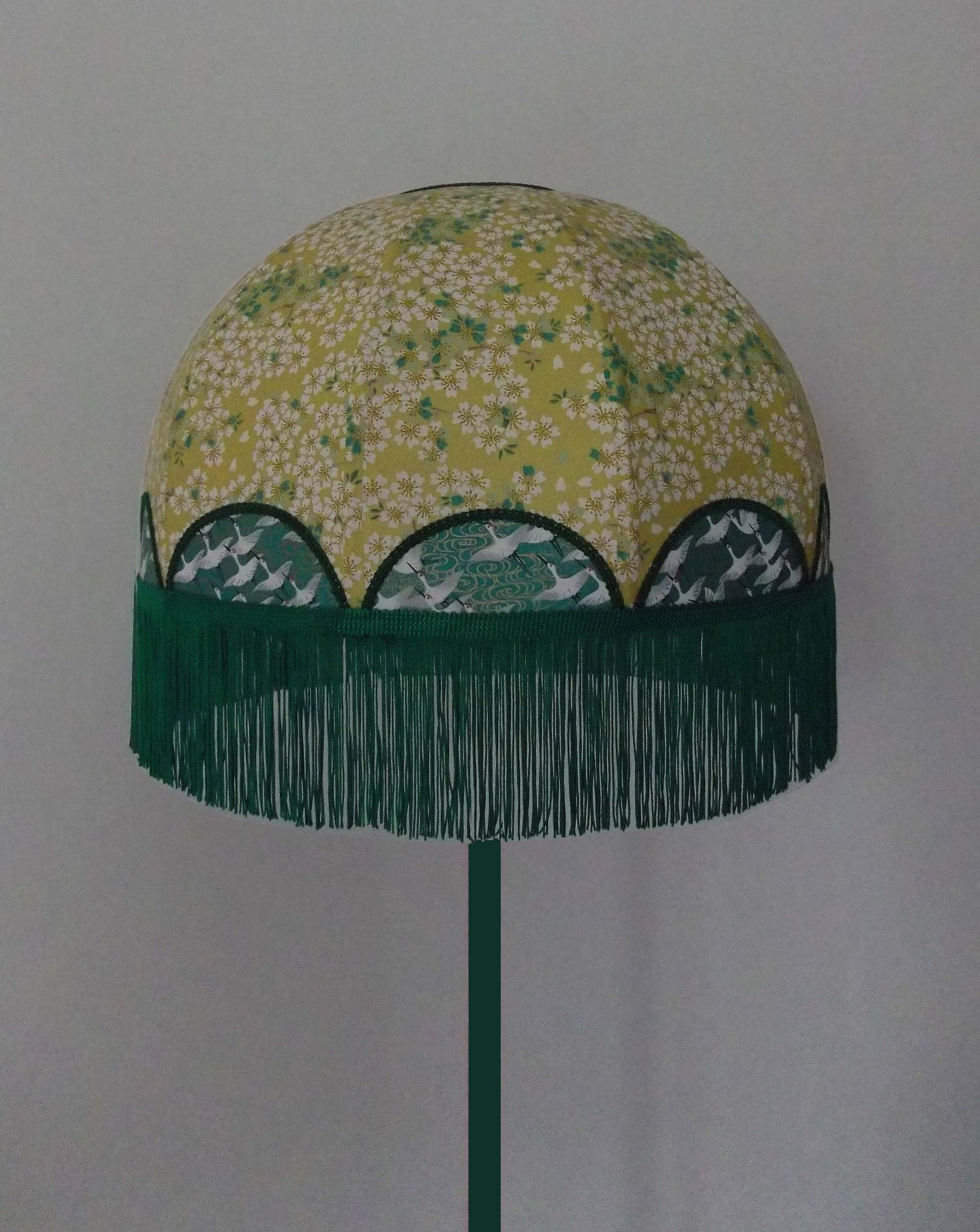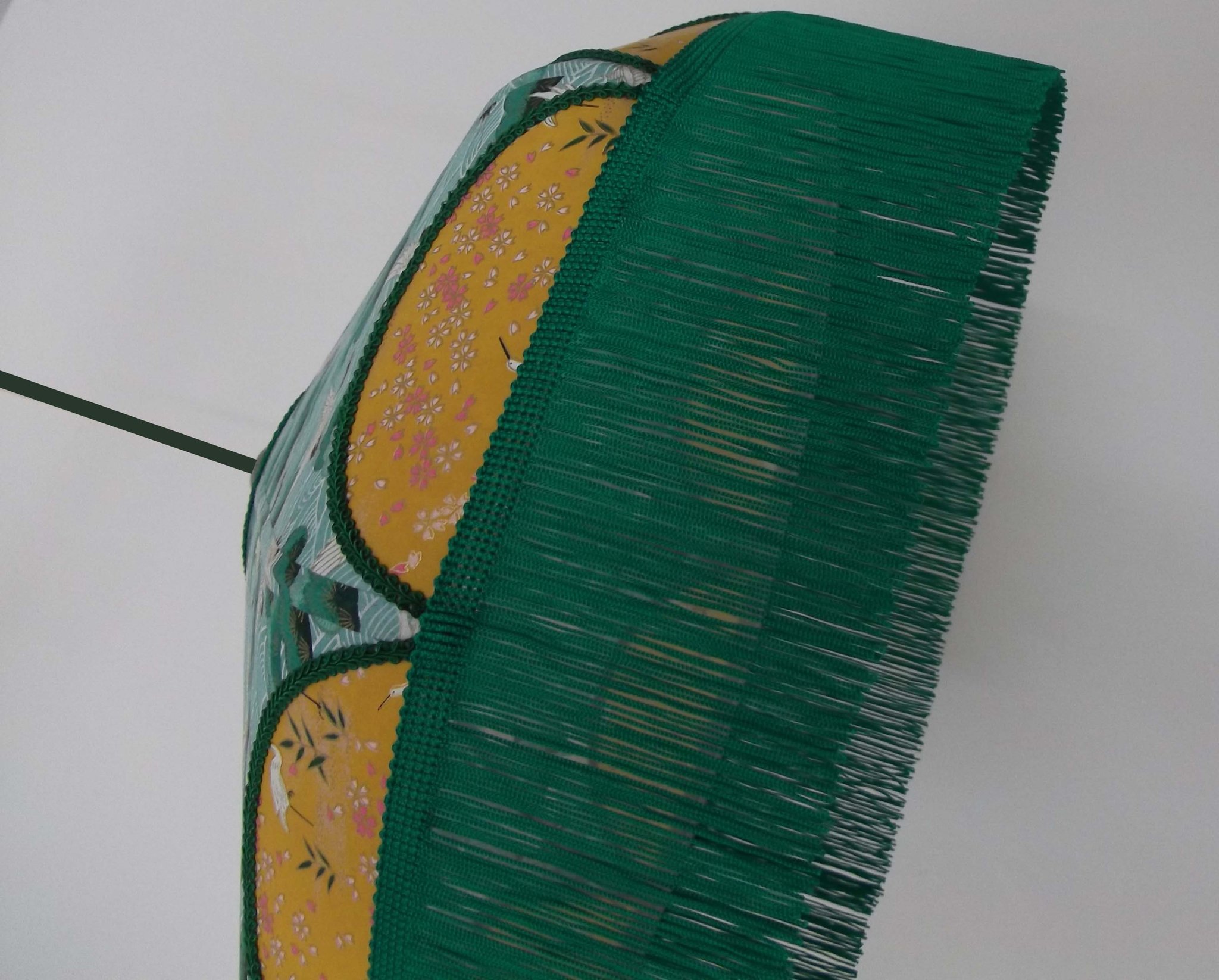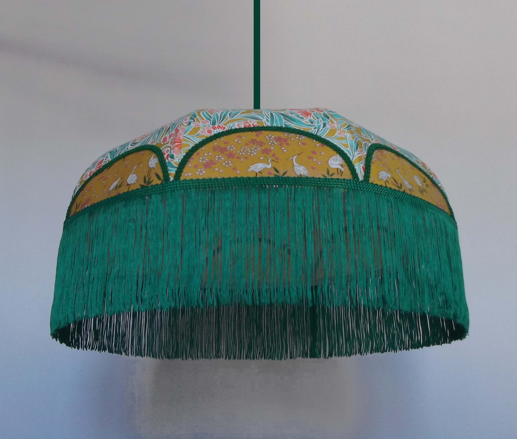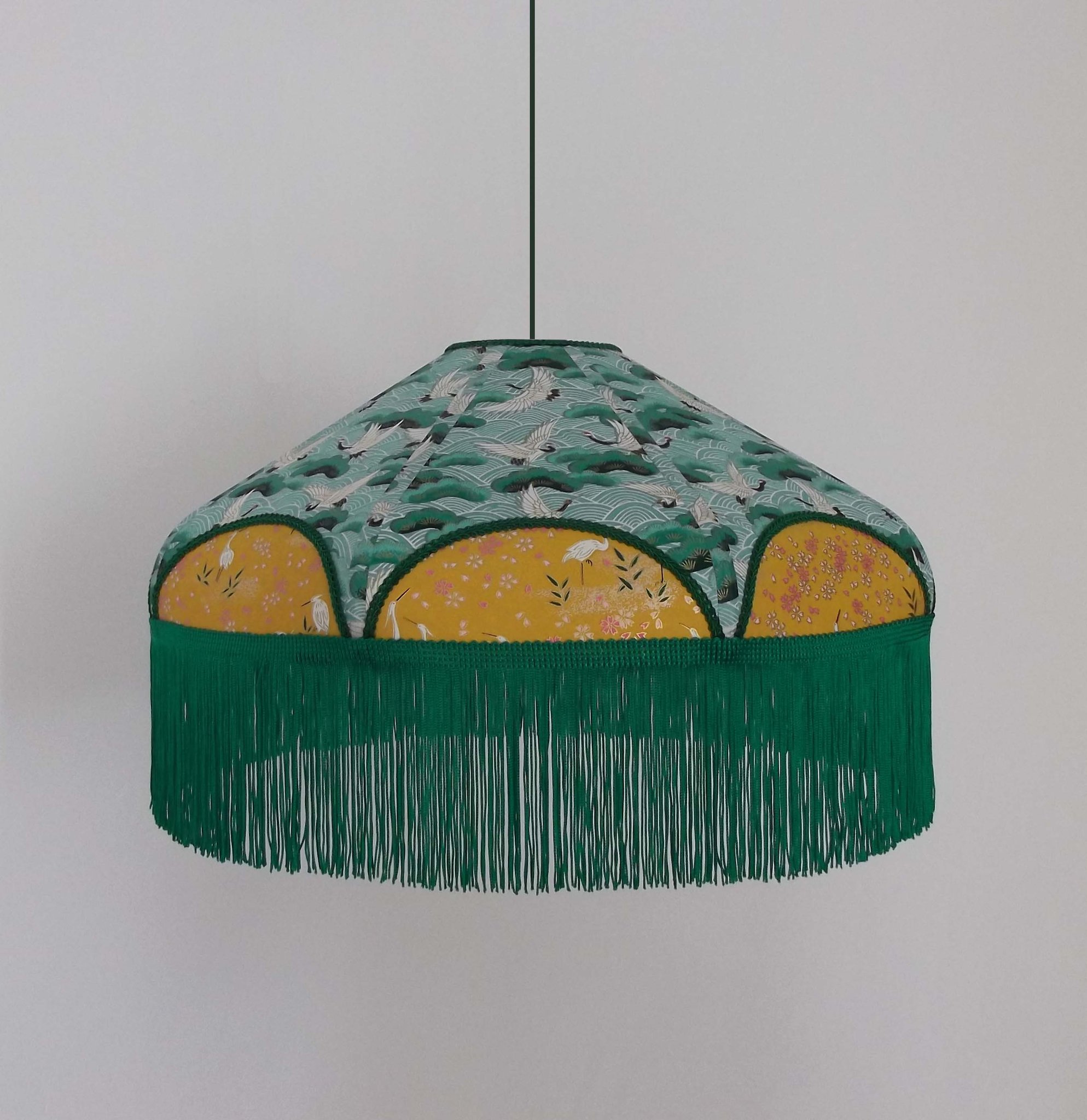 Abat-jour en papier japonais fleurs sur fond moutarde en haut et grues sur fond vert en bas. Frange verte. Forme dôme. Diamètre 40 cm, hauteur 23 cm + 10 cm de frange. Douille E27, 40 w max.
