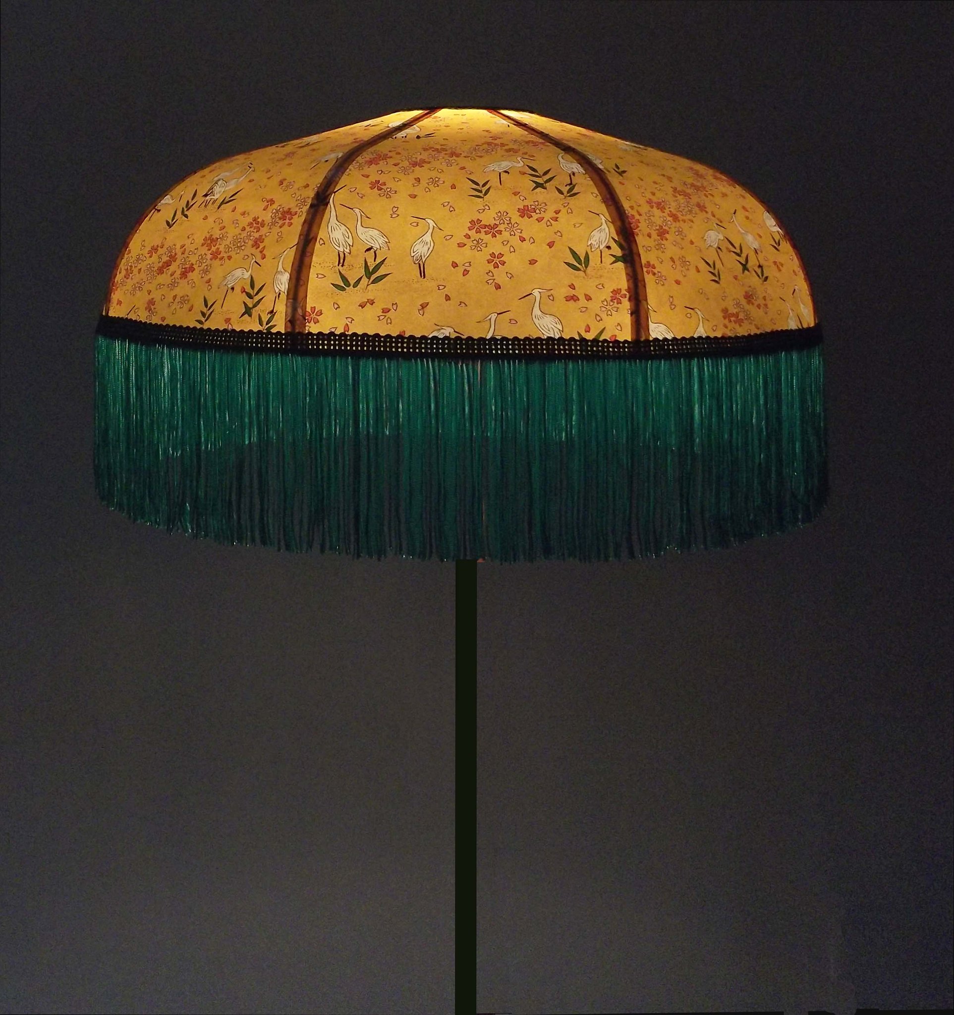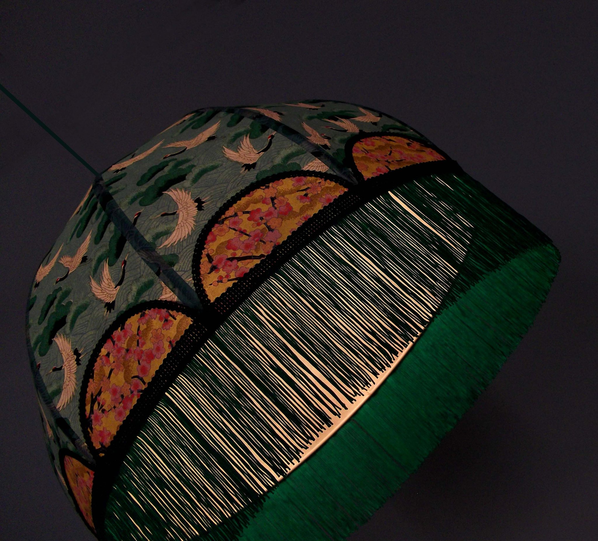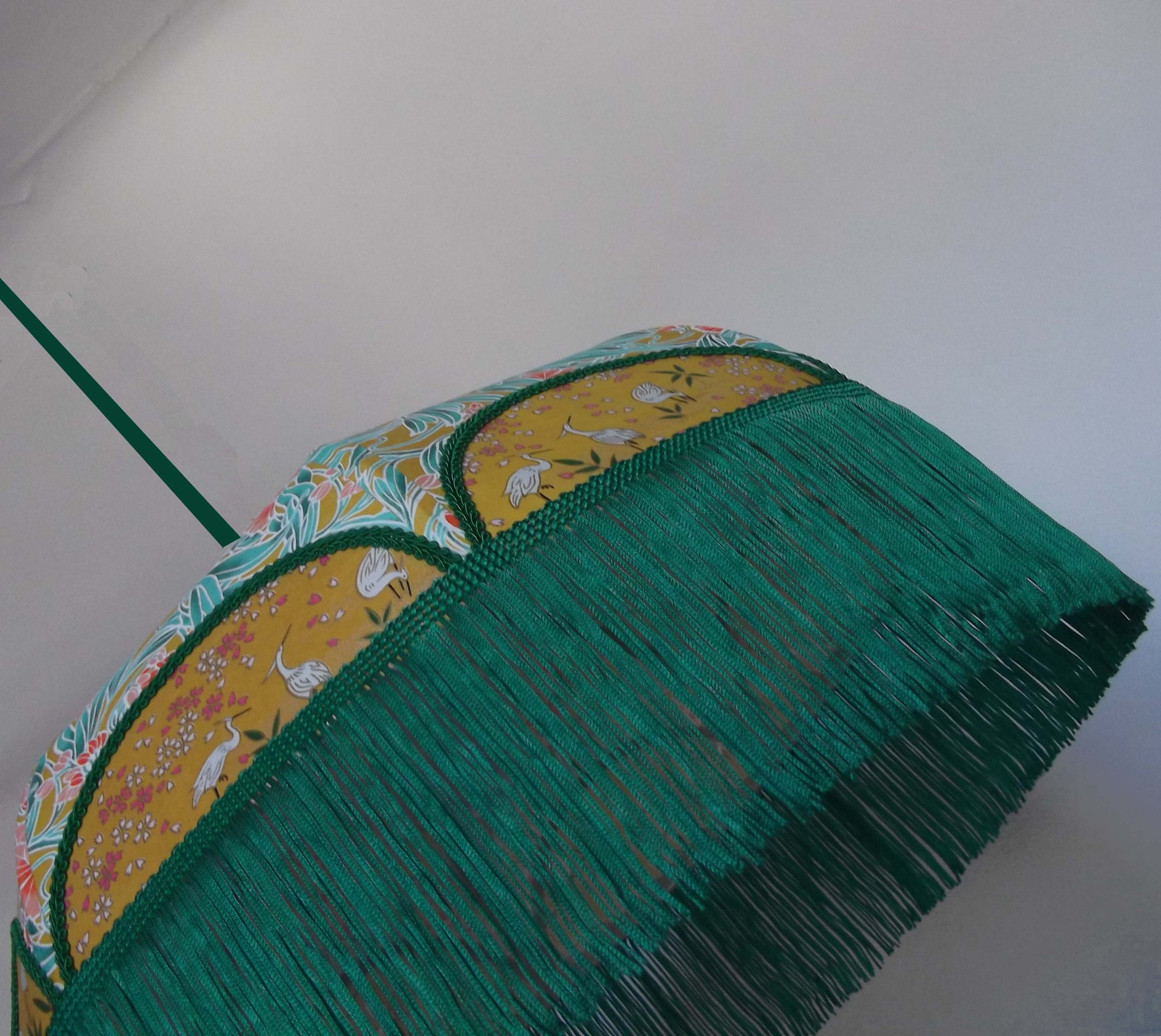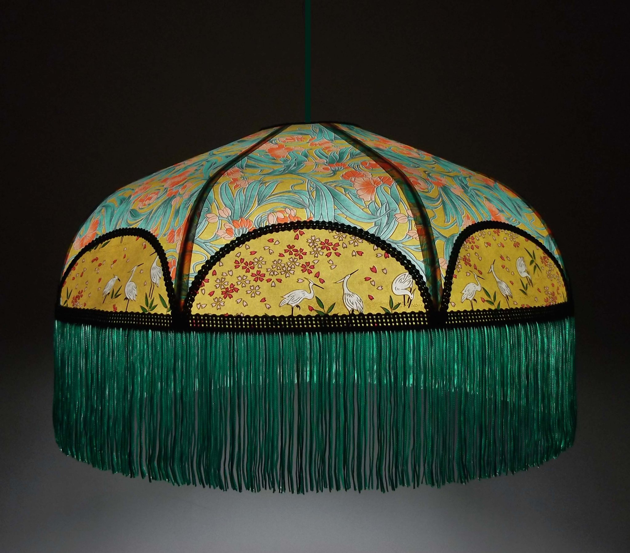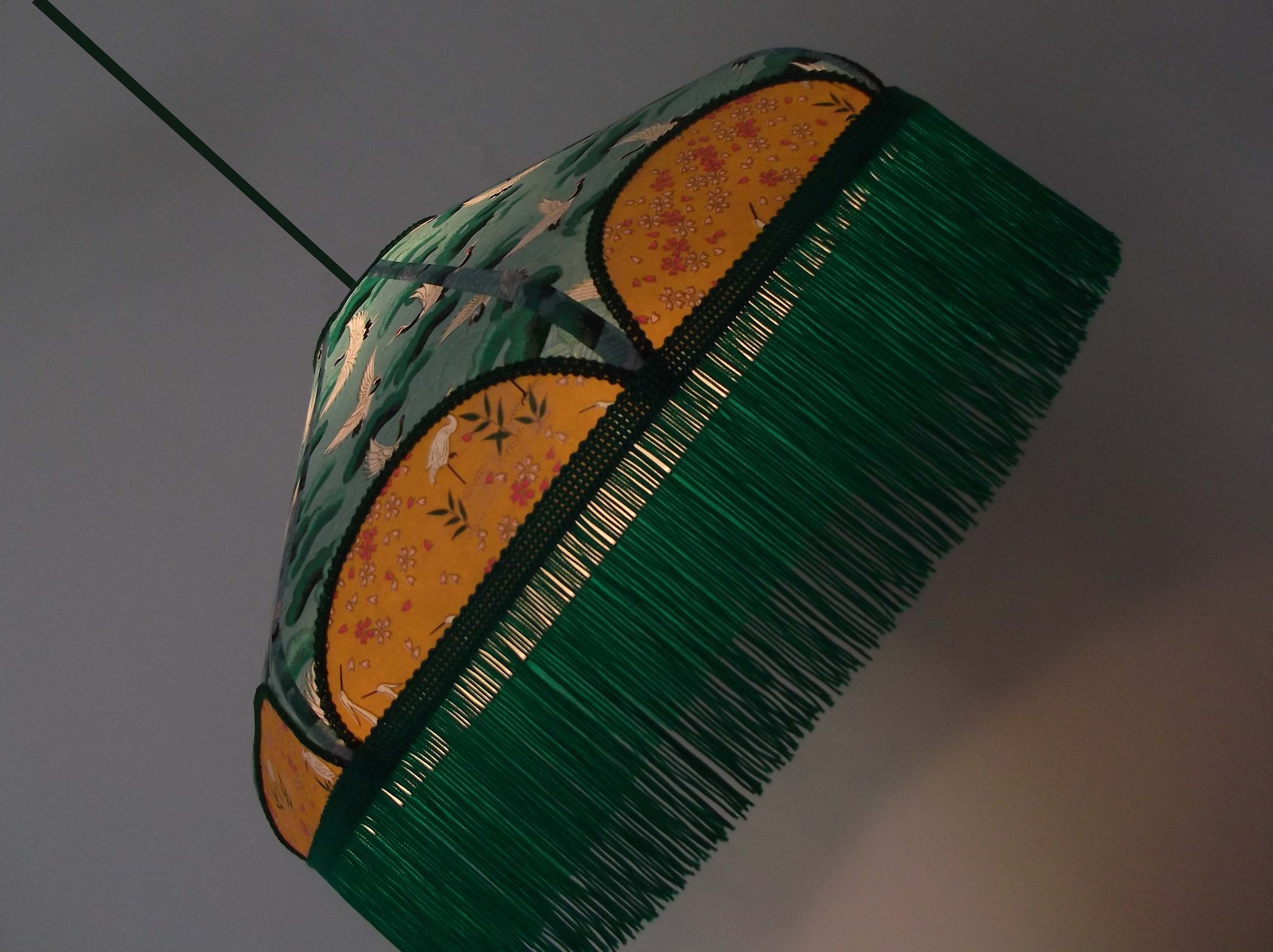 Abat-jour en papier japonais fleurs sur fond moutarde en haut et grues sur fond vert en bas. Frange verte. Forme dôme. Diamètre 40 cm, hauteur 23 cm + 10 cm de frange. Douille E27, 40 w max.