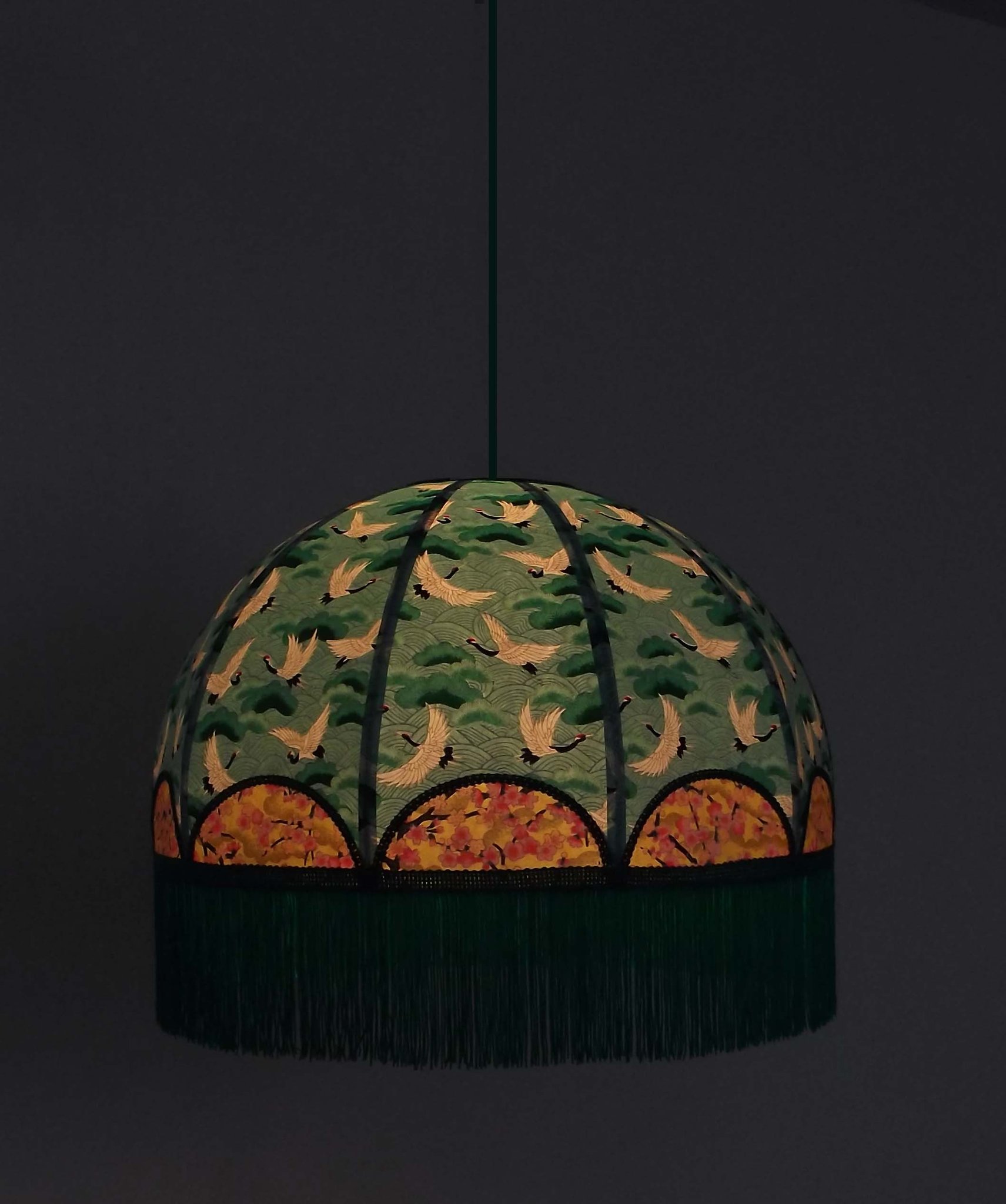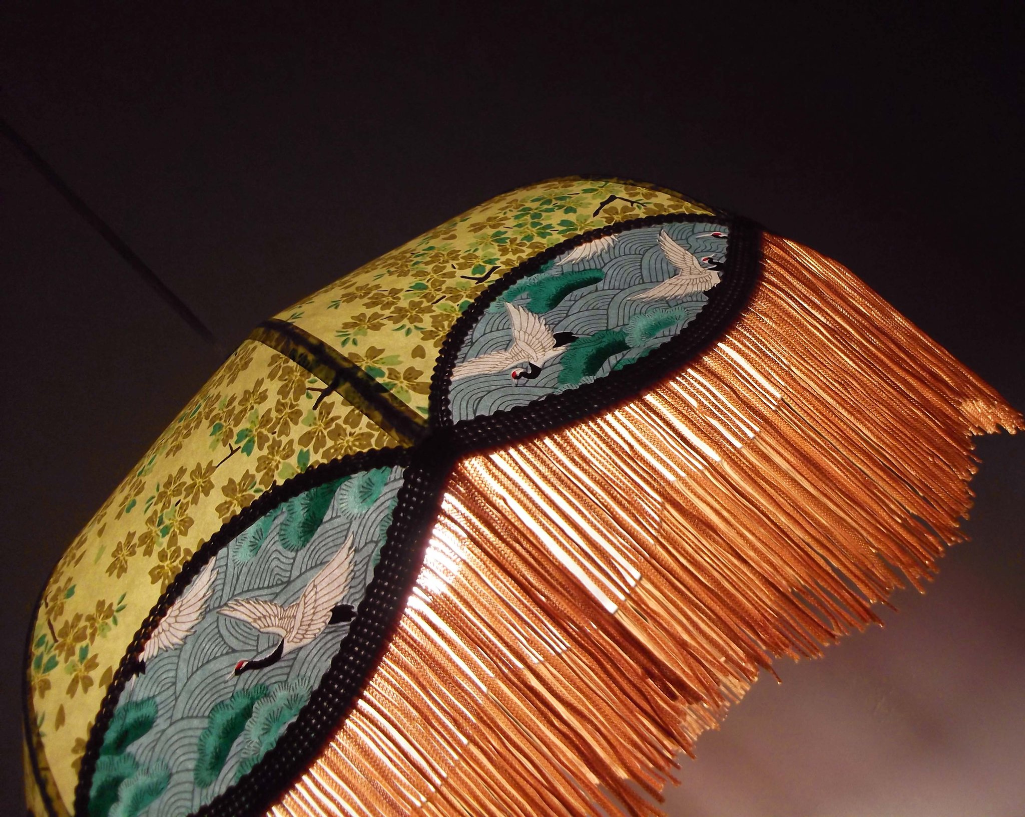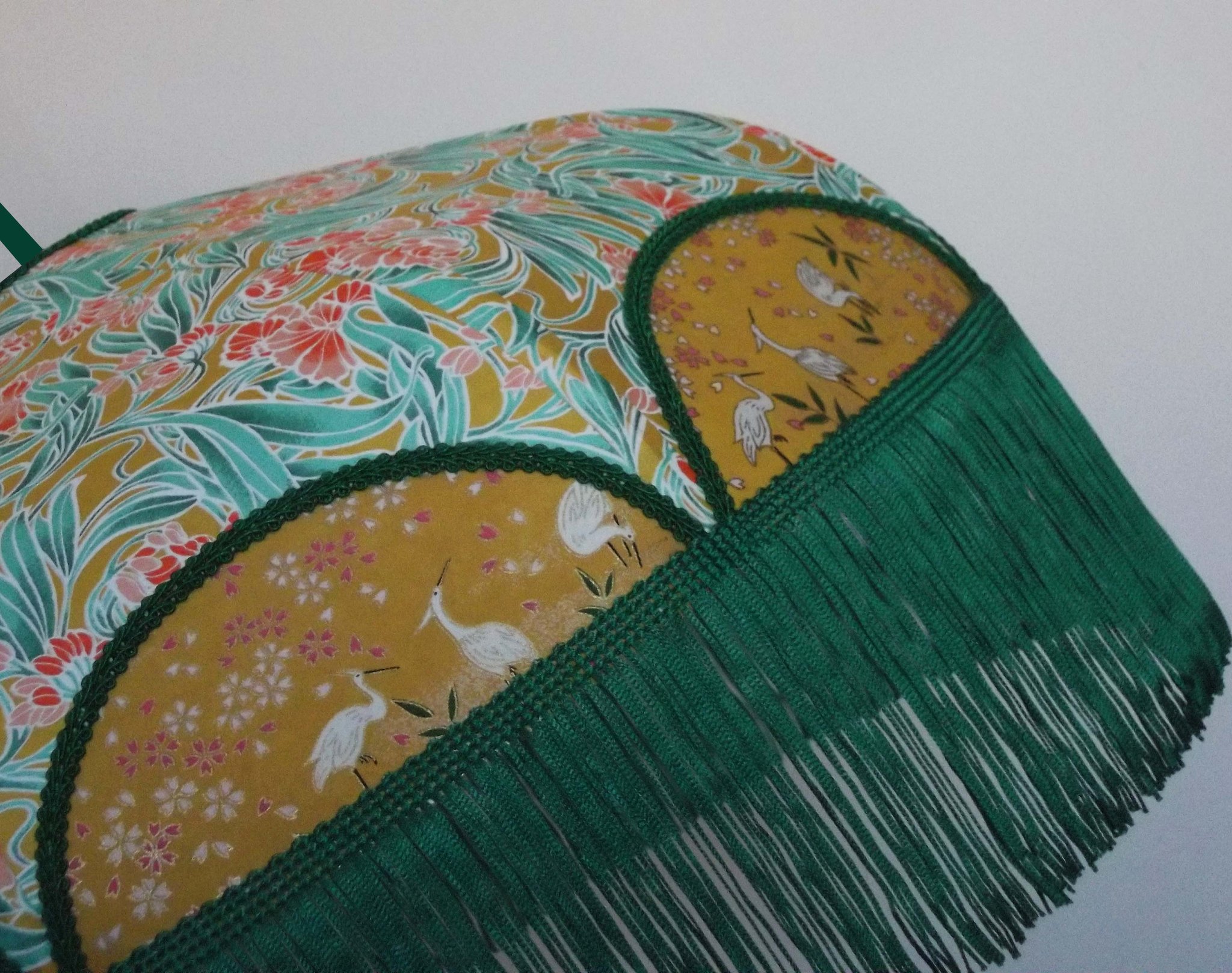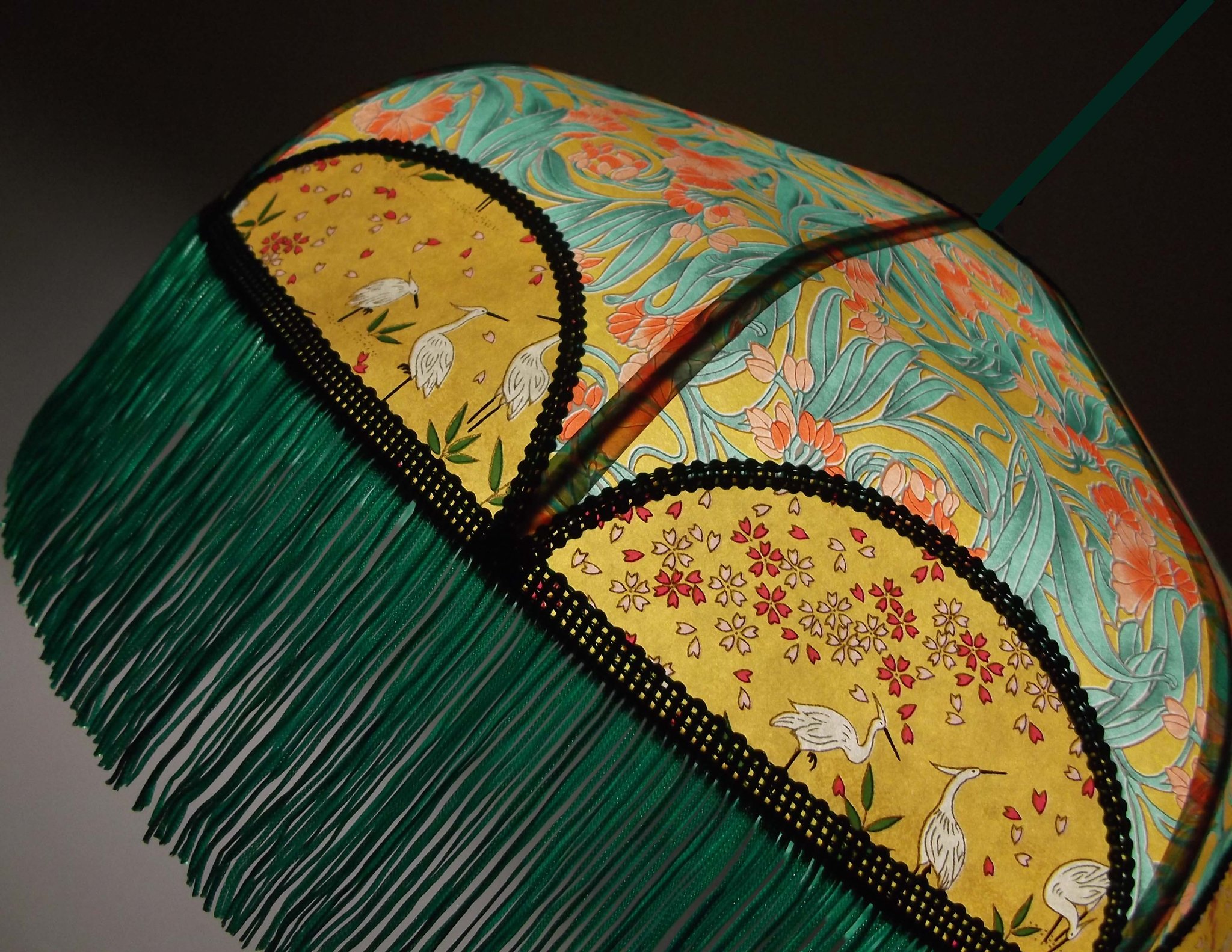 Abat-jour en papier japonais fleurs sur fond moutarde en haut et grues sur fond vert en bas. Frange verte. Forme dôme. Diamètre 40 cm, hauteur 23 cm + 10 cm de frange. Douille E27, 40 w max.