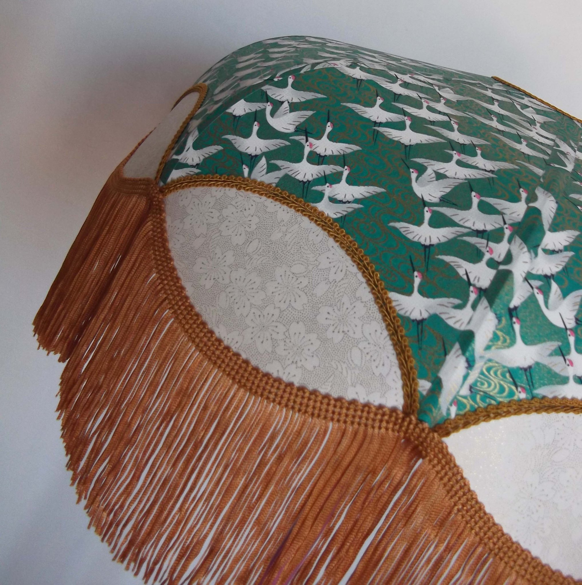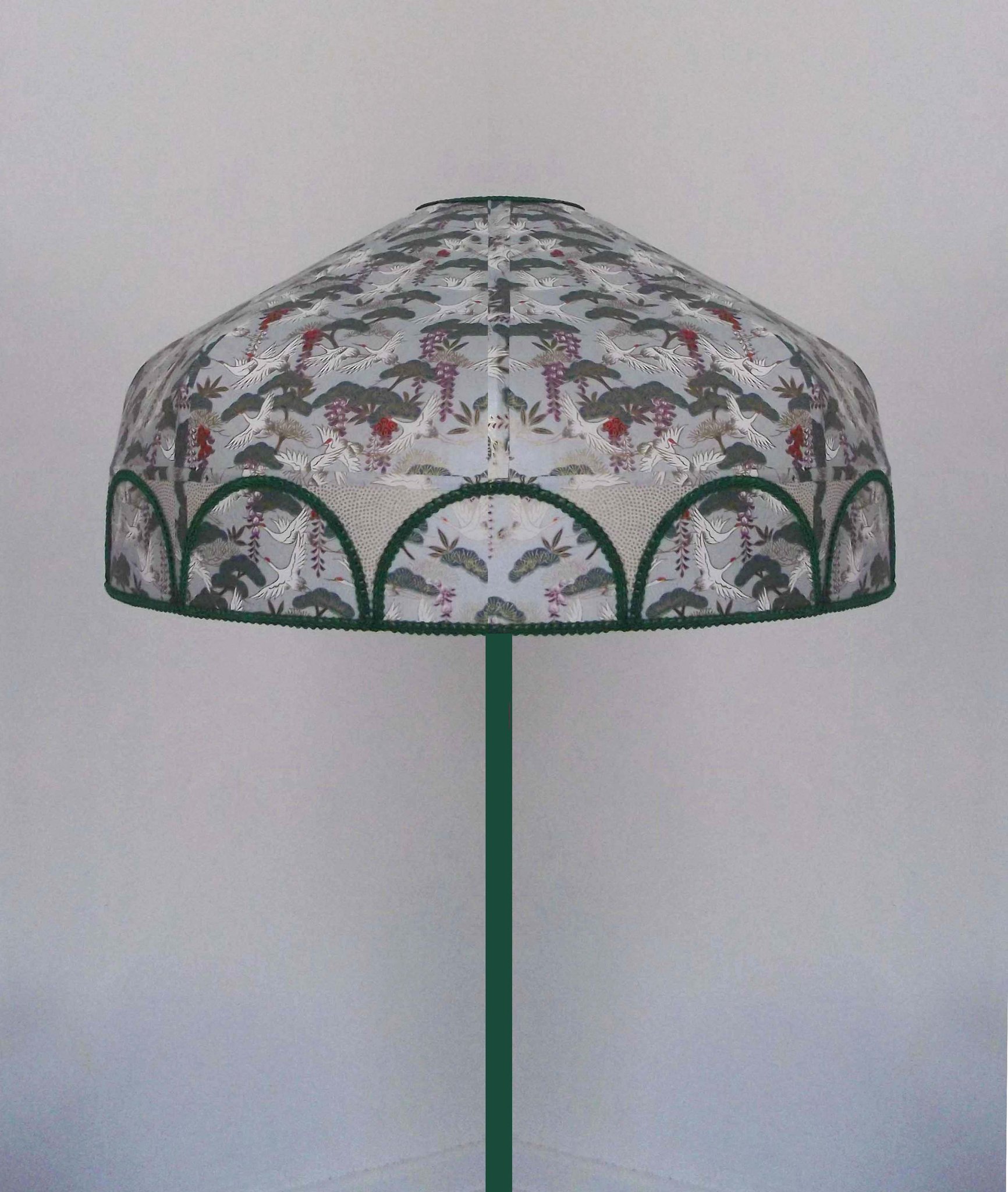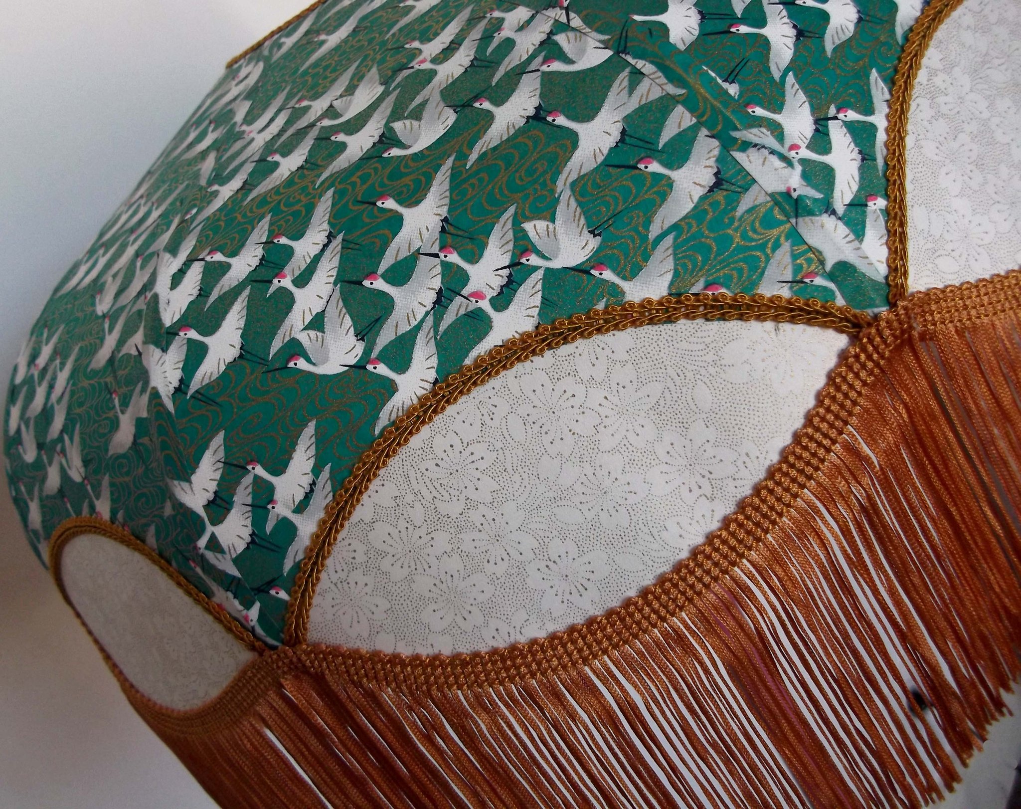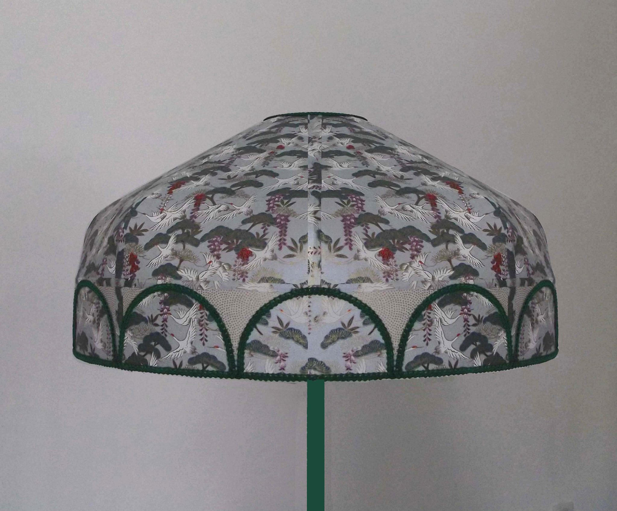 Abat-jour 40 cm de diamètre. Papier japonais grues sur fond vert en haut et fleurs dorées sur fond blanc en bas. Frange dorée. Hauteur 16 cm + 10 cm de frange. Douille E27, 40 w max.