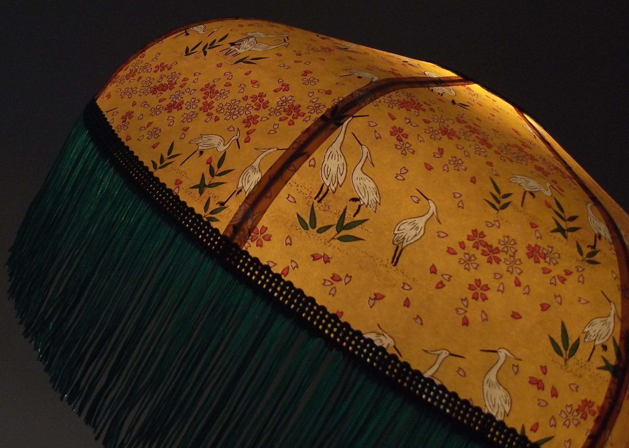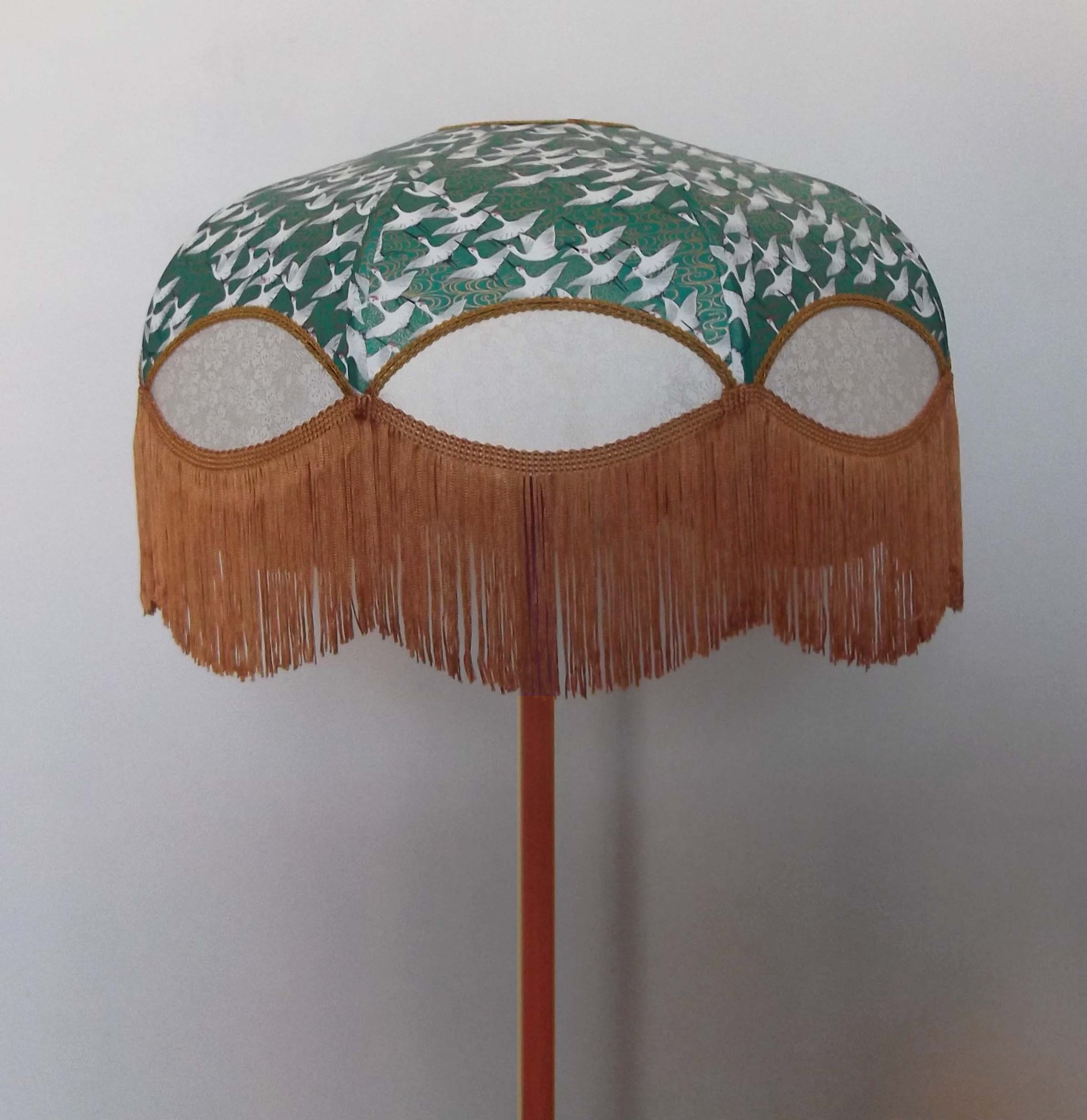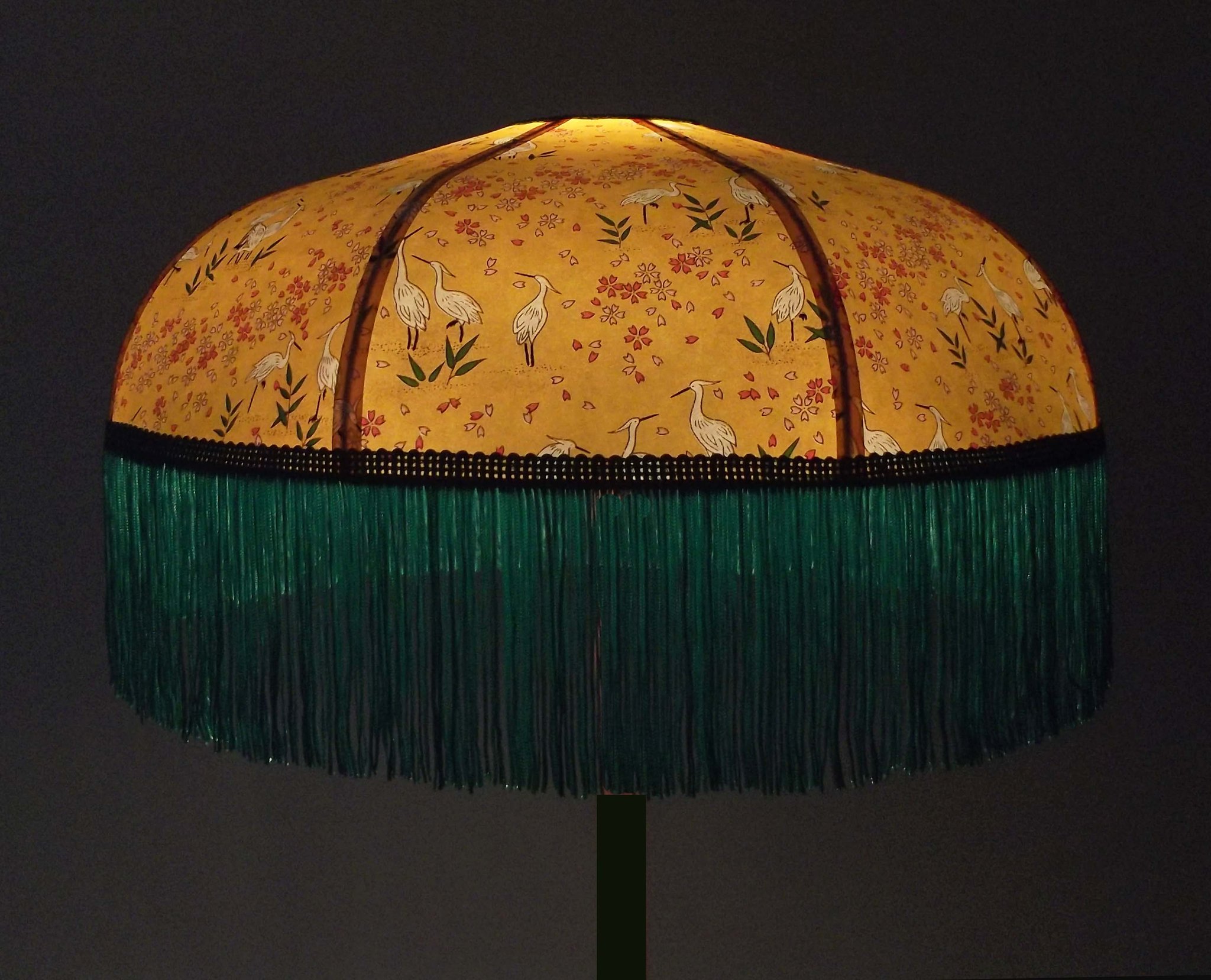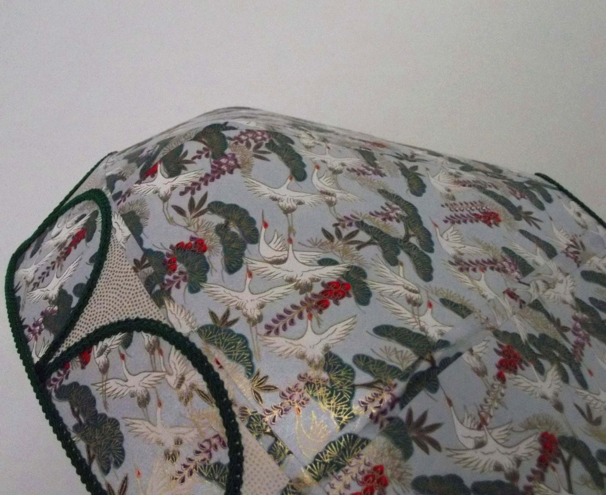 Abat-jour 40 cm de diamètre. Papier japonais grues sur fond vert en haut et fleurs dorées sur fond blanc en bas. Frange dorée. Hauteur 16 cm + 10 cm de frange. Douille E27, 40 w max.