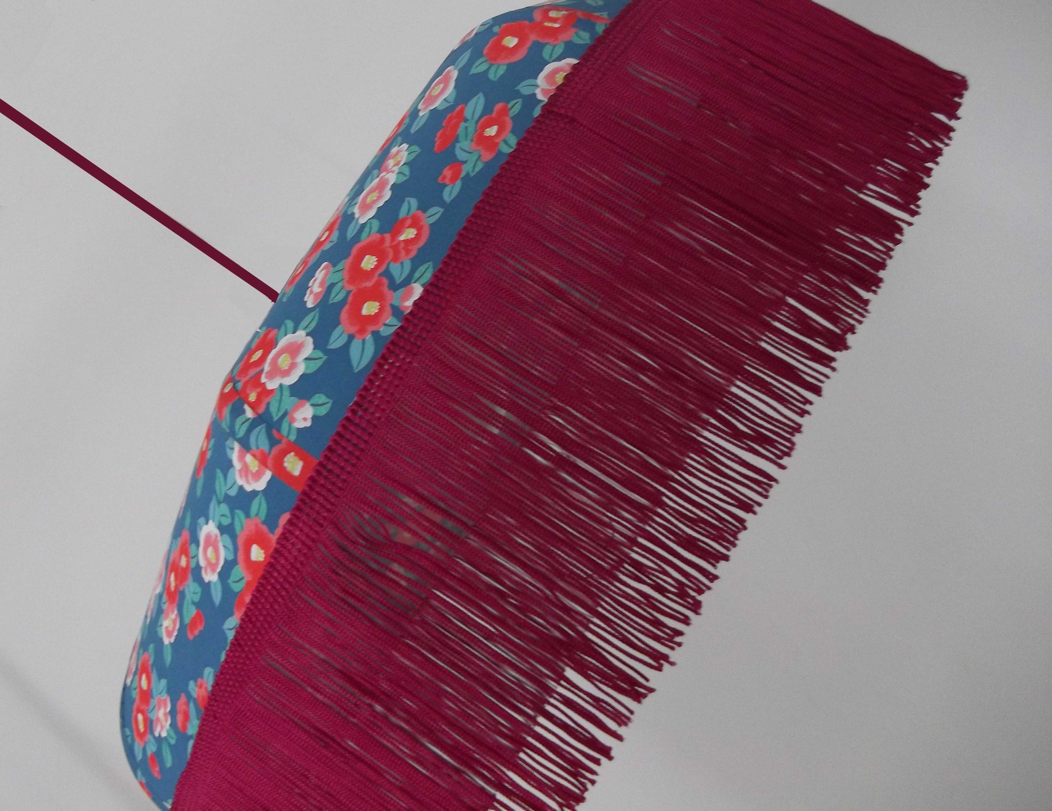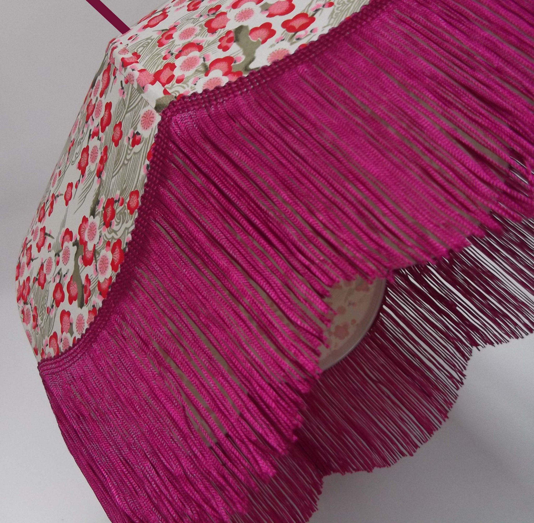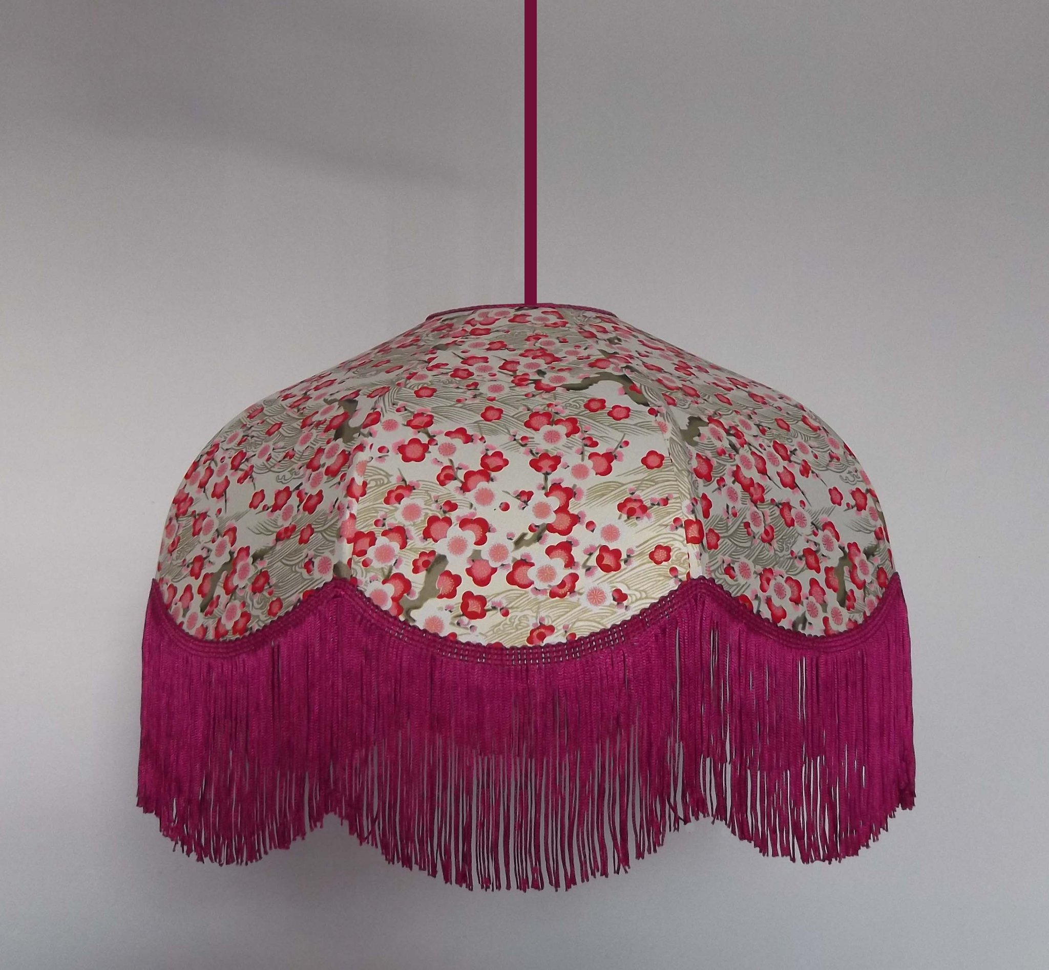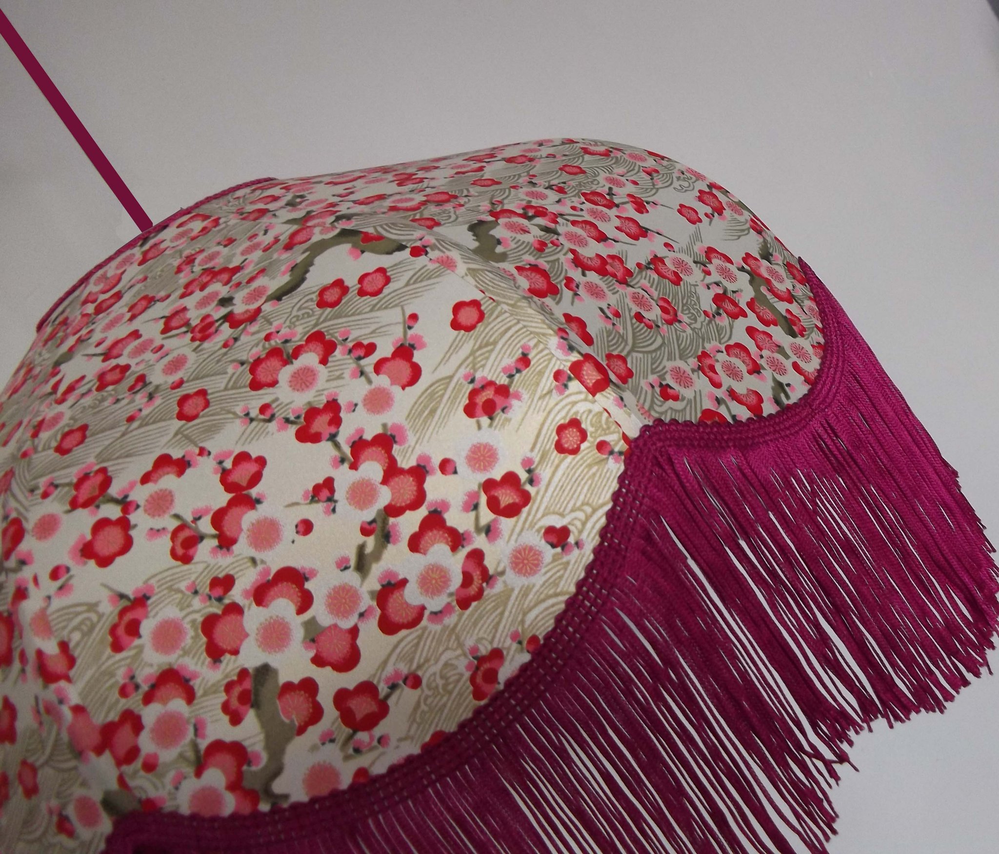Suspension 40 cm de diamètre. Papier japonais fleurs rouges et roses sur fond écru. Frange fuchsia. Hauteur 16 cm + 10 cm de frange. Douille E27, 40 w max.