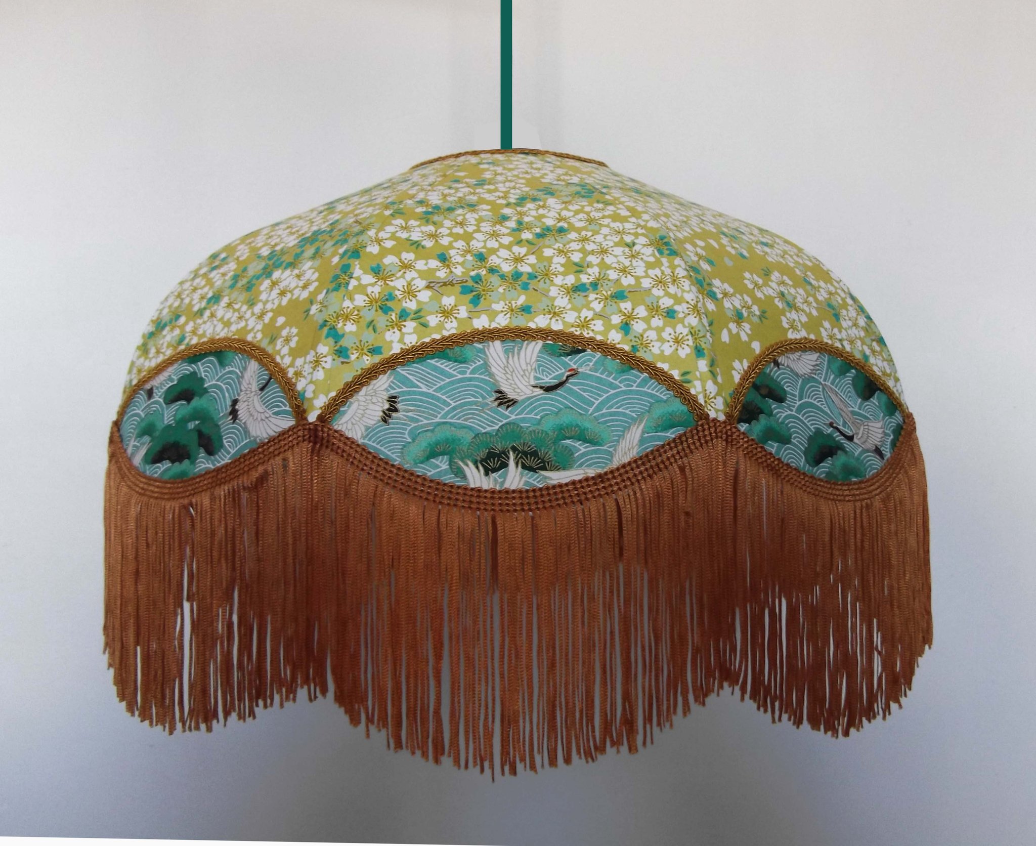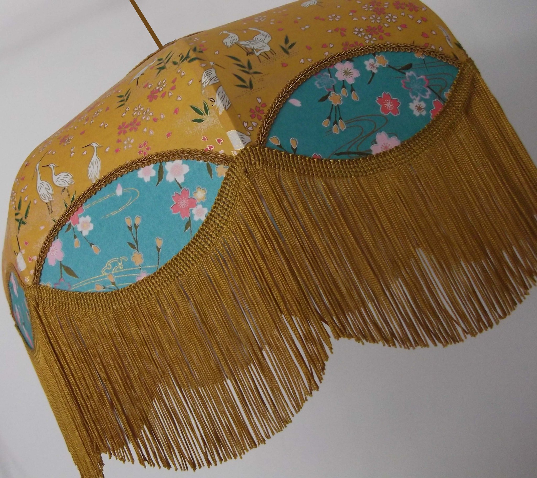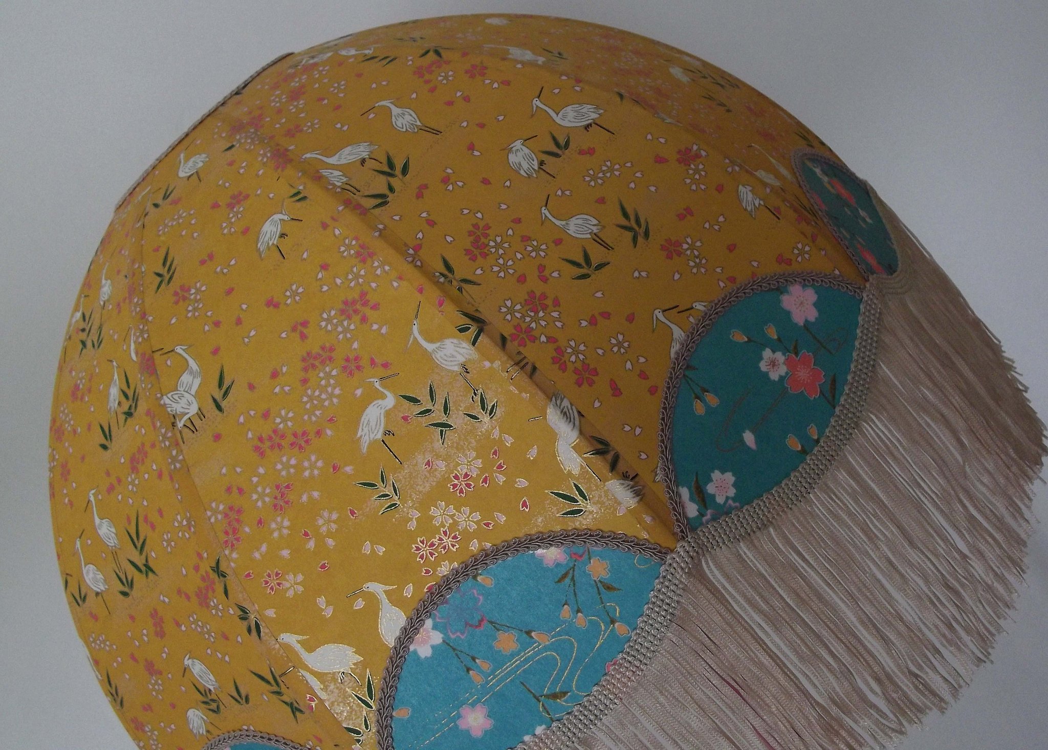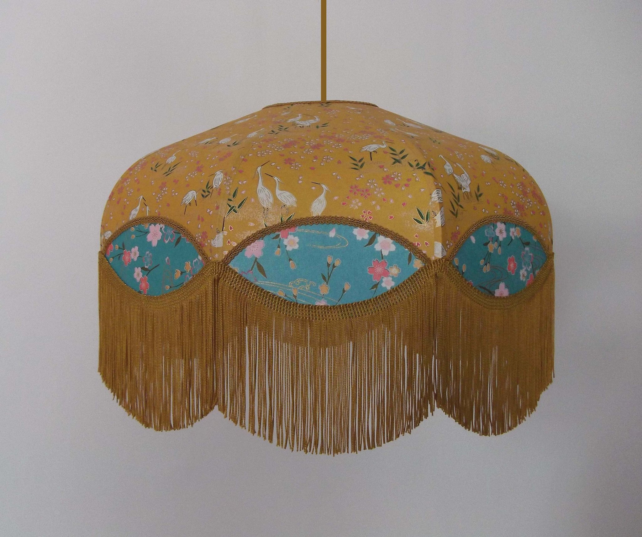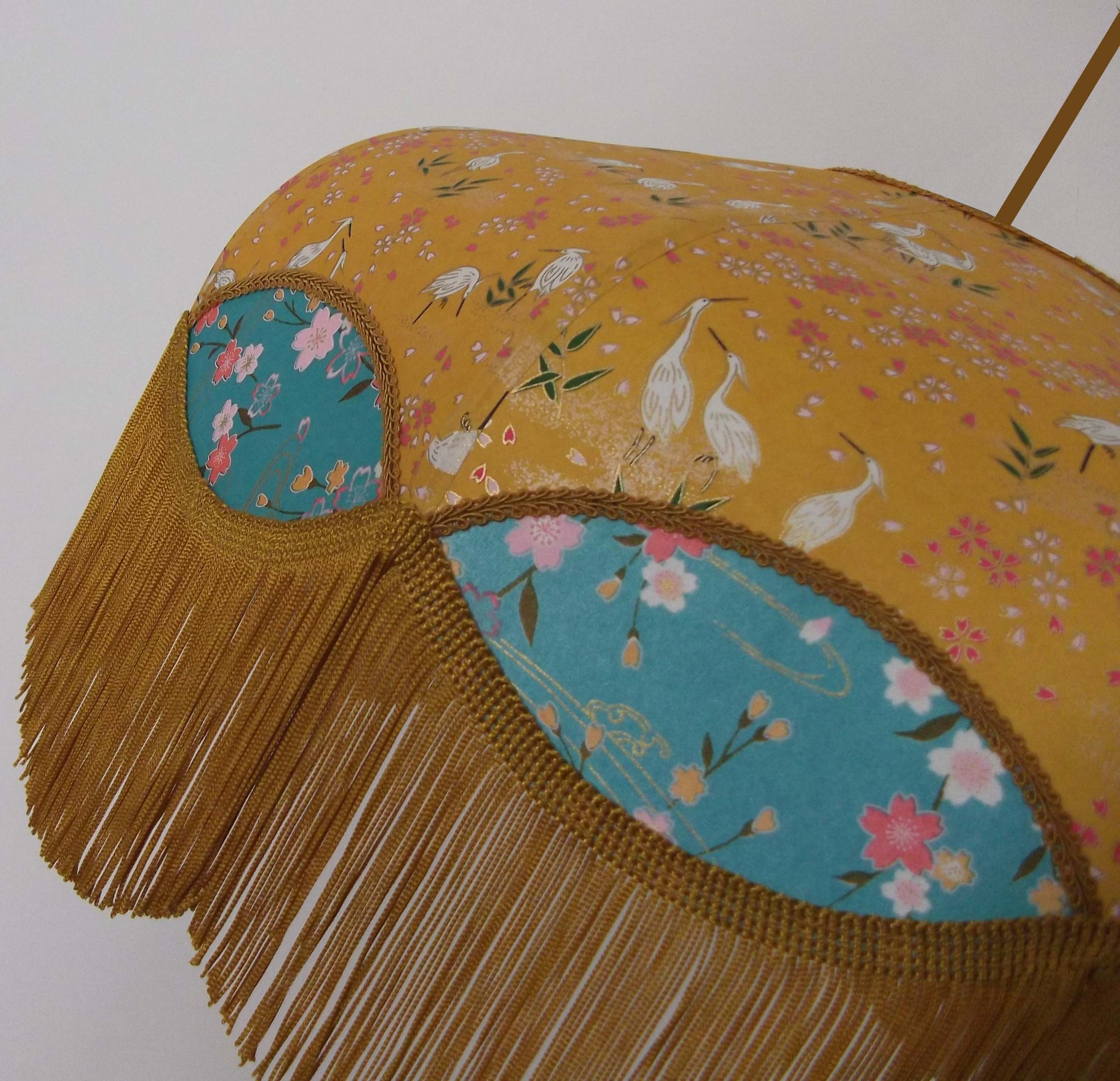 Abat-jour en papier japonais grues sur fond moutarde en haut et fleurs sur fond turquoise en bas. Forme dôme feston bas. Diamètre 40 cm, hauteur 23 cm + 10 cm de frange beige. Douille E27, 40 w max. Sur commande, envoi sous 15 jours.