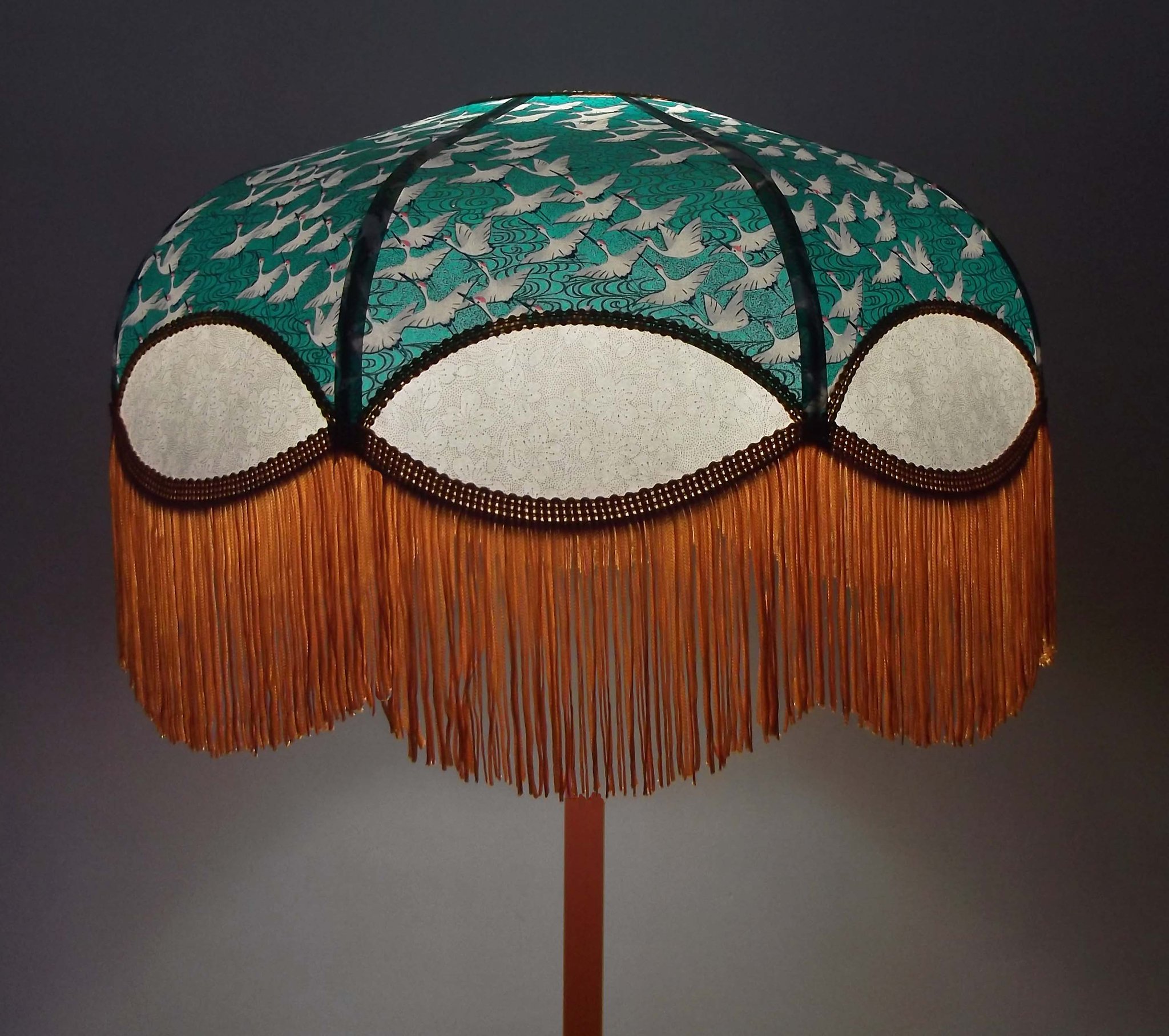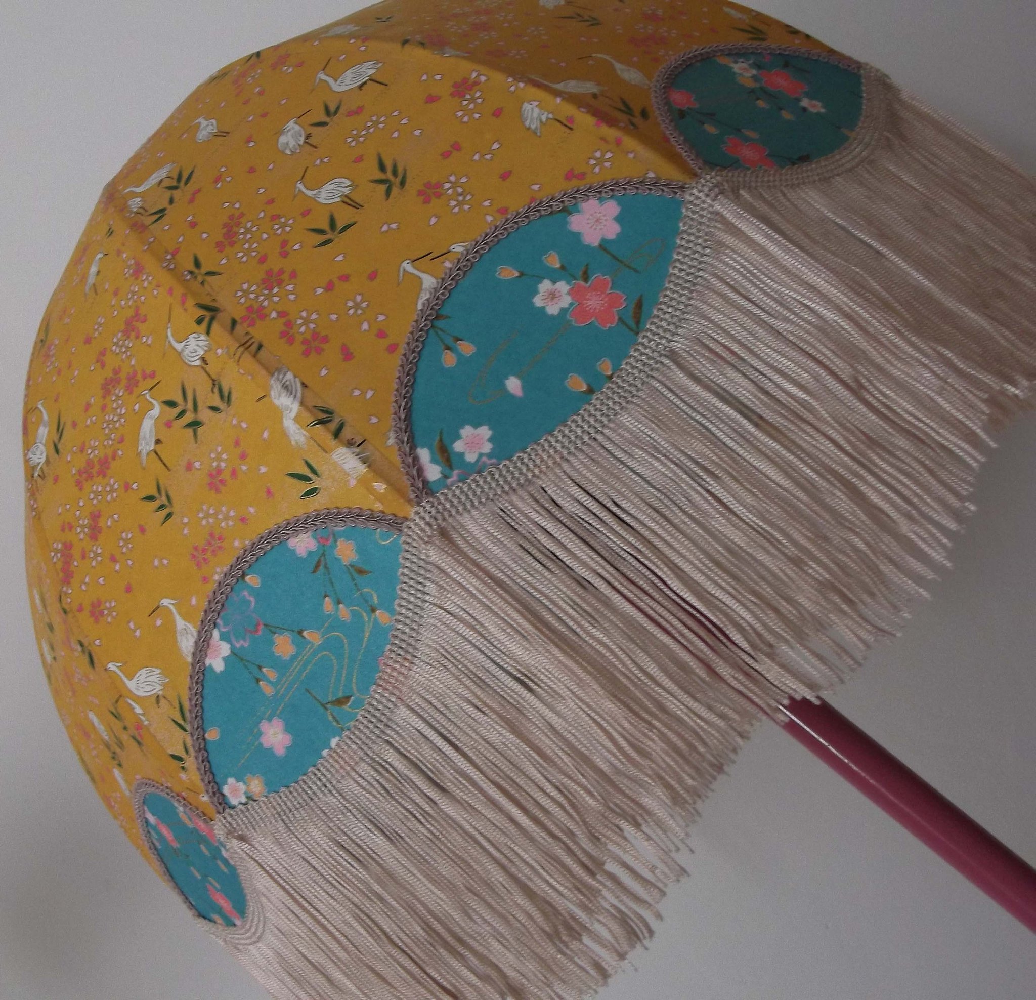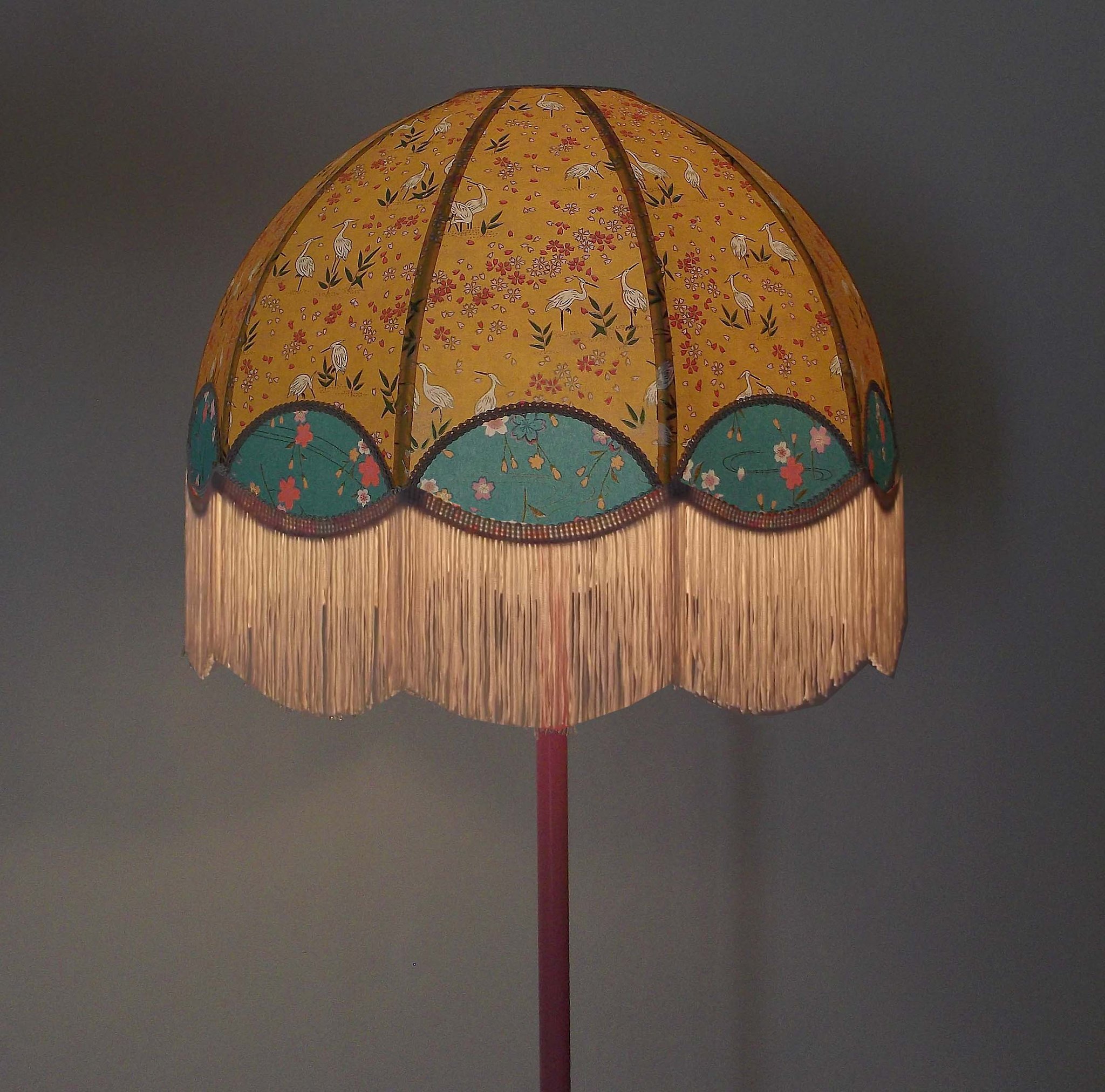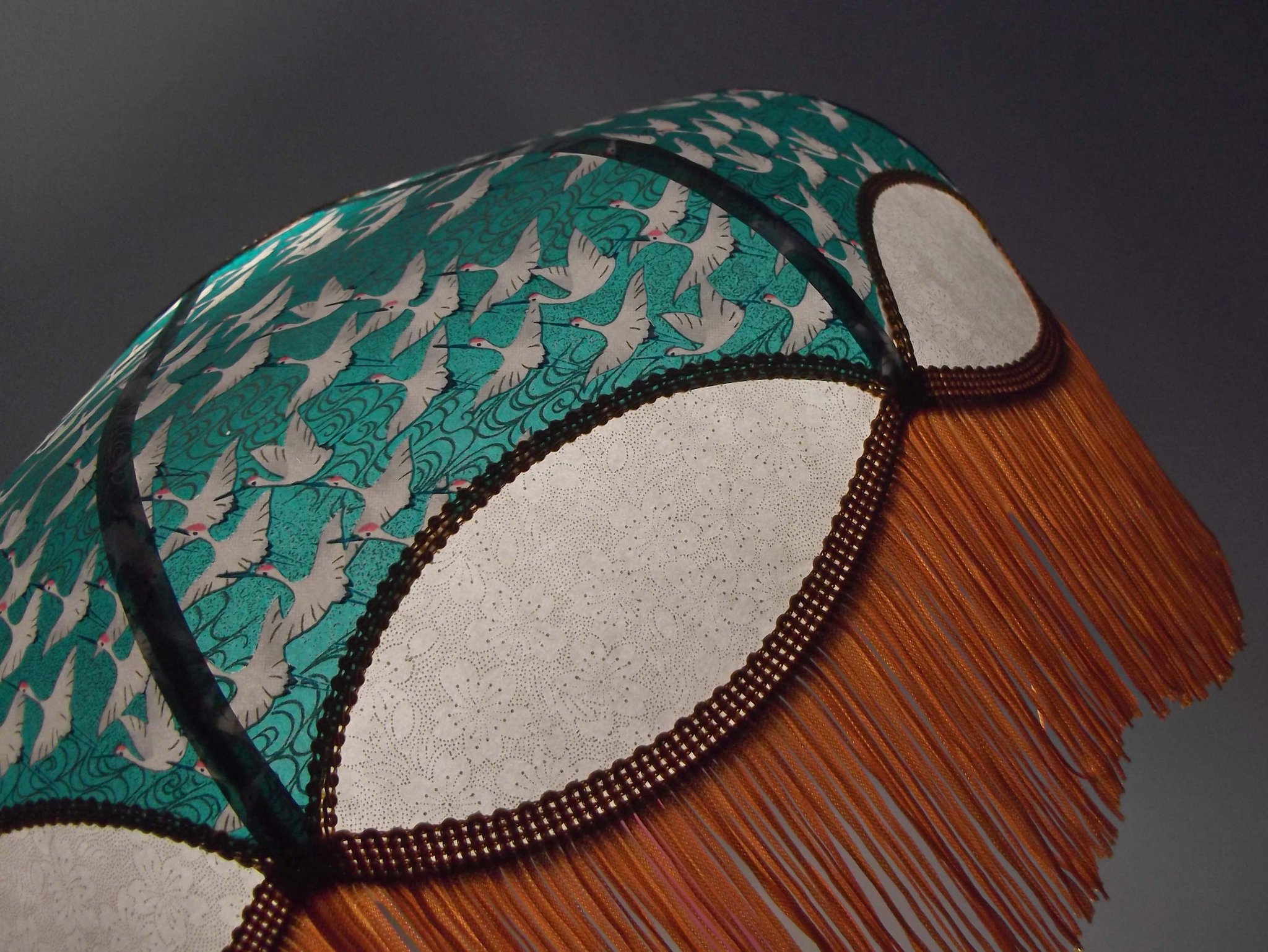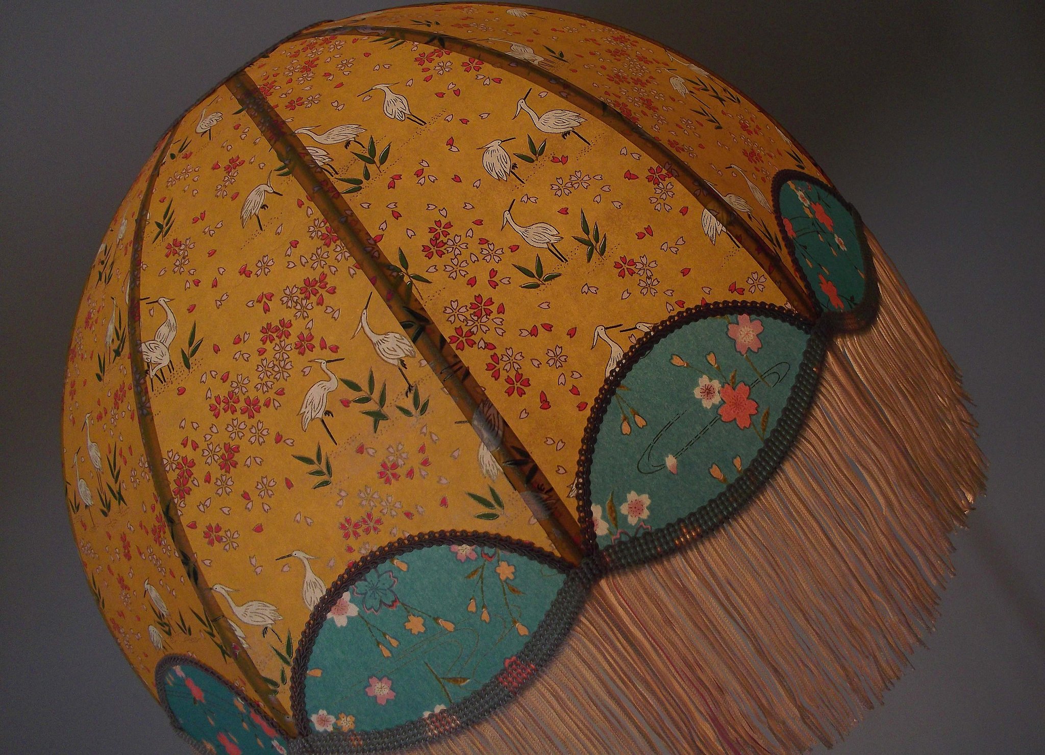 Abat-jour en papier japonais grues sur fond moutarde en haut et fleurs sur fond turquoise en bas. Forme dôme feston bas. Diamètre 40 cm, hauteur 23 cm + 10 cm de frange beige. Douille E27, 40 w max. Sur commande, envoi sous 15 jours.