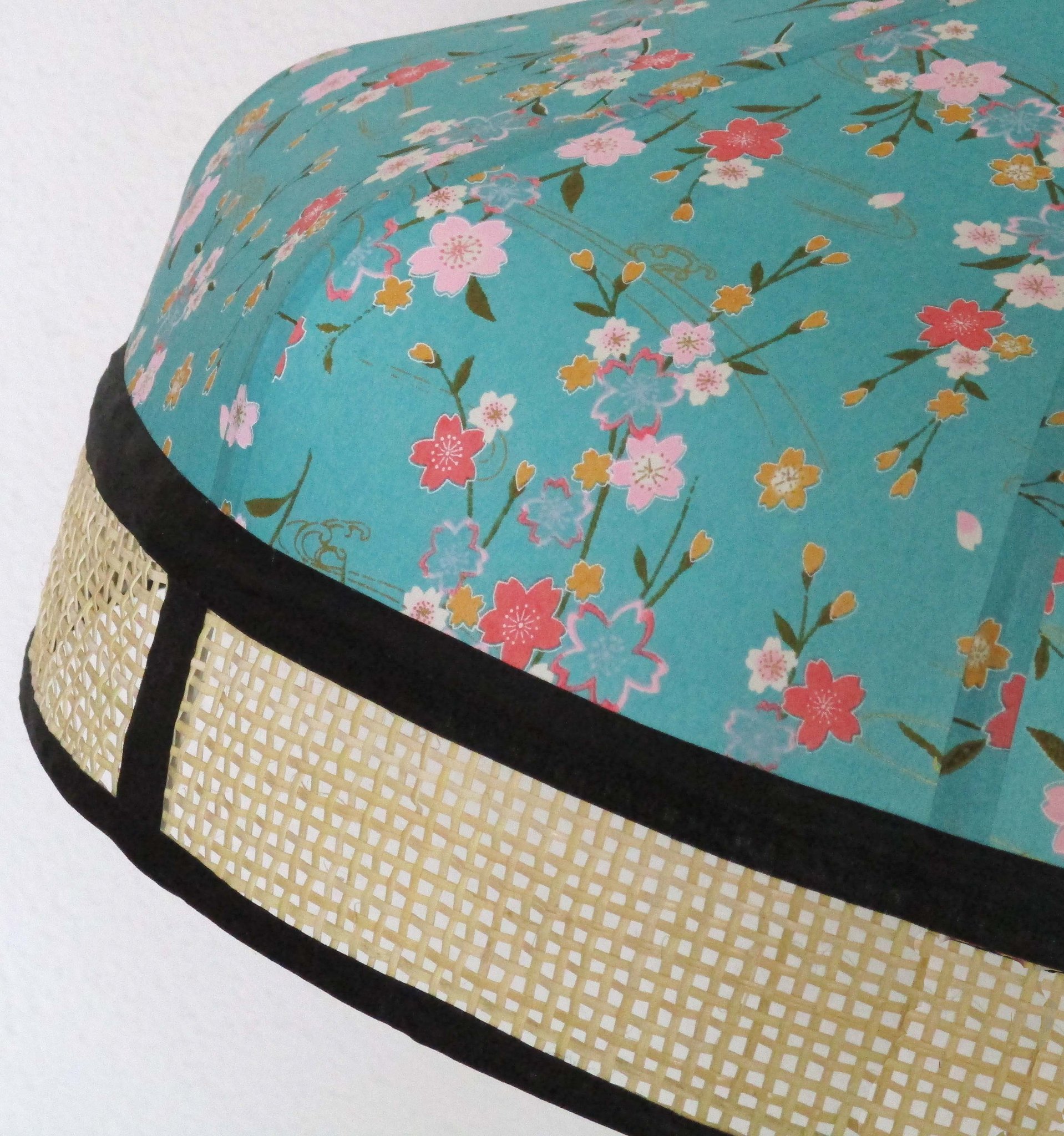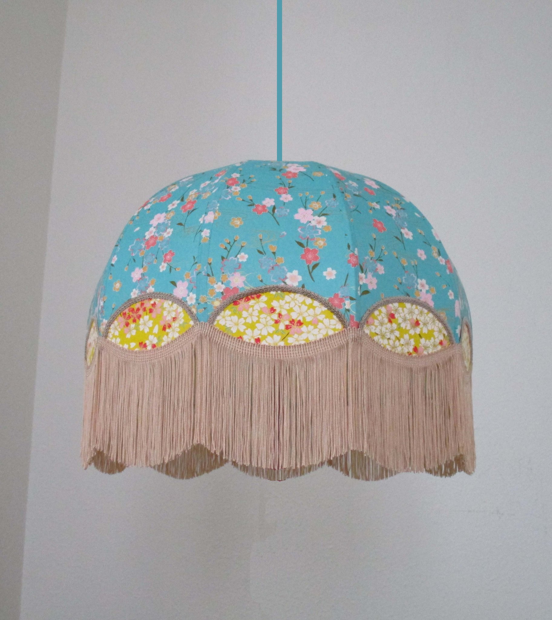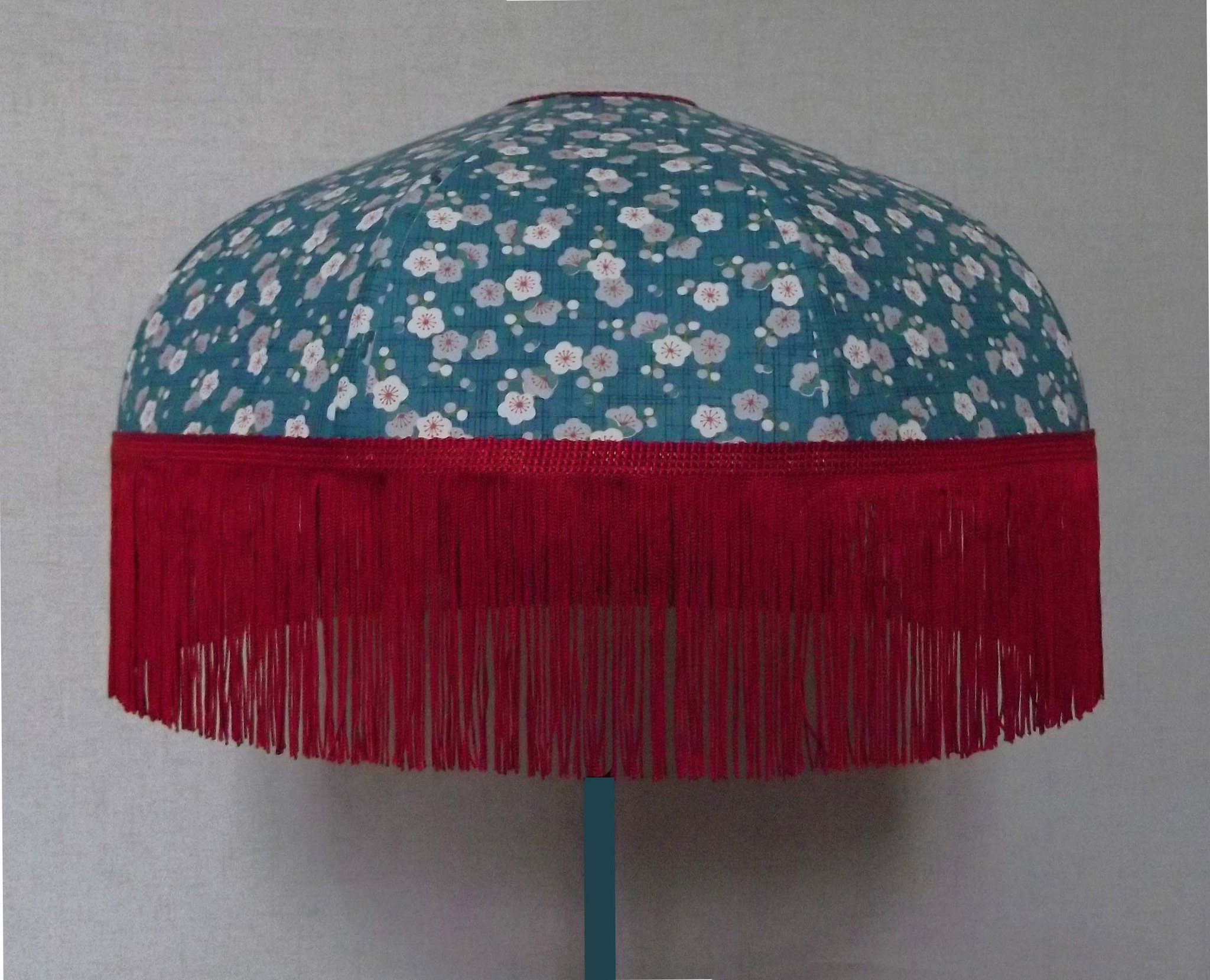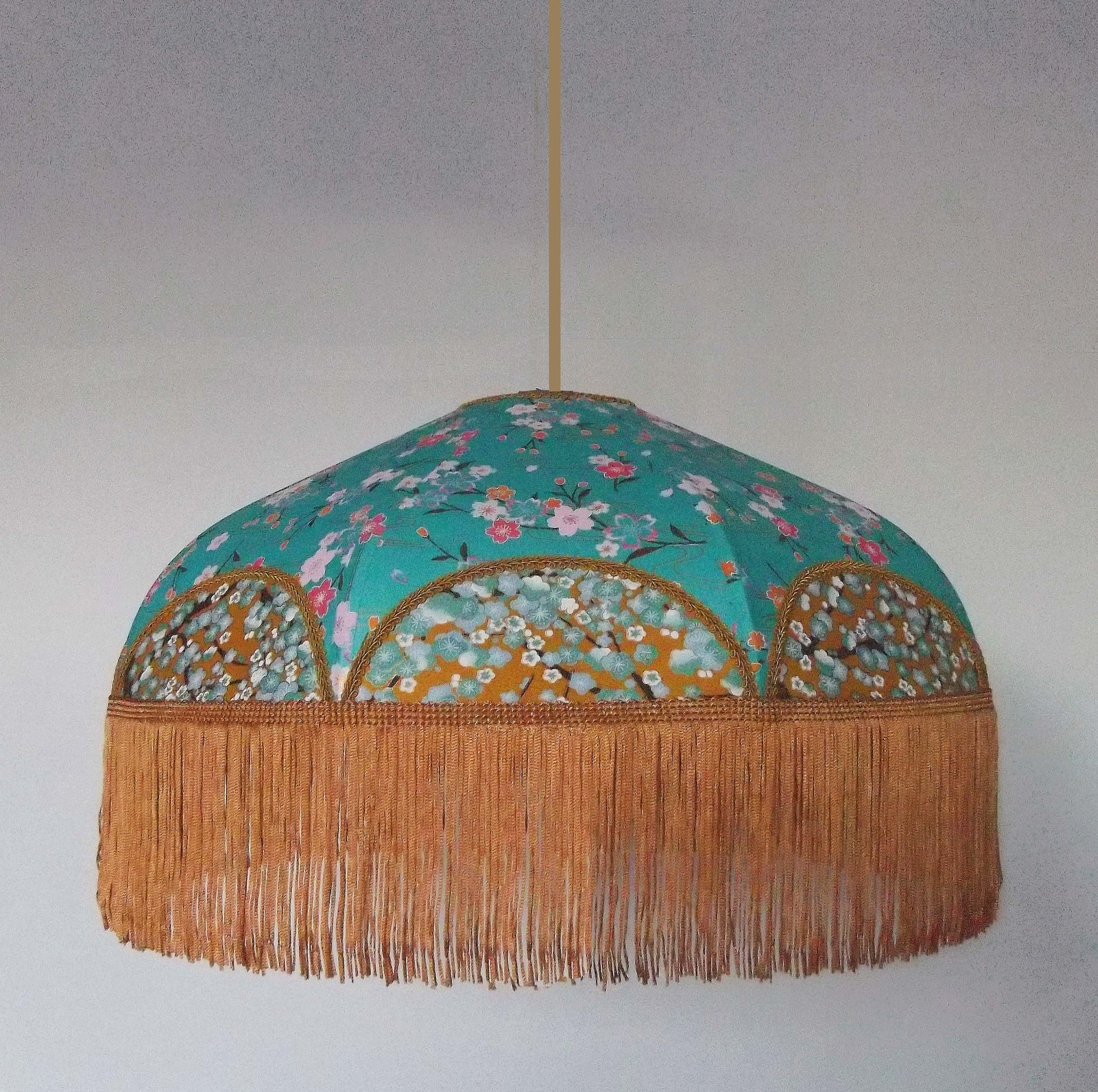 Abat-jour en papier japonais à fleurs sur fond turquoise. Forme dôme feston bas. Diamètre 40 cm, hauteur 23 cm + 10 cm de frange
