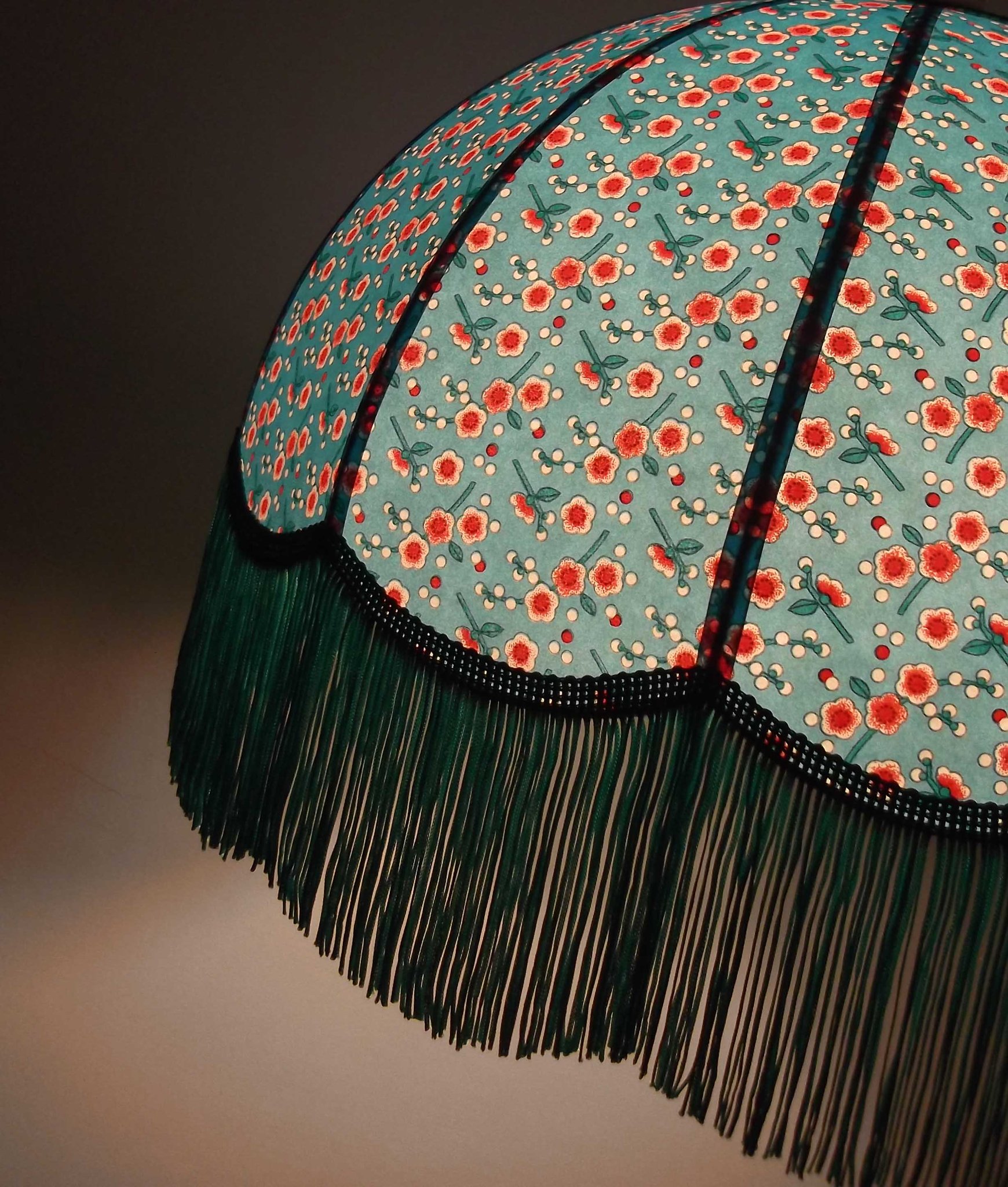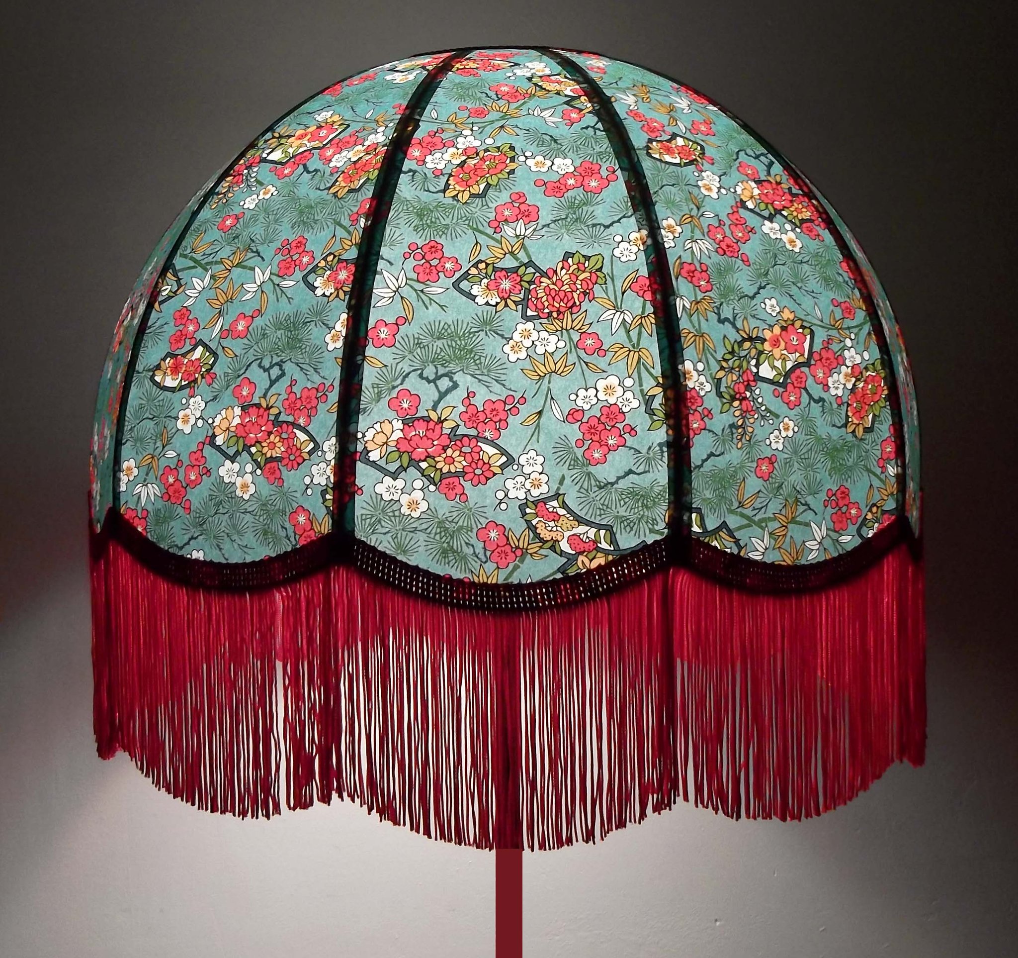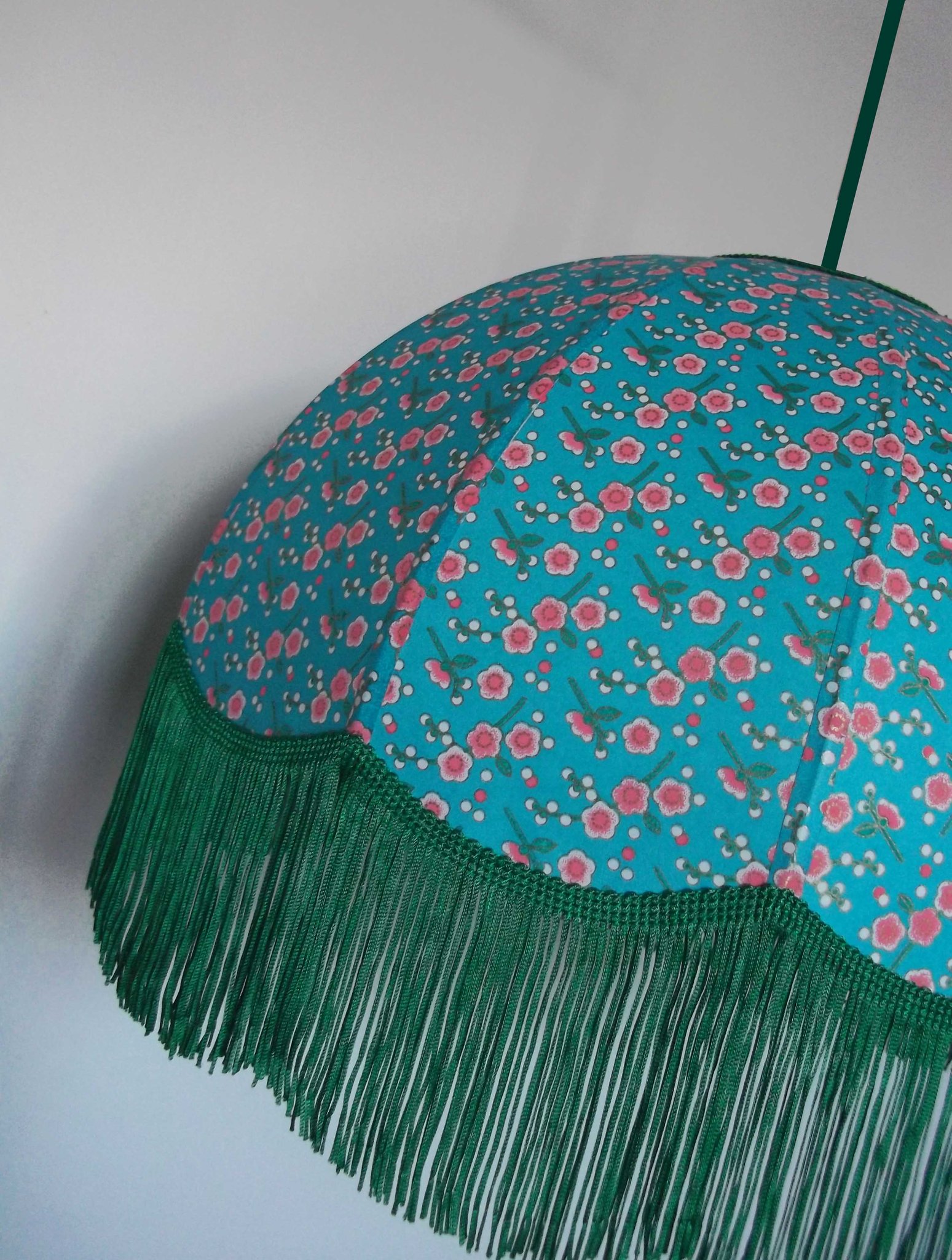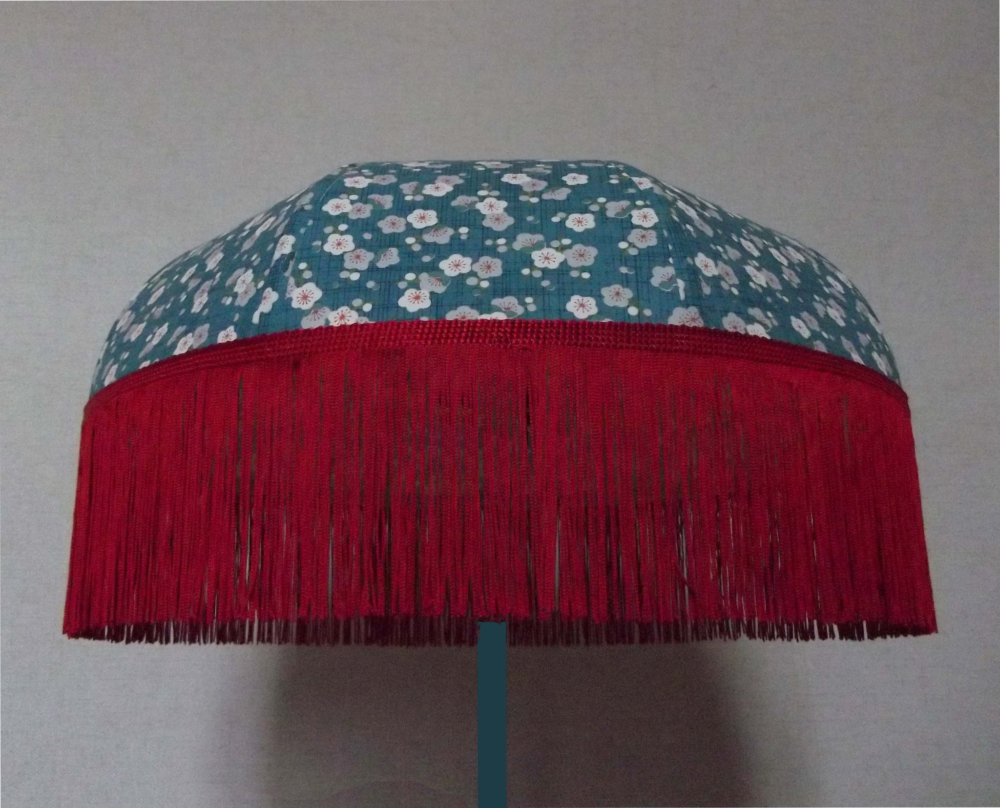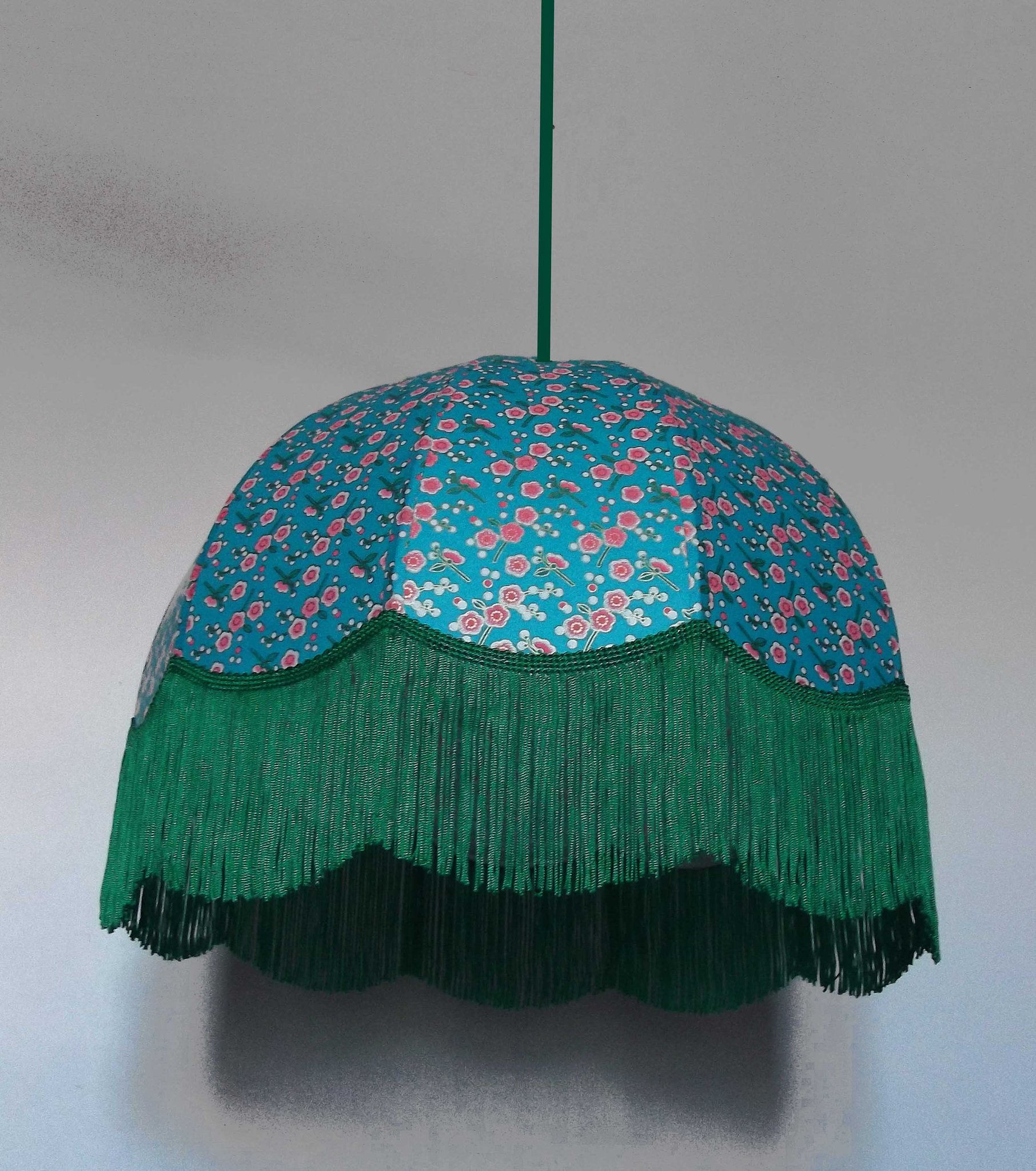 Abat-jour en papier japonais à fleurs sur fond turquoise. Forme dôme feston bas. Diamètre 40 cm, hauteur 23 cm + 10 cm de frange
